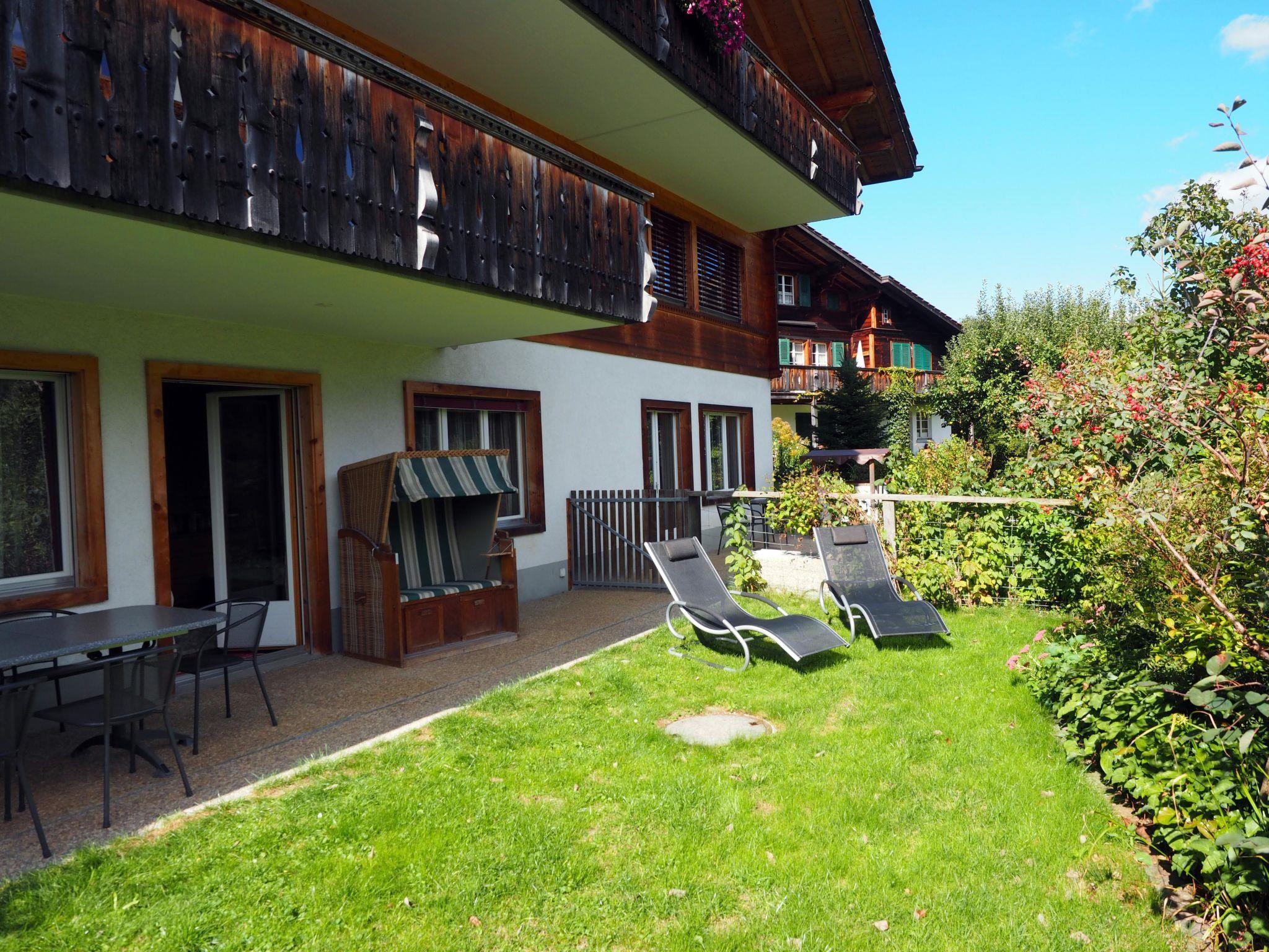 110 m2. More information by the provider: 3 room apartment (110sqm) on the ground floor in a multi-family house built in 1995 and renewed in 2009 (bed rooms and kitchen). The bathroom has been completely renewed in 2011. The building is situated slightly higher on the mountain slope, which guarantees you a beautiful view to the Rinderberg. Access to the chalet by stairs. The terrace includes a sandbox for the kids and a barbecue. Second parking space, washing machine and the tumble dryer available on request. The owner lives in the same building. Enjoy rush of the tiny rivulet (Ryschbach) which is flowing right next to the building. The holiday flat "Hübeli (Kopp)", which is offered by the same owners, is only 20m away.
