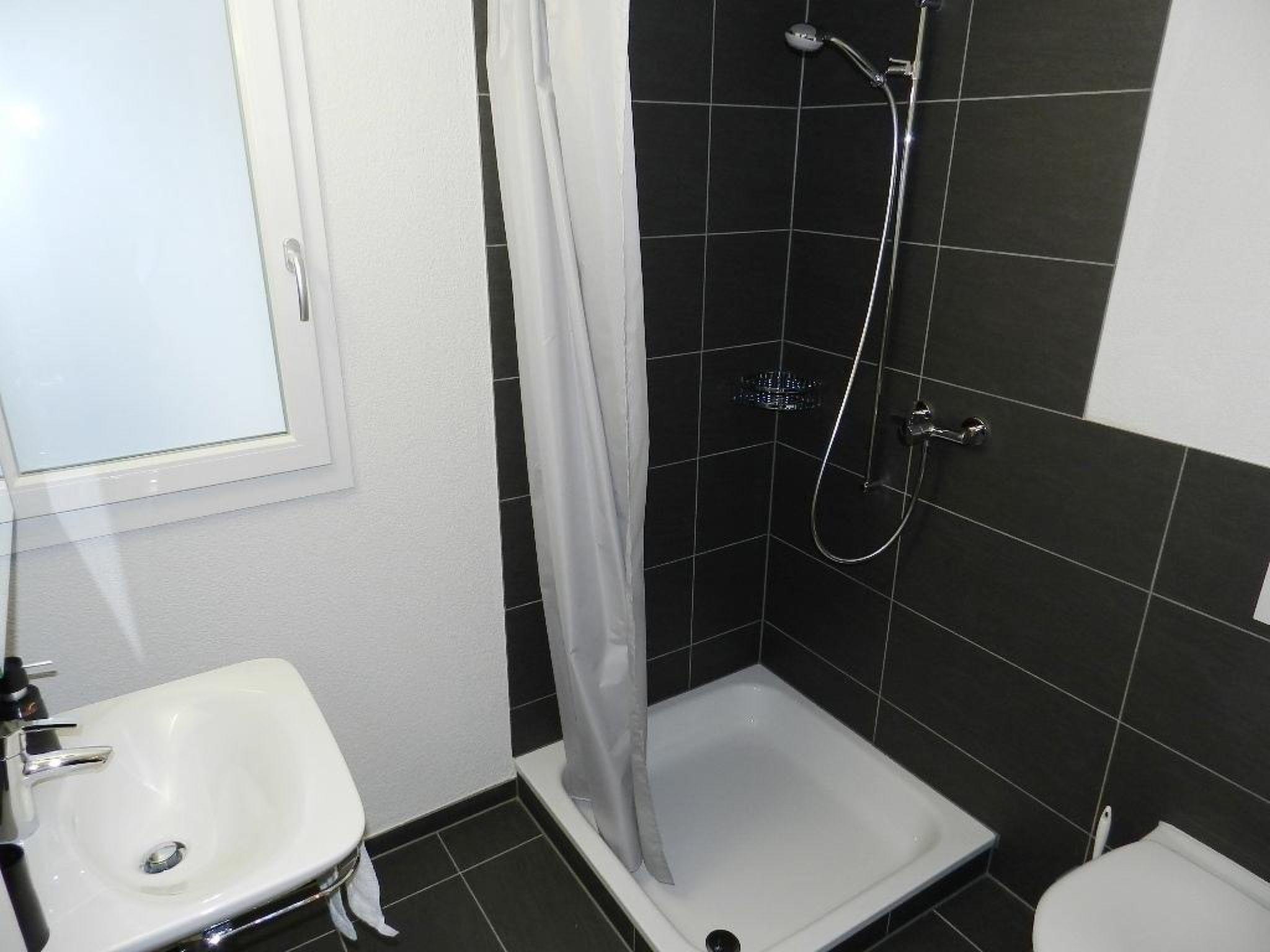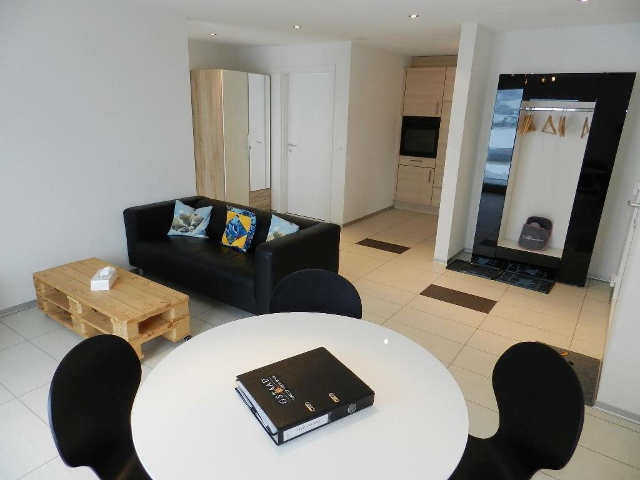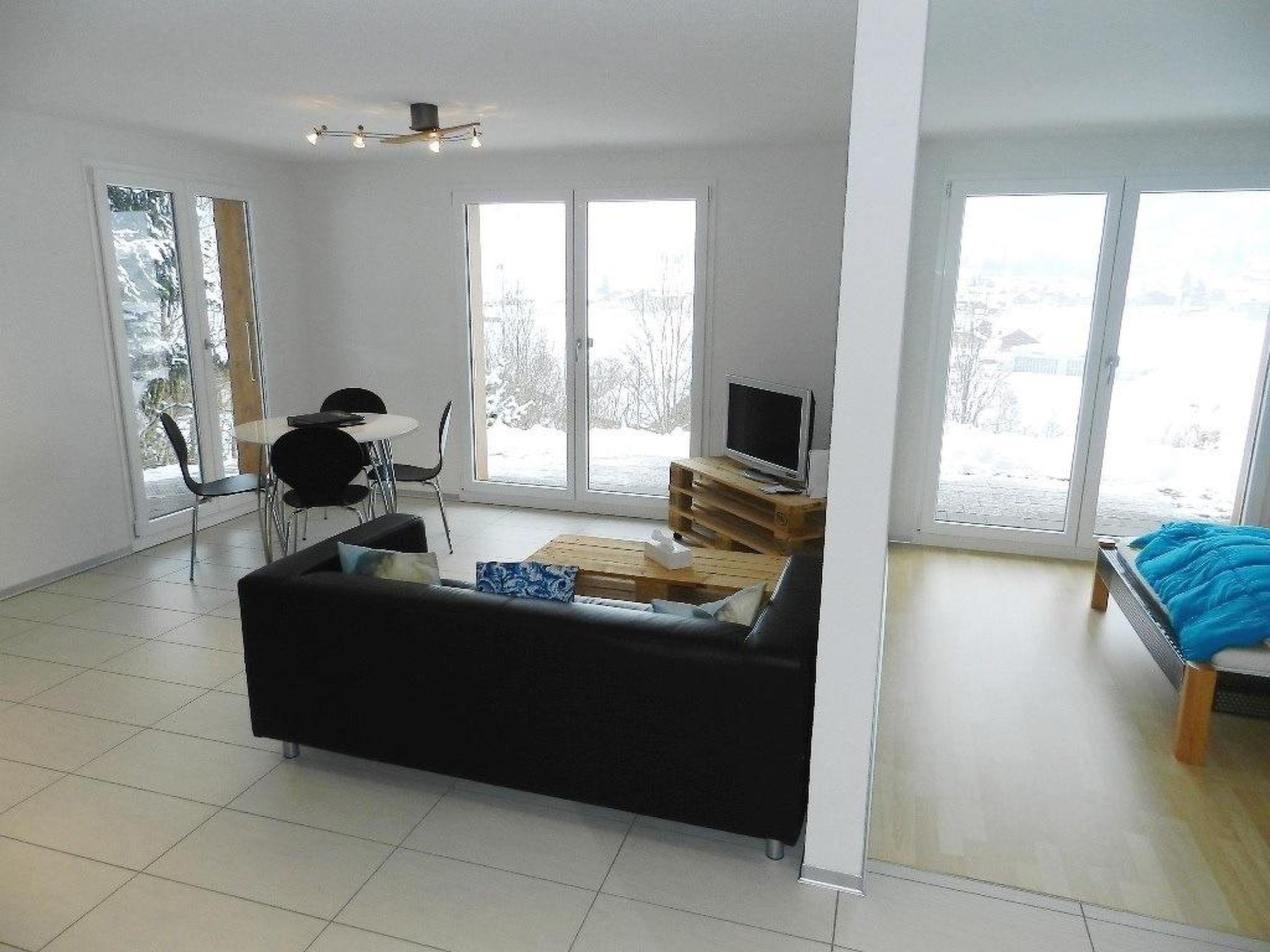 Living-/dining room with open-plan kitchen (furnished with ceramic hob, oven, microwave oven, dishwasher, coffee machine with capsules (Nespresso), fondue-raclette set), dining table, sofa and TV. 1 bedroom (without door) with grand-lit (160x200cm). 1 bathroom with shower and toilet. Storage room with washing machine and tumble dryer. The apartment disposes of an individual adjustable floor heating. WiFi.