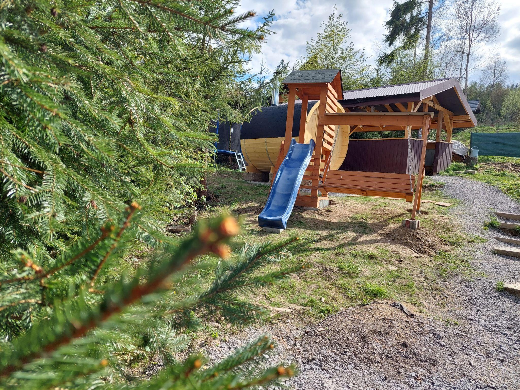The outdoor area of the holiday home is a little paradise in itself. The fully fenced garden ensures safety for children and pets. A covered terrace with a cosy seating area, a barbecue and fire pit as well as a charming garden shed invite you to spend relaxing hours in the countryside. Four private parking spaces are available for vehicles. The highlight of the garden is the private sauna and the wood-fired hot tub, which promise pure relaxation after an active day in the great outdoors or romantic evenings under the stars.