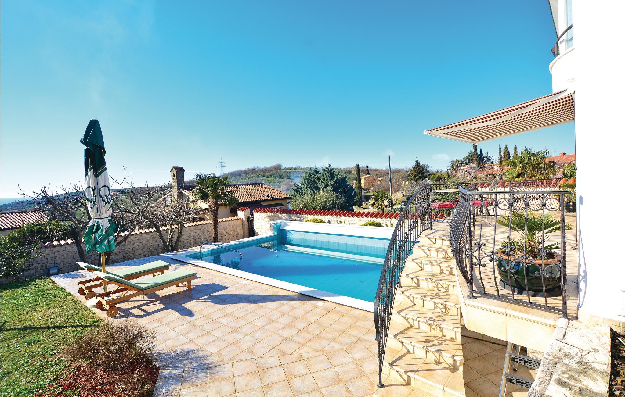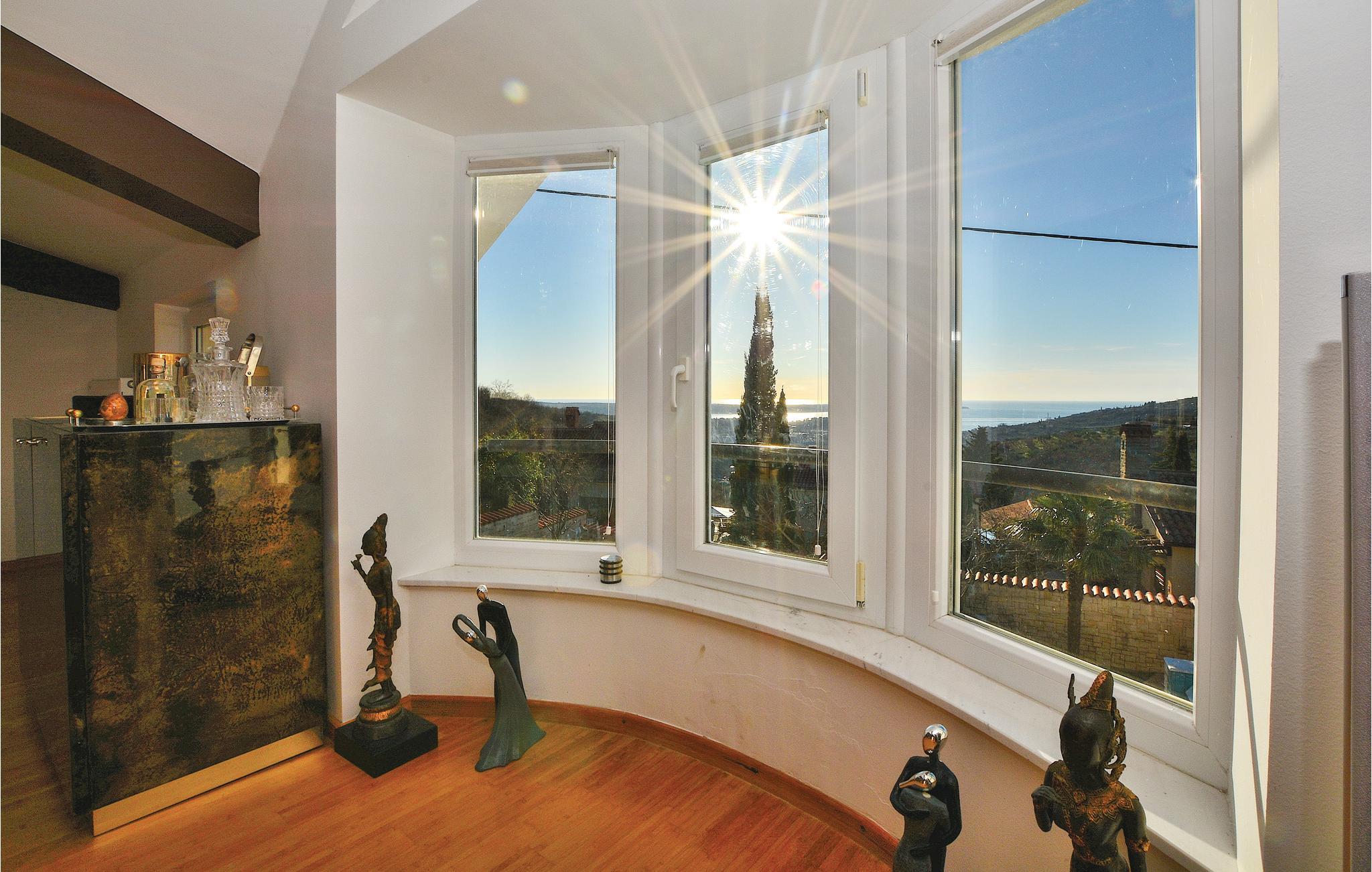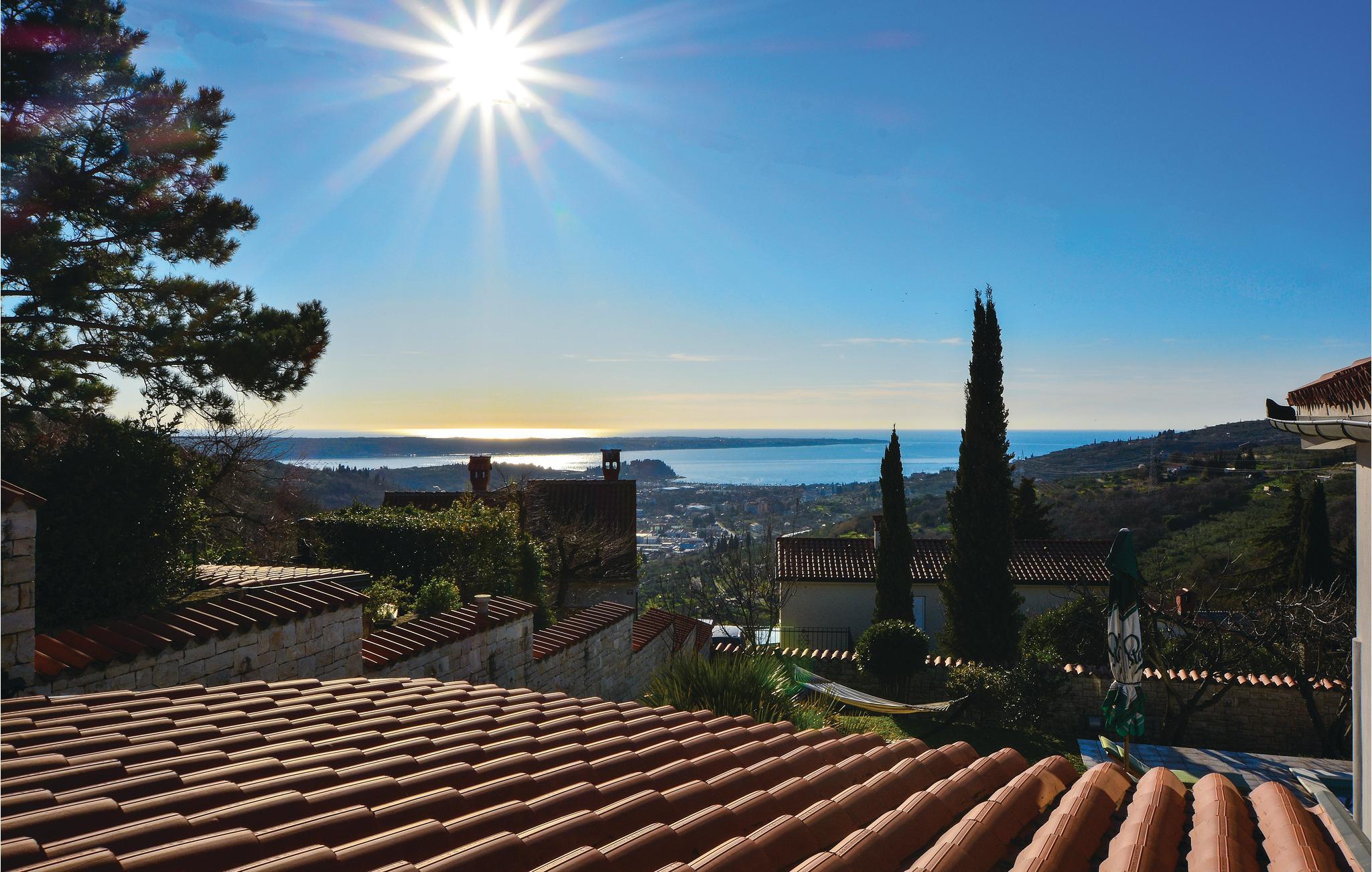 Dette skønne feriehus med pool ligger på en bakke over Izola med en spektakulær udsigt over havet. Det er bygget i klassisk mediterran stil og er fordelt på to terrasser, der er forbundet med en udendørs trappe. I stueplan ligger en lejlighed med to soveværelser og balkon og på første sal er en lejlighed med et enkelt soveværelse. I haven foran huset er en overdækket terrasse med skønne havemøbler og en muret grill. I de omliggende pittoreske kystbyer er der mange restauranter, barer og strande.