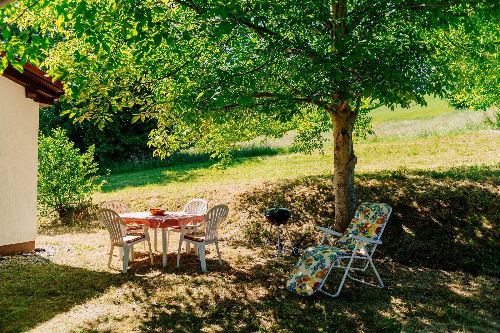In front of the house there is a seating area with a table and deckchairs on the lawn. Use the gas barbecue for a barbecue evening together.