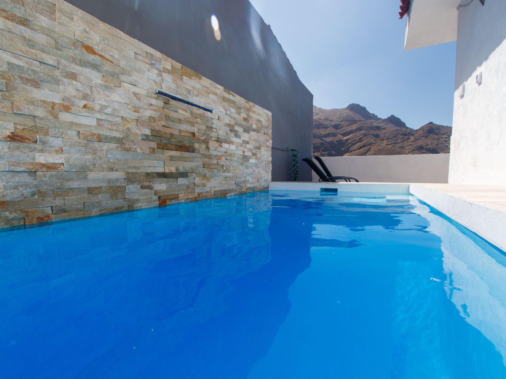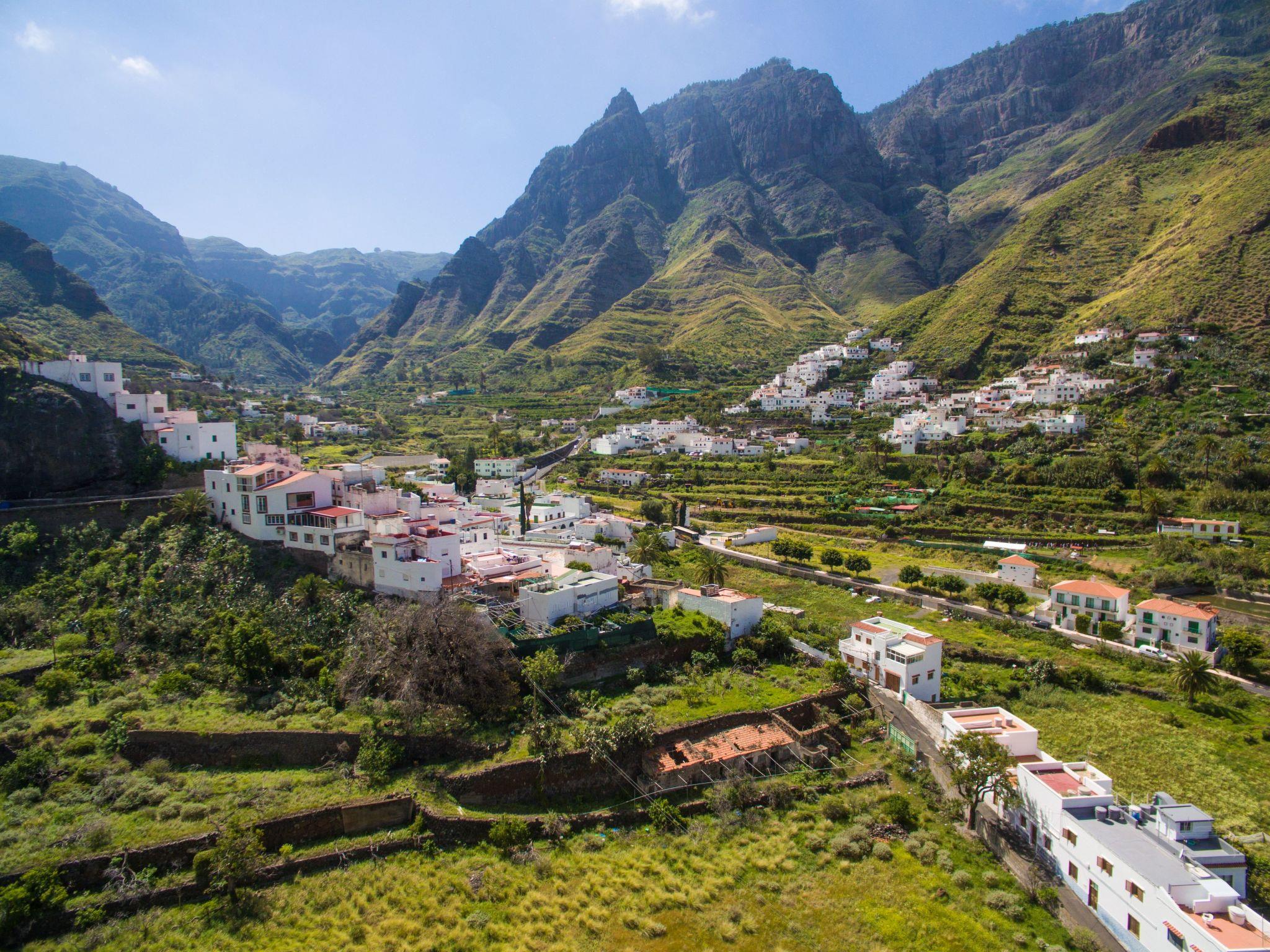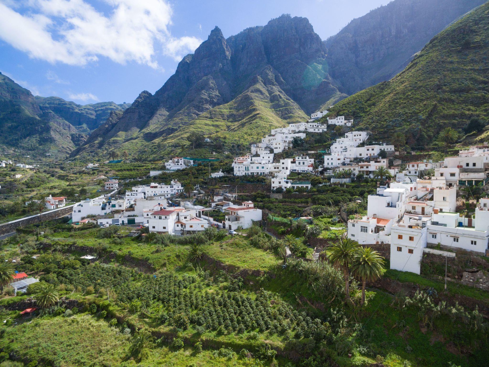 A really very special property. A modern terraced house for 4 people, has a living space of approx. 70 square metres. The living rooms and bedrooms are comfortably furnished and tastefully decorated. Internet access via W-LAN can be used free of charge. The holiday home includes a bedroom with two single beds, a bedroom with a double bed, a shower room and an open-plan living and dining area. The spacious kitchen is fully equipped and, with a ceramic hob, oven and microwave, offers the best conditions for preparing tasty meals while on holiday. In the adjoining living room there is a dining area for 4 people, a comfortable corner sofa and a flat screen with satellite reception (German channels). From the living room and the bedroom with double bed, you have access to the furnished terrace, where you can relax on the comfortable seating. A special highlight is the heated pool, which is a wonderful place to relax after a hike through the mountains. Or make yourself comfortable on the sun loungers and enjoy the marvellous view of the sea and the mountain slopes of the Tamadaba Nature Park. Gran Canaria holidays in the municipality of Agaete Here in the north-west, Gran Canaria shows its rugged and jagged side in a particularly impressive way. The deep ravines (barrancos) that run from the centre of the island to the sea contrast sharply with the lush Mediterranean vegetation.