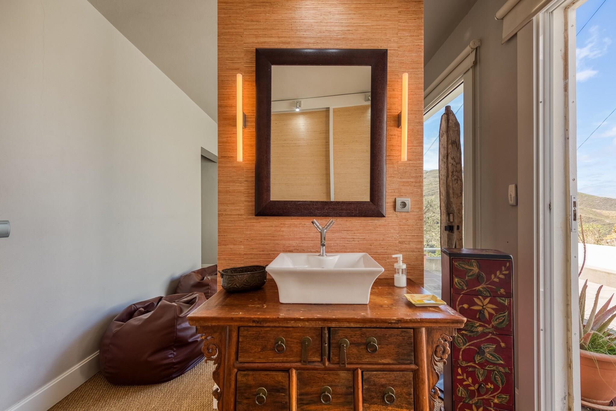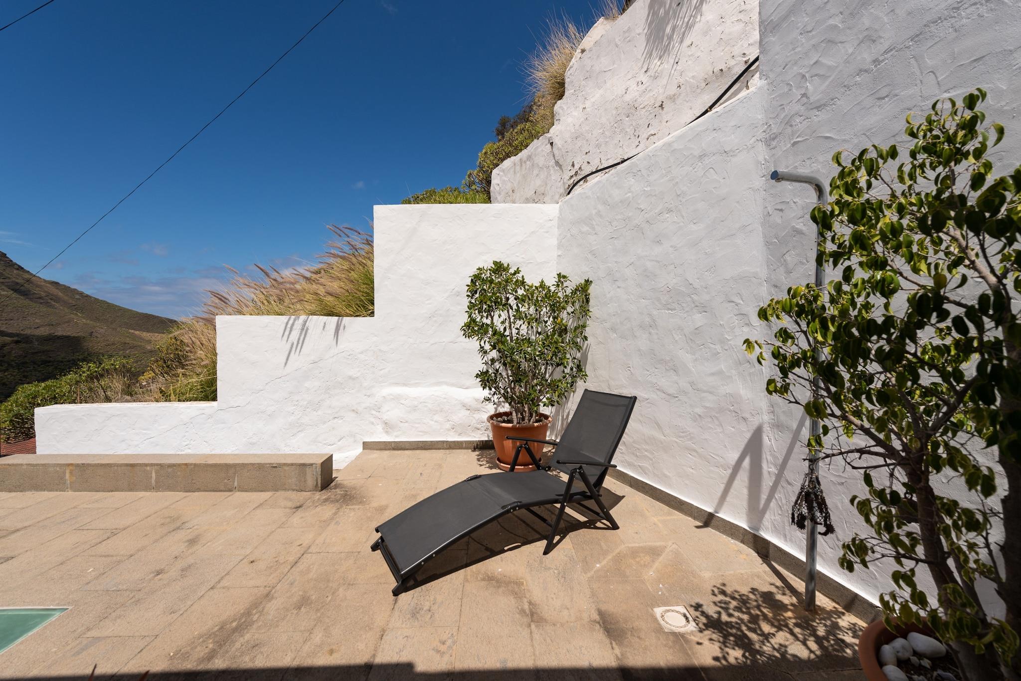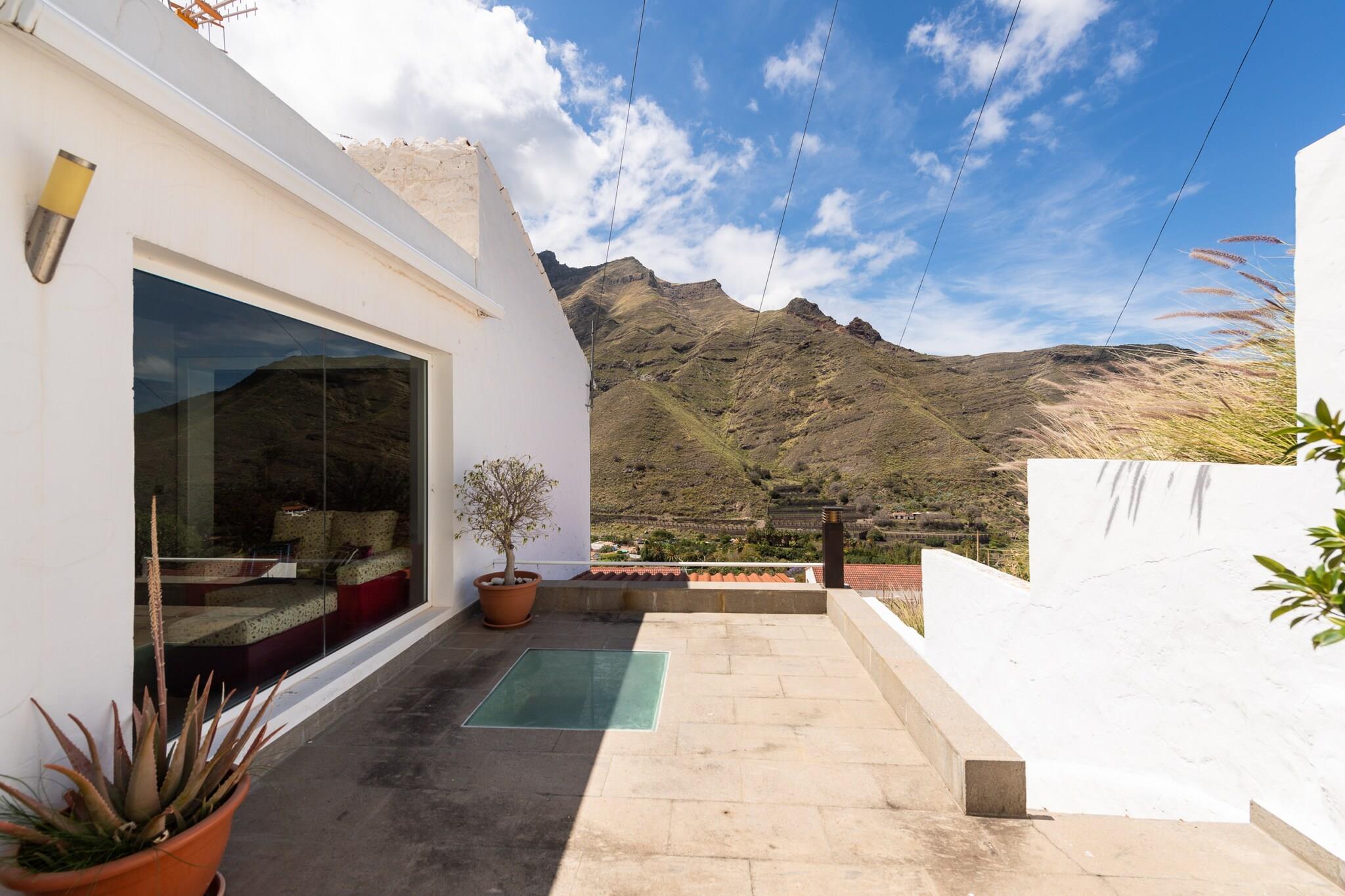 Fordyb dig i Gran Canarias naturlige skønhed på denne fredelige, landlige flugt beliggende i hjertet af Agaete-dalen. Med en betagende udsigt over Atlanterhavet, Teide-bjerget og det beskyttede Berrazales-område tilbyder dette charmerende landlige hjem en perfekt balance mellem komfort, natur og privatliv. Ejendommen har flere udendørs områder, herunder to store terrasser, en balkon og endda en privat sauna for op til fem gæster - hvilket gør det til et ideelt tilflugtssted for dem, der søger fred, wellness og afslapning._x000D_ _x000D_ Omgivelserne er rige på attraktioner: kun 4 km fra fiskerlandsbyen Puerto de Las Nieves og dens vulkanske strande og tæt på de berømte naturlige pools i Las Salinas - perfekt til en forfriskende familiesvømning. Naturelskere kan vandre gennem de naturskønne stier i Barranco de los Berrazales og Tamadaba Naturpark. Et besøg i den nærliggende Huerto de las Flores botaniske have (3 km) byder på en spadseretur blandt eksotiske planter, mens lokale markeder og restauranter serverer frisk fisk og kunsthåndværksoste, der er unikke for regionen._x000D_ _x000D_ Ejendommen på 400 m² kan rumme op til 5 gæster og omfatter 2 rummelige soveværelser, hvoraf det ene har sin egen private terrasse og udendørs bruser. Det fuldt udstyrede uafhængige køkken kommer med moderne apparater såsom køleskab, ovn, mikroovn, opvaskemaskine, vaskemaskine, kaffemaskine, brødrister og meget mere. Yderligere funktioner omfatter et grillområde, aircondition, gratis Wi-Fi og havemøbler til udendørs spisning. Uanset om du slapper af på terrassen eller udforsker Agaetes skjulte perler, tilbyder dette landlige hjem en virkelig mindeværdig ø-oplevelse._x000D_