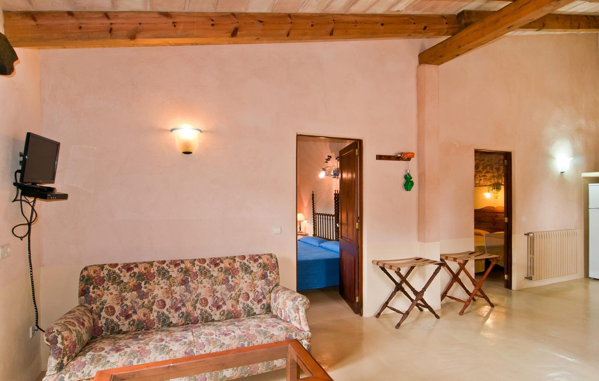 Den imponerende ejendom "Son Sureda" med sine 1.500.000 m² er blevet tilpasset feriegæster, unge og gamle efter 500 års landbrug, vindyrkning og husdyravl. Navnene på de elleve ferielejligheder, som er fordelt rundt om hovedhuset, borgmesterhuset og udhusene med et eller to dobbeltværelser, indikerer stadig deres tidligere anvendelse. På jeres ture rundt om de gamle mure vil I opdage mange gamle hestevogne og spændende landbrugsudstyr. På jeres egne små terrasser i stueetagen eller med udsigt kan I nyde jeres privatliv og få mulighed for at lære andre feriegæster at kende ved de mange borde og stole eller ved den fælles grill i den store indre gårdhave. I kan starte jeres Mallorca-morgen i den imponerende hvælving (de tidligere hestestalde) eller udenfor på det åbne område med en overdådig, ø-typisk morgenmad, som I kan bestille. To pools med liggestole og en udendørs bruser, et soppebassin, en legeplads med gynger, sandkasse, klatrestativ, fodboldbane og hønsegårde sørger for afslapning for enlige rejsende og par samt til en bondegårdsferie for familier. Vi er sikre på, at der er en lejlighed, der passer lige til jer. Måske er det denne lejlighed med sin unikke historie. I de tidlige dage var dette hus hingstestald. Et æsel han blev krydset med en hoppe for at skabe et muldyr, et stærkt dyr, der kunne bære tunge byrder og arbejde i timevis. Hvert af soveværelserne i denne enhed har sit eget badeværelse med bruser, dobbelt håndvask og toilet. Den hyggelige stue er indrettet med sofa, mallorcanske gyngestole, fjernsyn og pejs, der giver en særlig atmosfære og varme, når det er nødvendigt. På dage, hvor I ønsker at blive på ejendommen hele dagen, kan I tilberede snacks, salater og små måltider i tekøkkenet med køleskab, to keramiske kogeplader, mikroovn og kaffemaskine. Terrassen er udstyret med bord, stole, liggestole og parasol. Forkæl jer selv med en pause med en god bog i ny og næ. Og der er en række værdifulde destinationer: byliv eller havbrise? Fra jeres villa kan I nemt udforske de forskellige sider af øen. Godt 15 km væk venter strandene på soltilbedere, surfere og familier. Den rummelige Son Serra de Marina og den næsten to kilometer lange sandstrand mod Colònia de Sant Pere tilbyder plads nok til at sprede mere end blot et håndklæde. Hvis I vil nyde de blå nuancer fra oven, så tag til Betlem og klatre de 5 km til den lille Ermita. Naturligvis er mere krævende ruter til vandrestøvler og mountainbikes også mulige. Ma-3322, som er delvist hørbar afhængig af vindretningen, tager jer til byen Manacor for en spontan tur til den historiske bymidte eller for at shoppe på vitaminmarkedet. Hvis I vil besøge katedralen i Palma, skal I blot efterlade jeres bil på togstationen og tage bussen eller toget. Sommerhus på landet med masser af natur til villagæsterne. Føl jer hjemme på agroturismoen "Son Sureda", der ligger mellem fåregræsgange og vinmarker, som har elleve lejligheder og studiolejligheder med egen forplejning, en stor U-formet gårdhave og flere pools. Manacor, en af øens metropoler, ligger kun 9 km væk. Det er ideelt til shopping på det daglige frugt- og grøntmarked, til udflugter og til en afslappet middag på en restaurant. Og på Badia d'Alcúdia, i retning mod Son Serra de Marina og Colònia de Sant Pere, kan I stadig finde et par strande, der endnu ikke er overfyldte.