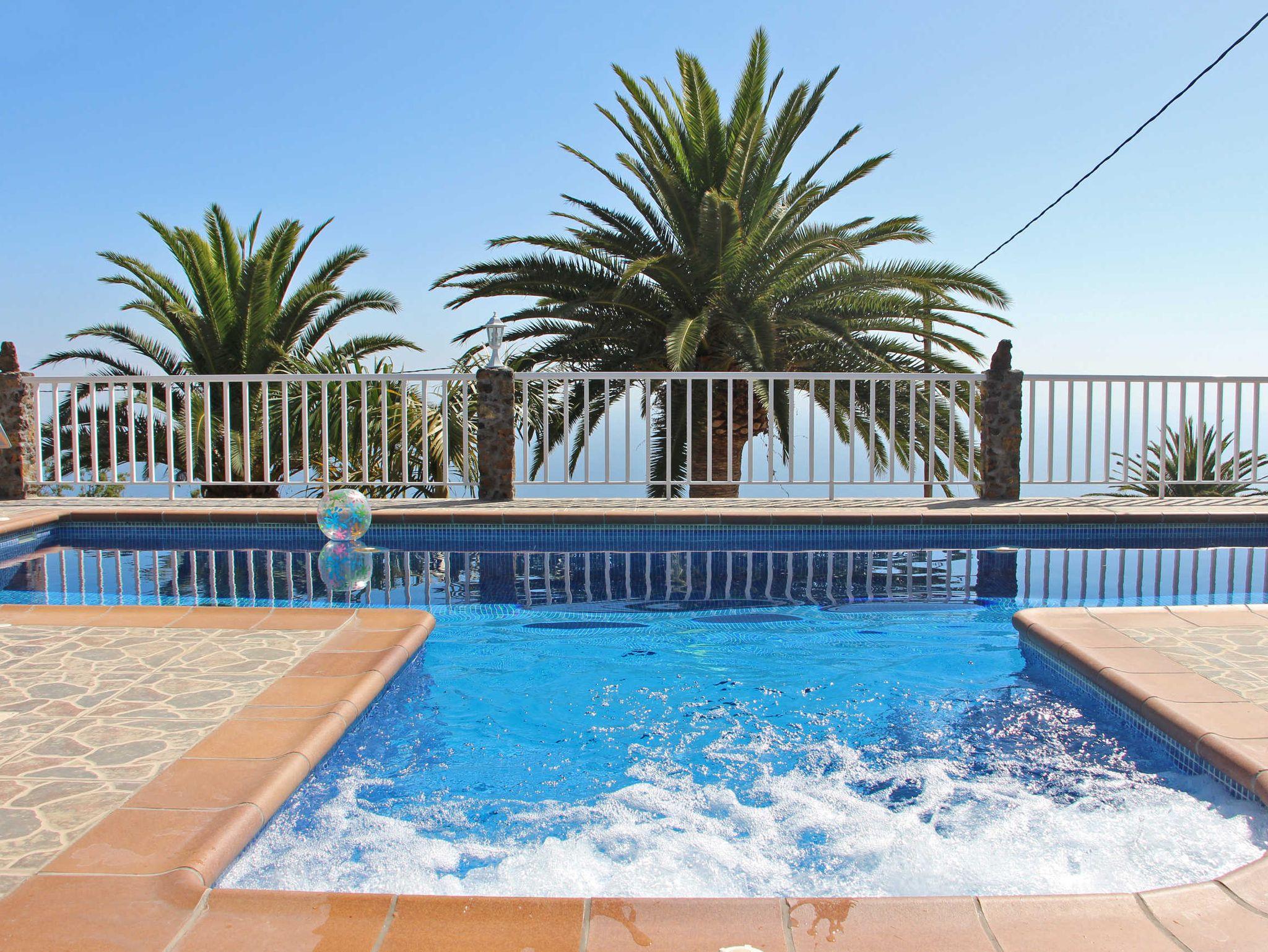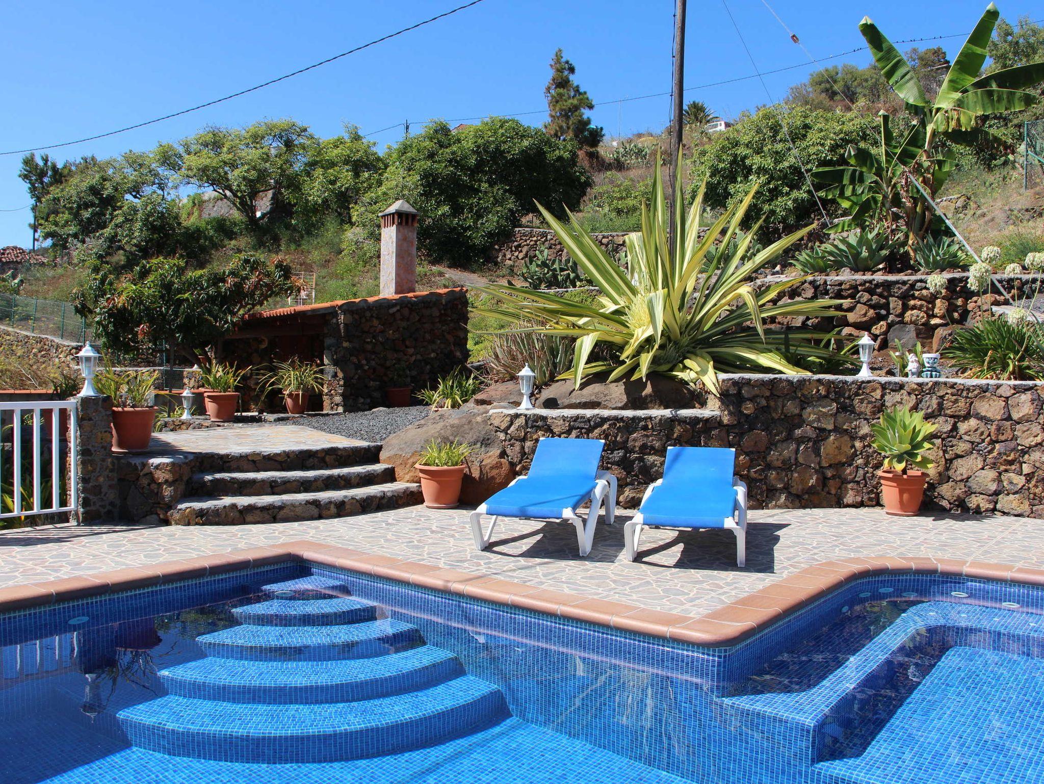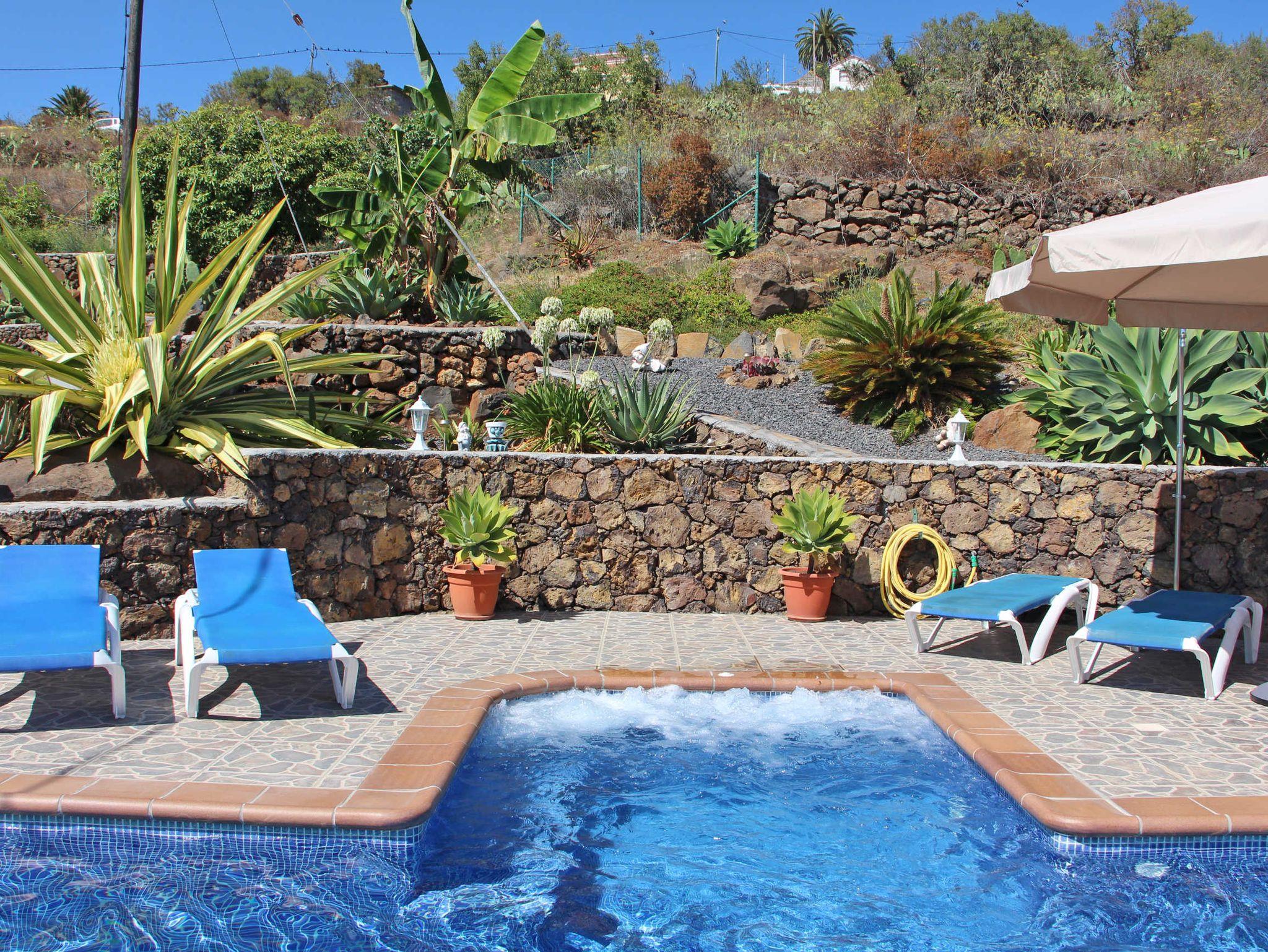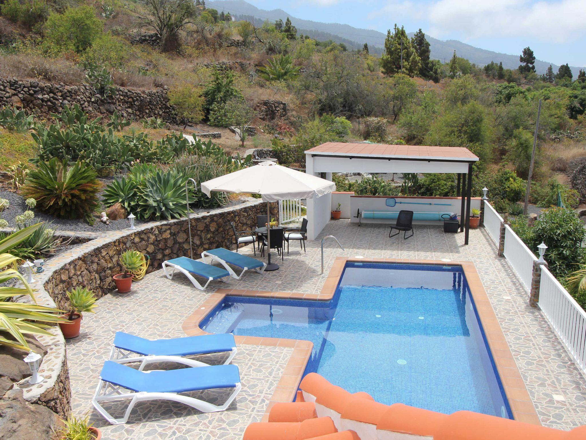Wer die liebliche, hügelige Küstenlandschaft, die zahlreichen nahen Wanderwege und den weiten Atlantikblick im Nordwesten La Palmas liebt, der wird sich hier wohlfühlen und wird gleichzeitig mit einem tollen Poolbereich verwöhnt, der kaum Wünsche offen lässt. Vom stählernen Massagestrahl über die integrierte Whirlfunktion bis hin zur Länge des Pools - 8m, eine schöne Schwimmlänge - hier lässt es sich aushalten. Die große Terrasse um den Pool bietet zahlreiche Sonnenliegen, einen Esstisch mit 4 Stühlen, Sonnenschirm, einen überdachten Bereich mit einer Dartsscheibe und eine Poolabdeckung. Der Garten auf der Finca wurde sehr schön angelegt und ein schmaler Pfad führt durch den oberen Bereich des Gartens. Nachts kann nicht nur der Garten und der Bereich um den Pool sondern auch der Pool beleuchtet werden.