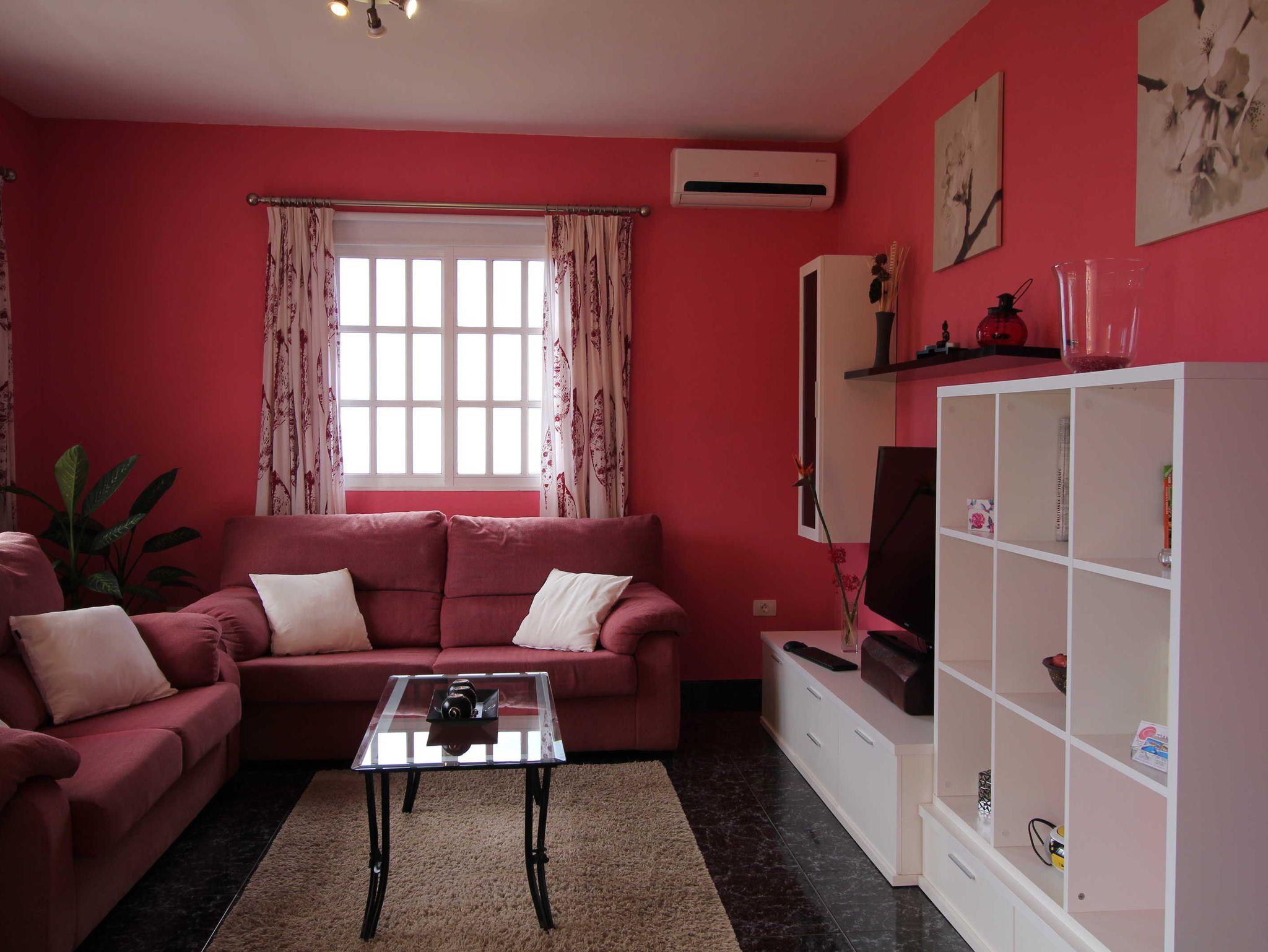 Das Haus selbst besteht aus einer Etage, auch wenn es durch die Hangbauweise größer aussieht. Knapp 100qm Wohnfläche stehen den Gästen zur Verfügung. Sie betreten das Haus und sind im Zwischenflur zwischen der Küche rechts und dem offenen Wohnzimmer links. Im Wohnzimmer befinden sich ein bequemes 2- und 3-Sitzersofa sowie ein großer Flatscreen mit Sat-TV. Die Räume verfügen über Internet und Klimaanlage und sind alle abdunkelbar. Die Klimaanlage kann im Winter als Heizung genutzt werden.
