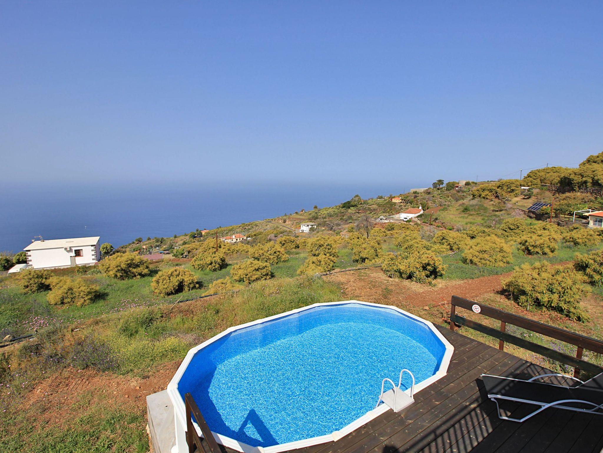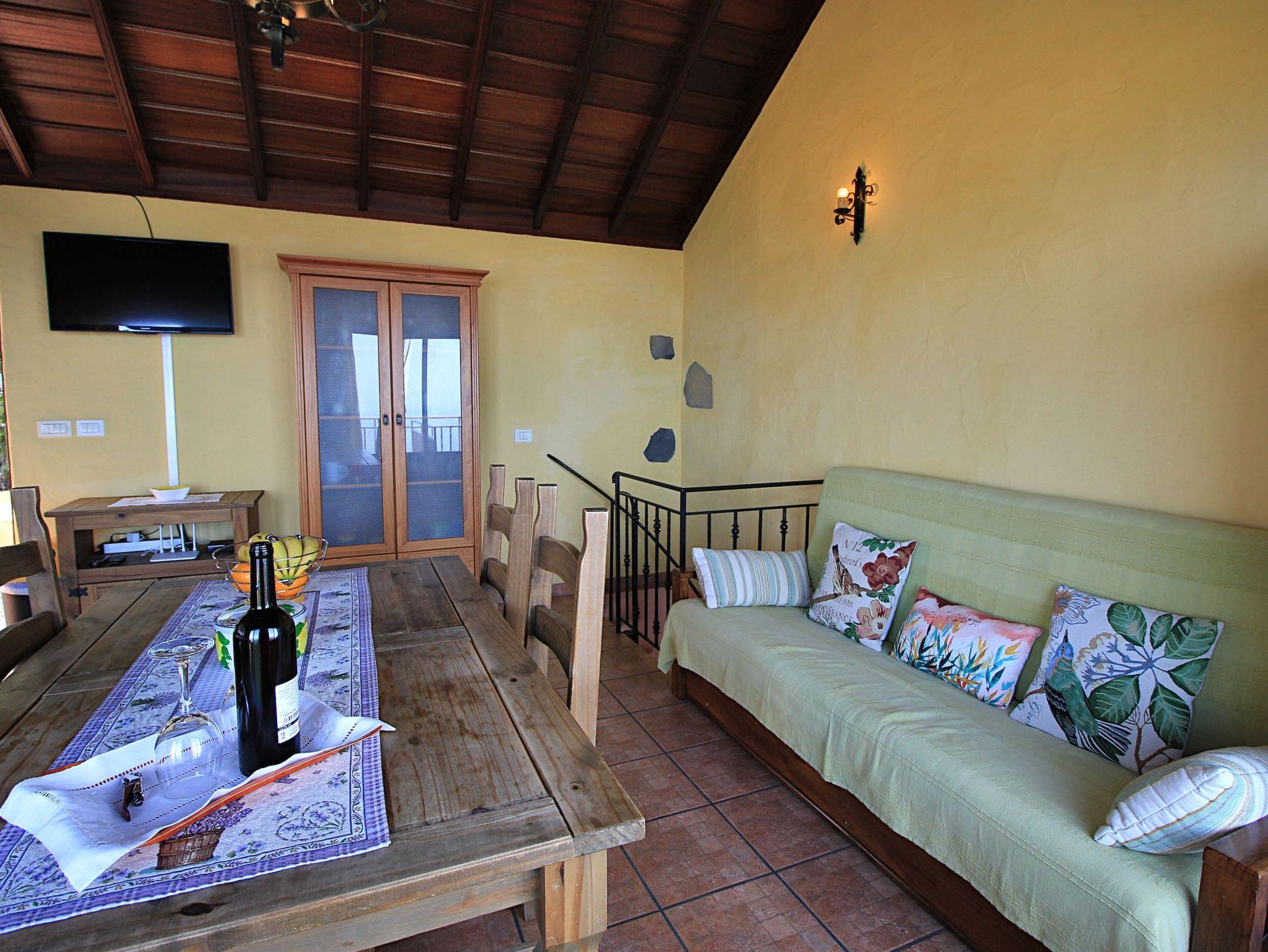 Beim Eingang hinter dem Haus und direkt an der Küche befindet sich ein gemauerter Grill sowie ein grosser Steinterrassenbereich mit überdachtem Sitzplatz. Betreten Sie die Unterkunft, kommen Sie in den Wohnraum mit offener Küche und kanarischer Holzdecke. Ein grosser Esstisch aus Holz steht in der Mitte des Raumes, seitlich befindet sich das Sofa. In diesem Raum finden Sie auch den Fernseher. Davor liegt eine weitere Holzterrasse mit Sitzgelegenheiten und beeindruckendem Meerblick. Zur Linken führt eine Treppe zur Pool-Ebene.