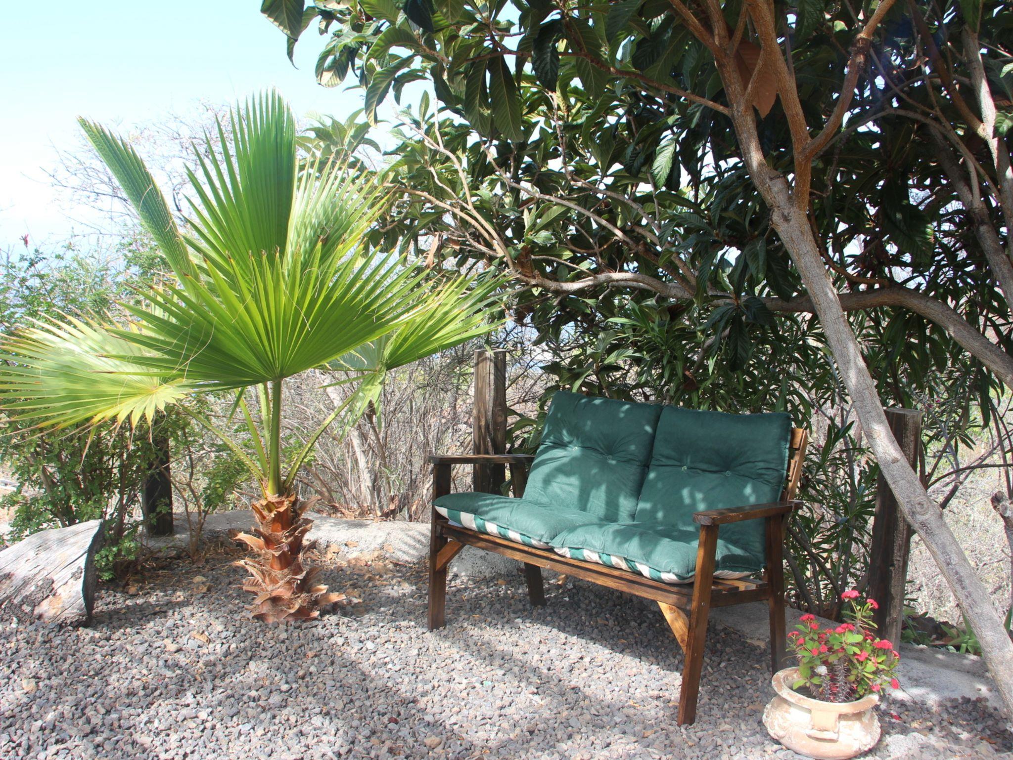 Seitlich des Hauses befindet sich der Privatpool mit einem hölzernen Sonnendeck und herrlichem Ausblick. Der Außenbereich des Hauses mit diversen Sitzmöglichkeiten ist ca. 100qm groß. Eine Pergola, teils mit Blumenranken umschlungen bietet ein gemütliches Plätzchen, ebenso ein Holzbank im Schatten des Nisperosbaumes.