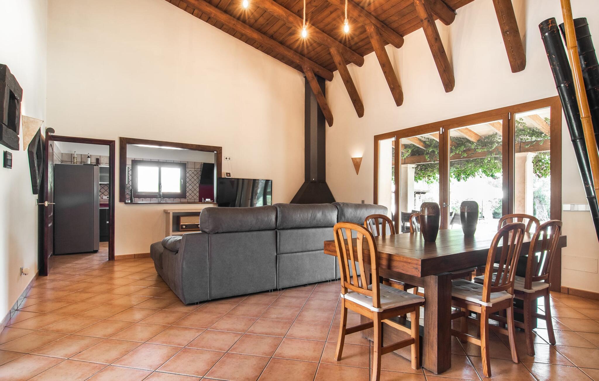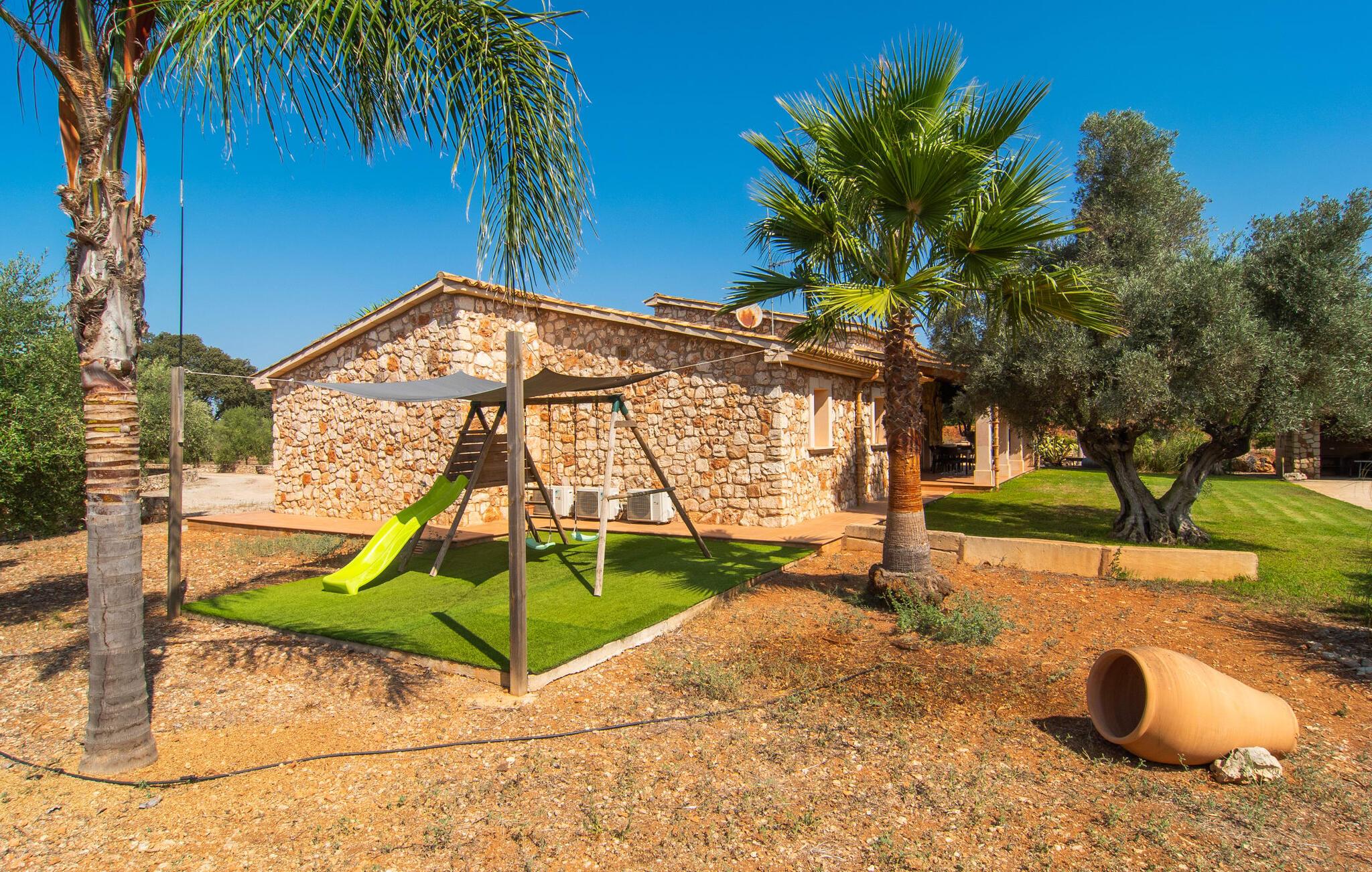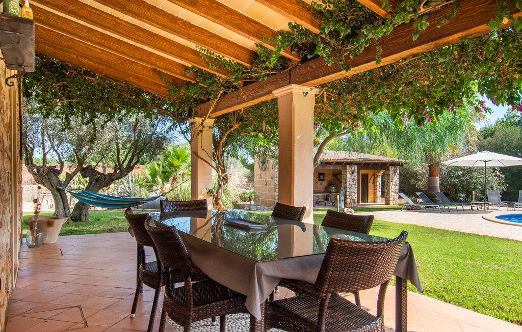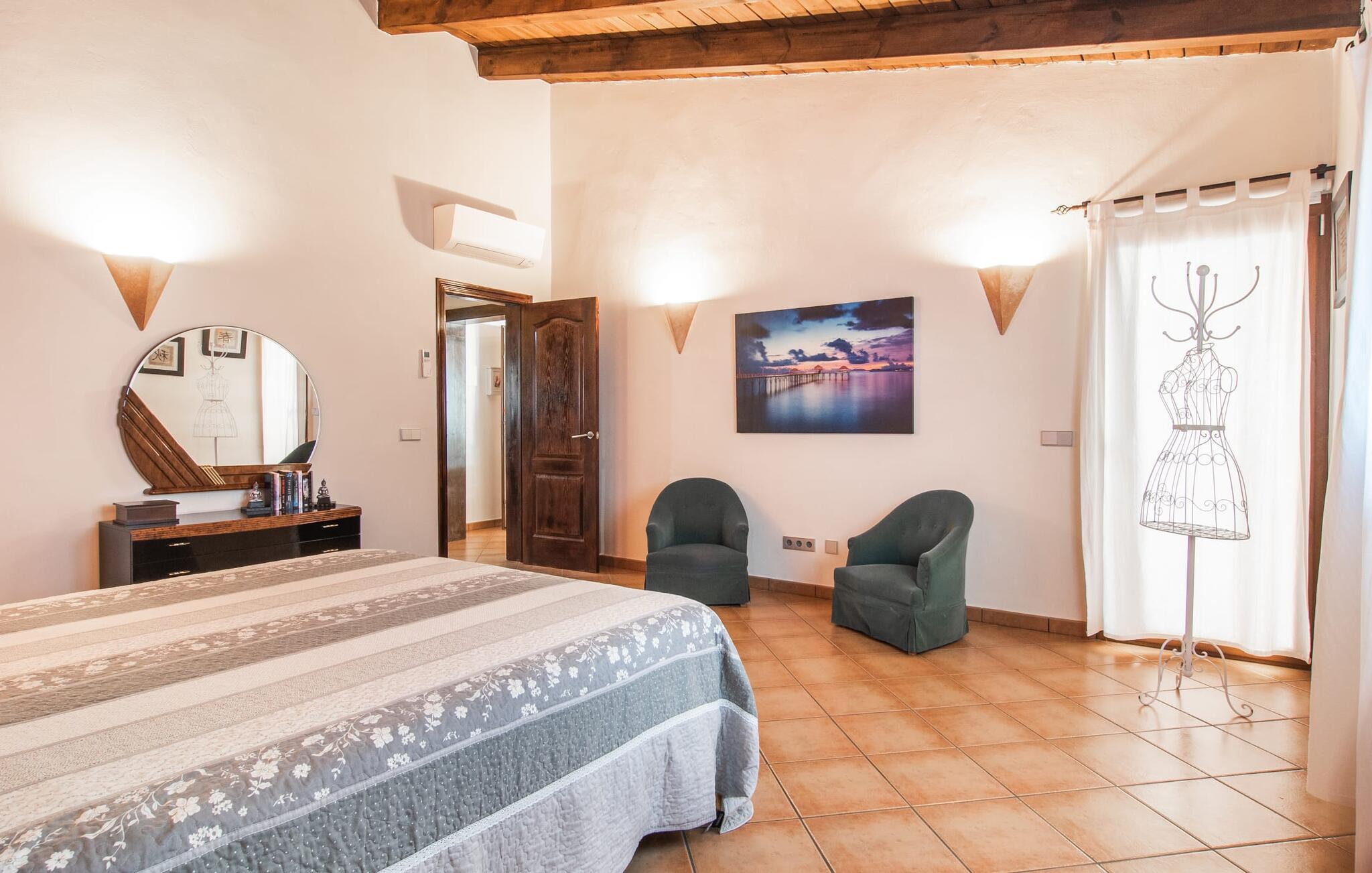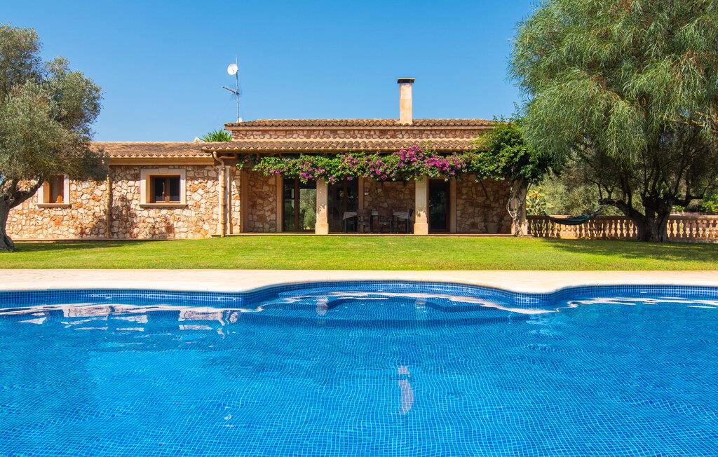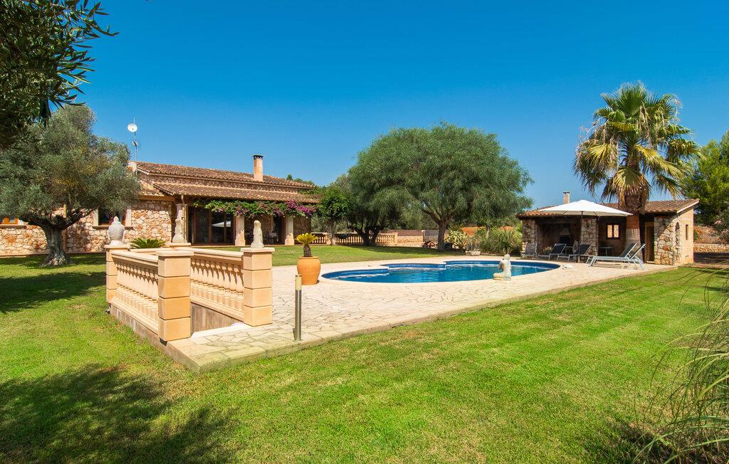 Er I Mallorca-fan og leder efter fred og ro? Eller vil I være det? Under alle omstændigheder, læs videre – det vil være det værd. Villa "Ailen" tilbyder et oase-lignende sted, hvor I kan nyde uforstyrret komfort og afslapning uden at skulle give afkald på forbindelsen til øens infrastruktur. Ejendommen, spækket med mandel- og oliventræer, ligger i landlige omgivelser, omgivet af marker og store åbne vidder. I vil ikke kunne vente med at tage plads i den smukke have, prydet af en smuk grøn græsplæne, hvor I kan sidde, læne jer tilbage eller se børnene lege. Den store pool i sin oprindelige form er flisebelagt med smukke, dybblå mosaikker og inviterer jer til at tage en lang svømmetur på varme dage. Den er over 11 m lang og varierer i dybden fra behagelige 1,2 m til 1,7 m En halvcirkelformet trappe fører jer nemt til poolen, hvor der også er et fantastisk spabad. På den omkringliggende terrasse, som er udstyret med liggestole og parasoller, vil enhver soltilbeder finde et sted efter deres smag. De omkringliggende træer skaber en vidunderlig idyllisk og malerisk atmosfære, hvor I nemt kan slappe af og give slip. Ønsker I en overdækket siddeplads ved et bord, finder I den perfekte plads lige ved siden af huset. Sid foran naturstensfacaden med elegante fliser under fødderne og et synligt bjælkeloft ovenover - I vil opdage, at dette er et fremragende sted til måltider og mere. Der er plads nok til alle ved spisebordet. En anden overdækket plads nær poolen danner grillpladsen - perfekt til at mødes på en lun aften og smide noget på grillen. Rent praktisk har udendørsarealet også et lille toilet. En behagelig lys atmosfære præger villaens indre. Naturfarvede lofter, vægge og gulve, suppleret med nøje udvalgte møbler, skaber en behagelig, harmonisk atmosfære. Det store, moderne køkken med sine magentafarvede bordplader udgør husets hjerte. Det er fuldt udstyret, så I kan få mest muligt ud af alle fordelene ved selvforplejning. Både en amerikansk og en italiensk kaffemaskine sikrer, at I ikke behøver at gå uden jeres yndlings varme drik under jeres morgenmorgenmad på terrassen. Det runde bord i køkkenet er også et hyggeligt sted at spise sammen indendørs. Et særligt kendetegn er det originale vindue til stuen, som også har en attraktiv spiseplads og et hyggeligt sofaområde til omfattende afslapningsstunder. Det store fladskærms-tv med satellitforbindelse opfylder alle medieunderholdningsbehov, mens pejsen skaber en hyggelig atmosfære på kølige aftener. Et soveværelse i moderne design med eget badeværelse og walk-in-closet giver plads nok; De to andre soveværelser har en munter, rustik atmosfære. De to badeværelser er udstyret i moderne stil og tilbyder plads nok til alle, der rejser med jer. Den elegante villa "Ailen" er beliggende i en vidunderlig rolig beliggenhed i den sydøstlige del af øen, cirka 8 km nordvest for den lille mallorcanske by Felanitx. Det er derfor nemt at nå til daglige indkøb eller caféer. Manacor, Mallorcas næststørste kommune, ligger kun 20 km væk. Strandene i Cala Gran, Cala Sa Nau og Cala d'Or ligger hver kun omkring 22 km væk.