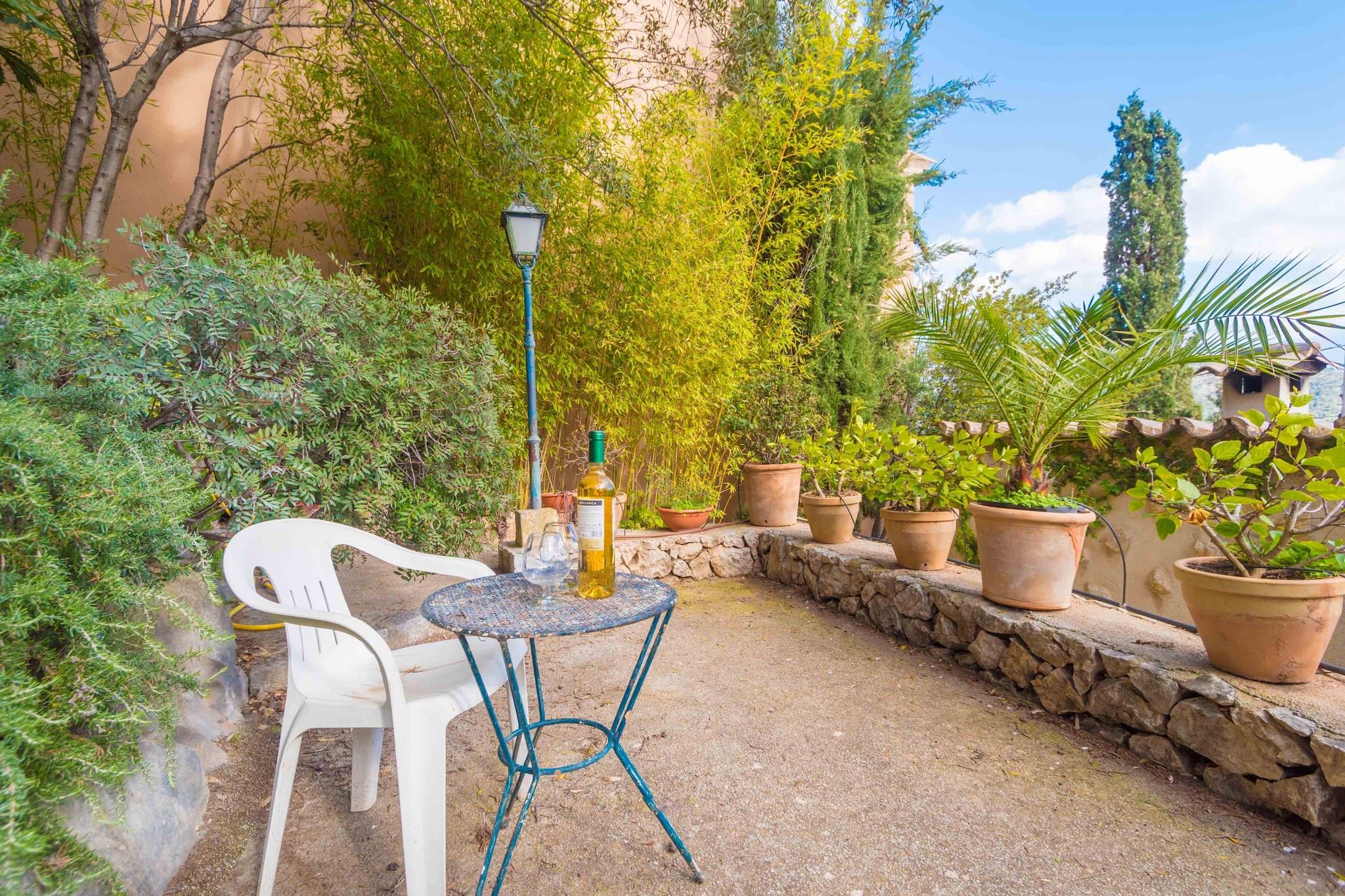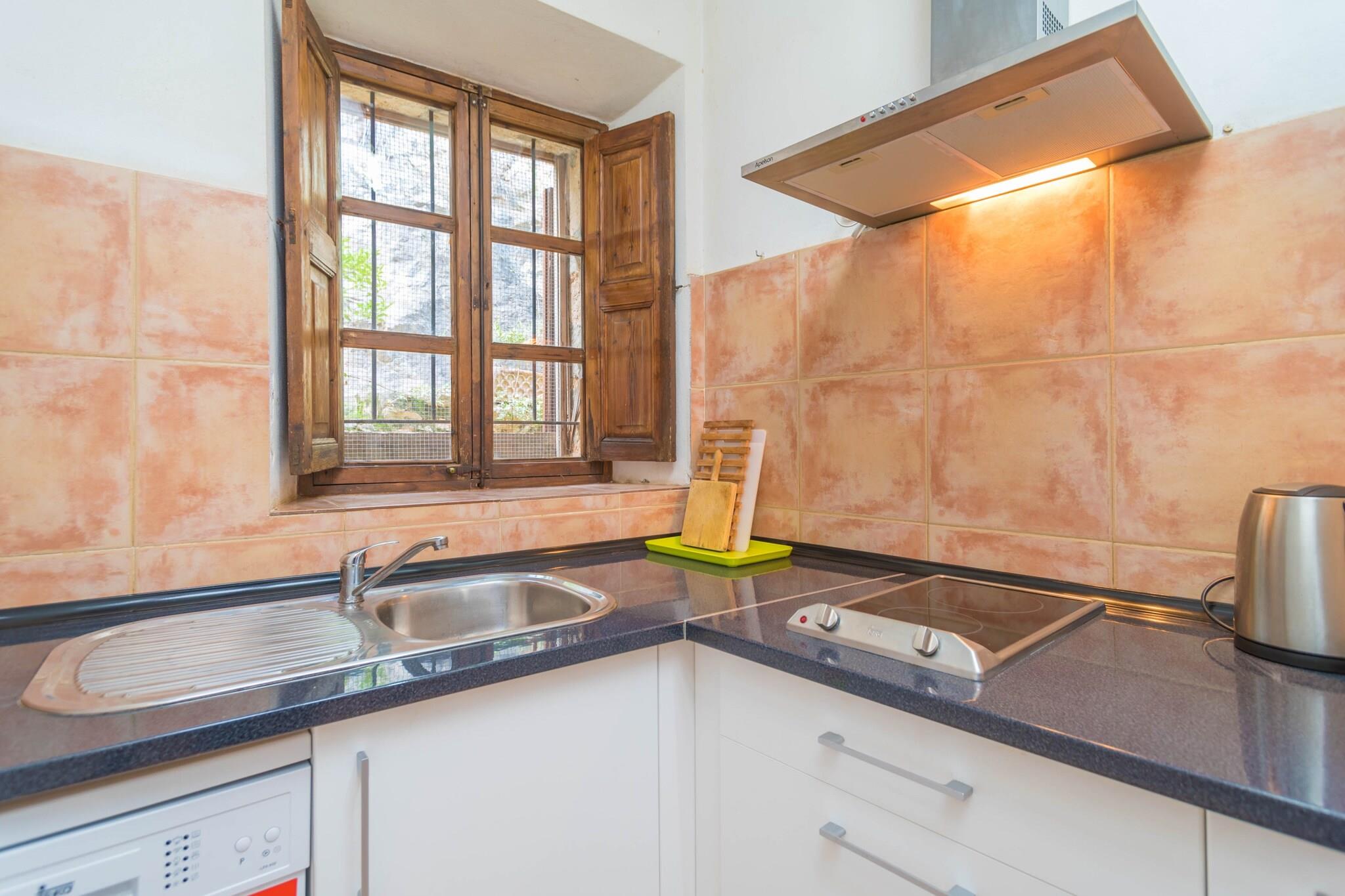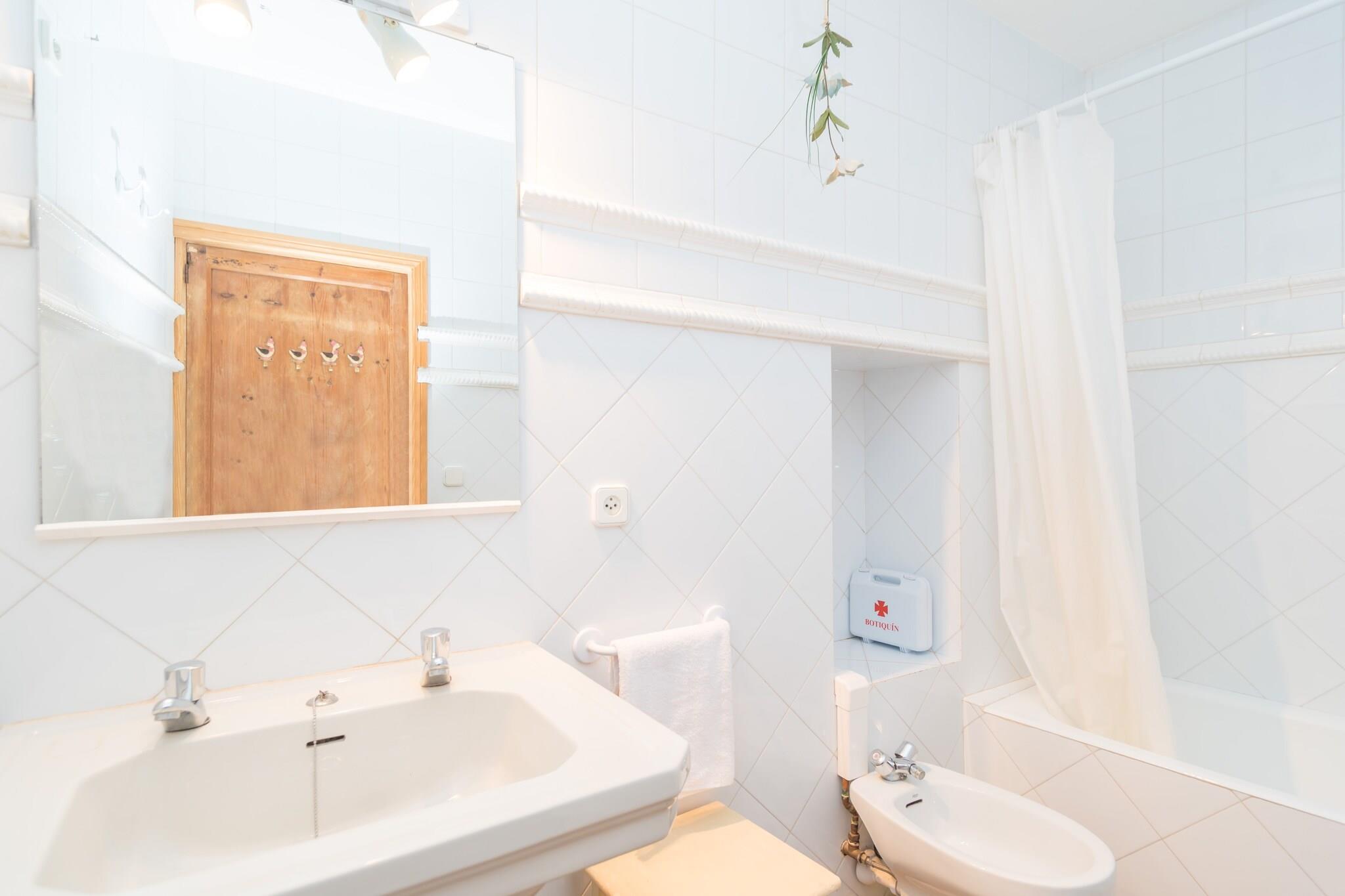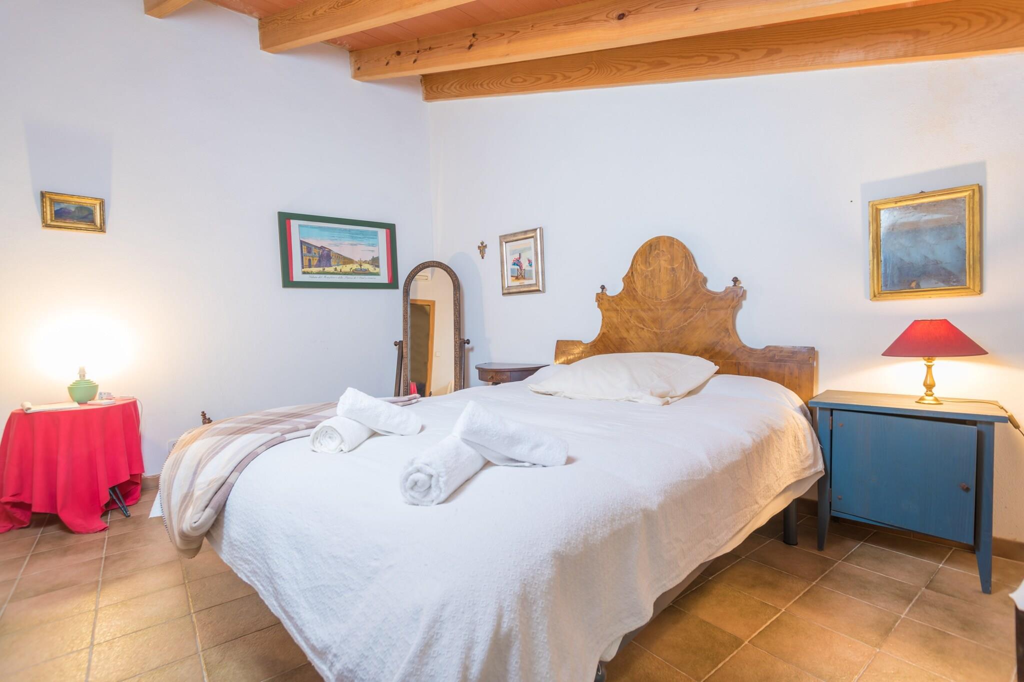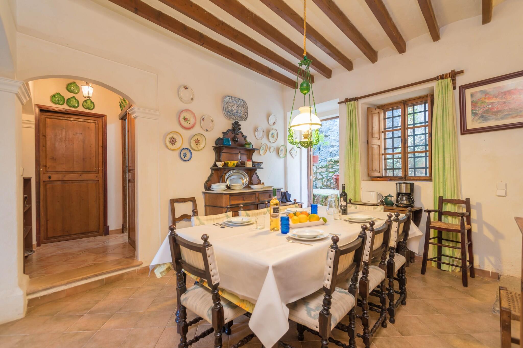 Oplev roen i bjergene i denne charmerende rustikke villa omgivet af frodige træer og planter, der skaber en have som en fredelig skov. Gå en tur langs stenstier eller slap af på de forskellige terrasser med en fantastisk udsigt over bjergene, markerne og landsbyen. Nyd måltider udendørs på verandaen, mens du nyder den fredfyldte atmosfære. Den indhegnede ejendom har naboer i nærheden for en følelse af fællesskab uden at ofre privatlivets fred. Indvendigt er hjemmet smukt dekoreret med antikviteter og har en storslået entré, der fører til en spisestue til otte. Den airconditionerede stue byder på hyggelige sofaer, en brændeovn og et tv, perfekt til at slappe af efter en dag med udforskning. Køkkenet er fuldt udstyret med en keramisk kogeplade, ovn, mikroovn og alle nødvendige redskaber, suppleret med et separat vaskerum med vaskemaskine, strygejern og strygebræt. Ovenpå er der to soveværelser: det ene med to enkeltsenge plus plads til en barneseng og høj stol, inklusive en-suite toilet, og det andet med en dobbeltseng. Begge værelser har skabe og aircondition. Badeværelset har badekar og bidet. Beliggende i Alaró, omgivet af bjerge og vandrestier, er villaen perfekt til naturelskere. Udforsk lokale markeder, besøg slottet, eller nyd nærliggende strande som Playa de Palma eller Cala Deià. Kæledyr og arrangementer er ikke tilladt.