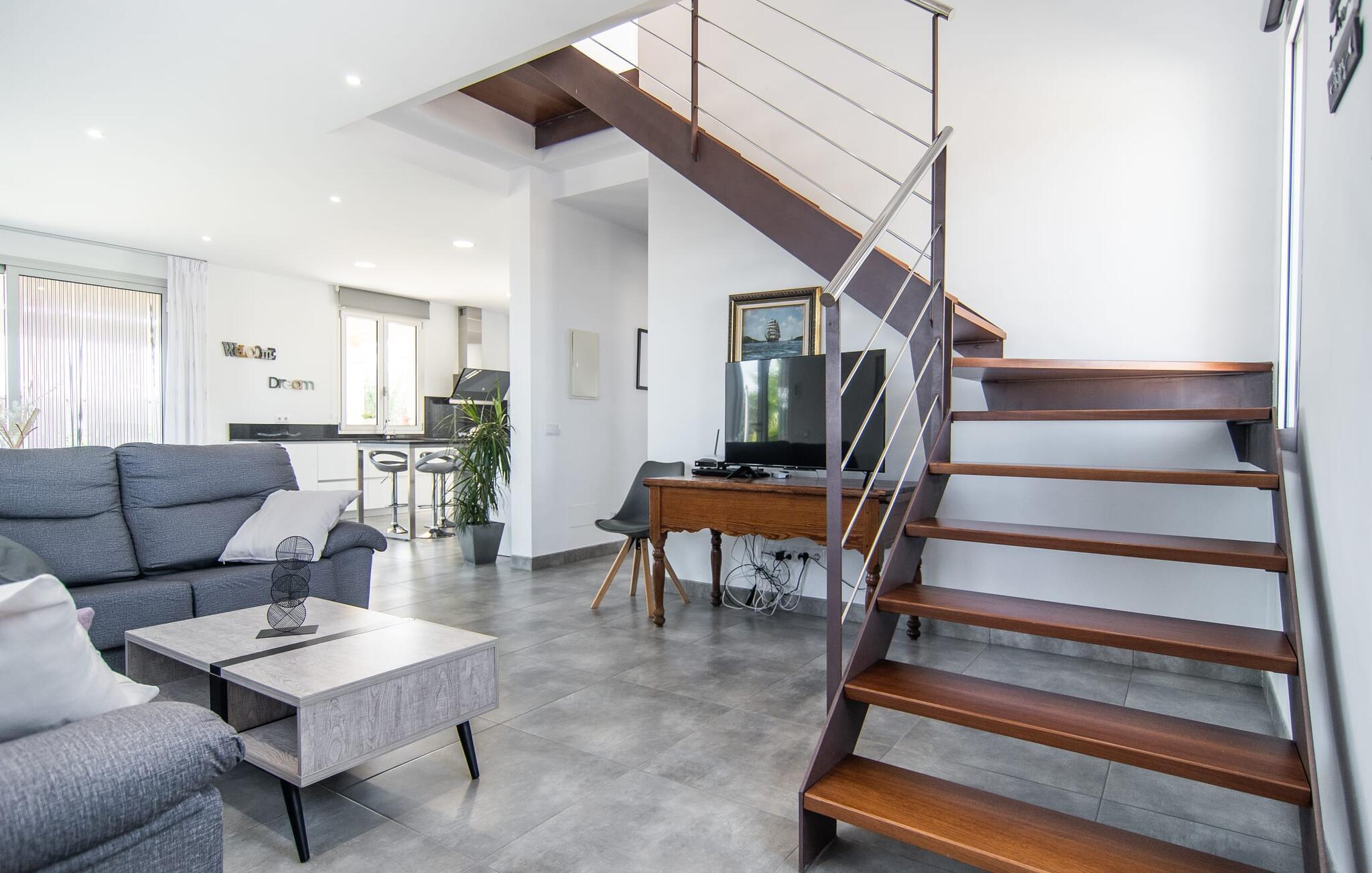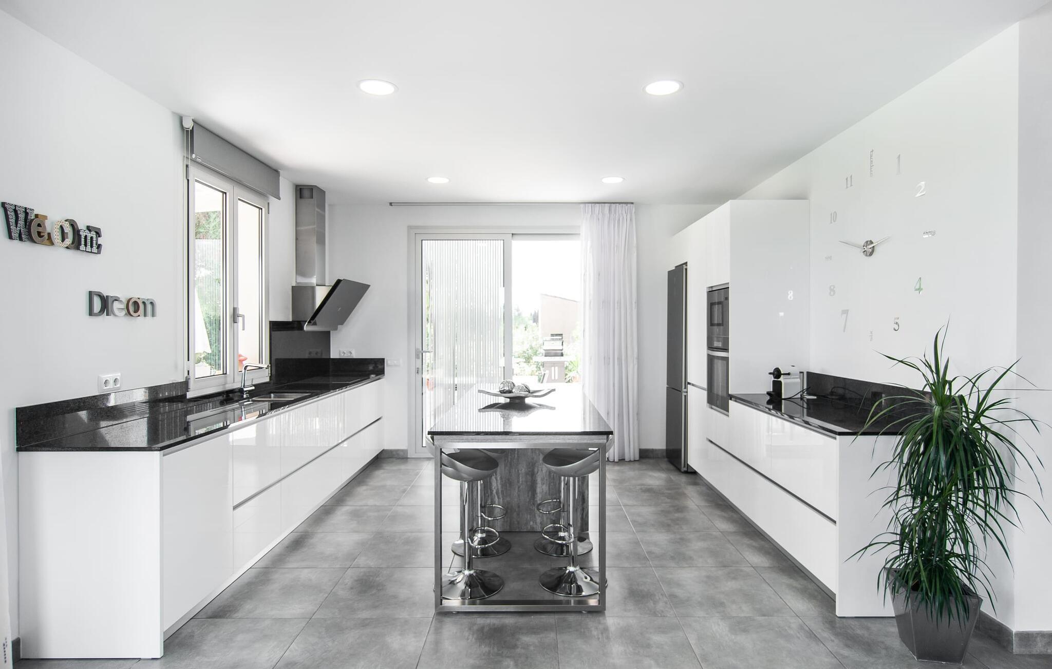 Den familievenlige finca "Albaimar" er en perfekt blanding af rustik charme og moderne komfort. Den praktiske indkørsel til dit sommerhus i hjertet af Mallorca er beklædt med fincaens egne citrustræer. Ved ankomst til den smukt anlagte ejendom er der rigelig åben parkeringsplads til flere lejebiler. På den anden side af fincaen er der en velholdt, sydøstvendt have. Den rummelige, overdækkede veranda, udstyret med komfortable sidde- og spisepladser, har udsigt over en klorfri, let skrånende pool, som er let tilgængelig via en bred trappe. Ind imellem er der en velholdt græsplæne, der indbyder til at gå barfodet. Udendørsfaciliteterne omfatter en gasgrill af høj kvalitet, en udendørs bruser, en trampolin, en børnerutschebane og forskellige andre legemuligheder for de små gæster. Fra tagterrassen kan du nyde en sensationel panoramaudsigt over det idylliske landskab hele vejen til Tramuntana-bjergene. Dette er et Fincallorca feriehus. Interiøret er oversvømmet med naturligt dagslys gennem talrige gulv-til-loft vinduer og terrassedøre på begge niveauer. I stueetagen er der et åbent opholds- og spiseområde, der flyder problemfrit ud i et moderne, veludstyret køkken med kogeø og integreret bar. Også i stueetagen er der et soveværelse med dobbeltseng med masser af opbevaringsplads i den indbyggede garderobe og et separat badeværelse. De to andre soveværelser, hvoraf det ene har egen balkonadgang, er placeret på øverste etage og deler endnu et badeværelse med badekar. Både det primære opholdsrum og soveværelserne har aircondition. Hele huset har en god WiFi-forbindelse og stabil mobiltelefonmodtagelse, så lejlighedsvis arbejde hjemmefra er også muligt. Brede døre, trinfri overgange og et kørestolsvenligt badeværelse i stueetagen sikrer en behagelig, stort set barrierefri ferie for ældre gæster og personer med fysiske begrænsninger. I den smukke trekant mellem Sa Pobla, Muro og Llubí vil du opdage "Albaimar", en nybygget villa med yderst attraktive møbler. Dette giver dig frihed til at vælge, hvilken af de mere søvnige byer du gerne vil besøge til dine daglige indkøb. Både havet og bjergene kan nås hurtigt - på kun 20 minutter i bil kan du nå Tramuntana-bjergene og imponerende smukke bjerglandsbyer som Caimari eller Alcúdia-bugten med dens talrige strande. Vi anser denne bolig for tilgængelig for vores gæster med nedsat mobilitet, men vi opfordrer alle gæster til at overveje boligens egnethed baseret på deres egne behov