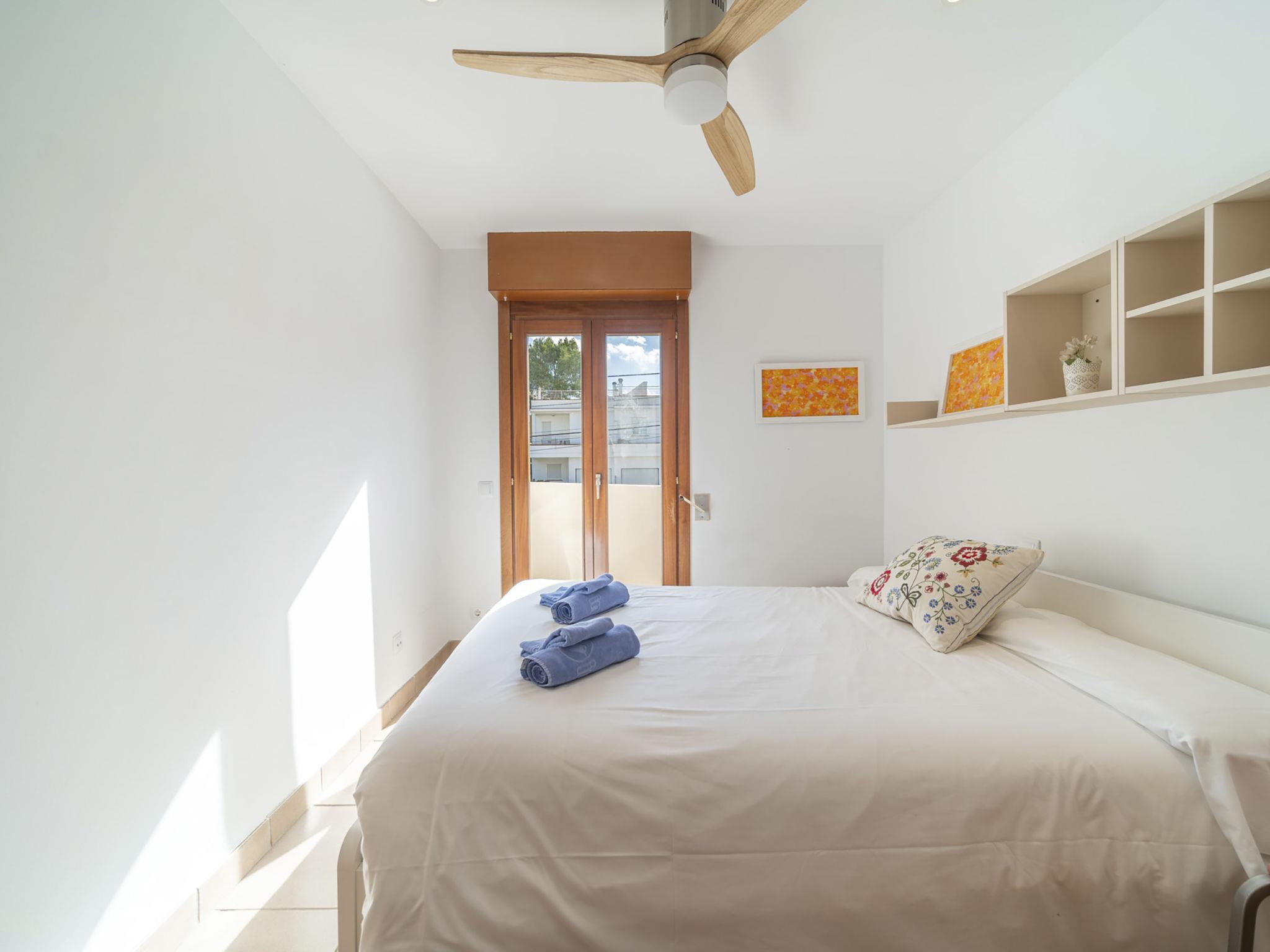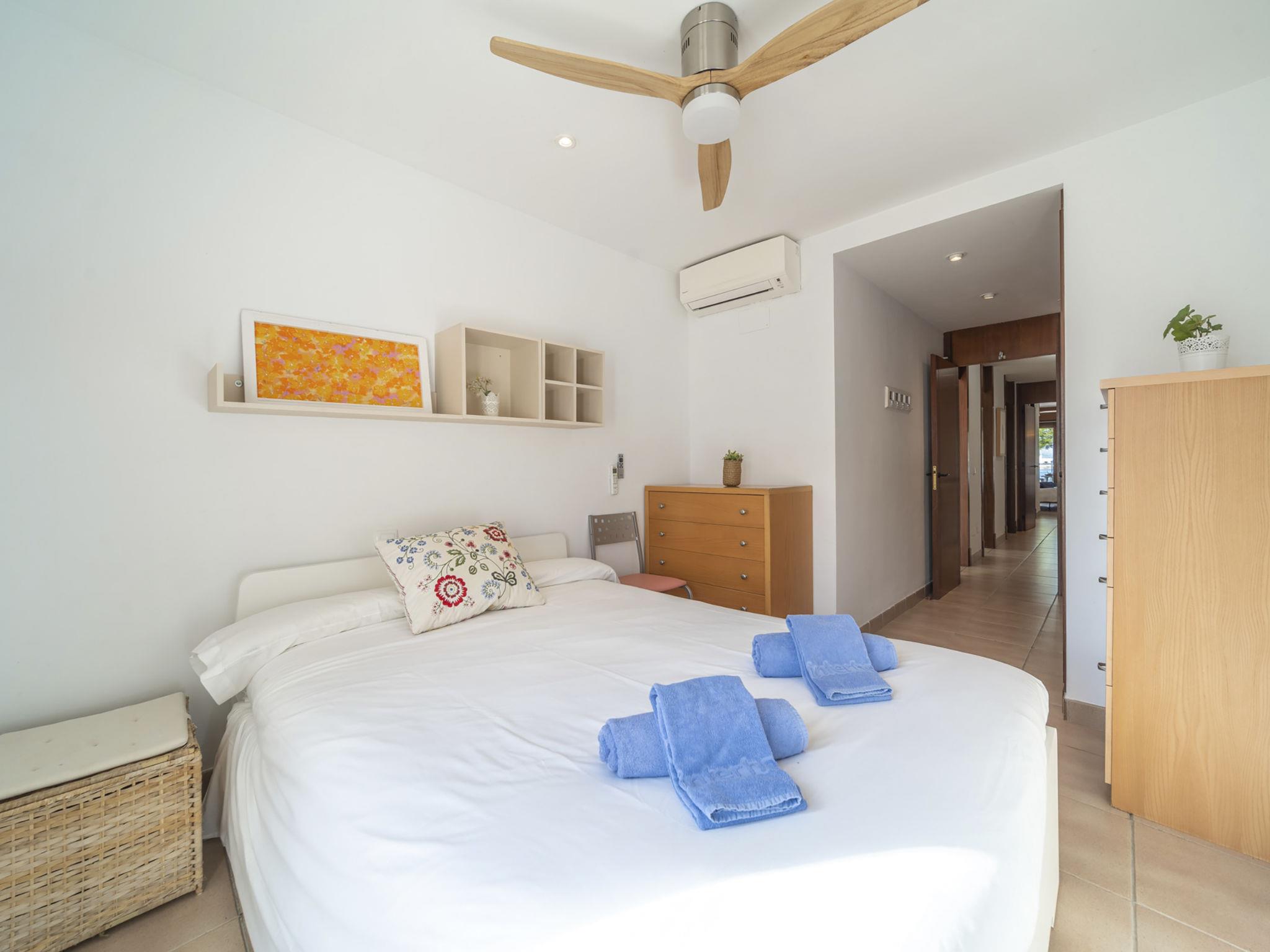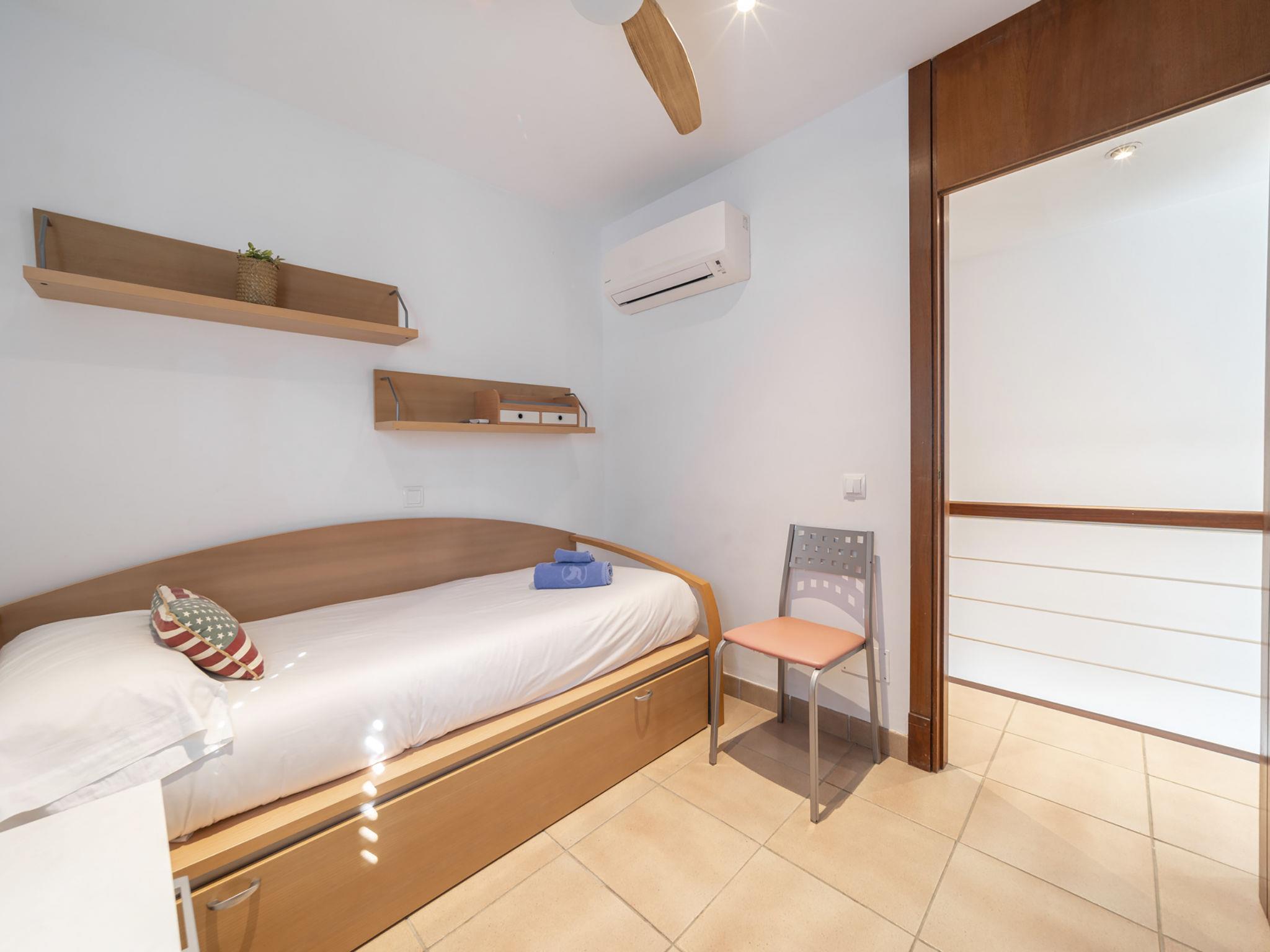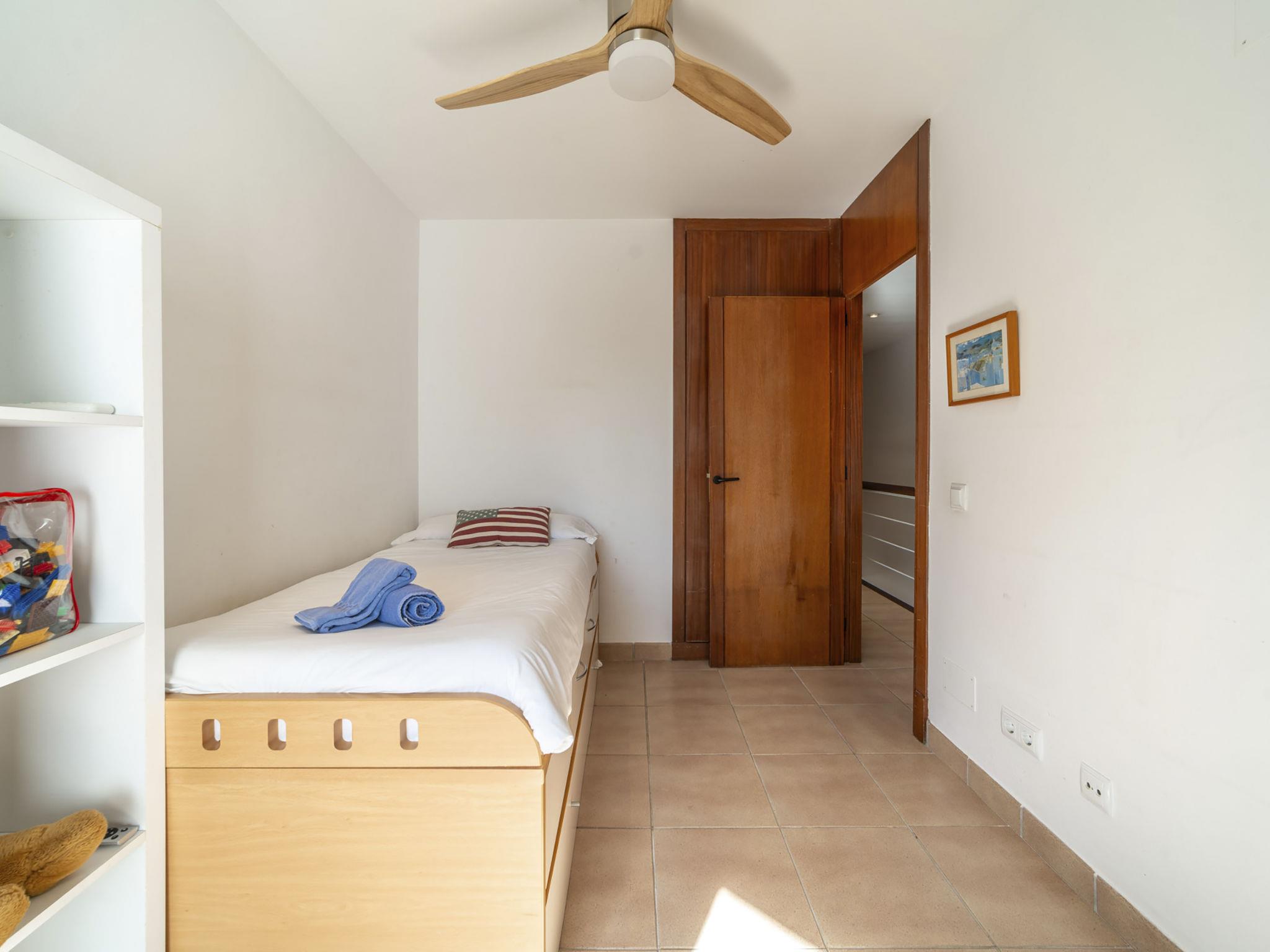 "Es Clot", 5-room semi-detached house 125 m2 on 2 levels. Object suitable for 8 adults. Spacious and bright, very comfortable and tasteful furnishings: large living/dining room with sliding door, panoramic window with dining table, satellite TV, air conditioning and forced-air heating. Exit to the patio. Kitchen (oven, dishwasher, 3 ceramic glass hob hotplates, toaster, kettle, microwave, freezer, electric coffee machine) with dining table. Bath/WC. Upper floor: 1 large double bedroom with sliding door, panoramic window with 1 french bed, bath/shower/WC, air conditioning, fan and forced-air heating. Exit to the balcony. 1 double bedroom with panoramic window with 1 pull-out bed (2 pers. 2 x 90 cm, length 190 cm), air conditioning, fan and forced-air heating. 2 rooms with panoramic window, each room with 1 pull-out bed (2 pers. 2 x 90 cm), air conditioning, fan and forced-air heating. Bath/WC with corner bath. Patio, lawn. Terrace furniture, barbecue, deck chairs, covered balcony. Marvellous view of the sea and the mountains. Facilities: washing machine, iron, children's high chair, baby cot, hair dryer. Internet (WiFi, free). Parking (fenced), garage. Suitable for families. ETV/8238