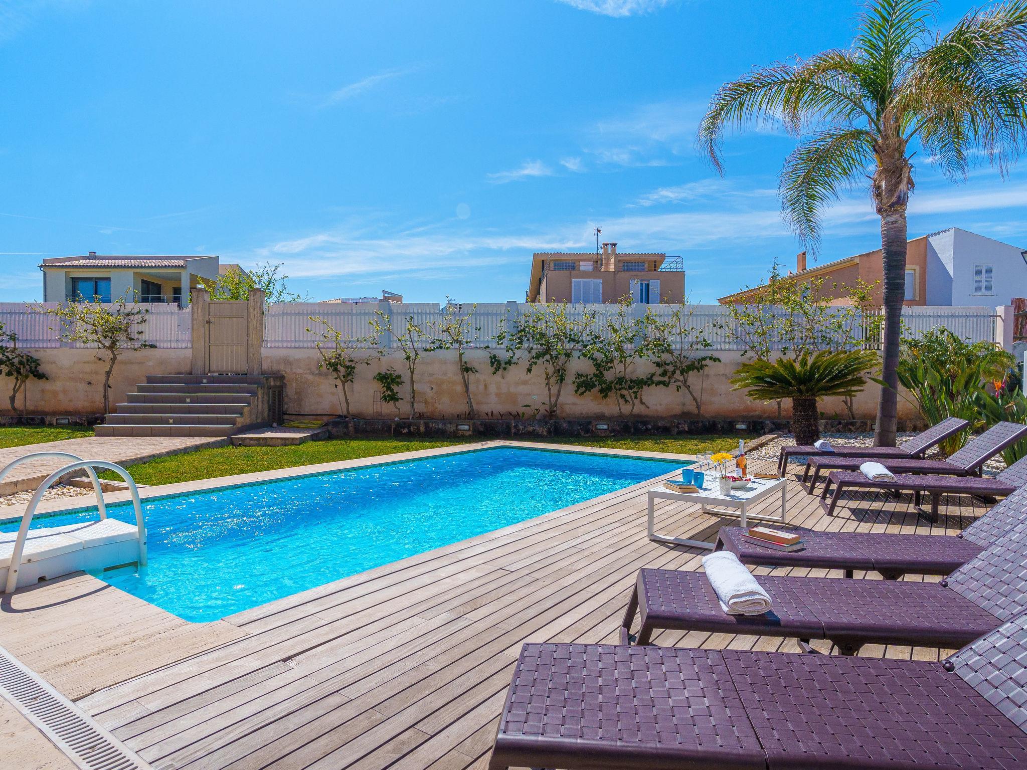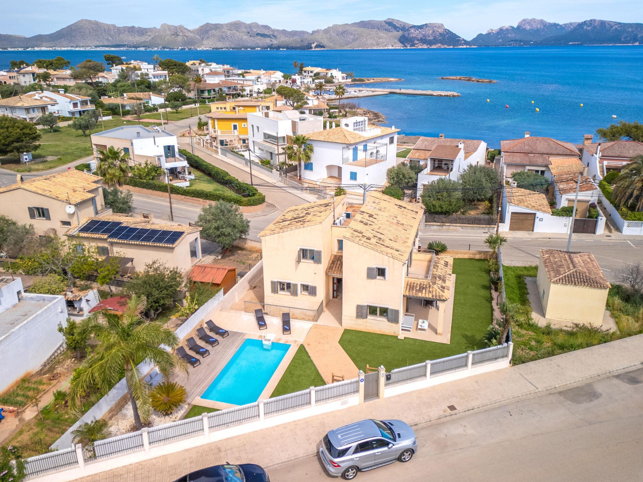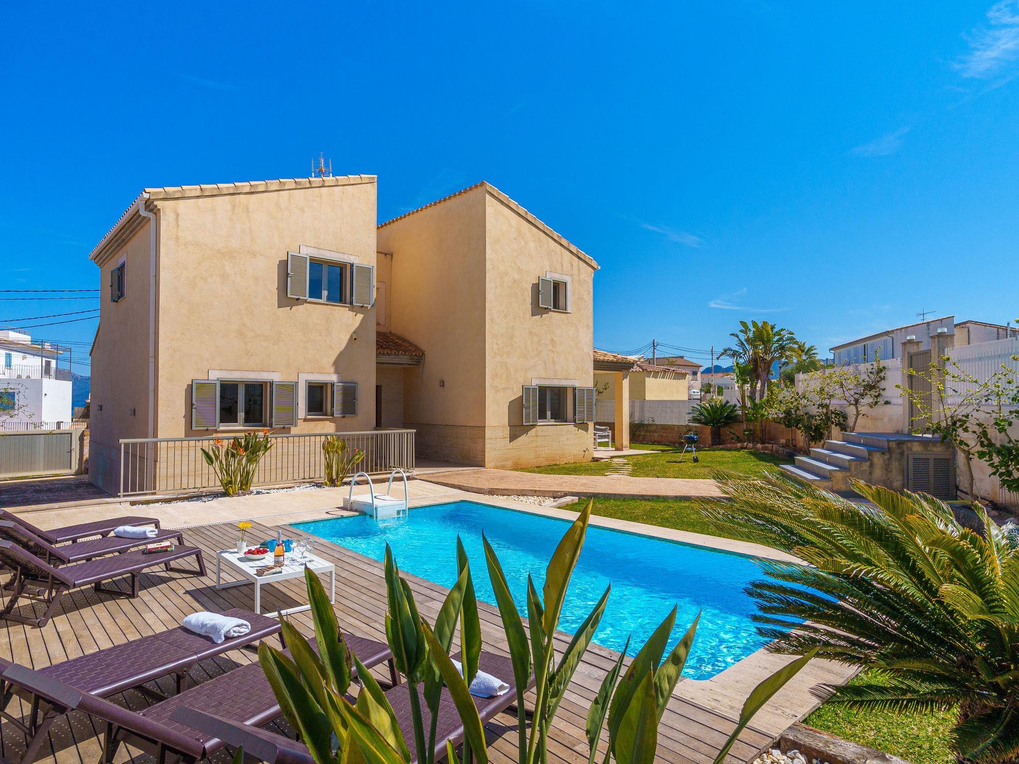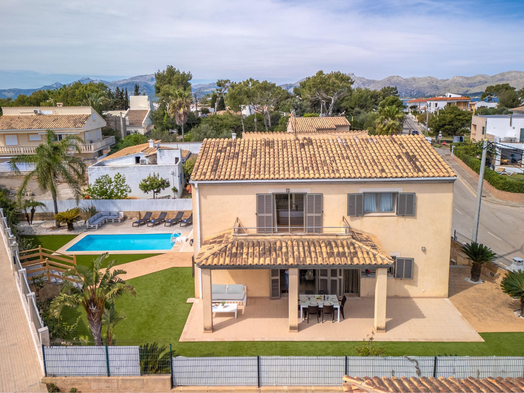Barcarés 1 km from Alcúdia: Very large, very modern villa "Son Jil", 2 storeys, detached, built in 2005. In a quiet, sunny position residential area (villas), 2 km from the edge of the forest, 60 m from the sea, road to cross. Private: large, well-kept garden with lawn and wildlife garden, swimming pool angular (8 x 4 m, depth 150 - 150 cm, seasonal availability: 01.Jan. - 31.Dec.) with salt-electrolysis pool-cleaning system. Outdoor shower, patio, arbour, pergola, garden furniture, barbecue. In the house: internet access, WiFi, central heating system, air conditioning, washing machine. Public car park, public parking on the road. Shop 1 km, supermarket 1.2 km, shopping centre 45 km, restaurant 160 m, bar, pedestrian zone 50 m, 15 minute walk to the centre, bus stop 1.5 km, ferry 3 km, sandy beach "Platja Es Morer Vermell" 550 m, rocky beach "Platja Es Barcarés" 60 m. Sports harbour 250 m, marina 3 km, golf course (18 hole) 6 km, tennis 2.5 km, riding stable 2.5 km, sports centre 2.5 km, walking paths from the house 1 km, cycle lane 700 m, children's playground 500 m. Nearby attractions: Ermita de la Victoria, Barcarés, Manresa, Sa Marina, Es Malpas. Ciutat Romana de Pollentia, Alcudia. Port d'Alcúdia, Port de Pollença - Pollença, North Beaches. Hiking paths: Sa Talaia, Es Puig de Sant Martí, Serra Tramuntana Pollença. Please note: suitable for families, suitable for seniors. Object suitable for 8 adults groups of teenagers on request only. Airfield 60 km from the property.