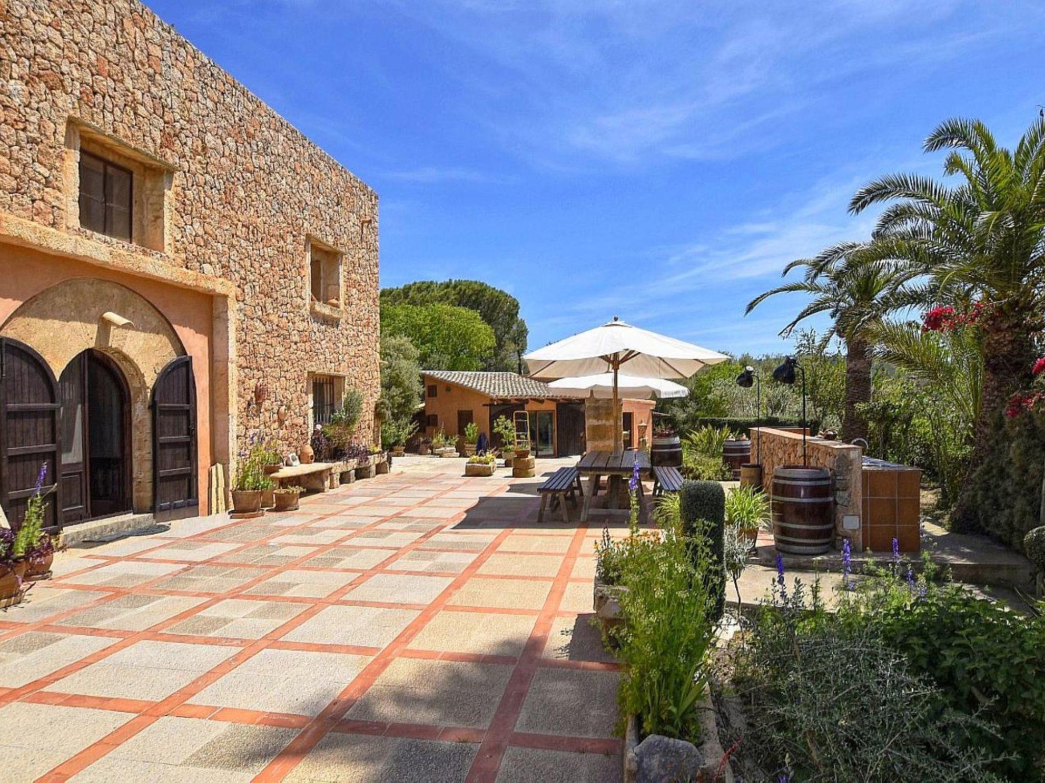 "Sa Torre", 5-room apartment 180 m2. Object suitable for 9 adults. Simple and rustic furnishings: 2 double bedrooms, each room with 2 beds (90 cm, length 200 cm), shower/WC and air conditioning. Exit to the balcony. On the lower ground floor: 1 room with 1 bed (90 cm, length 200 cm), air conditioning. 30 m2, Studio with 2 beds (90 cm, length 200 cm), dining nook, bath/WC, digital TV and air conditioning. Exit to the garden. Large kitchen (oven, 4 induction hot plates, toaster, kettle, microwave, electric coffee machine). Sep. WC. Upper floor: lounge with satellite TV. 1 double bedroom with 1 french bed (1 x 150 cm, length 200 cm), shower/WC and air conditioning. Natural stone floors. Terrace furniture, barbecue, deck chairs (9), covered balcony, sitting area. Beautiful view of the sea and the countryside. Facilities: washing machine, iron, children's high chair, baby cot for up to 2 year olds, hair dryer. Internet (WiFi, free). Parking at the house. Please note: suitable for families one double bedroom is outside the apartment. Non-smokers only, non-smoking house. ETV/4533 // Reg. Nr.: ESFCTU00000704300014119200000000000000000000ETV/45333