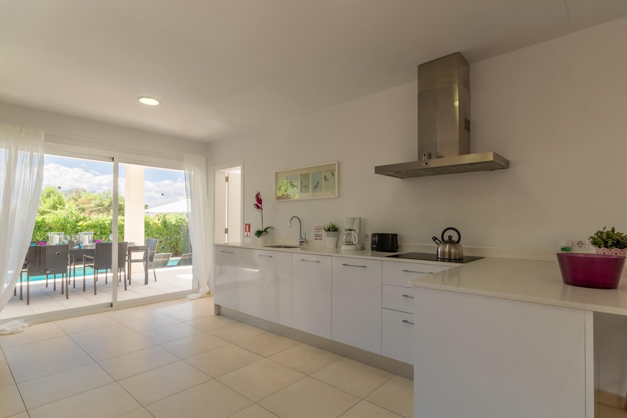 Stueetage: (Køkken(elkedel, brødrister, kaffemaskine, ovn, mikrobølgeovn, opvaskemaskine , køle-fryseskab, Saftpresser, elektriske kogeplader, , ), stue / spisestue(enkeltseng, enkeltseng, Fjernsyn(parabol), spisebord, sofahjørne, DVD-afspiller, radio), soveværelse(enkeltseng, enkeltseng), soveværelse(dobbeltseng), badeværelse(badekar), Internetadgang) På 1. etage: (Soveværelse med badeværelse(dobbeltseng, Fjernsyn, bruser), Soveværelse med badeværelse(enkeltseng, enkeltseng, Fjernsyn, bruser)) Havemøbler, solarium, vaskemaskine, varme, klimaanlæg, terrasse, have, solstole, grill, parkering, swimmingpool(privat, udendørs), strygejern