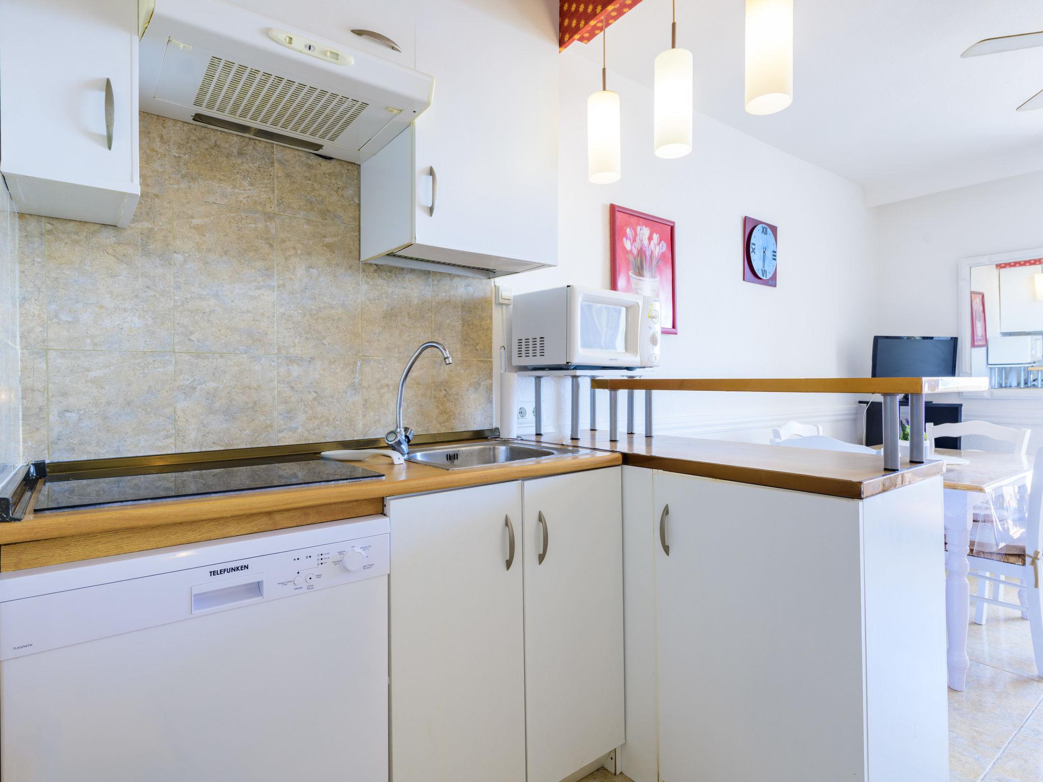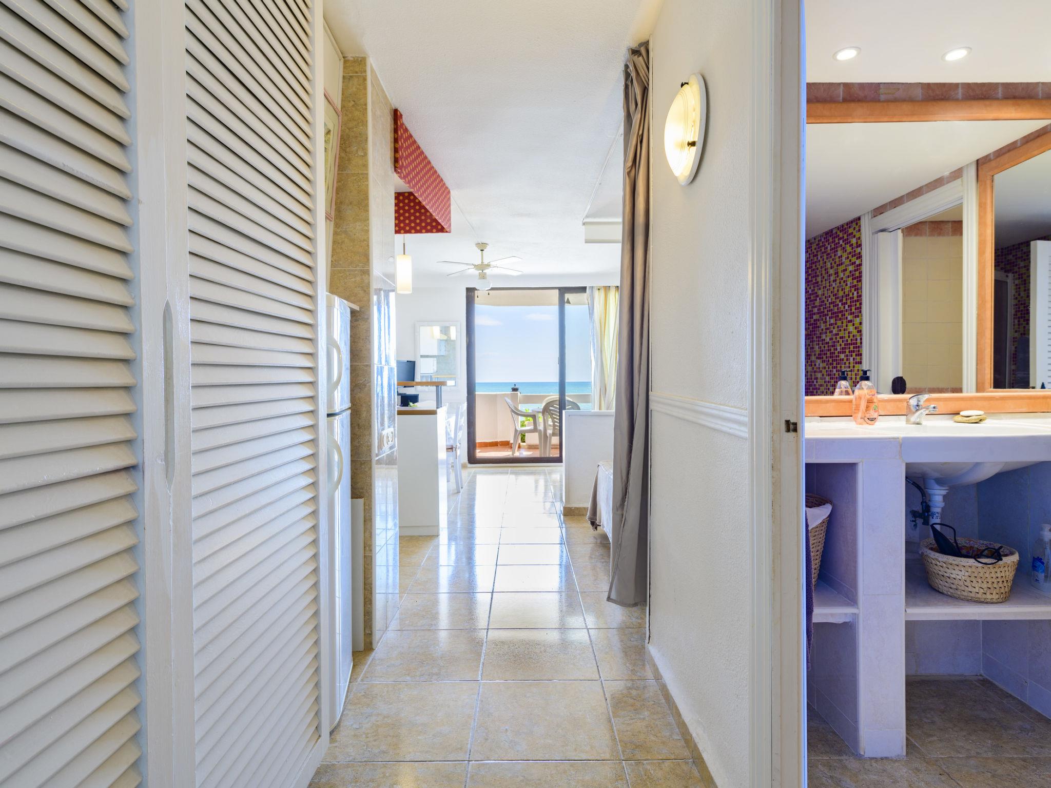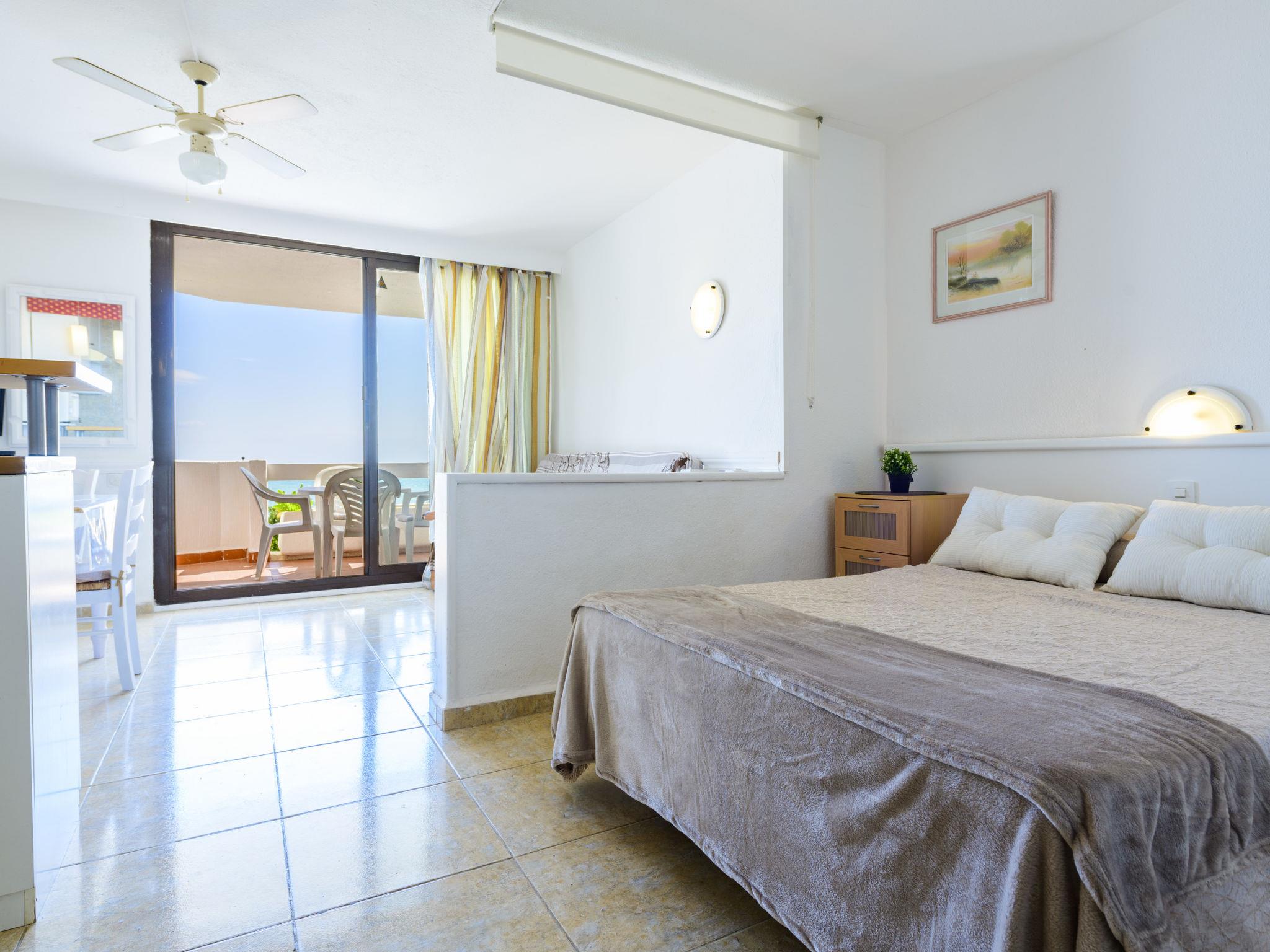 "Eurhostal - Seaview", 1-room studio 45 m2. Object suitable for 2 adults + 1 child. Practical and comfortable furnishings: living/dining room with 1 double sofabed (120 cm, length 190 cm), fan. Exit to the terrace. 1 open room with curtain with 1 french bed (135 cm, length 190 cm), fan. Open kitchen (dishwasher, 3 ceramic glass hob hotplates, toaster, microwave, freezer) with bar. Shower/WC. Electric heating. Terrace. Terrace furniture. Very beautiful view of the sea and the resort. Facilities: washing machine, iron, hair dryer. Please note: non-smokers only. Maximum 1 pet/ dog allowed. VT-41547CS // Reg. Nr.: ESFCTU000012006000111154000000000000000000VT-41547CS0