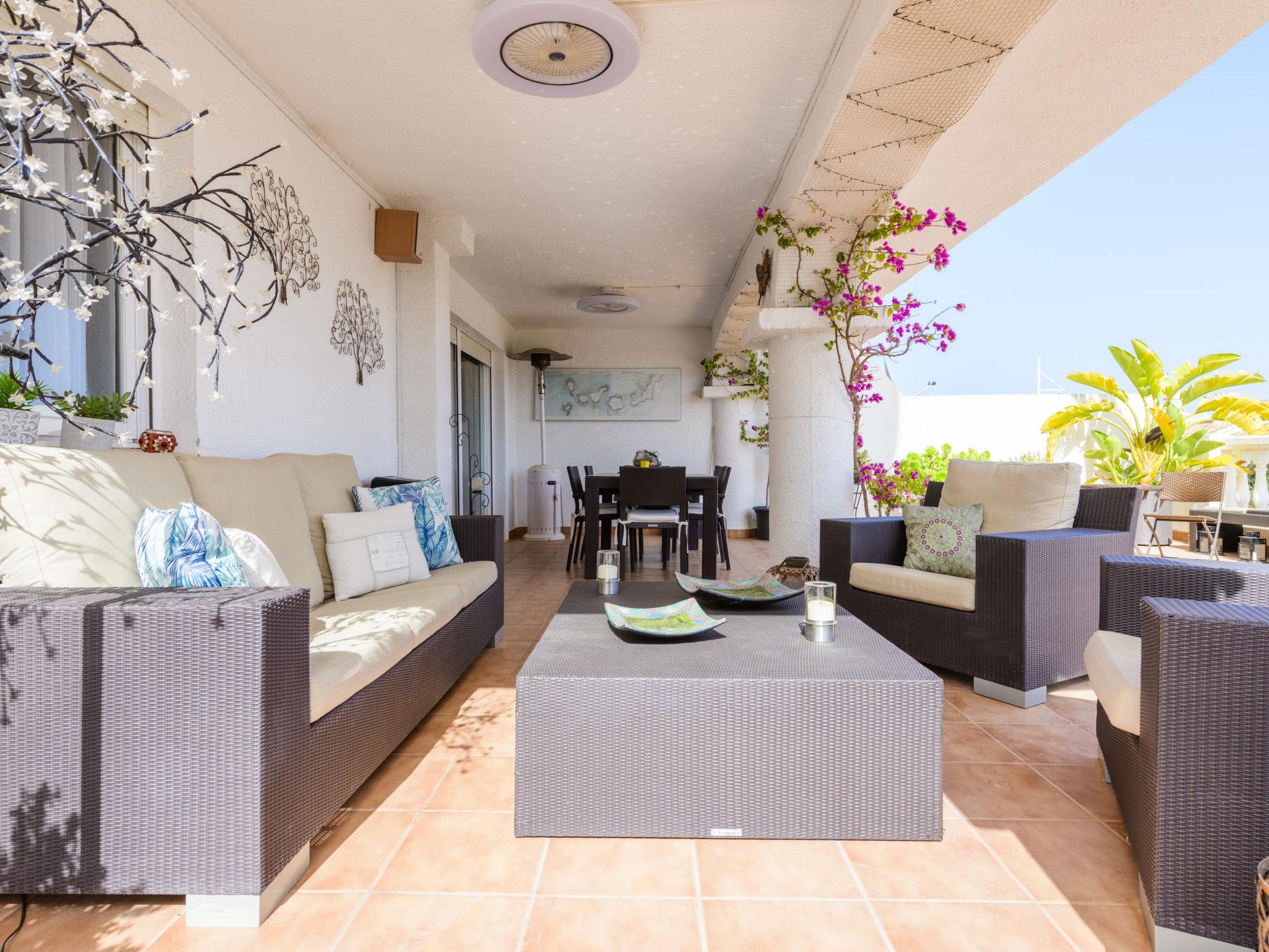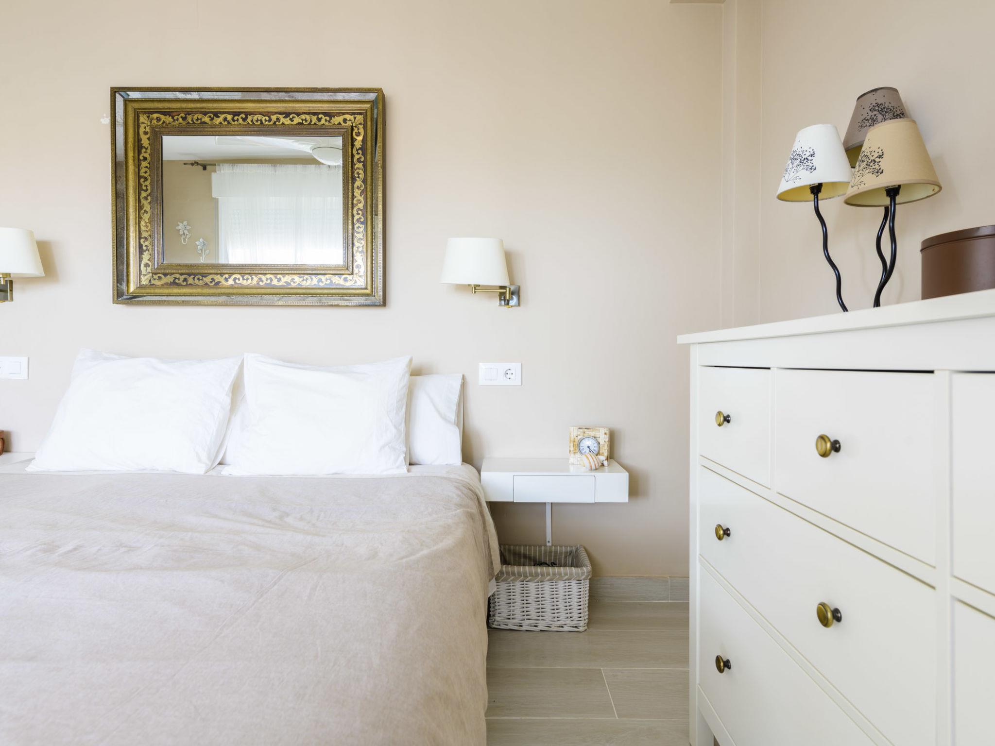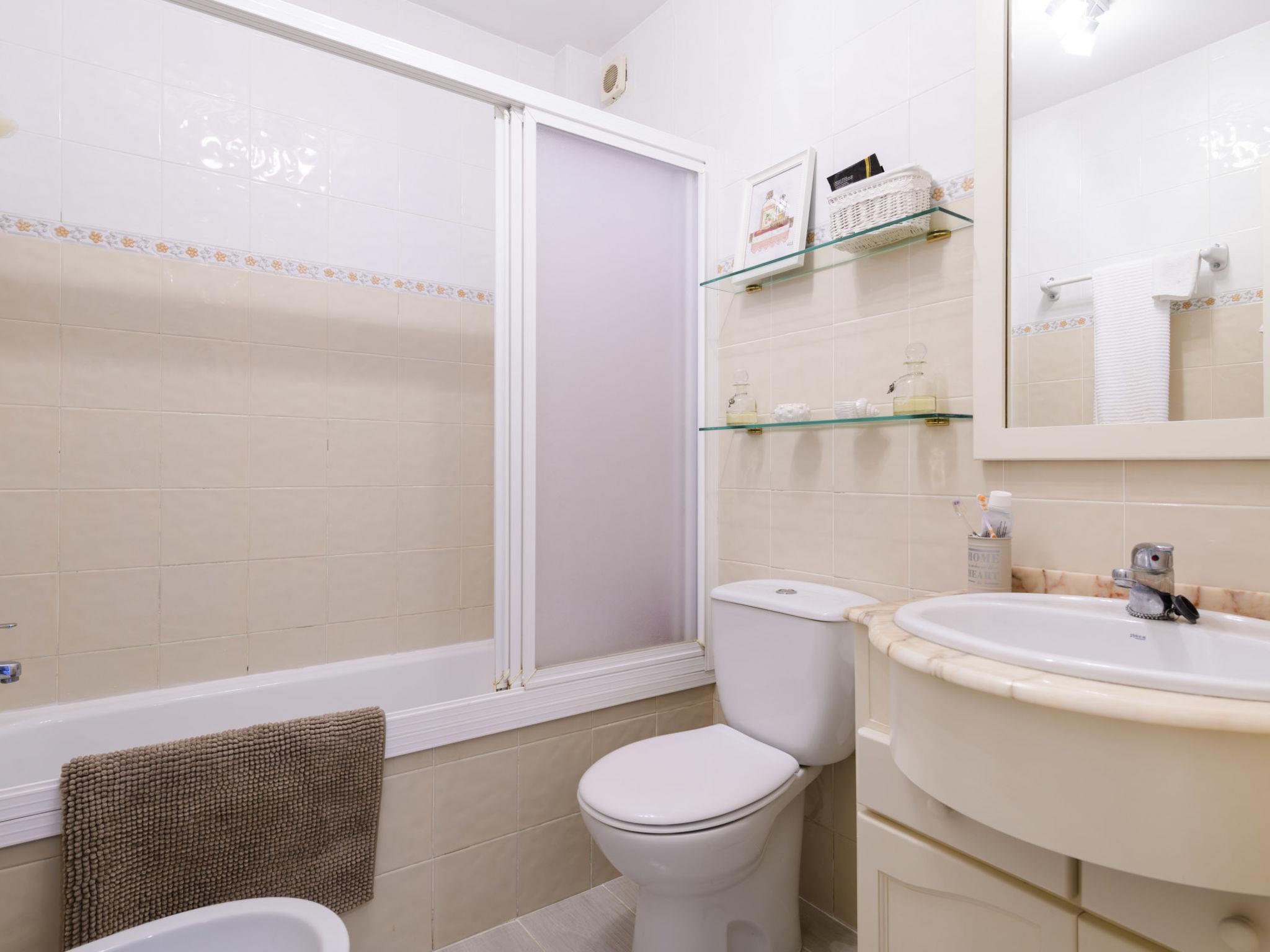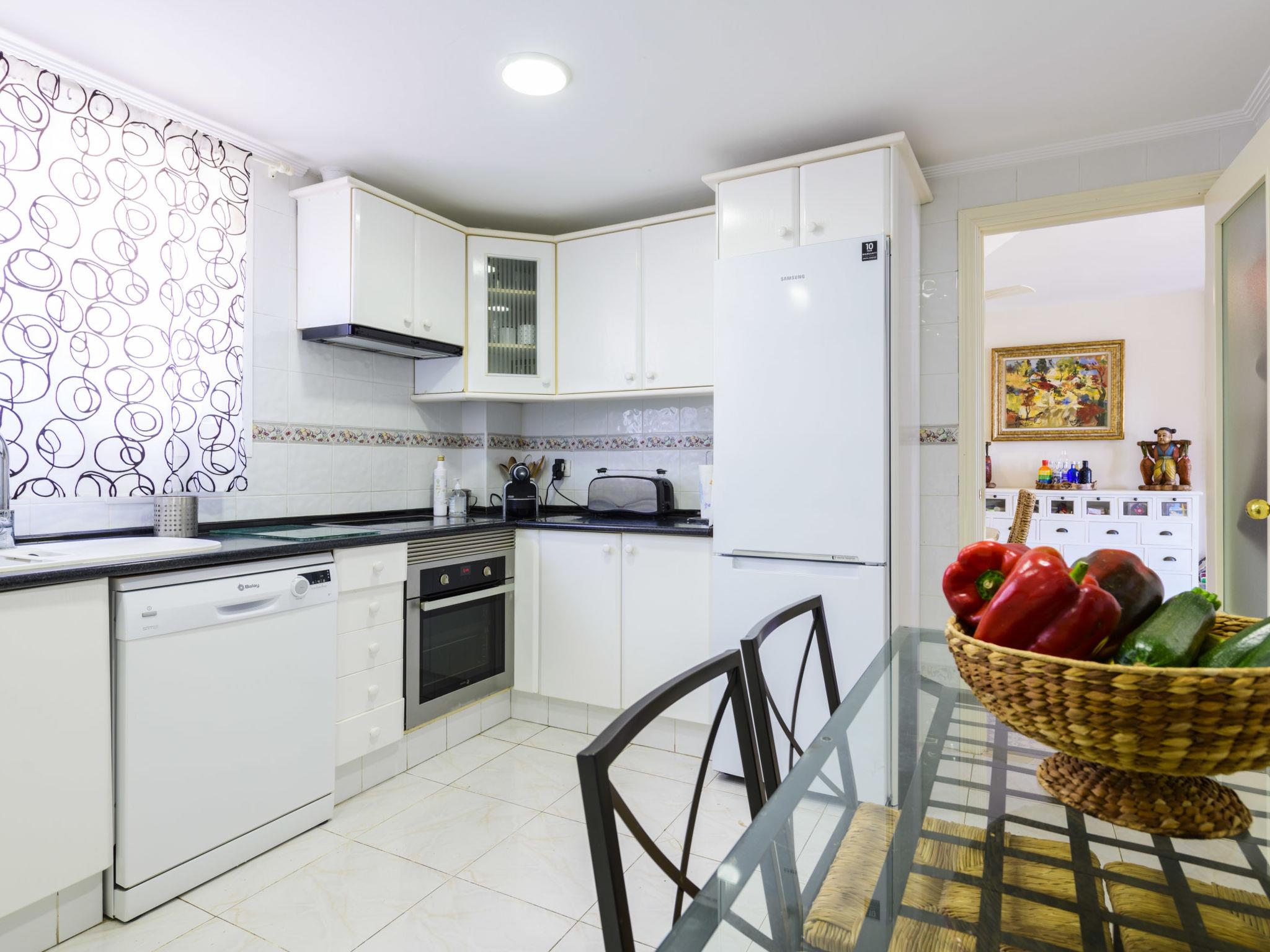 "Dúplex Seaview", 4-room apartment 80 m2 on 2 levels, on the upper floor. Spacious and bright, very comfortable furnishings: large living/dining room with dining table, digital TV, flat screen, radio, hi-fi system and fan. Exit to the terrace. 1 room with 1 double sofabed (135 cm, length 190 cm), fan. Kitchen (oven, dishwasher, 4 ceramic glass hob hotplates, toaster, microwave, freezer, electric coffee machine). Shower/bidet/WC. No heating option. Upper floor: 1 double bedroom with 1 french bed (160 cm, length 200 cm), fan. Exit to the terrace. 1 double bedroom with 2 beds (90 cm, length 190 cm), fan. Bath/bidet/WC. Large terrace 140 m2, small terrace 12 m2. Terrace furniture, deck chairs (4). View of the sea and the resort. Facilities: washing machine, iron, hair dryer. Parking (roofed). Please note: suitable for families. Non-smokers only. VT-46059-CS // Reg. Nr.: ESFCTU00001200600032054900000000000000000VT-46059-CS8