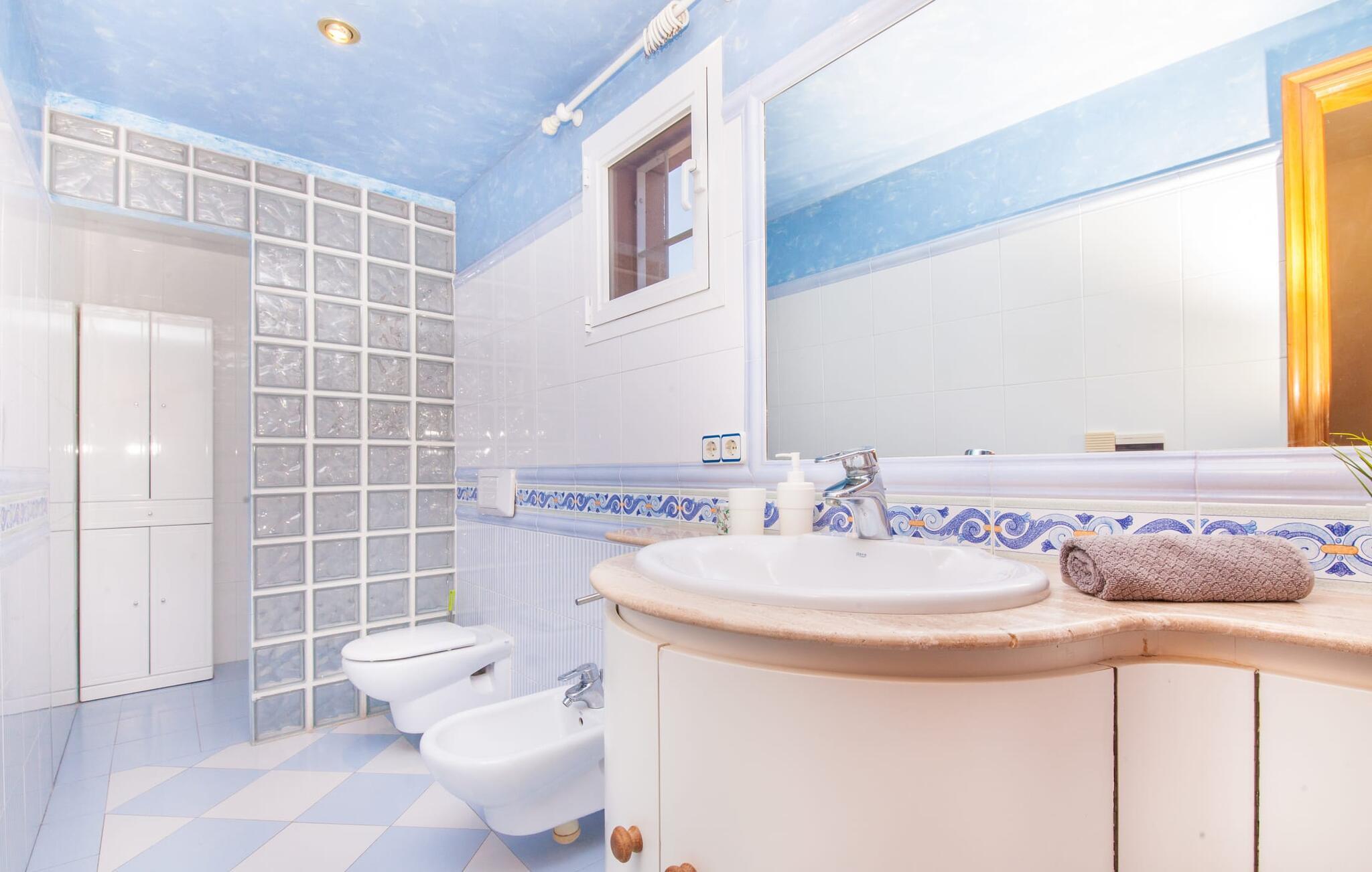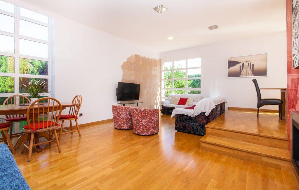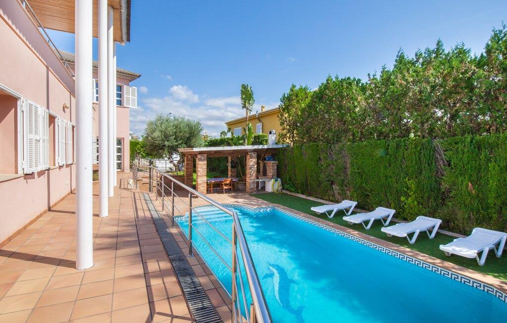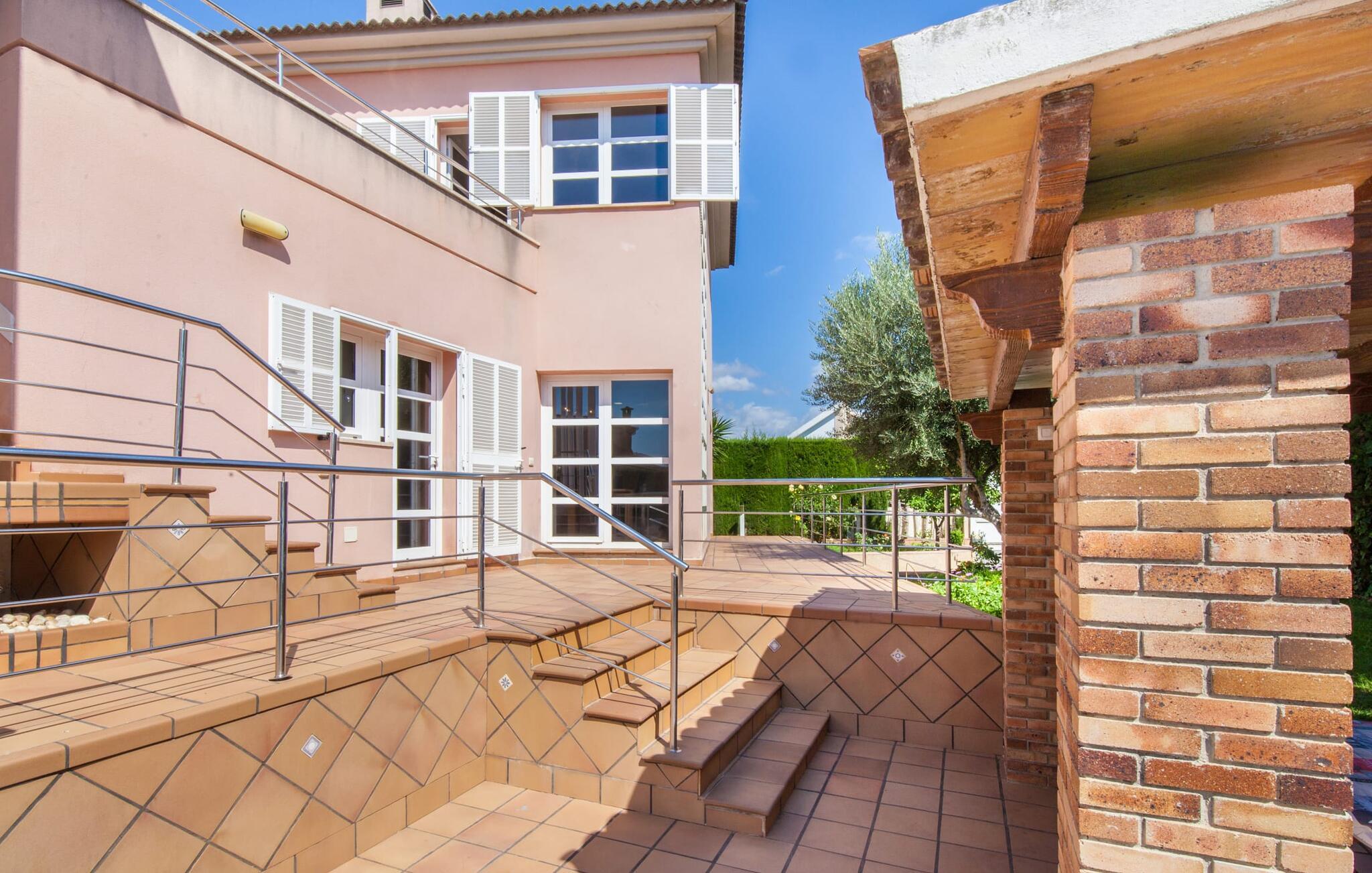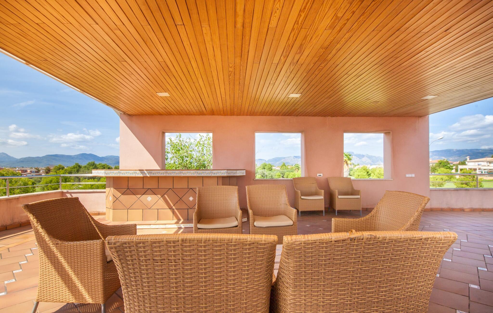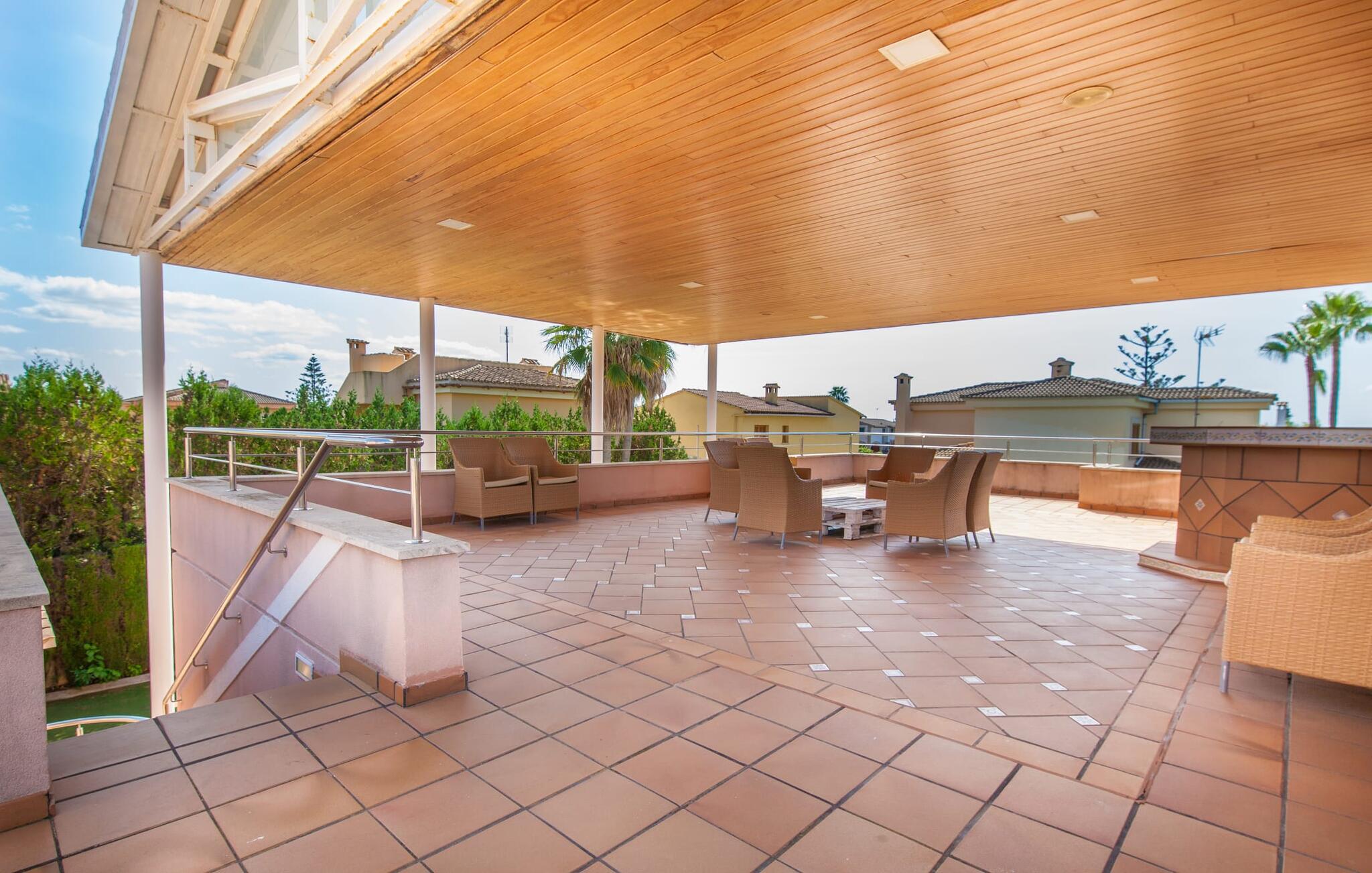 Alfabia tilbyder det perfekte tilflugtssted efter en lang gåtur gennem Palmas travle gader. En høj hæk, der garanterer privatliv, en stor pool med etageret terrasse omgivet af velplejet kunstgræs - det handler om afslapning. Lige ved siden af poolen venter en hyggelig, overdækket terrasse på, at I kan puste lidt liv i den. Mens I stadig er i humør til en forfriskende svømmetur i udendørsbruseren, kan andre sultne besøgende få travlt med at tænde op i grillen. Frisk fisk og vin – hvad mere har I brug for? Og hvis I stadig vil have mere underholdning, kan I prøve et spil dart om aftenen. Over poolen er villaen vært for endnu en tagterrasse med vidunderlig udsigt over de omkringliggende tage og bjerge i det fjerne. En lille disk, smarte kunstrattanmøbler, masser af plads og en fantastisk udsigt - dette er klart det perfekte sted til et udendørs møde. En asfalteret indkørsel fører direkte til villaen, og der er masser af parkeringspladser på gaden foran huset. I kan tilbringe hyggelige timer i flok i villaens åbne stue/spisestue. På den ene side en sofa, på den anden et spisebord med en sofagruppe; Kort sagt: et udvalg af sæder gør det nemt at tilbringe tid sammen. Individuelle farveaccenter, diskret dekoration og store vinduer skaber en behagelig atmosfære i dette hyggelige rum. Vil I undgå solen eller se jeres yndlingsserie, bliver I passet godt på foran fladskærms-tv'et eller den kunstige pejs. I det næste værelse køkkenet: fuldt udstyret, lyst og frem for alt med et stort køleskab til drinks, morgenmad osv. Indretningen af soveværelserne kunne være et rigtigt knastpunkt i dette hus. Hvem vil holde deres nerver og få deluxe værelse på første sal? Walk-in closets, fladskærms-tv og eget badeværelse med udgang til tagterrassen – det er vigtigt, at den heldige vinder ikke glemmer at forlade sit værelse i ny og næ. I alt har huset fire soveværelser med dobbeltsenge (herunder tre dobbeltværelser), et enkelt soveværelse og tre badeværelser. "Alfabia", nordøst for Palma, er et godt udgangspunkt for adskillige ferieaktiviteter: sightseeing, prøve tapas i havnen, shoppe souvenirs, tilbringe dage på stranden. Kreative mennesker kan besøge Sound Museum i Marratxí eller Mallorcas største kunsthåndværksudstilling, Feria del Fang, en gang om året om foråret. På grund af den centrale beliggenhed i byen kan der af og til høres trafikstøj. Men takket være den gode infrastruktur er det nemt at nå andre dele af øen. Hvad med en dagsvandring i Tramuntana-bjergene, for eksempel? Familier besøger ofte Aqualand i El Arenal eller de utrolige strande i nærheden. Ciudad Jardin ligger kun 8 km væk, og andre smukke bugter er ikke meget længere væk. Den moderne villa "Alfabia" ligger godt 7 km nordøst for Palma de Mallorca, i det populære område Pont d'Inca Nou i Marratxí kommune. Øens hovedstad ligger kun 7 km væk, og den nærmeste metrostation ligger kun få minutters gang væk. Palma Lufthavn kan nås på ingen tid, og den smukke strandby Ciudad Jardin ligger kun 8 km væk i bil.