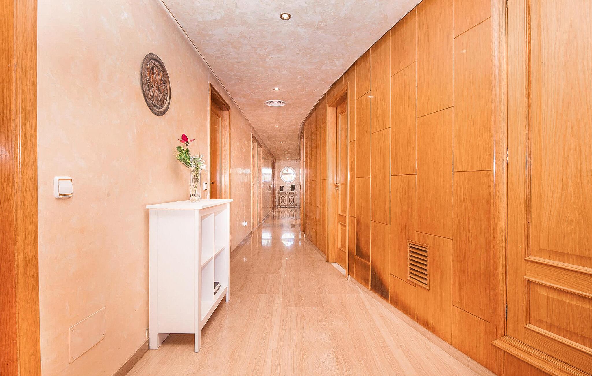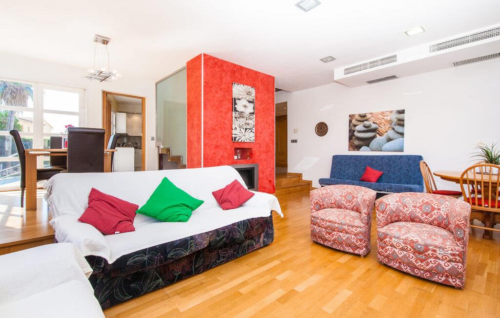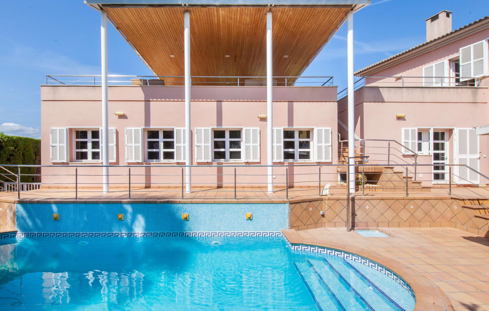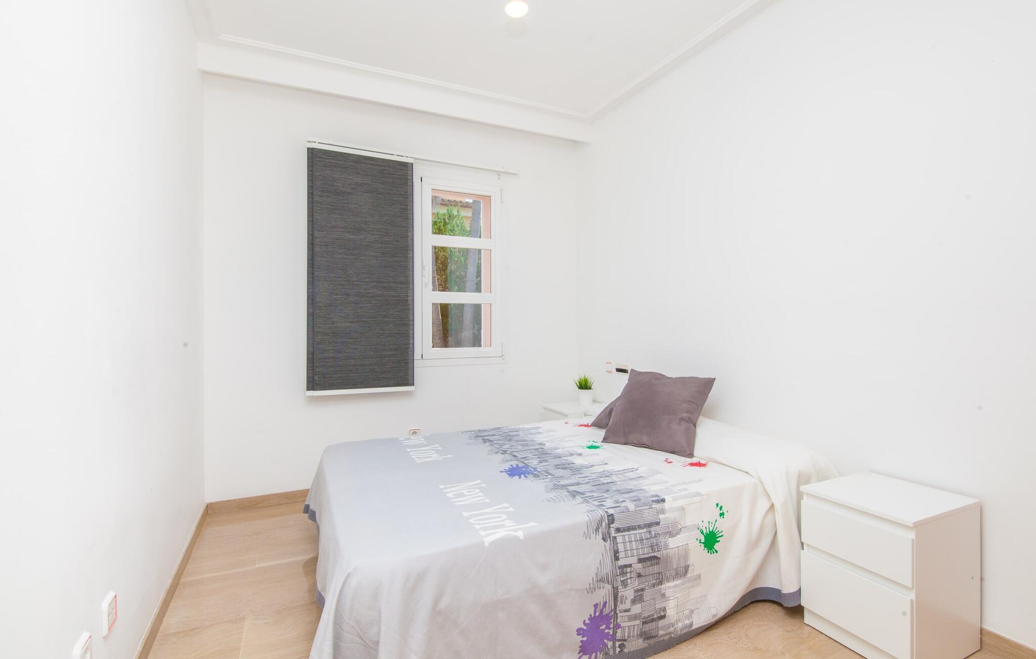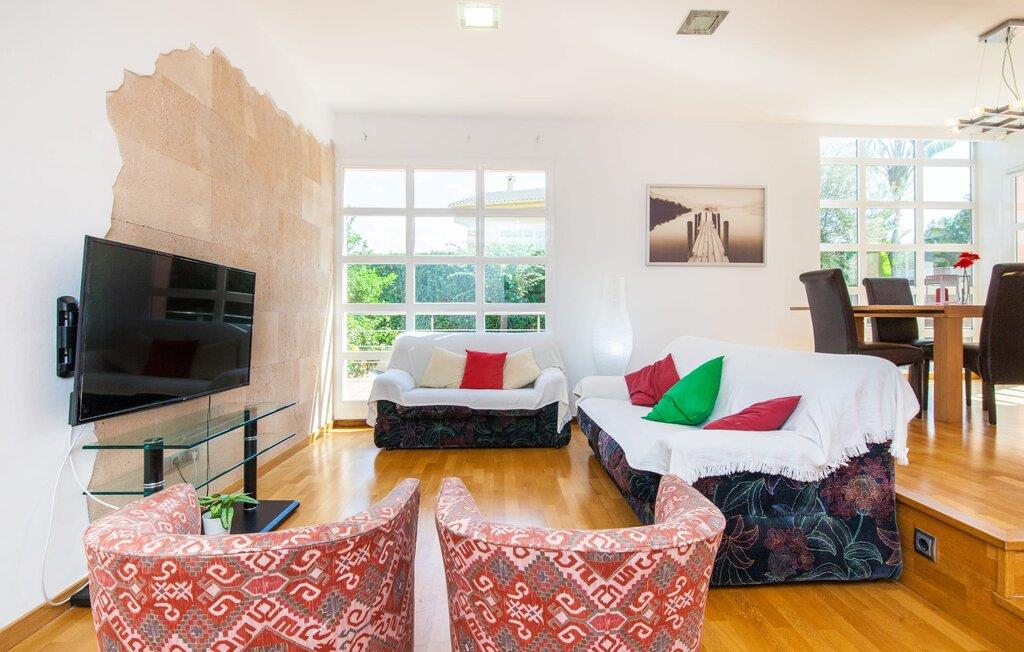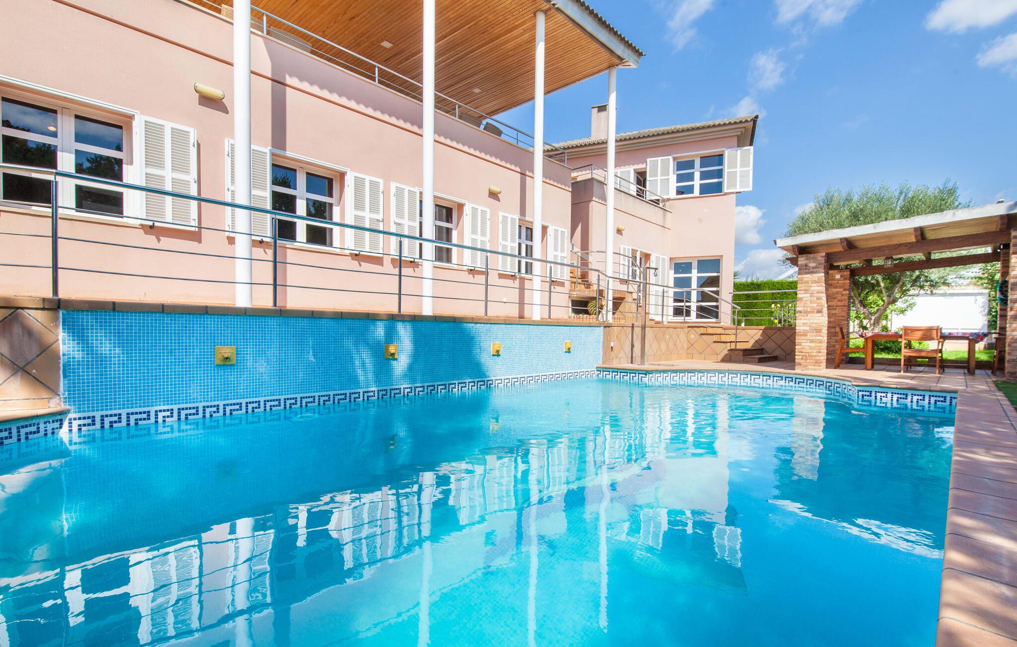 Alfabia tilbyder det perfekte tilflugtssted efter en lang gåtur gennem Palmas travle gader. En høj hæk, der garanterer privatliv, en stor pool med etageret terrasse omgivet af velplejet kunstgræs - det handler om afslapning. Lige ved siden af poolen venter en hyggelig, overdækket terrasse på, at I kan puste lidt liv i den. Mens I stadig er i humør til en forfriskende svømmetur i udendørsbruseren, kan andre sultne besøgende få travlt med at tænde op i grillen. Frisk fisk og vin – hvad mere har I brug for? Og hvis I stadig vil have mere underholdning, kan I prøve et spil dart om aftenen. Over poolen er villaen vært for endnu en tagterrasse med vidunderlig udsigt over de omkringliggende tage og bjerge i det fjerne. En lille disk, smarte kunstrattanmøbler, masser af plads og en fantastisk udsigt - dette er klart det perfekte sted til et udendørs møde. En asfalteret indkørsel fører direkte til villaen, og der er masser af parkeringspladser på gaden foran huset. I kan tilbringe hyggelige timer i flok i villaens åbne stue/spisestue. På den ene side en sofa, på den anden et spisebord med en sofagruppe; Kort sagt: et udvalg af sæder gør det nemt at tilbringe tid sammen. Individuelle farveaccenter, diskret dekoration og store vinduer skaber en behagelig atmosfære i dette hyggelige rum. Vil I undgå solen eller se jeres yndlingsserie, bliver I passet godt på foran fladskærms-tv'et eller den kunstige pejs. I det næste værelse køkkenet: fuldt udstyret, lyst og frem for alt med et stort køleskab til drinks, morgenmad osv. Indretningen af soveværelserne kunne være et rigtigt knastpunkt i dette hus. Hvem vil holde deres nerver og få deluxe værelse på første sal? Walk-in closets, fladskærms-tv og eget badeværelse med udgang til tagterrassen – det er vigtigt, at den heldige vinder ikke glemmer at forlade sit værelse i ny og næ. I alt har huset fire soveværelser med dobbeltsenge (herunder tre dobbeltværelser), et enkelt soveværelse og tre badeværelser. "Alfabia", nordøst for Palma, er et godt udgangspunkt for adskillige ferieaktiviteter: sightseeing, prøve tapas i havnen, shoppe souvenirs, tilbringe dage på stranden. Kreative mennesker kan besøge Sound Museum i Marratxí eller Mallorcas største kunsthåndværksudstilling, Feria del Fang, en gang om året om foråret. På grund af den centrale beliggenhed i byen kan der af og til høres trafikstøj. Men takket være den gode infrastruktur er det nemt at nå andre dele af øen. Hvad med en dagsvandring i Tramuntana-bjergene, for eksempel? Familier besøger ofte Aqualand i El Arenal eller de utrolige strande i nærheden. Ciudad Jardin ligger kun 8 km væk, og andre smukke bugter er ikke meget længere væk. Den moderne villa "Alfabia" ligger godt 7 km nordøst for Palma de Mallorca, i det populære område Pont d'Inca Nou i Marratxí kommune. Øens hovedstad ligger kun 7 km væk, og den nærmeste metrostation ligger kun få minutters gang væk. Palma Lufthavn kan nås på ingen tid, og den smukke strandby Ciudad Jardin ligger kun 8 km væk i bil.