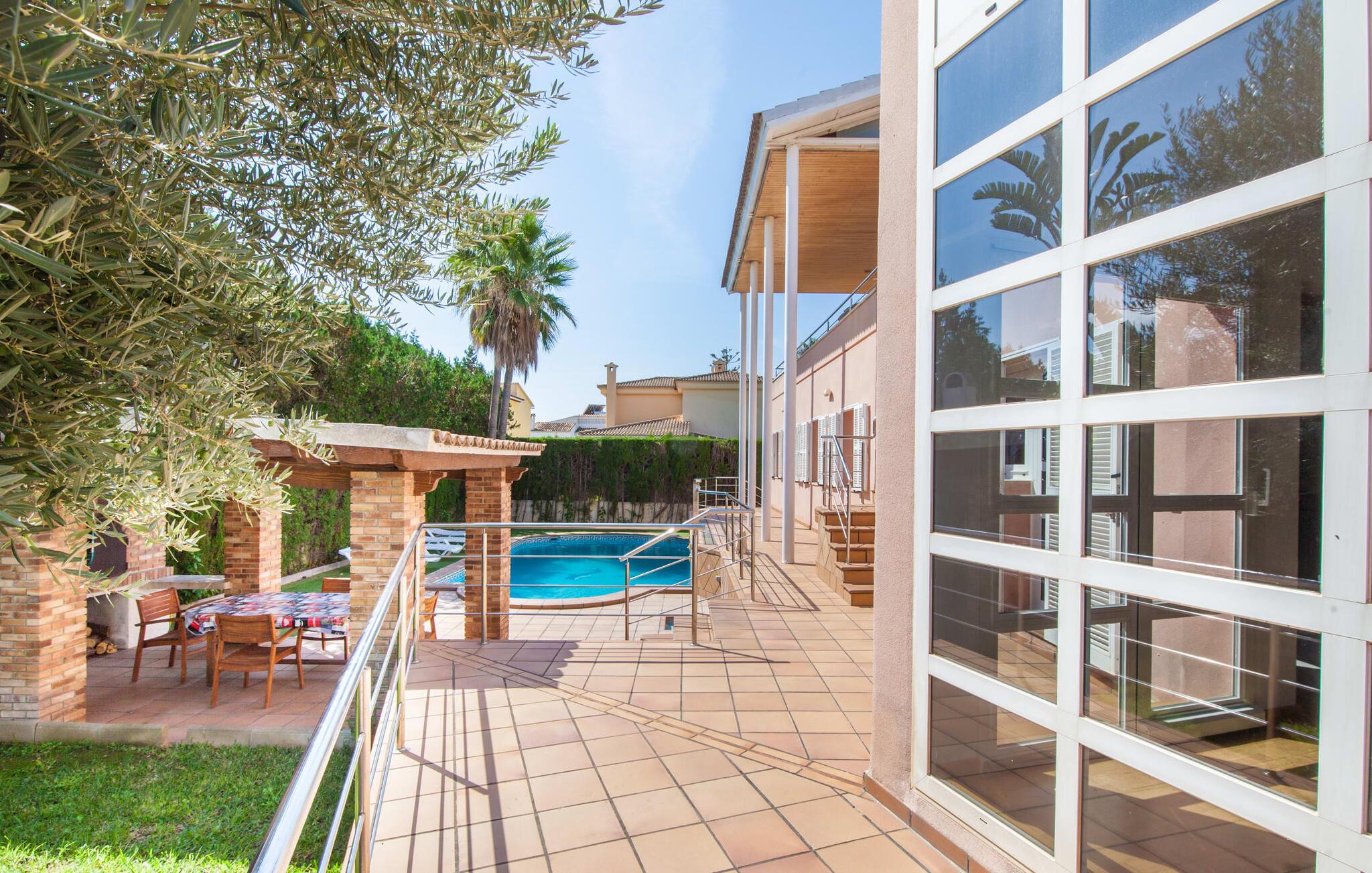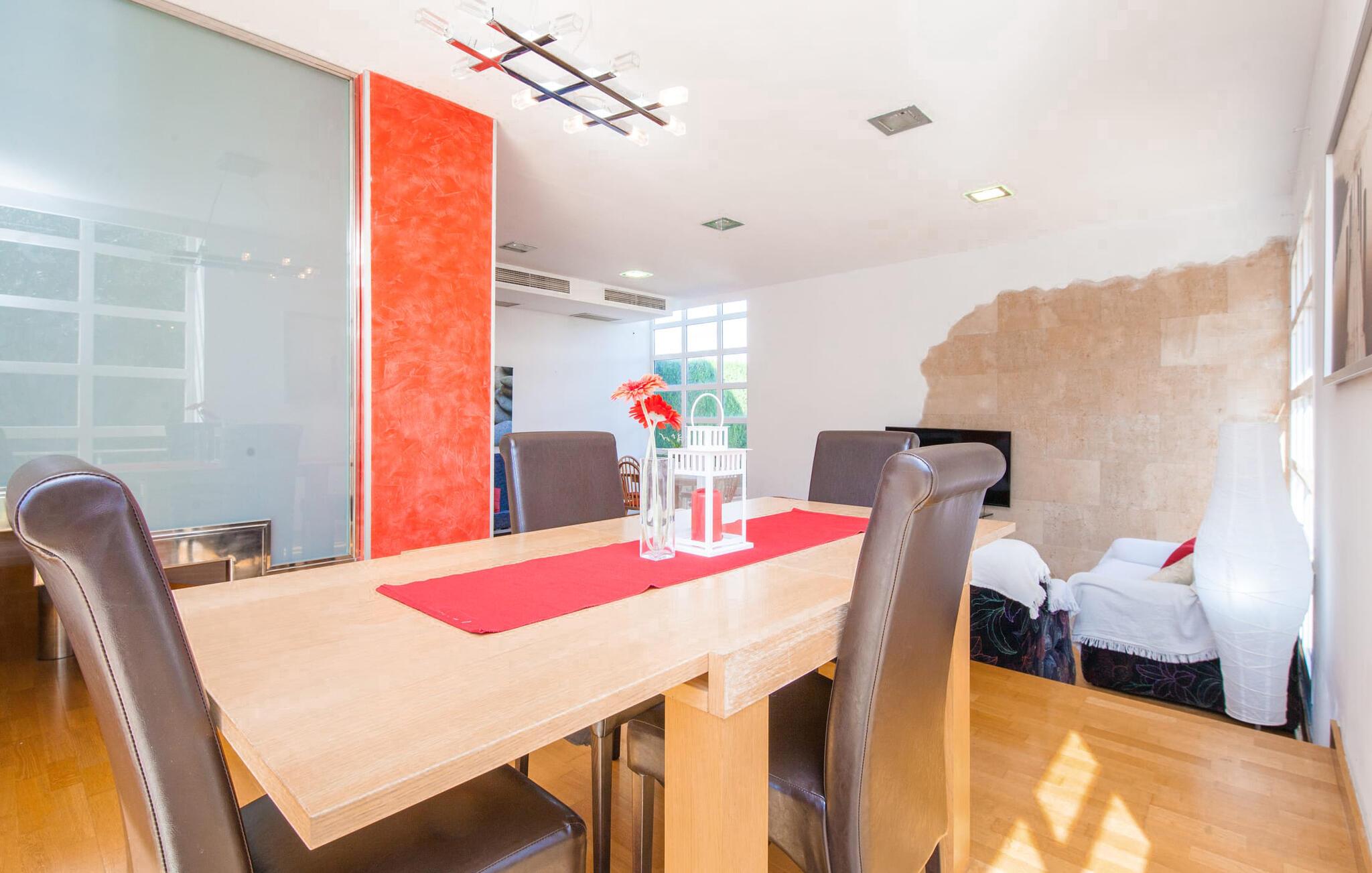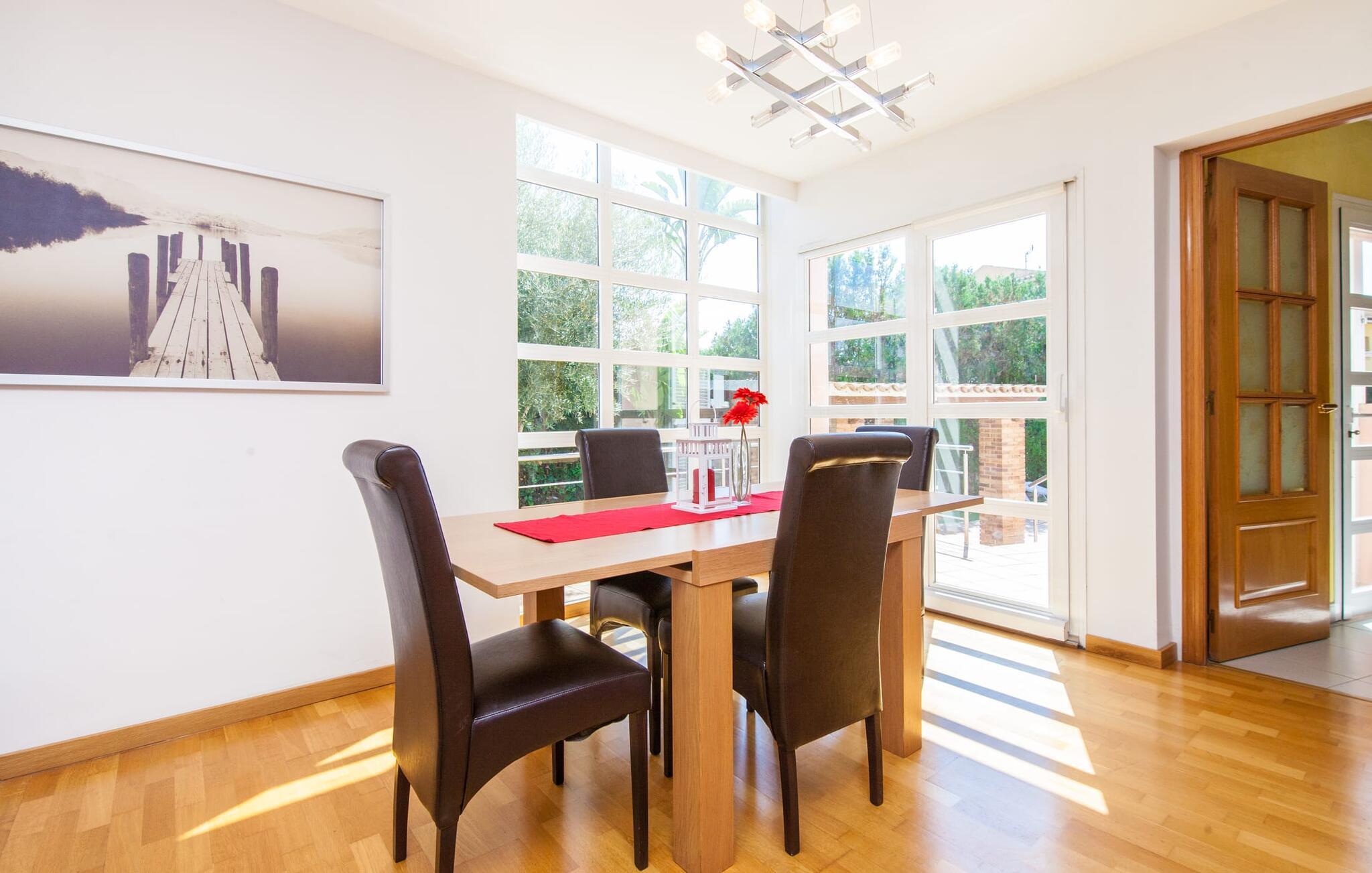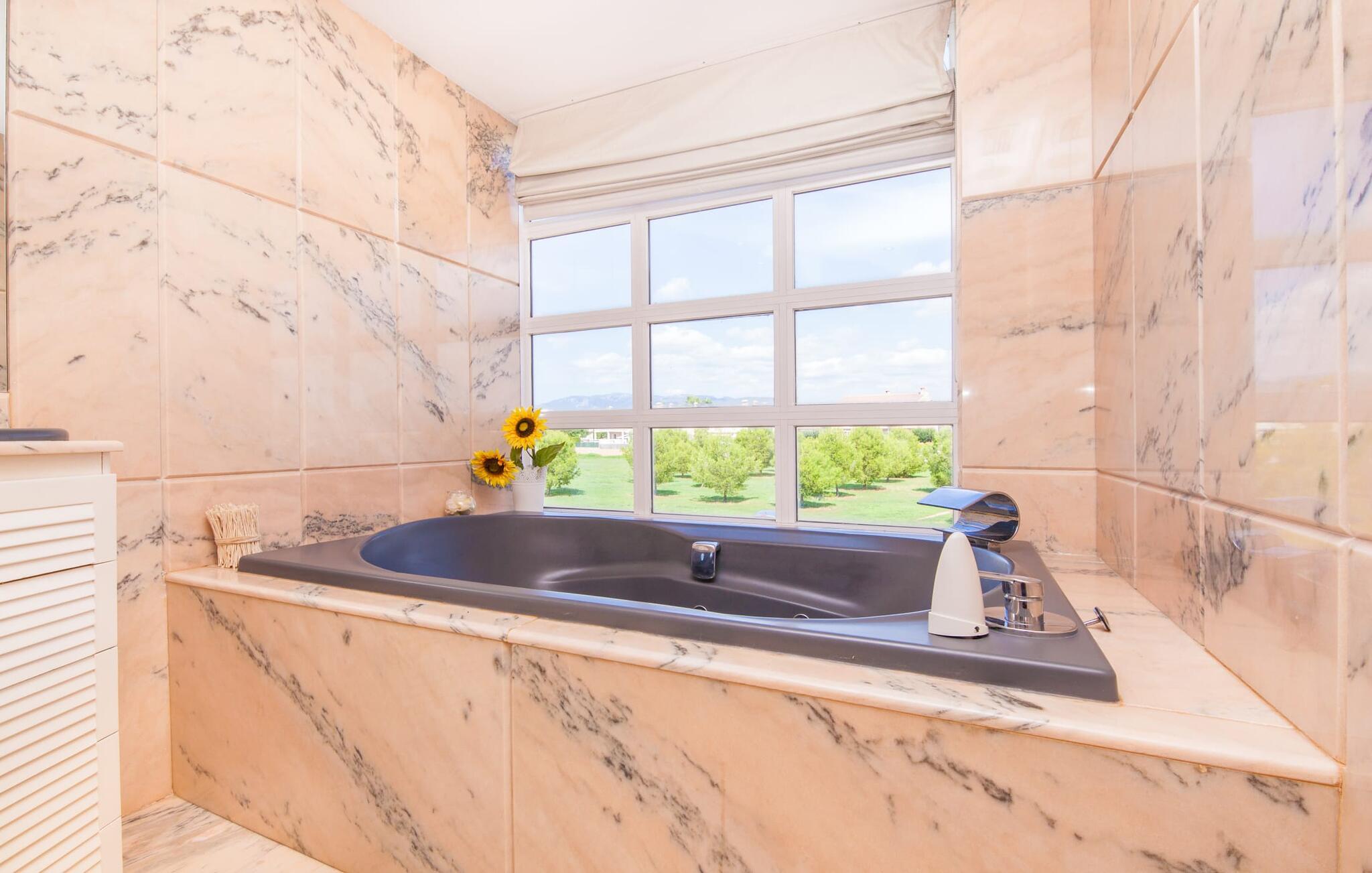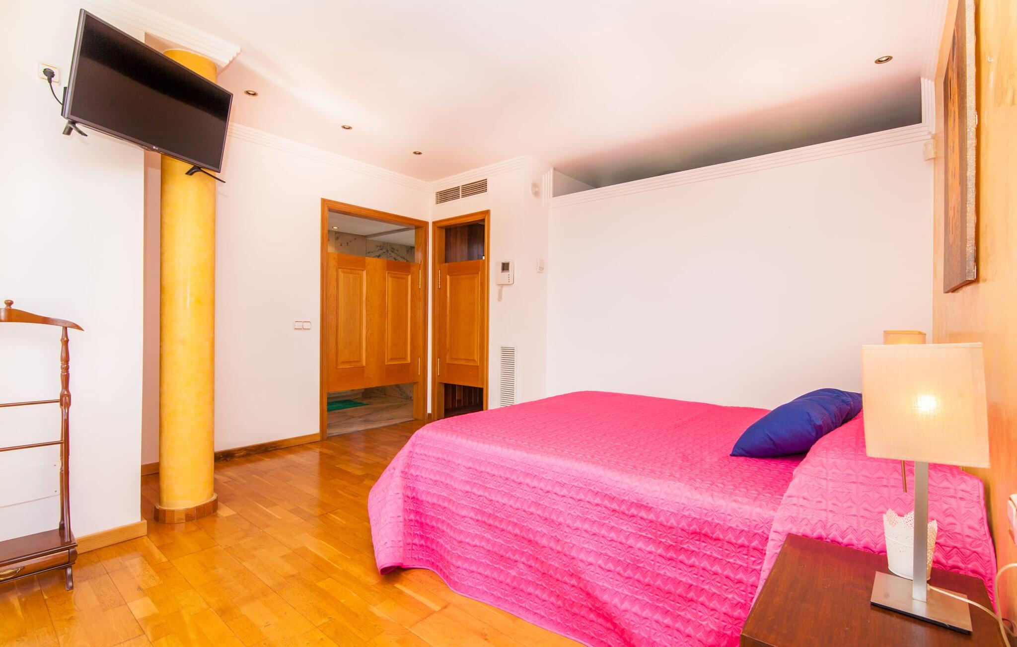 Alfabia tilbyder det perfekte tilflugtssted efter en lang gåtur gennem Palmas travle gader. En høj hæk, der garanterer privatliv, en stor pool med etageret terrasse omgivet af velplejet kunstgræs - det handler om afslapning. Lige ved siden af poolen venter en hyggelig, overdækket terrasse på, at I kan puste lidt liv i den. Mens I stadig er i humør til en forfriskende svømmetur i udendørsbruseren, kan andre sultne besøgende få travlt med at tænde op i grillen. Frisk fisk og vin – hvad mere har I brug for? Og hvis I stadig vil have mere underholdning, kan I prøve et spil dart om aftenen. Over poolen er villaen vært for endnu en tagterrasse med vidunderlig udsigt over de omkringliggende tage og bjerge i det fjerne. En lille disk, smarte kunstrattanmøbler, masser af plads og en fantastisk udsigt - dette er klart det perfekte sted til et udendørs møde. En asfalteret indkørsel fører direkte til villaen, og der er masser af parkeringspladser på gaden foran huset. I kan tilbringe hyggelige timer i flok i villaens åbne stue/spisestue. På den ene side en sofa, på den anden et spisebord med en sofagruppe; Kort sagt: et udvalg af sæder gør det nemt at tilbringe tid sammen. Individuelle farveaccenter, diskret dekoration og store vinduer skaber en behagelig atmosfære i dette hyggelige rum. Vil I undgå solen eller se jeres yndlingsserie, bliver I passet godt på foran fladskærms-tv'et eller den kunstige pejs. I det næste værelse køkkenet: fuldt udstyret, lyst og frem for alt med et stort køleskab til drinks, morgenmad osv. Indretningen af soveværelserne kunne være et rigtigt knastpunkt i dette hus. Hvem vil holde deres nerver og få deluxe værelse på første sal? Walk-in closets, fladskærms-tv og eget badeværelse med udgang til tagterrassen – det er vigtigt, at den heldige vinder ikke glemmer at forlade sit værelse i ny og næ. I alt har huset fire soveværelser med dobbeltsenge (herunder tre dobbeltværelser), et enkelt soveværelse og tre badeværelser. "Alfabia", nordøst for Palma, er et godt udgangspunkt for adskillige ferieaktiviteter: sightseeing, prøve tapas i havnen, shoppe souvenirs, tilbringe dage på stranden. Kreative mennesker kan besøge Sound Museum i Marratxí eller Mallorcas største kunsthåndværksudstilling, Feria del Fang, en gang om året om foråret. På grund af den centrale beliggenhed i byen kan der af og til høres trafikstøj. Men takket være den gode infrastruktur er det nemt at nå andre dele af øen. Hvad med en dagsvandring i Tramuntana-bjergene, for eksempel? Familier besøger ofte Aqualand i El Arenal eller de utrolige strande i nærheden. Ciudad Jardin ligger kun 8 km væk, og andre smukke bugter er ikke meget længere væk. Den moderne villa "Alfabia" ligger godt 7 km nordøst for Palma de Mallorca, i det populære område Pont d'Inca Nou i Marratxí kommune. Øens hovedstad ligger kun 7 km væk, og den nærmeste metrostation ligger kun få minutters gang væk. Palma Lufthavn kan nås på ingen tid, og den smukke strandby Ciudad Jardin ligger kun 8 km væk i bil.
