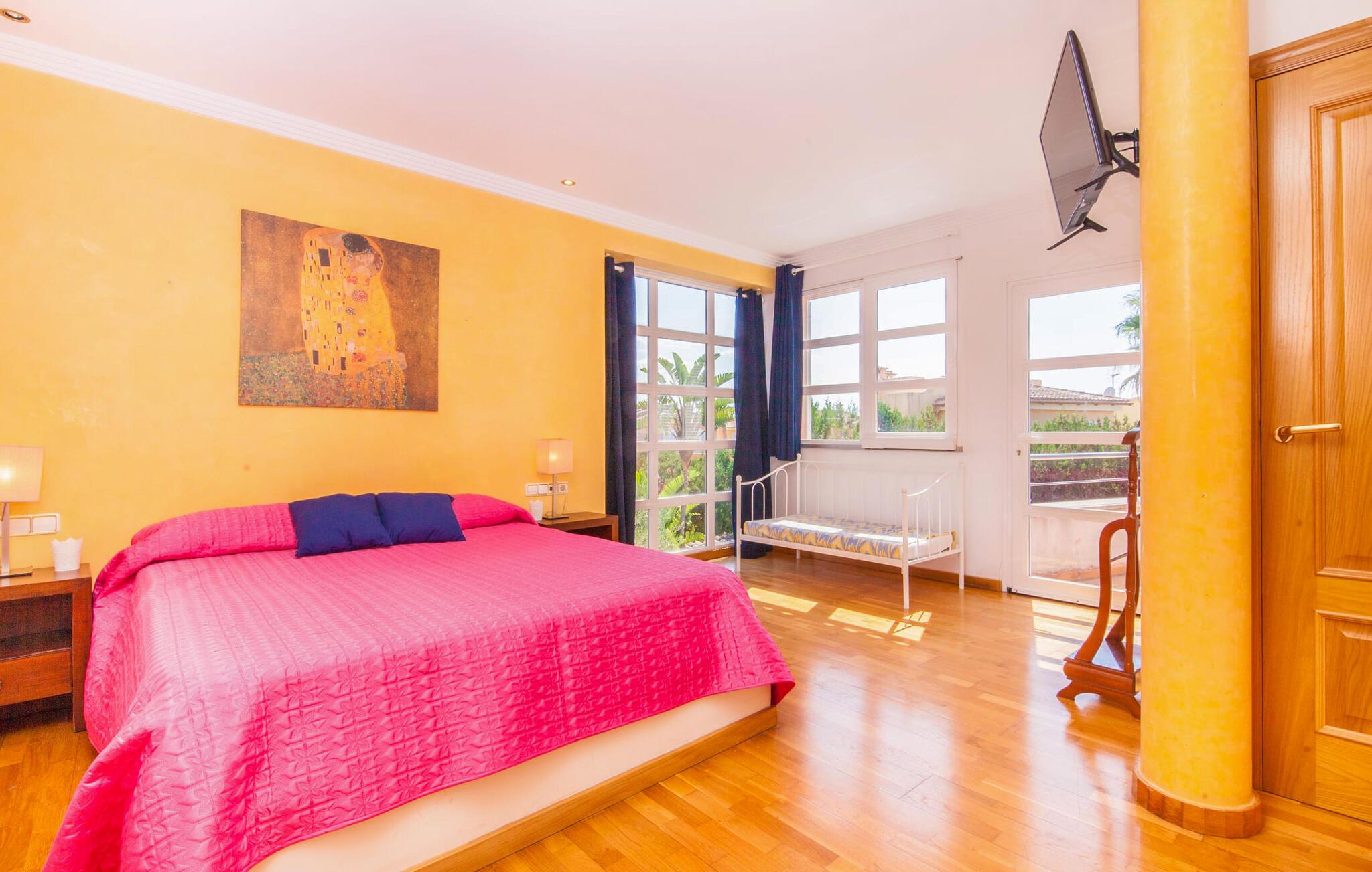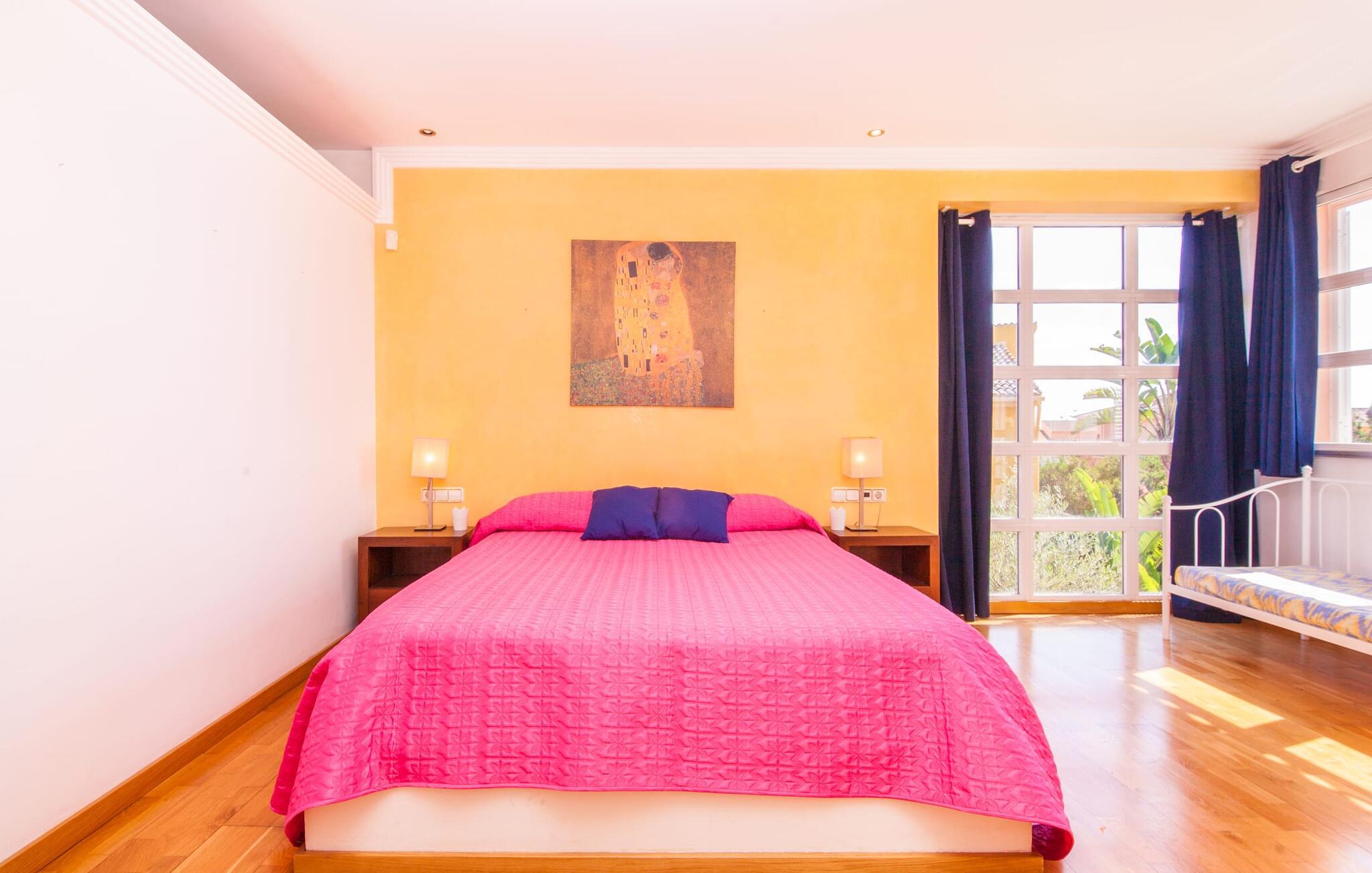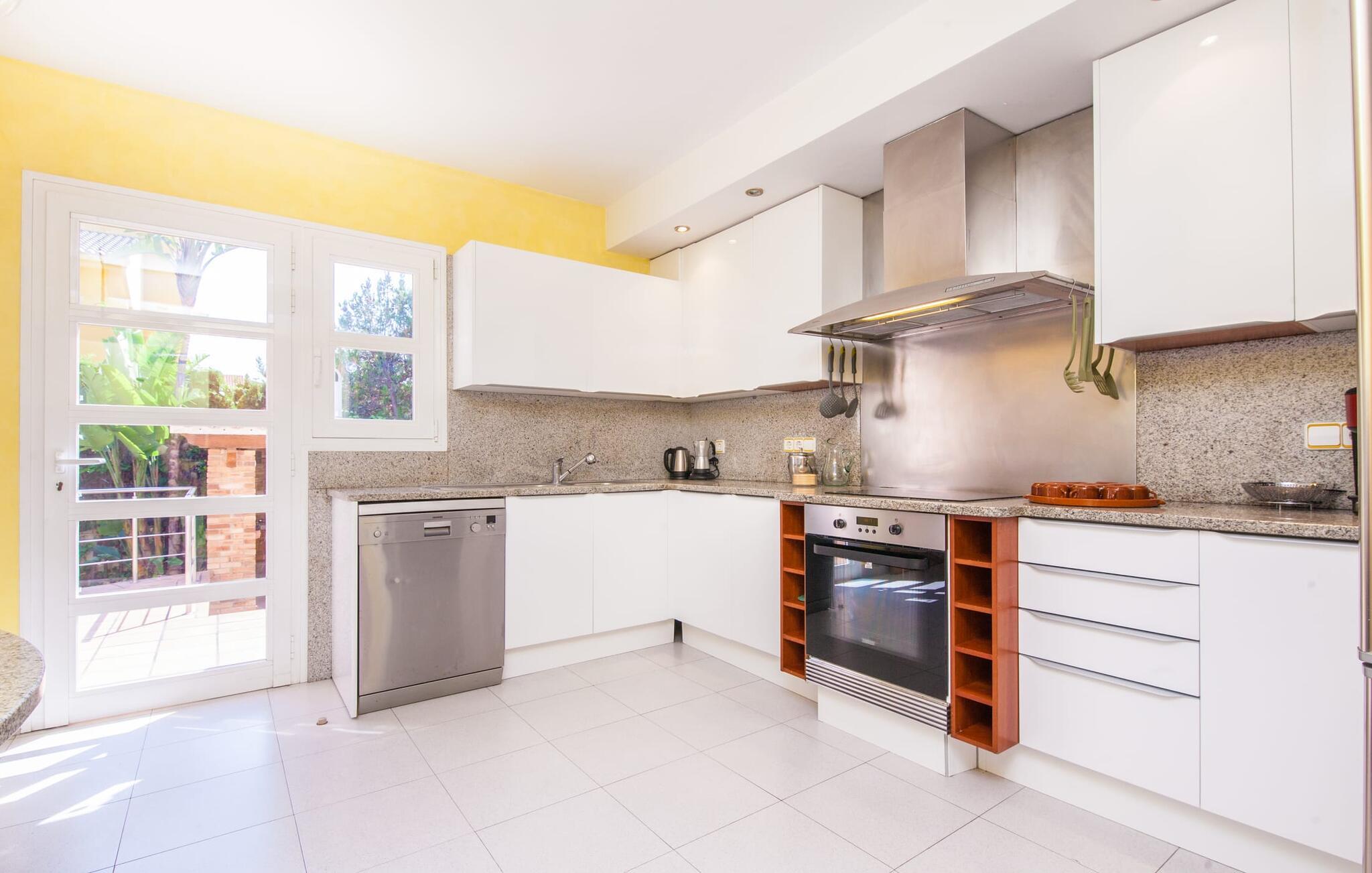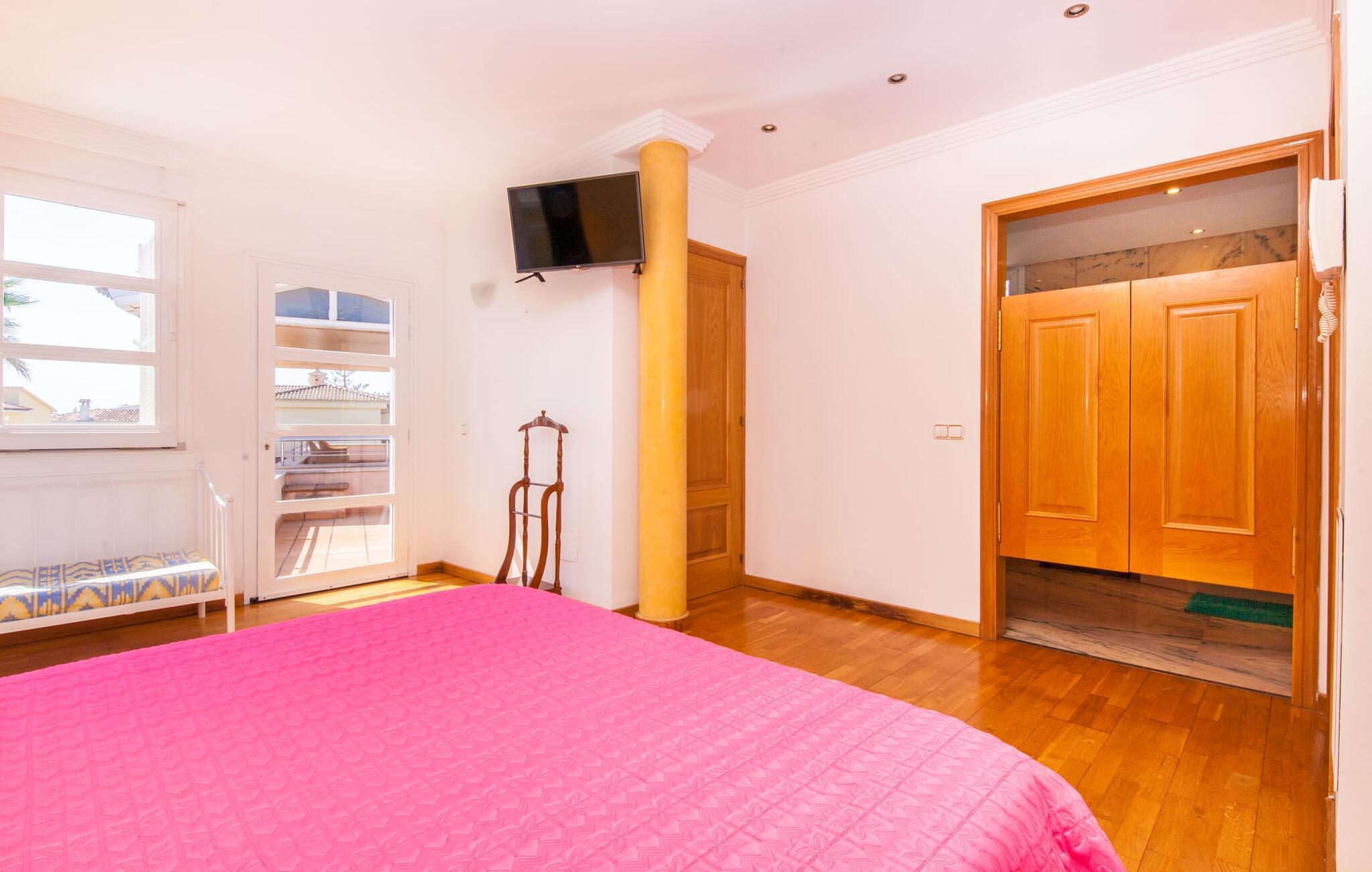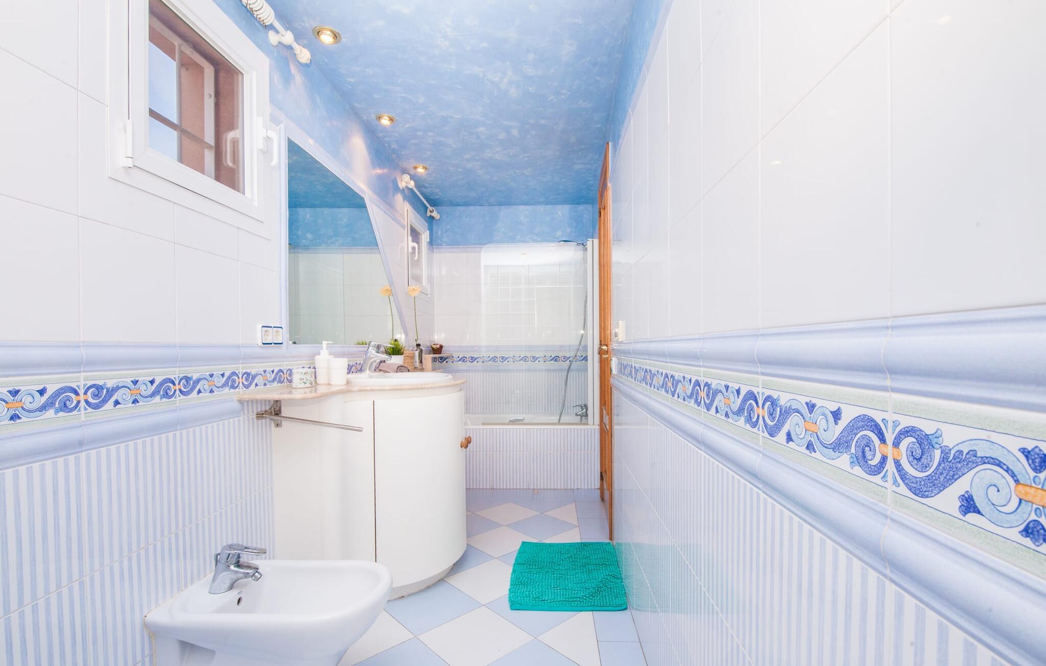 Alfabia tilbyder det perfekte tilflugtssted efter en lang gåtur gennem Palmas travle gader. En høj hæk, der garanterer privatliv, en stor pool med etageret terrasse omgivet af velplejet kunstgræs - det handler om afslapning. Lige ved siden af poolen venter en hyggelig, overdækket terrasse på, at I kan puste lidt liv i den. Mens I stadig er i humør til en forfriskende svømmetur i udendørsbruseren, kan andre sultne besøgende få travlt med at tænde op i grillen. Frisk fisk og vin – hvad mere har I brug for? Og hvis I stadig vil have mere underholdning, kan I prøve et spil dart om aftenen. Over poolen er villaen vært for endnu en tagterrasse med vidunderlig udsigt over de omkringliggende tage og bjerge i det fjerne. En lille disk, smarte kunstrattanmøbler, masser af plads og en fantastisk udsigt - dette er klart det perfekte sted til et udendørs møde. En asfalteret indkørsel fører direkte til villaen, og der er masser af parkeringspladser på gaden foran huset. I kan tilbringe hyggelige timer i flok i villaens åbne stue/spisestue. På den ene side en sofa, på den anden et spisebord med en sofagruppe; Kort sagt: et udvalg af sæder gør det nemt at tilbringe tid sammen. Individuelle farveaccenter, diskret dekoration og store vinduer skaber en behagelig atmosfære i dette hyggelige rum. Vil I undgå solen eller se jeres yndlingsserie, bliver I passet godt på foran fladskærms-tv'et eller den kunstige pejs. I det næste værelse køkkenet: fuldt udstyret, lyst og frem for alt med et stort køleskab til drinks, morgenmad osv. Indretningen af soveværelserne kunne være et rigtigt knastpunkt i dette hus. Hvem vil holde deres nerver og få deluxe værelse på første sal? Walk-in closets, fladskærms-tv og eget badeværelse med udgang til tagterrassen – det er vigtigt, at den heldige vinder ikke glemmer at forlade sit værelse i ny og næ. I alt har huset fire soveværelser med dobbeltsenge (herunder tre dobbeltværelser), et enkelt soveværelse og tre badeværelser. "Alfabia", nordøst for Palma, er et godt udgangspunkt for adskillige ferieaktiviteter: sightseeing, prøve tapas i havnen, shoppe souvenirs, tilbringe dage på stranden. Kreative mennesker kan besøge Sound Museum i Marratxí eller Mallorcas største kunsthåndværksudstilling, Feria del Fang, en gang om året om foråret. På grund af den centrale beliggenhed i byen kan der af og til høres trafikstøj. Men takket være den gode infrastruktur er det nemt at nå andre dele af øen. Hvad med en dagsvandring i Tramuntana-bjergene, for eksempel? Familier besøger ofte Aqualand i El Arenal eller de utrolige strande i nærheden. Ciudad Jardin ligger kun 8 km væk, og andre smukke bugter er ikke meget længere væk. Den moderne villa "Alfabia" ligger godt 7 km nordøst for Palma de Mallorca, i det populære område Pont d'Inca Nou i Marratxí kommune. Øens hovedstad ligger kun 7 km væk, og den nærmeste metrostation ligger kun få minutters gang væk. Palma Lufthavn kan nås på ingen tid, og den smukke strandby Ciudad Jardin ligger kun 8 km væk i bil.
