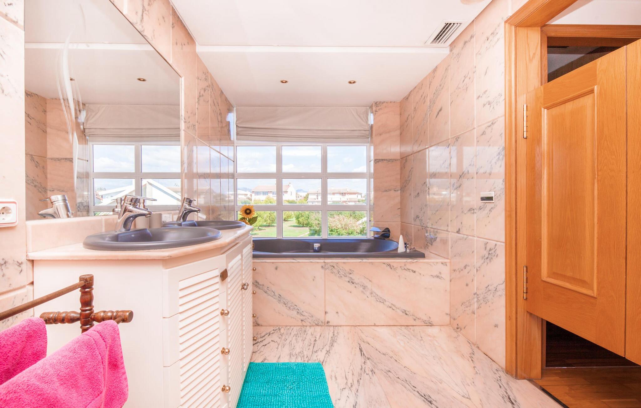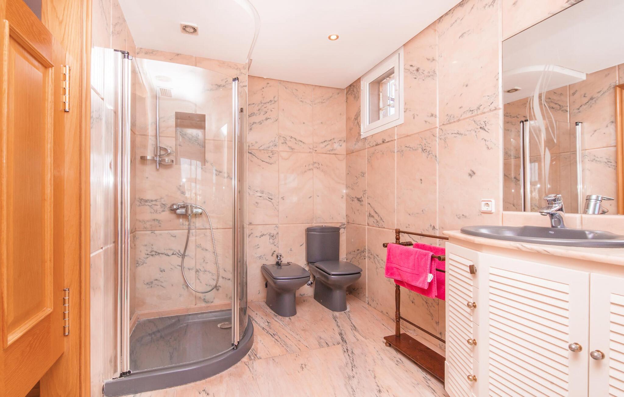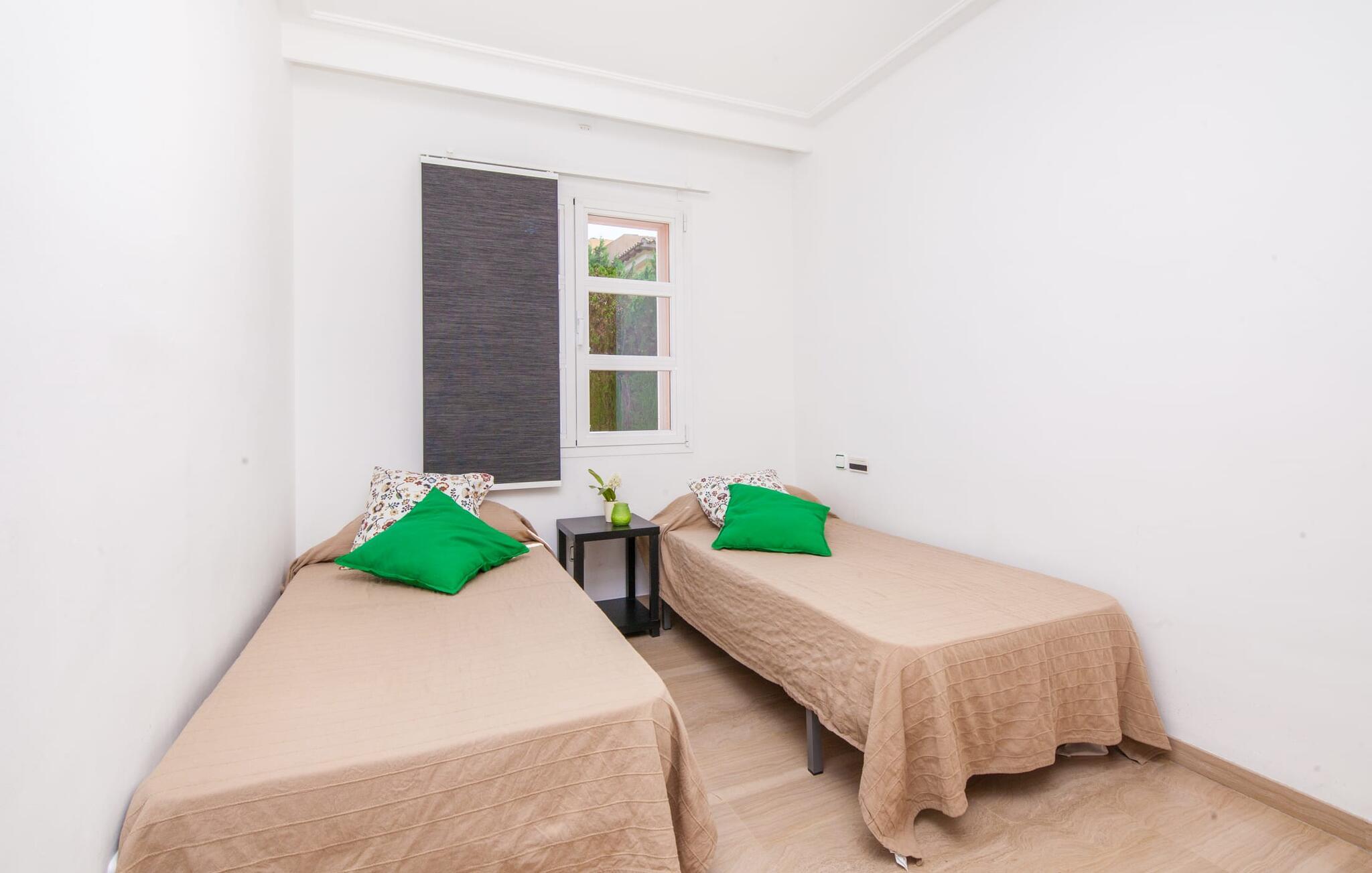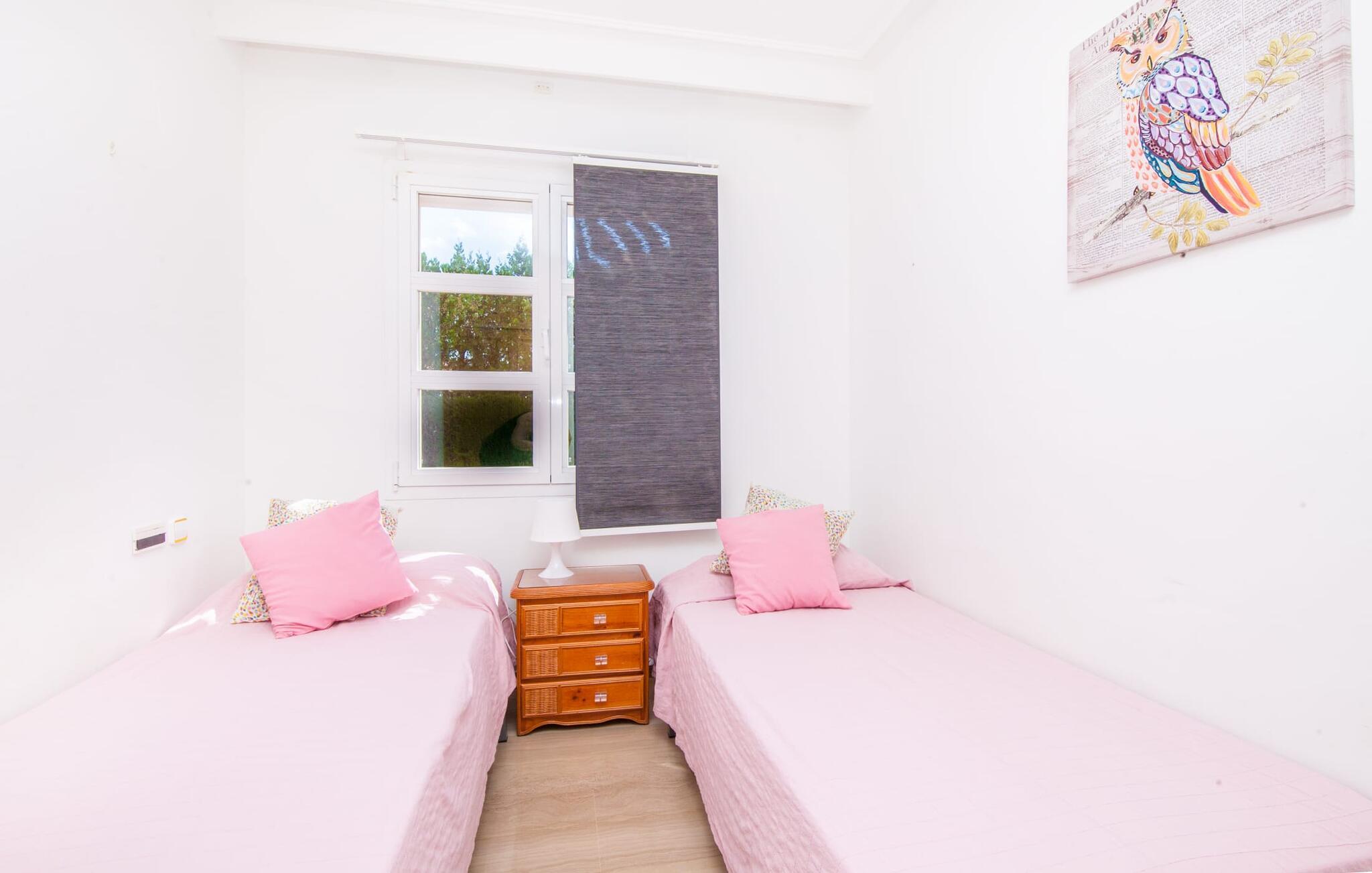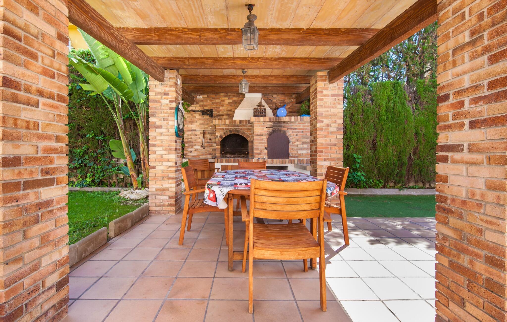 Alfabia tilbyder det perfekte tilflugtssted efter en lang gåtur gennem Palmas travle gader. En høj hæk, der garanterer privatliv, en stor pool med etageret terrasse omgivet af velplejet kunstgræs - det handler om afslapning. Lige ved siden af poolen venter en hyggelig, overdækket terrasse på, at I kan puste lidt liv i den. Mens I stadig er i humør til en forfriskende svømmetur i udendørsbruseren, kan andre sultne besøgende få travlt med at tænde op i grillen. Frisk fisk og vin – hvad mere har I brug for? Og hvis I stadig vil have mere underholdning, kan I prøve et spil dart om aftenen. Over poolen er villaen vært for endnu en tagterrasse med vidunderlig udsigt over de omkringliggende tage og bjerge i det fjerne. En lille disk, smarte kunstrattanmøbler, masser af plads og en fantastisk udsigt - dette er klart det perfekte sted til et udendørs møde. En asfalteret indkørsel fører direkte til villaen, og der er masser af parkeringspladser på gaden foran huset. I kan tilbringe hyggelige timer i flok i villaens åbne stue/spisestue. På den ene side en sofa, på den anden et spisebord med en sofagruppe; Kort sagt: et udvalg af sæder gør det nemt at tilbringe tid sammen. Individuelle farveaccenter, diskret dekoration og store vinduer skaber en behagelig atmosfære i dette hyggelige rum. Vil I undgå solen eller se jeres yndlingsserie, bliver I passet godt på foran fladskærms-tv'et eller den kunstige pejs. I det næste værelse køkkenet: fuldt udstyret, lyst og frem for alt med et stort køleskab til drinks, morgenmad osv. Indretningen af soveværelserne kunne være et rigtigt knastpunkt i dette hus. Hvem vil holde deres nerver og få deluxe værelse på første sal? Walk-in closets, fladskærms-tv og eget badeværelse med udgang til tagterrassen – det er vigtigt, at den heldige vinder ikke glemmer at forlade sit værelse i ny og næ. I alt har huset fire soveværelser med dobbeltsenge (herunder tre dobbeltværelser), et enkelt soveværelse og tre badeværelser. "Alfabia", nordøst for Palma, er et godt udgangspunkt for adskillige ferieaktiviteter: sightseeing, prøve tapas i havnen, shoppe souvenirs, tilbringe dage på stranden. Kreative mennesker kan besøge Sound Museum i Marratxí eller Mallorcas største kunsthåndværksudstilling, Feria del Fang, en gang om året om foråret. På grund af den centrale beliggenhed i byen kan der af og til høres trafikstøj. Men takket være den gode infrastruktur er det nemt at nå andre dele af øen. Hvad med en dagsvandring i Tramuntana-bjergene, for eksempel? Familier besøger ofte Aqualand i El Arenal eller de utrolige strande i nærheden. Ciudad Jardin ligger kun 8 km væk, og andre smukke bugter er ikke meget længere væk. Den moderne villa "Alfabia" ligger godt 7 km nordøst for Palma de Mallorca, i det populære område Pont d'Inca Nou i Marratxí kommune. Øens hovedstad ligger kun 7 km væk, og den nærmeste metrostation ligger kun få minutters gang væk. Palma Lufthavn kan nås på ingen tid, og den smukke strandby Ciudad Jardin ligger kun 8 km væk i bil.