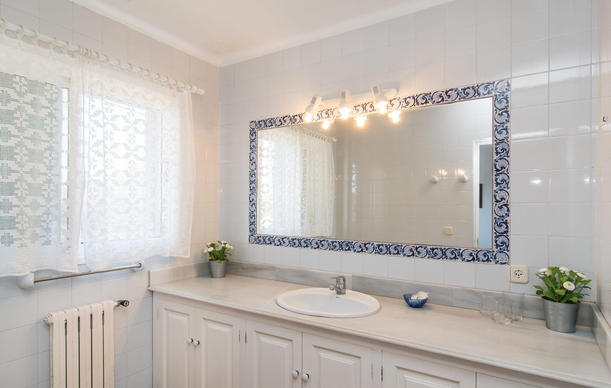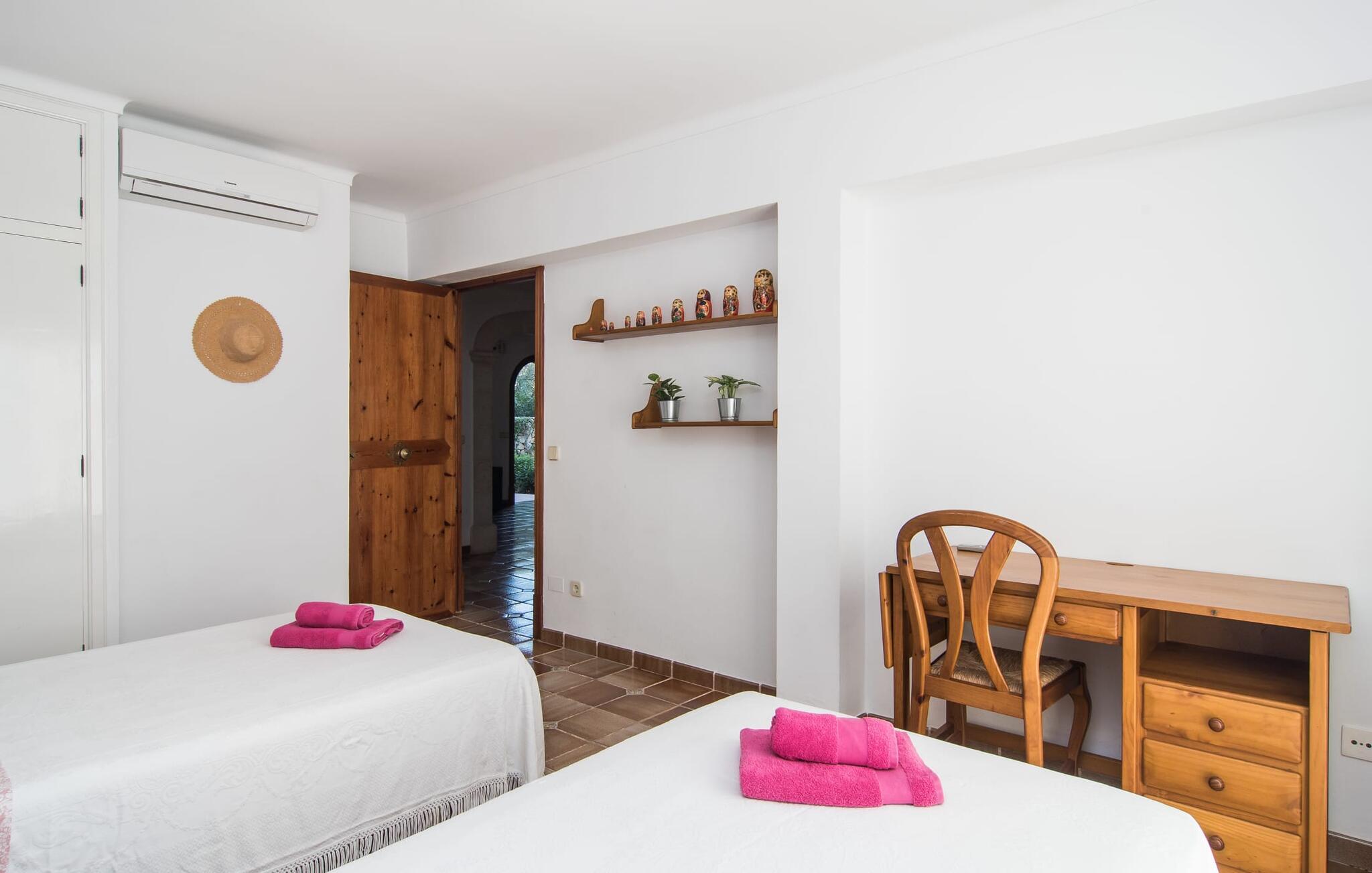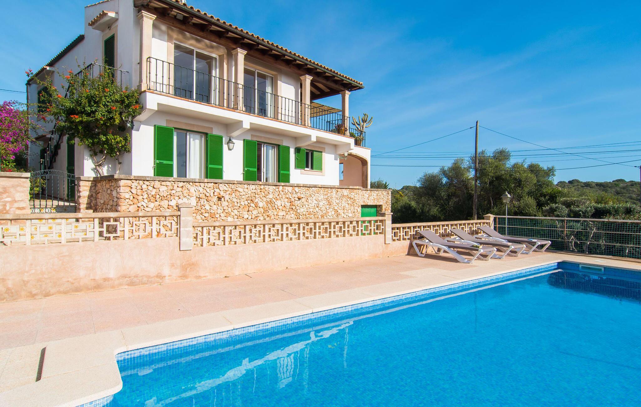 Bakkevillaen "Algueret" ligger i et velholdt boligområde over Playa de Portopedro. Omgivet af den typiske kystflora kan I nyde en uforstyrret udsigt over havet. Nyd det maritime panorama fra både balkonen i stueetagen og den 80 m² overdækkede terrasse på øverste etage. En grill er tilgængelig og perfekt komplementerer den udendørs spiseplads. Hvis I kan lide at svømme før morgenmaden, kan I besøge poolområdet. Da den indbydende villa ligger på en blind vej med kun beboelsestrafik, skal I kun krydse gaden for at svømme et par længder i den storslåede pool eller nyde et langt solbad på de medfølgende liggestole. Takket være sin indretning er den rummelige villa med havudsigt ideel til store rejsegrupper - bestående af flere familier eller en gruppe venner - og byder på masser af plads at opholde sig på og et fremragende forhold mellem pris og ydelse. Det gælder selvfølgelig også indendørs. Brunmelerede gulvfliser skaber en smuk kontrast til de hvide vægge. Alle soveværelser er i stueetagen med enten dobbeltsenge eller enkeltsenge. Hvert af de fire værelser med aircondition har et moderne flisebadeværelse, hvoraf tre har eget badeværelse. I den rummelige gang fører en naturstenstrappe dekoreret med traditionelle mallorcanske mønstre til øverste etage. Hele huset vender ud mod havet, så I kan nyde den ekstraordinære udsigt over havet helt uforstyrret fra de mange vinduer i den rummelige stue. Udover en hyggelig spiseplads bliver I også imponeret over den lyse, runde stue. Det perfekt møblerede køkken er visuelt adskilt fra den lyse spiseplads af en amerikansk disk med en førsteklasses udsigt. Tid på stranden parret med fordelene ved en charmerende havneby i gåafstand - "Algueret" tilbyder denne behagelige kombination på en særlig måde. Den solbeskinnede poolvilla "Algueret" ligger i den lille fiskerlandsby Portopedro. I nyder den frie udsigt over havet og har mulighed for at gøre jeres indkøb til fods i den lille by. Gå ture til havet og vandreture langs denne smukke sydlige kyststrækning med sine mange strande, den såkaldte Calas de Mallorca. Nogle af dem ligger i den betagende smukke naturpark Mondragó.