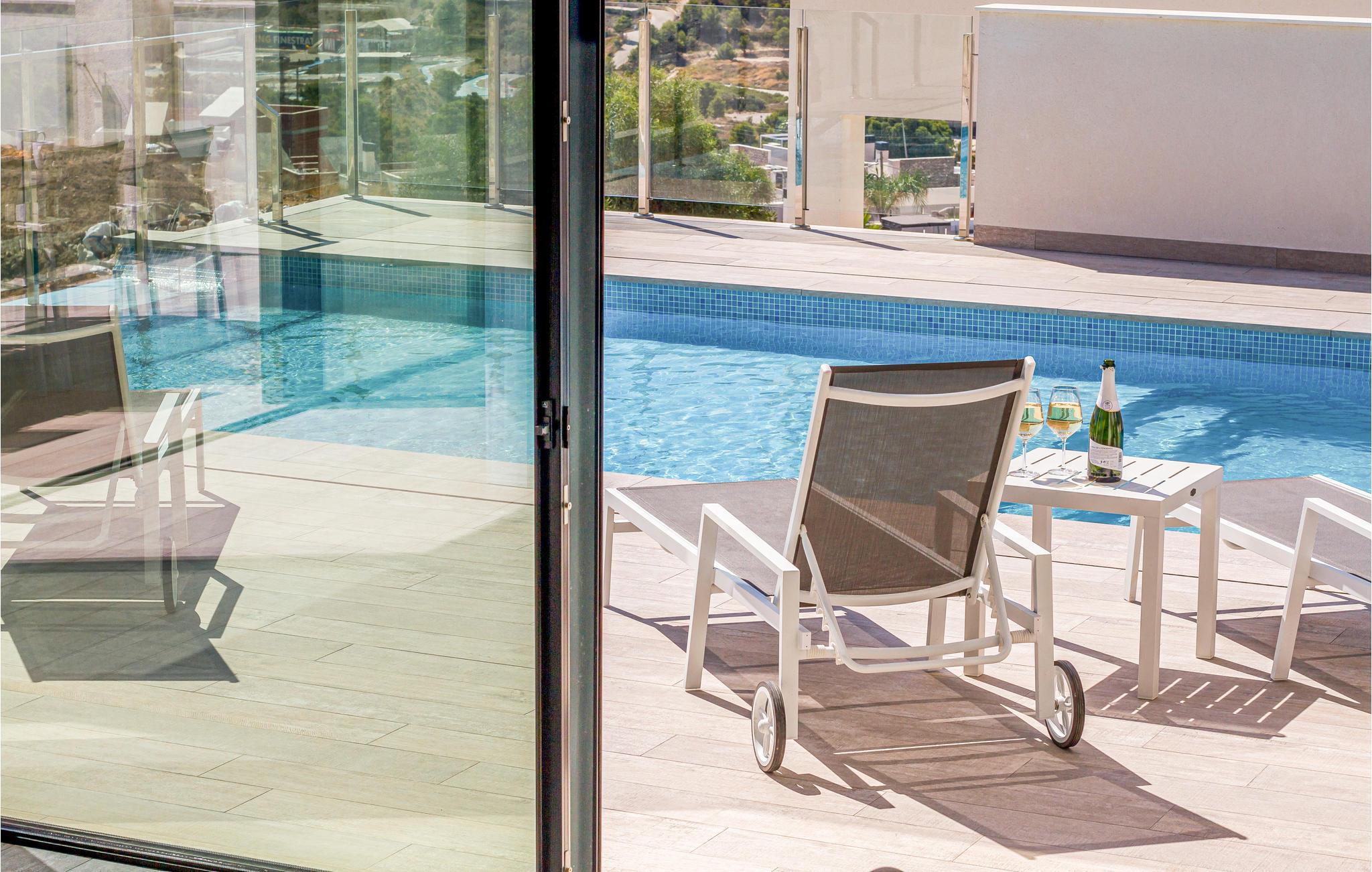 Jeres stilfulde feriehus i Finestrat kombinerer luksuriøs komfort med en betagende udsigt over Benidorms skyline og Middelhavet. Inde i villaen finder I lyse, åbne rum med minimalistisk indretning og et design af høj kvalitet. Huset har plads til en stor familie. Det fuldt udstyrede designer-køkken og de rummelige spiseområder indbyder til fælles måltider, mens de store panoramavinduer fylder rummene med naturligt dagslys.