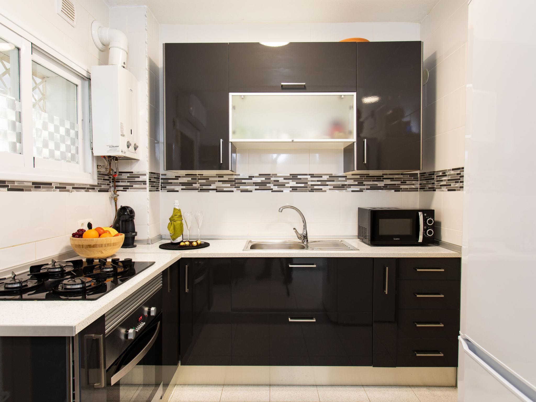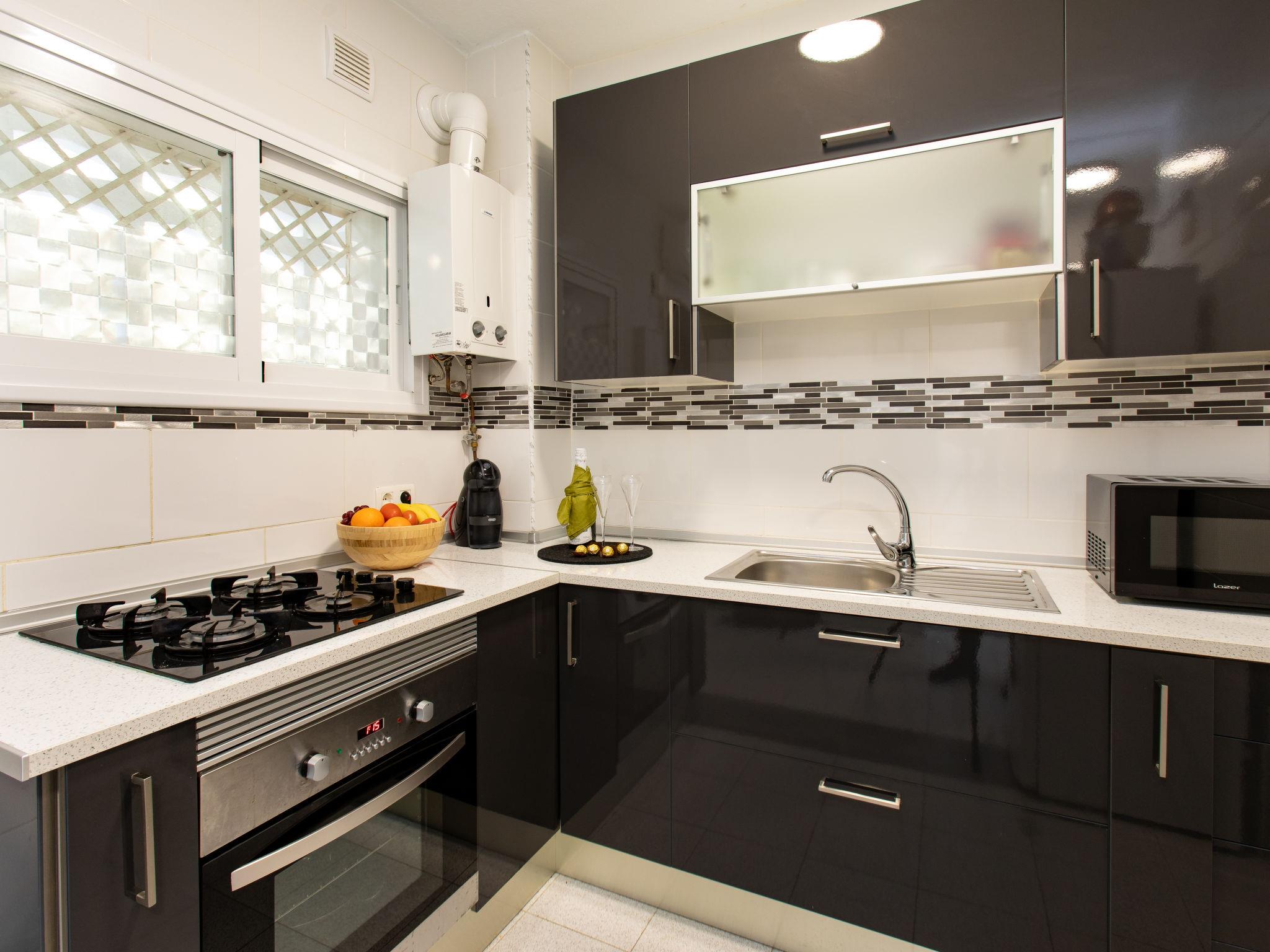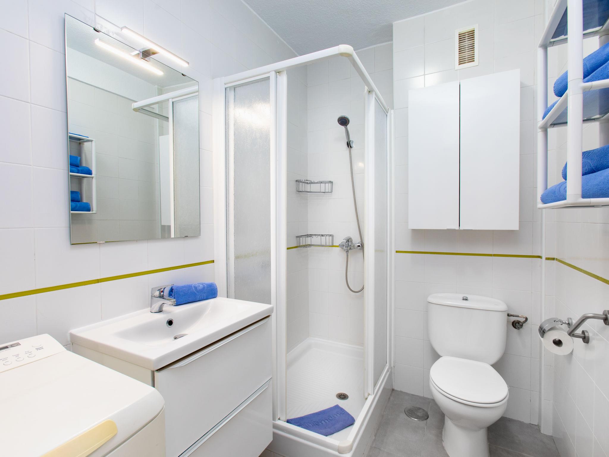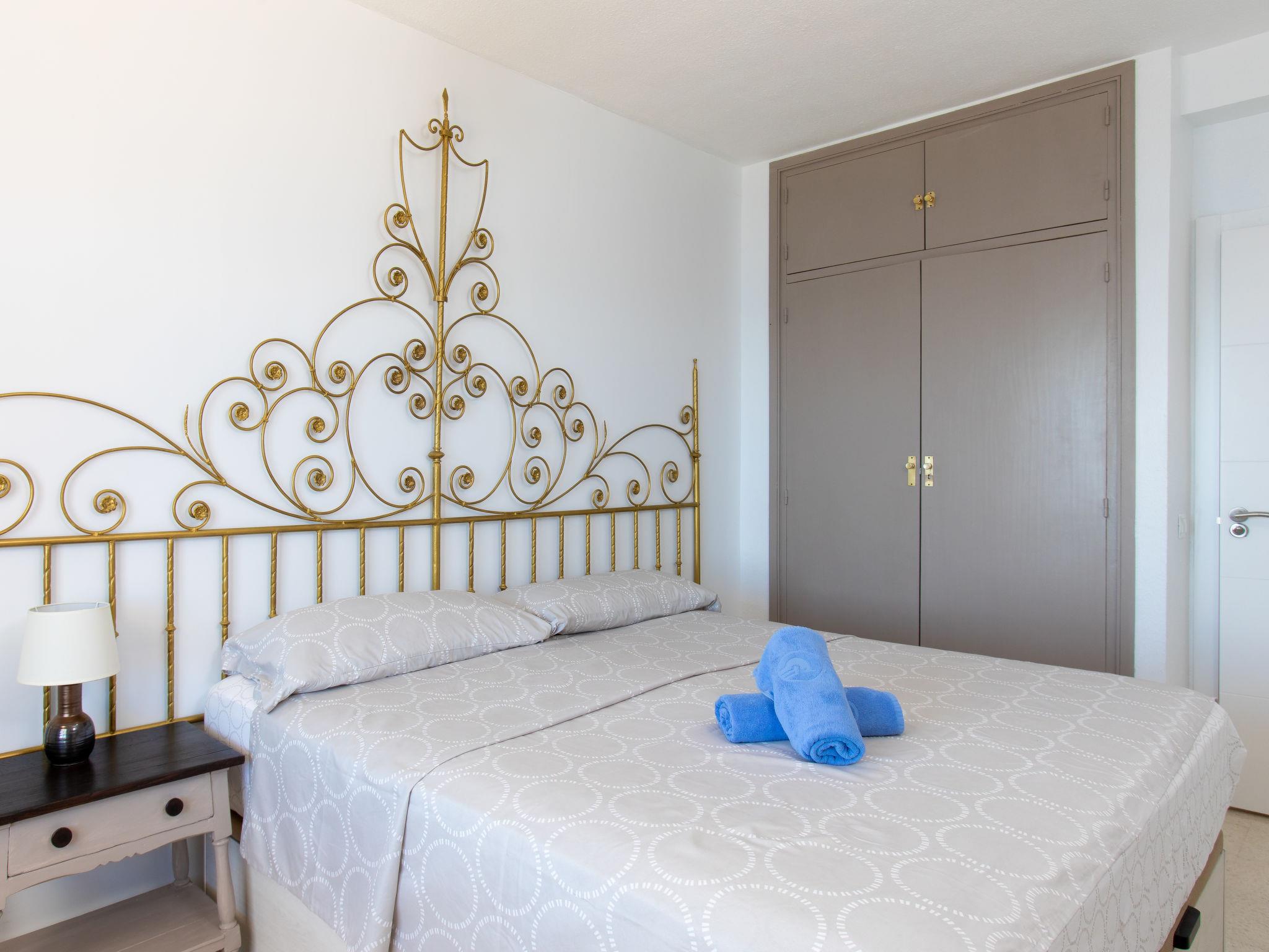 "Velilla", 3-room apartment 65 m2 on 7th floor, south facing position. Bright, simple and practical furnishings: living/dining room with digital TV. Exit to the terrace. 1 room with 2 beds (90 cm, length 190 cm), fan. 1 room with 1 french bed (180 cm, length 200 cm), fan. Open kitchen in the entrance (4 hot plates, oven, toaster, kettle, microwave, freezer, electric coffee machine, Capsules for coffee machine (dolce gusto)) with air conditioning and forced-air heating. Shower/WC. Large terrace. Terrace furniture. Panoramic view of the sea and the resort. Facilities: washing machine, iron, children's high chair, baby cot for up to 2 year olds, hair dryer. Internet (WiFi, free). VFT/GR/08390 // Reg. Nr.: ESFCTU0000180160000403580000000000000000VFT/GR/083906