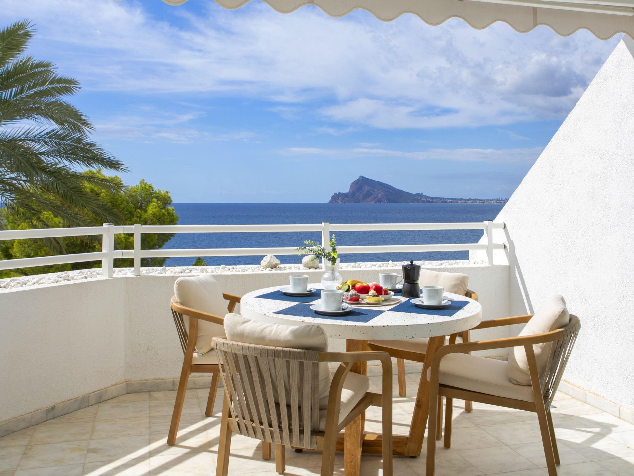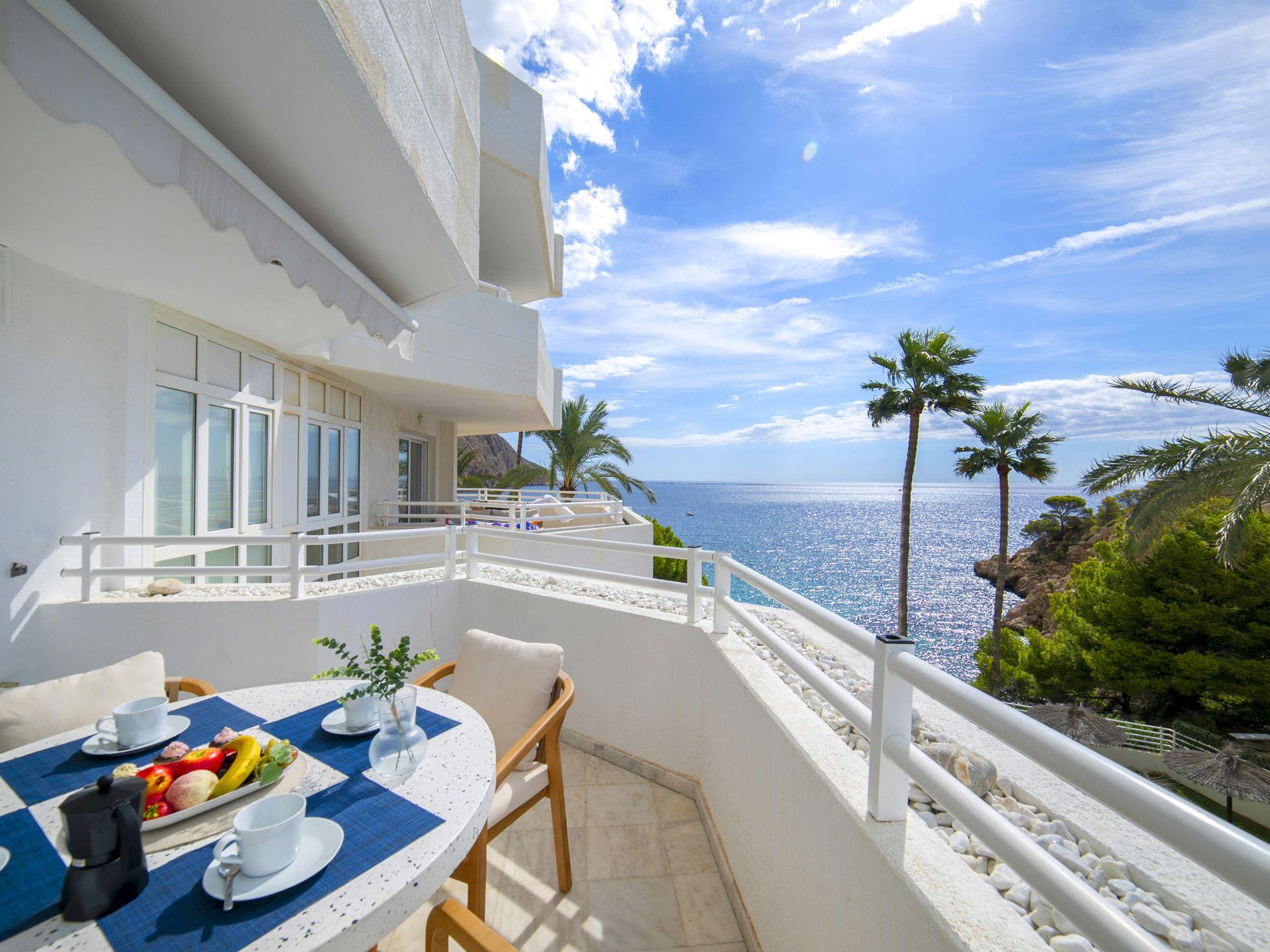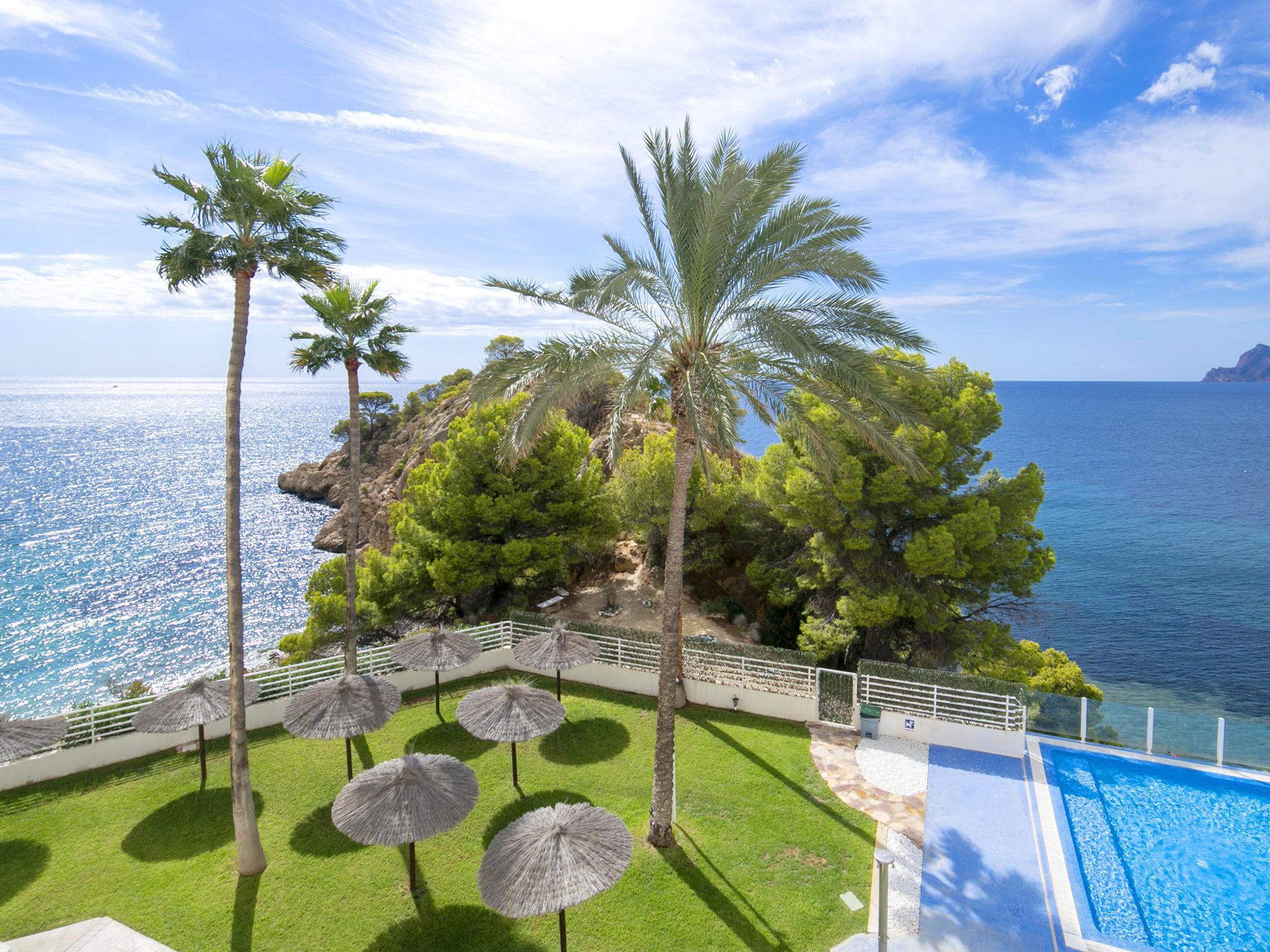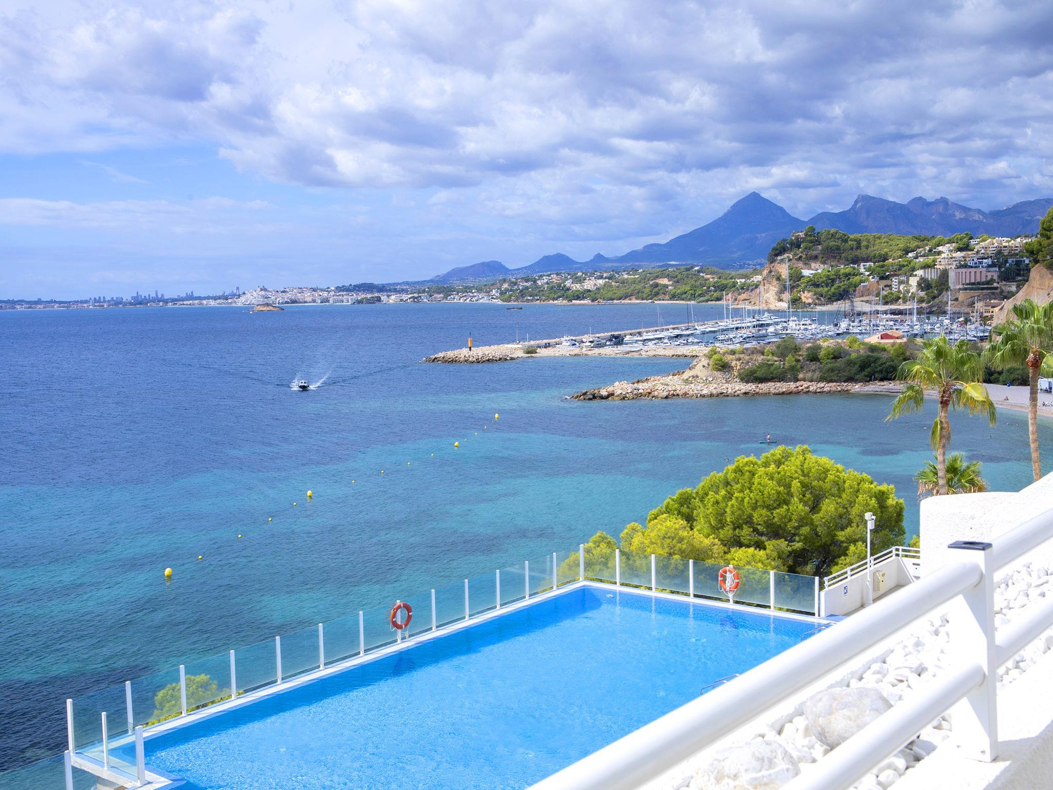Mascarat: Beautiful apartment block "Panorama". 7 km from the centre of Altea, 6 km from the centre of Calpe, in a quiet, sunny position, traffic calmed area, at the seaside, on the beach. For shared use: property (fenced), garden with lawn, swimming pool (20 x 8 m, seasonal availability: 01.Jan. - 31.Dec.). Outdoor shower. In the house: lift. Grocery 3 km, supermarket 3 km, restaurant 2 km, bus stop "Parada Bus" 5.5 km, rocky beach "Playa Mascarat" 80 m. Sports harbour 600 m, marina 600 m, golf course (9 hole) 7 km. Nearby attractions: Aqualandia, Mundomar, Terra Mítica, Terra Natura, Les Fonts de l'Algar, Castillo de Guadalest.