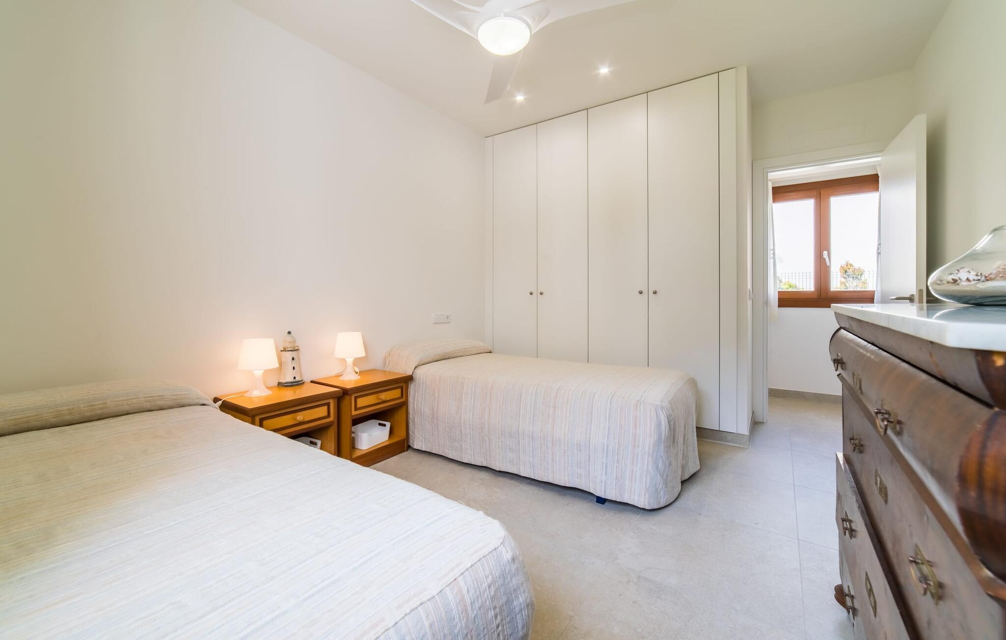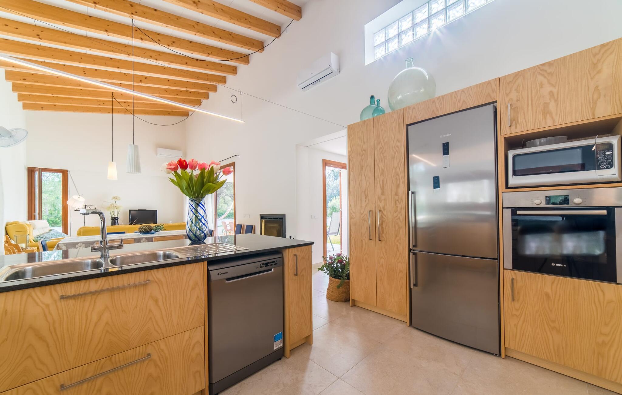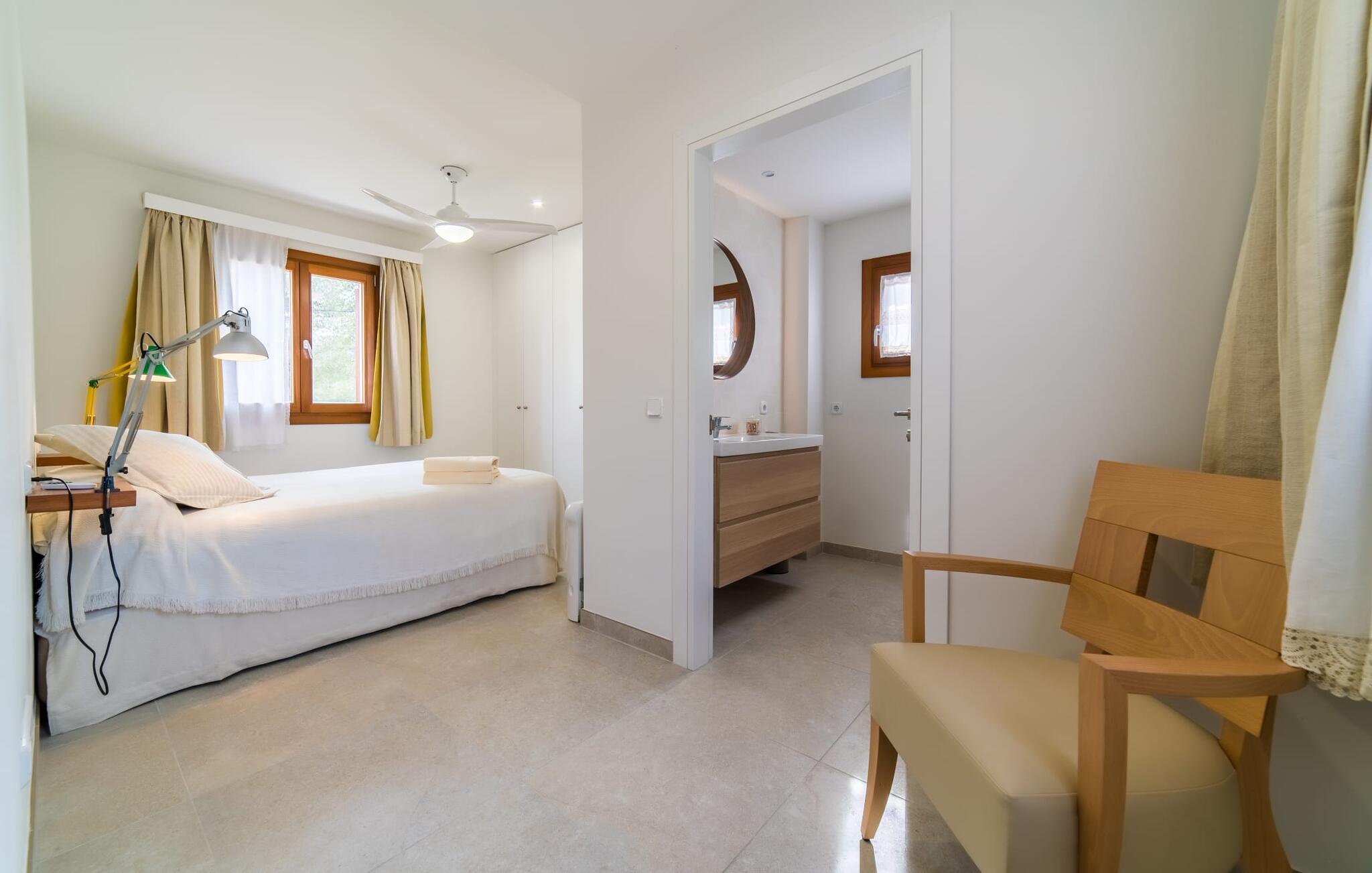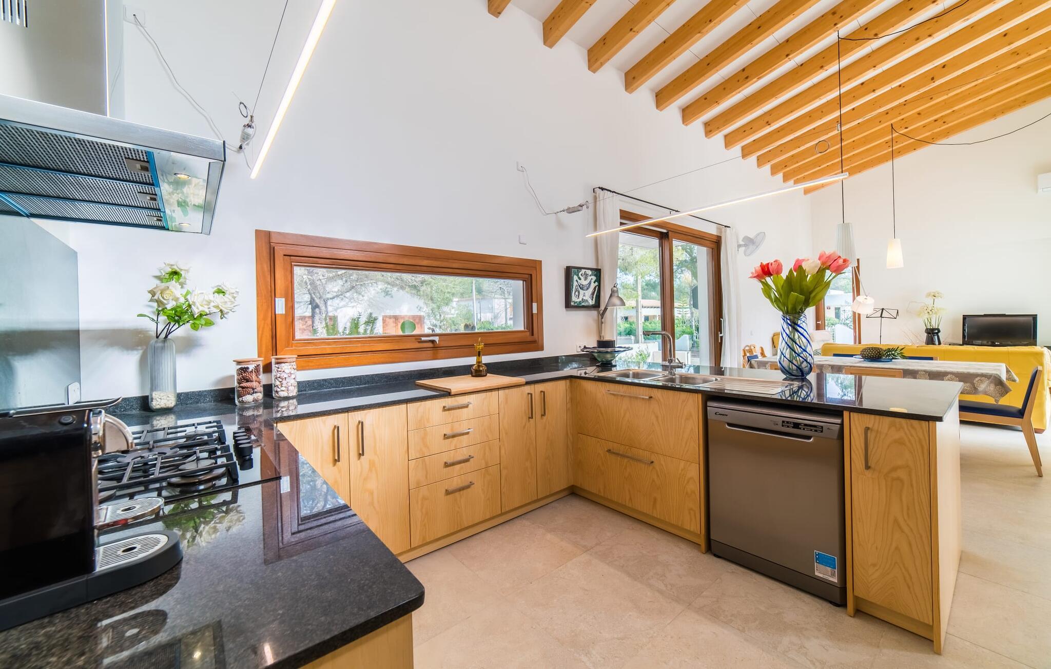 Velkommen til Villa “Amedart”, et hus, der ikke kun har en fantastisk beliggenhed ved havet, men også er et yderst moderne nybyggeri fuld af renhed og klart design. Samtidig er denne lyse hvide, letfindelige ejendom med kubisk arkitektur særdeles familievenlig. Alene det indhegnede haveområde med sin store græsplæne giver børnene masser af plads til at udvikle sig. En basketballkurv og et bordtennisbord er tilgængelige til en kamp mellem generationerne. Det sydvendte hus har en overdækket terrasse med udsigt over haven, hvilket gør det nemt at holde øje med jeres små børn, mens de leger. Verandaen har to smukke siddeområder med borde og komfortable havestole. Bare slap af, mens I hænger ud i hængekøjen med en god bog eller hylder solen på loungestolene i træ; "Amedart" er et sted for afslapning selv uden en pool. Hvis I vil tage en forfriskende dukkert eller se havet, så gå en tur langs den korte sti, og I er der: en betagende beliggenhed på en unik kystlinje. Efter en hyggelig grillaften slutter dagen og det er tid til at sove i den skønne villa. Huset har en L-formet grundplan, hvor verandaen støder op til et åbent rum til afslapning, spisning og madlavning. Denne stue med gulv-til-loft vinduer oversvømmes af lys takket være rumhøjden, de glat pudsede hvide vægge og de sandstensfarvede gulvfliser. En pejs indlejret i væggen skaber en hyggelig atmosfære, blandt andet i det muntre gule opholdsområde foran LCD-fjernsynet. En samling brætspil forvandler spisebordet til et sjovt samtaleområde. Familievenligheden afspejles også i de to høje stole, hvor selv de mindste gæster kan finde deres plads ved spisebordet. Køkkenafdelingen er noget adskilt af en individuel løsning med et fritstående skab i naturligt trælook og masser af opbevaringsplads. Den mørke marmorplade danner en smuk kontrast til det højkvalitetsdesign, som understreges af det omfattende udstyr. Det smarte gæstetoilet fuldender den fuldt klimatiserede fællesstue. Soveværelserne er placeret i den anden del af den L-formede bygning. To soveværelser, hver med to enkeltsenge, deler et moderne hvidt badeværelse med azurblå fliser og bruseniche - perfekt til børn og/eller en bedsteforælder, der bor hos jer. Master king-size soveværelse har en-suite brusebad. Møbeldesignet er det samme som husets: klart, rent, naturligt, minimalistisk. Alt passer bare sammen her. Den stilfulde villa "Amedart" imponerer med sin moderne renhed og nærhed til havet. Ejendommen er beliggende nord for Alcúdia i et kvarter ved havet. Det er kun 200 m fra havet. De mange strande i Pollensa-bugten er et absolut must. Denne region byder på utrolige, beskyttede naturreservater, som er værd at udforske. I Alcúdia eller Sa Pobla er der farverige ugentlige landmandsmarkeder, store butikker, caféer og restauranter - simpelthen alt hvad hjertet begærer.