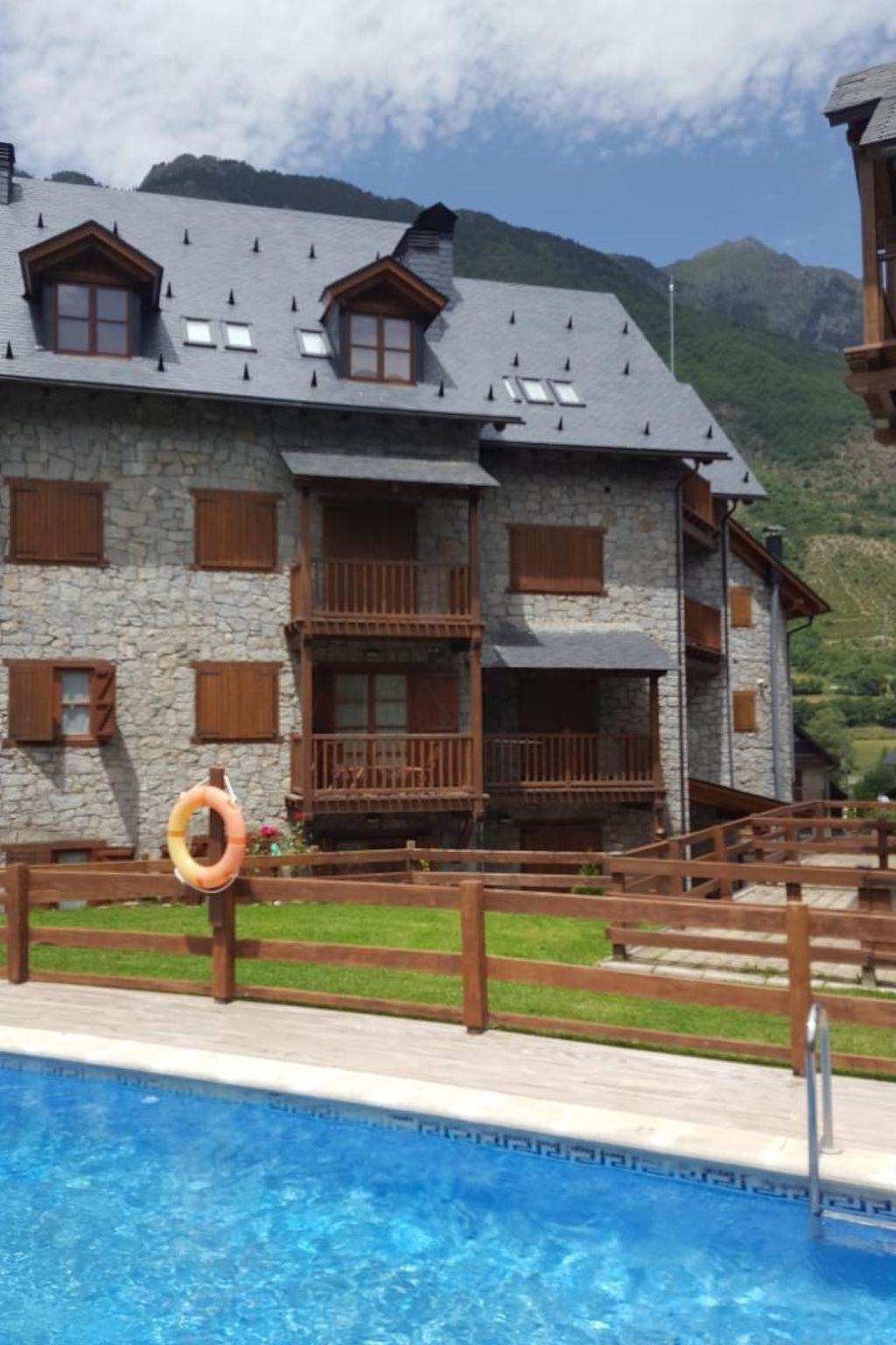 Cosy, fully equipped 65 m2 flat, ideal for couples, friends or families with children - up to 4 people. Non-smoking apartment, pets possible.2 Bedrooms (1 double bed, 2 single beds) with spacious wardrobes,2 complete bathrooms (bath-shower and shower cubicle), washing machineSpacious dining room and living room area with fireplace, unlimited WiFi, large flat screen TV, Blu-ray DVD player and hi-fi system (Bluetooth USB, CD, radio)Comfortable, well-equipped kitchen (combi fridge, gas hob with electric oven, dishwasher, microwave, coffee machine, kettle, toaster, etc.)Terrace with table and chairs, microwave, dishwasher, coffee machine, kettle, toaster, etc.). terrace with table and chairs, from which you have direct access to the pool (temperate water) and gardens of the residence. The pool is open until 20:00 in the summer months, ideal for chilling out after a long hike.There is a parking space for your car and a lockable storage room for bicycles or skis in the communal garage.The flat is on the ground floor; the terrace and interior rooms overlook the pool and garden area in the middle of the residential complex; it is sunny until the early afternoon, so that we have a pleasant temperature in the flat throughout the day.3 City bikes are available to our guests, which take them to the famous, small town of Benasque in just under 10 minutes on a scenic road with hardly any traffic. The "Chamonix of the Pyrenees" with its winding pedestrian zone that leads you through the medieval centre of the town and where street cafés and restaurants invite you to visit their terraces. Here you will find the various providers of adventure and sports activities, mountain bike hire and all kinds of shops and shops as well as well-stocked supermarkets. Every Tuesday is market day, where fresh vegetables and fruit, fresh fish, cheese and sausage specialities can be bought: Non-smoking houseShort description 1Number of kitchens : 1SurroundingsLeisure facilities : Boat hire, mountain bike hire, ski hireSports facilities in the surrounding area : Hiking, climbing, mountain biking, bikes of all categories, kayaking, garden and outdoor facilitiesRecreational facilities at the property : Outdoor pool for shared use, swimming pool