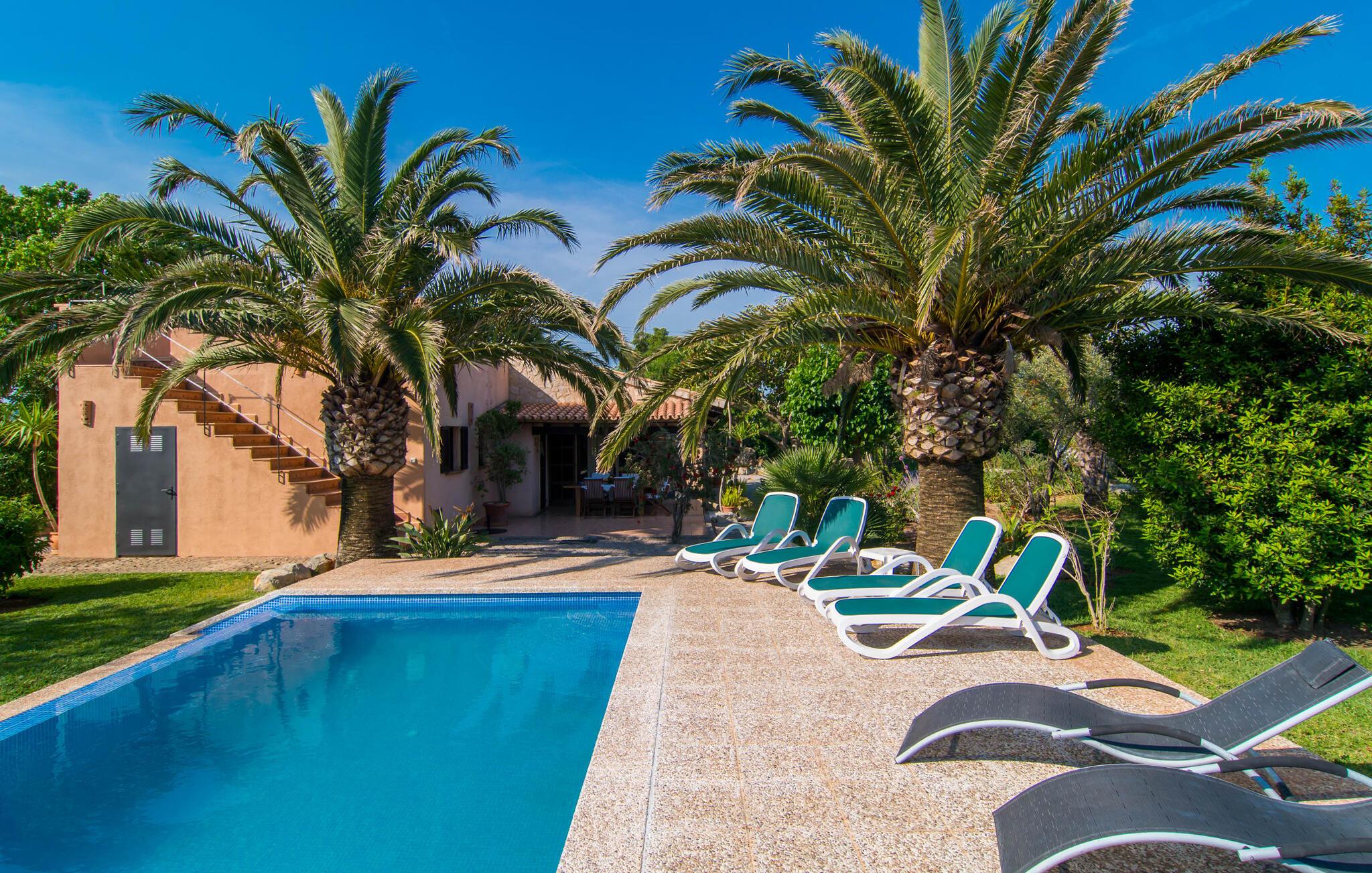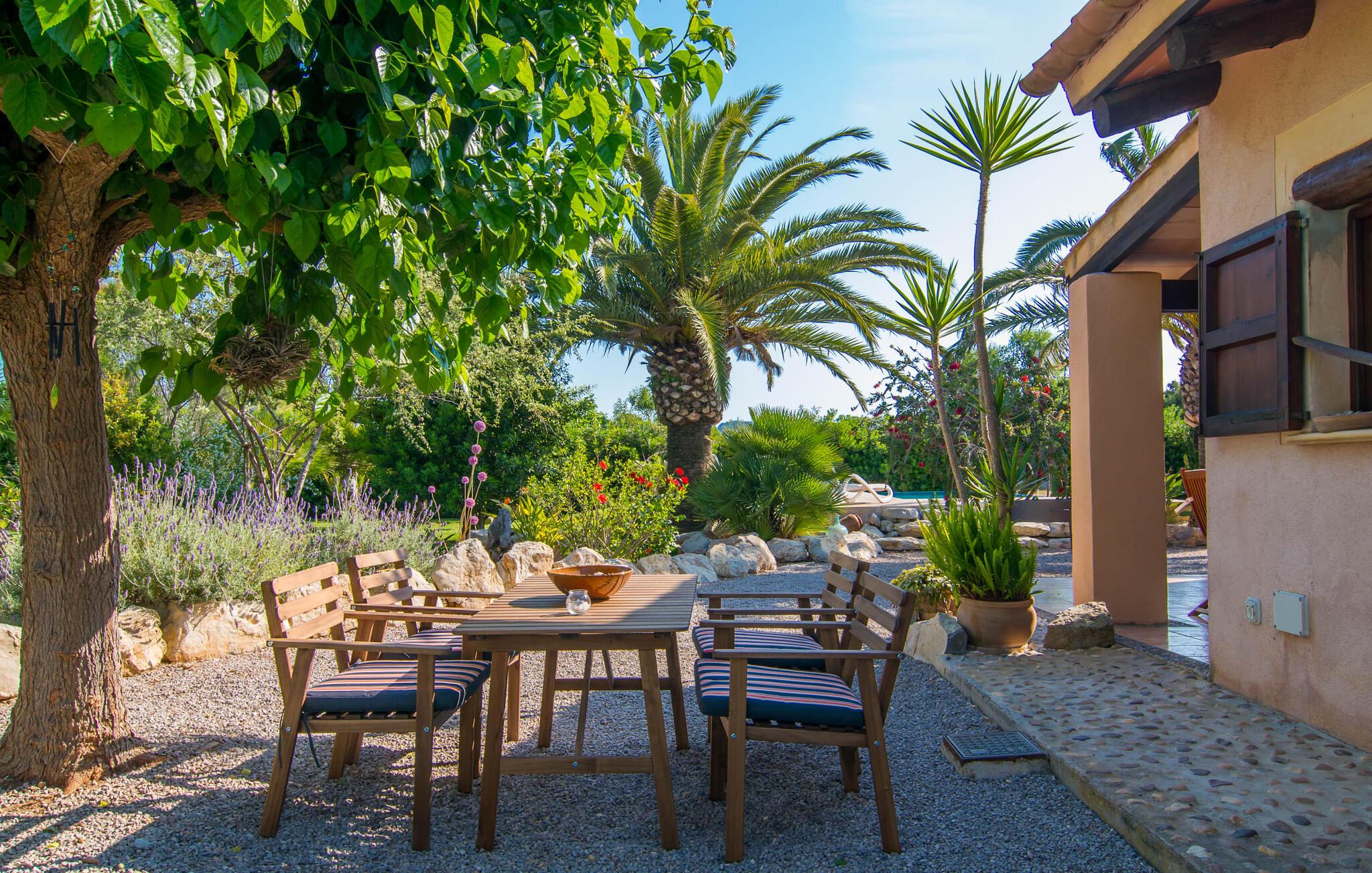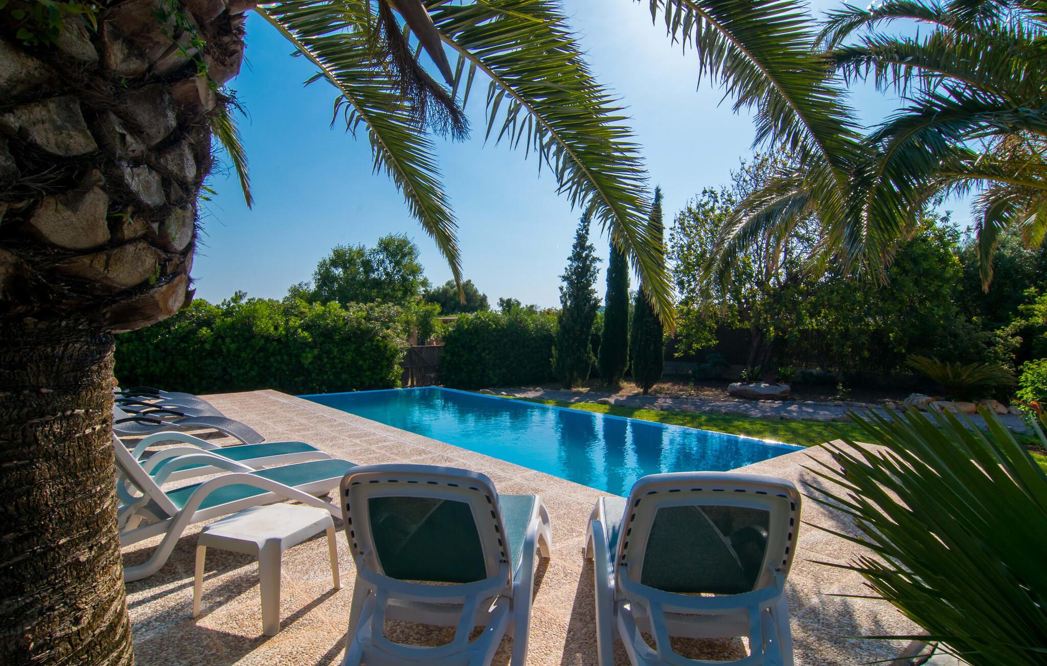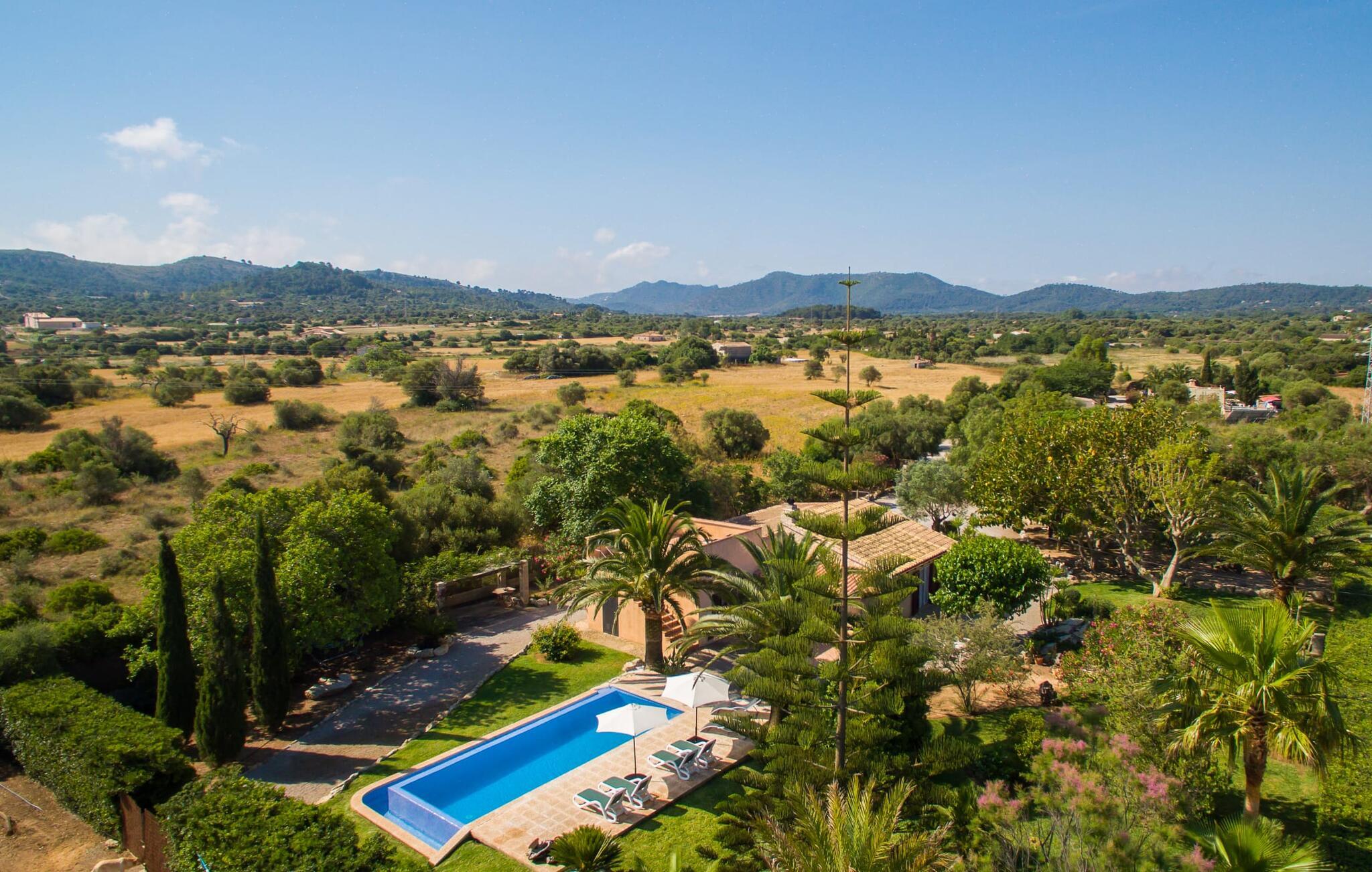 Efter en køretur gennem idyllisk natur når vi Villa "Angela" på en solskinsdag. Efter den venlige velkomst fra ejeren går vi sammen gennem det indbydende, velholdte udendørsområde. Middelhavsplanter af enhver art indrammer de smukke terrasser, hvor I kan slappe af på forskellige måder. Udvalget af vidunderlige grønne områder er afrundet af frodige palmer, der flankerer poolen. Denne er placeret på siden af huset: Fra den overdækkede terrasse går I blot hen over et lille grusareal, tager de tre naturstenstrin og I er der. Den lyseblå flisebelagte pool varierer i dybden mellem behagelige 1,20 og 1,70 m og ser særdeles original ud takket være infinity-effekten på to sider. Når man svømmer i det kølige vand, får man indtryk af, at vandet og dets omgivelser går over i hinanden. Omkring poolen er der græsplæne og terrasseområder, der er perfekte til at slappe af under den klare middelhavshimmel. Snup en god bog og en lækker drink – og indstil jeres indre program til at "slappe af". Nu er det tid til at vælge det bedst egnede sted til liggestolen. Mens nogle lader batterierne op på denne eng, foretrækker andre måske den overdækkede terrasse ved huset og nyder idyllen herfra. I kan sidde behageligt ved det smagfulde bord og læse, nyde en drink eller spille spil sammen. Herfra har I en perfekt udsigt til poolen og eventuelle børn, der rejser med jer. Om aftenen vil nogen måske tænde for grillen og forberede en perfekt BBQ for at afslutte dagen med kulinariske lækkerier. For en endnu bedre friluftsfølelse kan I sidde ved det smukke træbord på sidestensfladen. Herfra kommer vi ind i husets stue. Dette åbne rum med spiseplads og integreret køkken vil helt sikkert være det vigtigste sted for jeres ophold indendørs. Og der er mange ting, I også kan gøre her. Hvis I vil, kan I slappe af i de behagelige sofaer og måske underholde jer selv med en god film. I kan også surfe på internettet med gratis internet eller dele et glimt af jeres ferie med jeres venner derhjemme. Det typiske mallorcanske køkken er fuldt udstyret og tilbyder jer alle muligheder for helt uafhængig selvforplejning. Måske har I lyst til at prøve en spansk ret og derefter servere den - enten ved det enorme spisebord indendørs eller udenfor? Individuelt indrettede værelser er tilpasset forskellige smag og er sikker på at tilbyde den rigtige atmosfære for alle. Inden I skal tegne sugerør til det bedste rum, kan I måske træffe et valg på forhånd ud fra billederne. Der er 3 dobbeltsenge og et værelse hvor man kan trække den anden madras ud. Dette værelse er perfekt til alle børn. Alle gæster har plads nok i de to iøjnefaldende badeværelser samt naturligt lys. En hårtørrer er tilgængelig og behøver ikke at medbringes. Brugen af masser af træ og matchende gulvfliser skaber en meget hyggelig atmosfære, det samme gør brugen af natursten og muntre farver. Typisk indretning giver dette hus et personligt og venligt præg. Kan I lide det mindre, vil I helt sikkert bedst lide det her. Den populære strandby Cala Ratjada ligger kun 10 minutters kørsel derfra og har en malerisk havn og et udvalg af barer og restauranter. De små byer Artà (7 km) og Capdepera har bevaret deres oprindelige middelalderlige charme og skiller sig derfor tydeligt ud fra de nyere turistattraktioner langs kysten. Selv om vinteren byder begge steder på adskillige spise- og indkøbsmuligheder. Når det kommer til strande, kan I prøve en anden hver dag - i denne del af Mallorca vil I altid finde nye strandsteder, hvor I kan lytte til lyden af brændingen væk fra larmende menneskemængder. Den komfortabelt indrettede villa "Angela" ligger på en idyllisk ejendom ca. 2,5 km vest for Capdepera. Oplev en afslappende tid her, væk fra stress og jag. Samtidig er I kun et stenkast væk i bil fra alt, hvad denne del af øen har at byde på, især flere smukke strande. Om aftenen byder havnebyen Cala Ratjada (ca. 6 km) på en indbydende strandpromenade, gode barer og restauranter samt indkøbsmuligheder.
