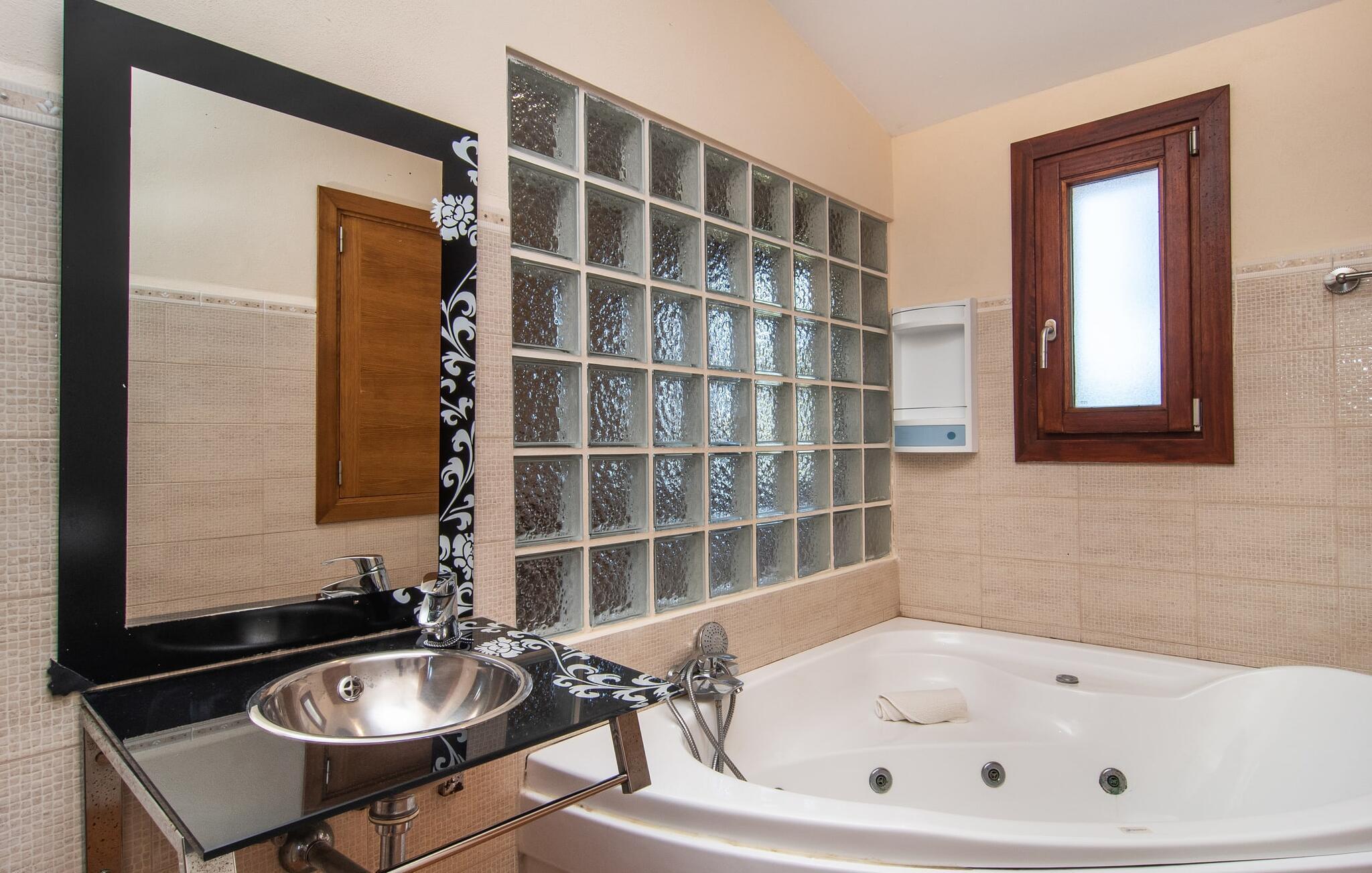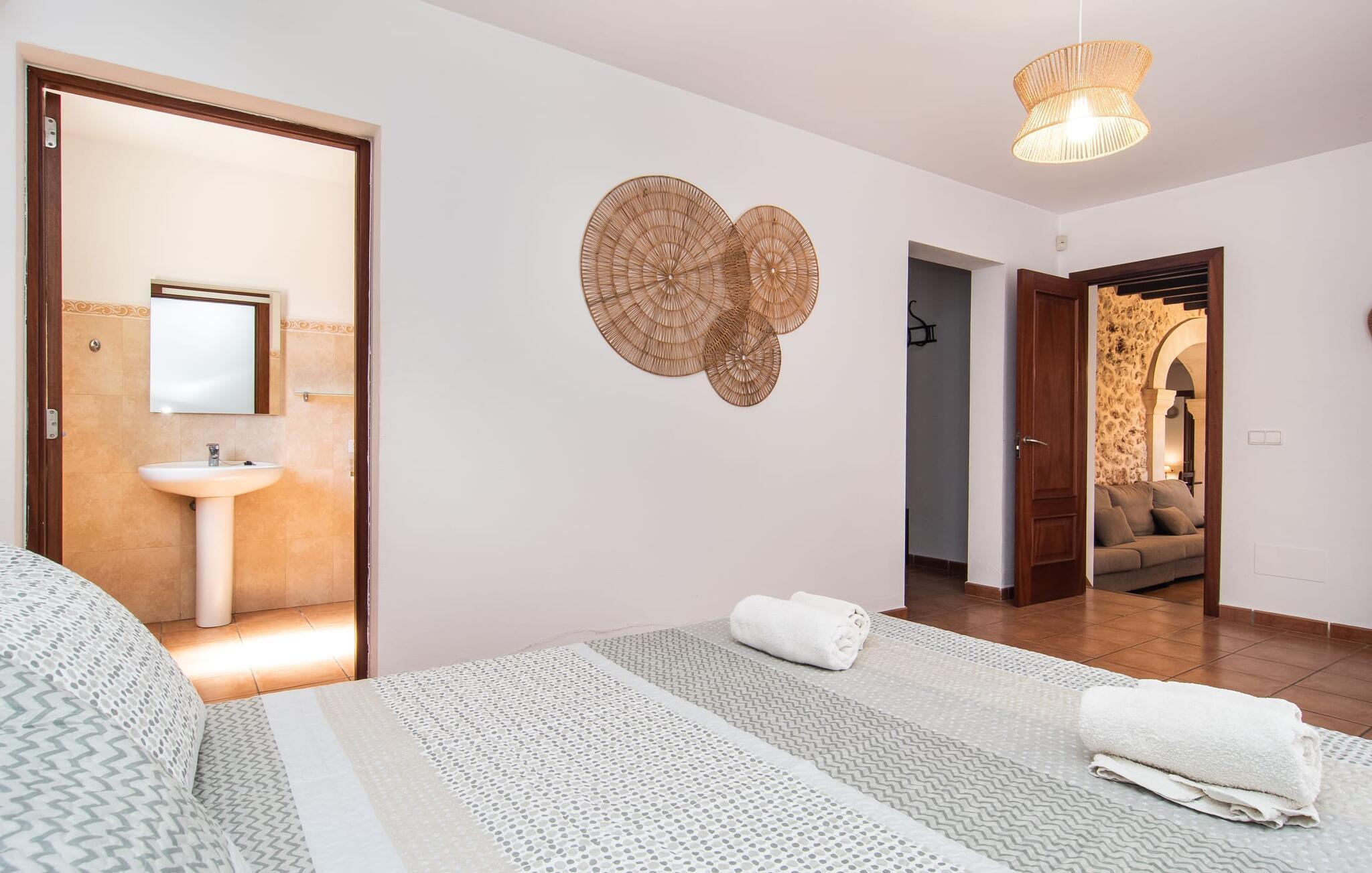 Som en villaejendom med nænsomt renoverede og moderniserede arealer og et originalt modtagelsesudvalg lavet af grønne planter, er denne ejendom med det typiske Mallorca-X i navnet også populær blandt "den yngre generation" - ikke så mærkeligt, med sine landlige omgivelser og friske tilbud fra de ugentlige markeder i området. Peberfrugt, tomater og zucchini kan helt sikkert ende på grøntsagsgrillen. Fra oven ligner "Angoixes" nærmest en separat minilandsby med det århundreder gamle fyrretræ og pryddam som omdrejningspunkt. Hovedhuset, casitaen, den lange pool med solterrasse og spotlight, det komfortable ensemble af udendørs køkken, udendørs badeværelse og spiseplads samt vandreservoiret er grupperet omkring det. Oliven- og figentræer, palmer og vores egen citron- og appelsinlund giver det yderst attraktive udendørsområde et middelhavspræg. Der er masser af plads at lege og det nærliggende skovområde tillader altid en kølig brise at blæse hen over markerne. Udsigten over de skovklædte bakker er også fabelagtig! Bag hovedhusets tykke egetræsdør bydes du velkommen i en elegant opholds- og spisestue, der byder på plads nok til alle gæster. Pejsen giver ekstra komfort og er primært en dekorativ ekstra. Dette område fører til et stort soveværelse med dobbeltseng med udgang til haven. Gamle bondehuse er ofte rustikke og køkkenet, udstyret med el-komfur og opvaskemaskine, er ingen undtagelse. Folk er stolte af, hvem de er, og hvad de har skabt. Solide senge og antikviteter spiller også en rolle i gæsteværelserne (to nedenunder, tre ovenpå, en med dør til panorama tagterrasse). Du vil føle dig så godt tilpas og tryg her, som om huset krammede dig som en bedstemor. Det er måske derfor, der er flere badekar i huset at slappe af i end brusere. Hvert værelse har sit eget badeværelse - næsten alle en-suite - og et par nyder også et hjørnebadekar med massagefunktion. Den smukt dekorerede casita, med to farverige gyngestole nedenunder og en dobbeltseng ovenpå og et spabad, tilbyder den hurtigste vej til poolen og ... frihed! Mallorcas sydspids byder på noget for enhver smag, uanset om du er kunstelsker, kender, vandrefan eller vandsportsentusiast. Den nærliggende Ca's Concos i Cavaller, som kan nås på få minutter ad en stille landevej fra villaen, samler en original kulturel, kunstnerisk og gastronomisk scene; Det bakkede område omkring Santanyí er også kendt som Mallorcas Toscana. De delvist beskyttede strande er blandt de smukkeste på øen og fra Colònia de Sant Jordi bør du bestemt tage en sejltur til gedeøen Cabrera; Hvis du aldrig har været på Capri før, kan du dykke ned i den blå grotte her. Gourmeter finder, hvad de leder efter, i butikkerne og på markederne omkring Campos og Felanitx, men pas på: mandelkager er vanedannende. Den lille Formatges Burguera producerer lækre oste i forskellige modningsgrader, som er den perfekte afslutning på en grillaften hos “Angoixes”. Nær Ca's Concos des Cavaller - mellem Campos og Santanyí - ligger den rummelige, traditionelle villa "Angoixes" med casita, poolområde og masser af træer på en idyllisk, rolig grund. Supermarkeder, bagerier samt trendy restauranter og gallerier kan findes i byer kun 5 til 10 km væk. Efter blot 20 minutters kørsel er hele sydspidsen med Calas Santanyí, Figuera og den beskyttede Mondragó eller Es Trenc-stranden med caribisk flair og den fine sandstrand Playa Sa Ràpita til rådighed for solbadning og dykning. Dette er et Fincallorca feriehus.
