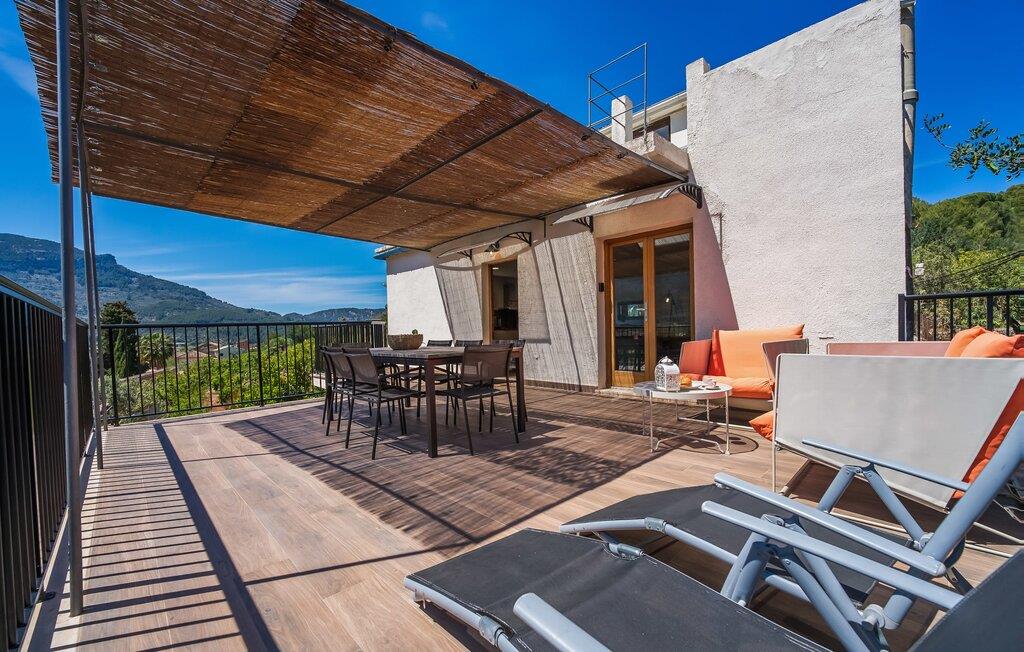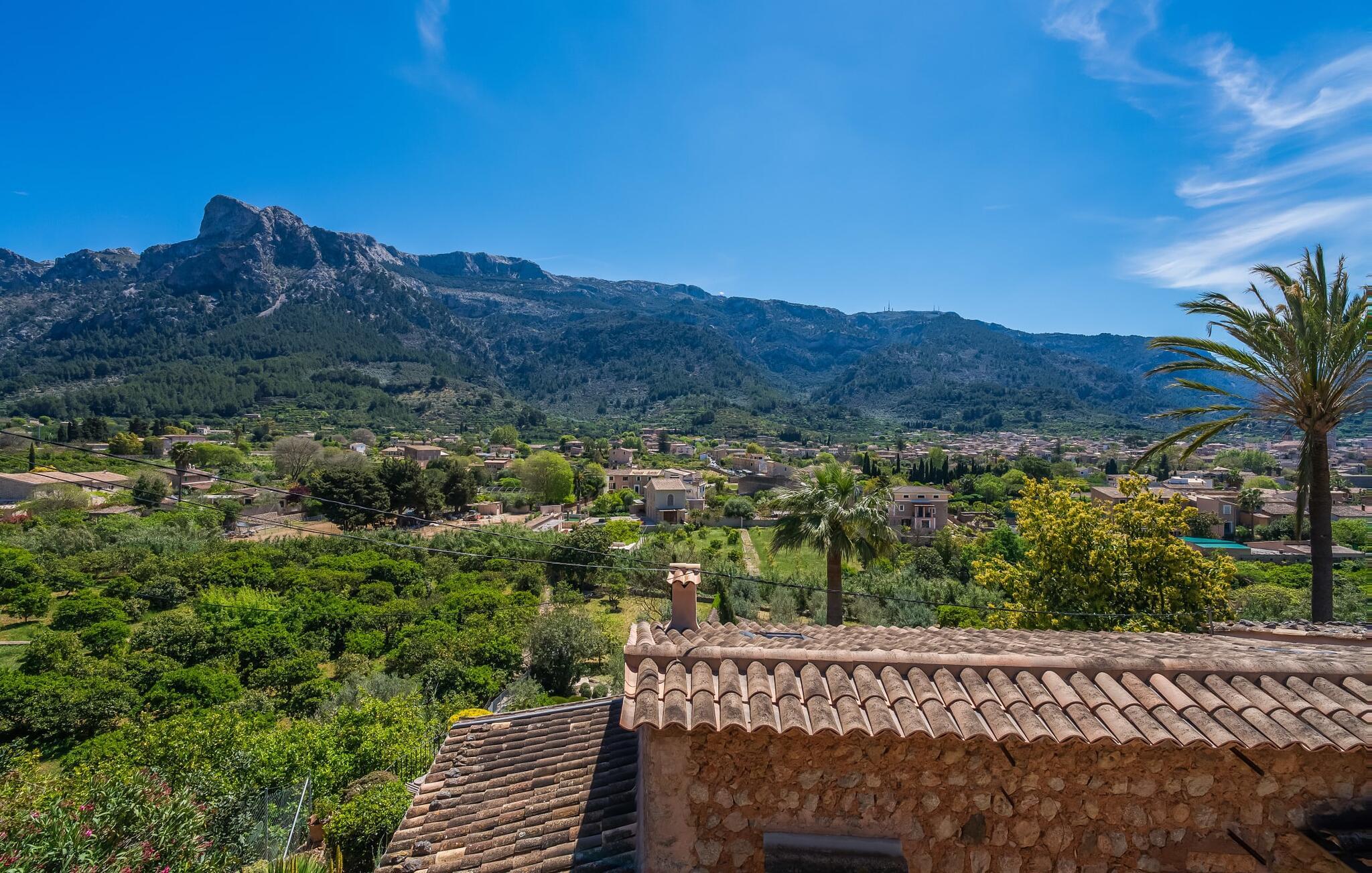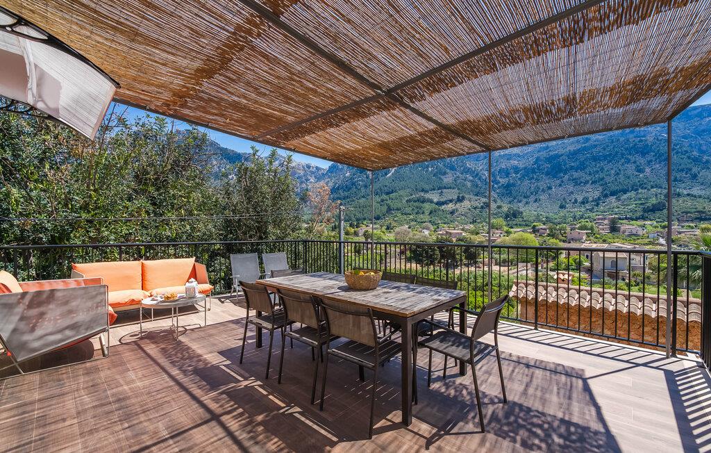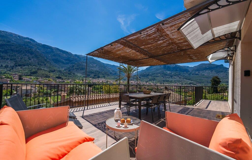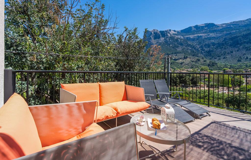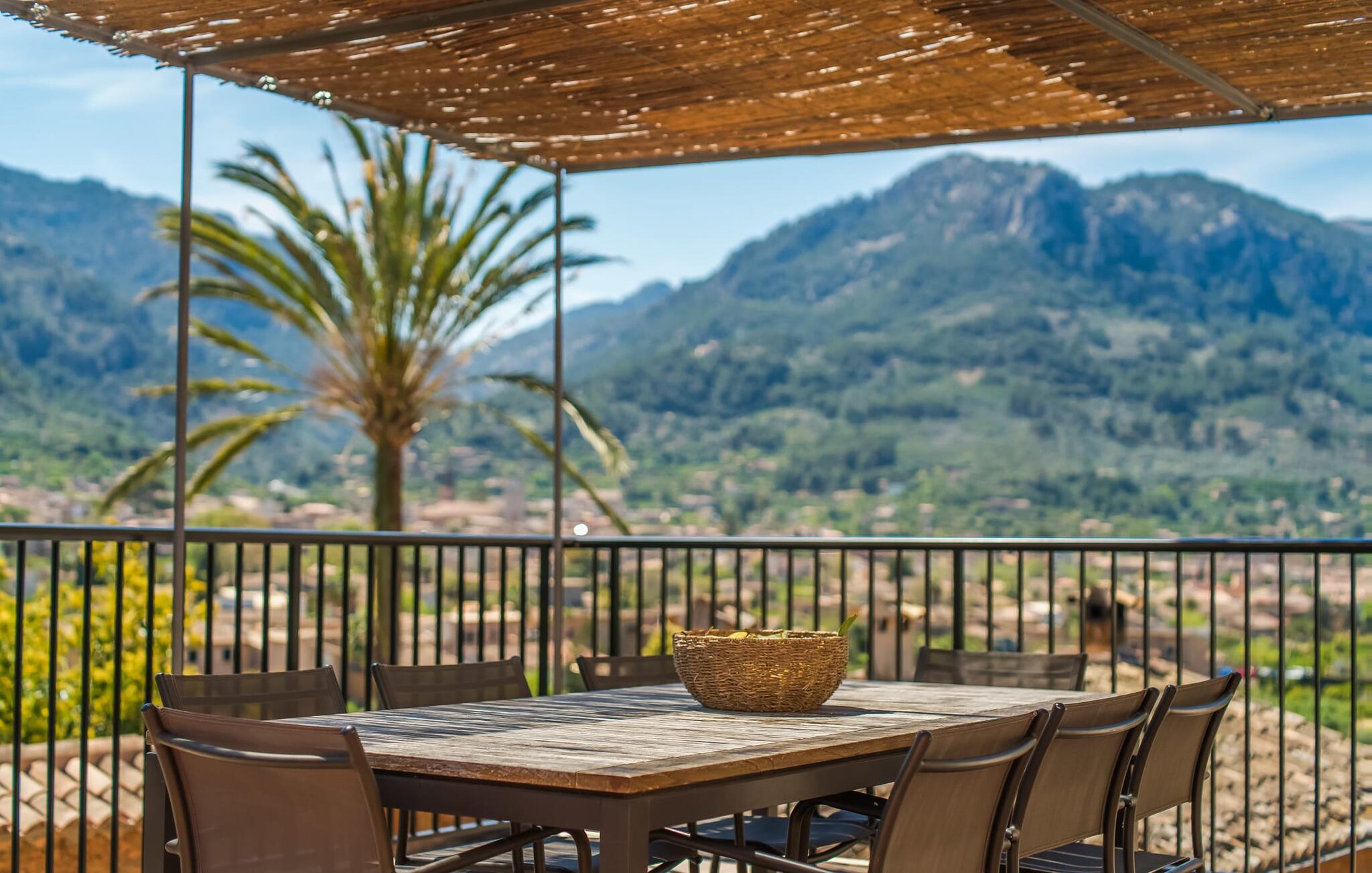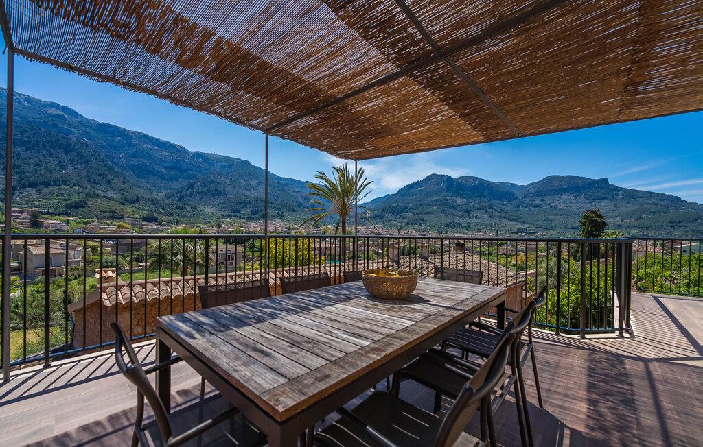 Den rummelige terrasse i denne indbydende ferielejlighed "Arbona Sóller" på Mallorca er en af dens særlige kendetegn. Det byder ikke kun på attraktive sidde- og loungingsmuligheder under middelhavshimlen, men også en udsigt over landskabet og bjergene, der simpelthen er fantastisk. Under det luftige bambustag kan I sidde sammen ved det store spisebord og nyde en hyggelig morgenmad foran denne imponerende kulisse. Chill-out møbler og liggestole er tilgængelige for afslappende stunder. En god bog, en lækker drink, masser af fritid - jeres ferieafslapning er klar! Fra terrassen er der direkte adgang til den åbne stue og spisestue med integreret køkken. Mange vinduer slipper ikke kun meget lys ind i huset, men giver også udsigt til det unikke billedbogspanorama udenfor. Atmosfæren i lejligheden med aircondition er venlig og trendy, med muntre, men aldrig påtrængende farveaccenter. Et stort fladskærms-tv er vigtigt, ligesom komfortable sofaer, et smukt spisebord og selvfølgelig et fuldt udstyret moderne køkken, der endda byder på ekstra siddepladser. Tre meget hyggelige og individuelt indrettede dobbeltværelser tilbyder komfortable steder til en afslappende søvn. Hvert soveværelse har et smart åbent badeværelse. Den særligt charmerende ferielejlighed "Arbona Sóller" ligger kun ca. 2 km nordøst for den autentiske landsby Sóller på Mallorca. Det tilbyder et fantastisk panorama på den imponerende baggrund af Tramuntana-bjergene. Port de Sóller-stranden kan nås på lidt over 10 minutter i bil.