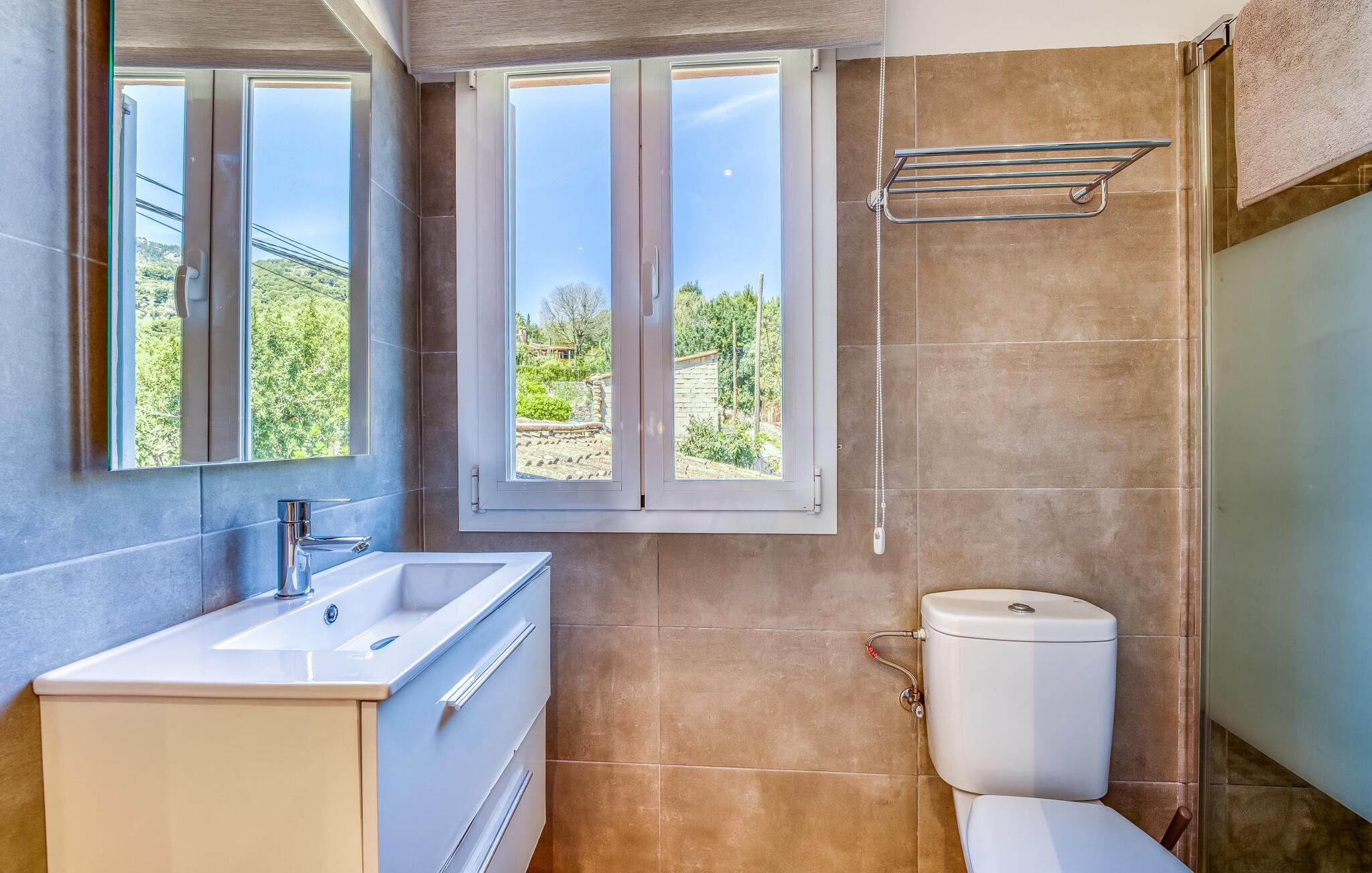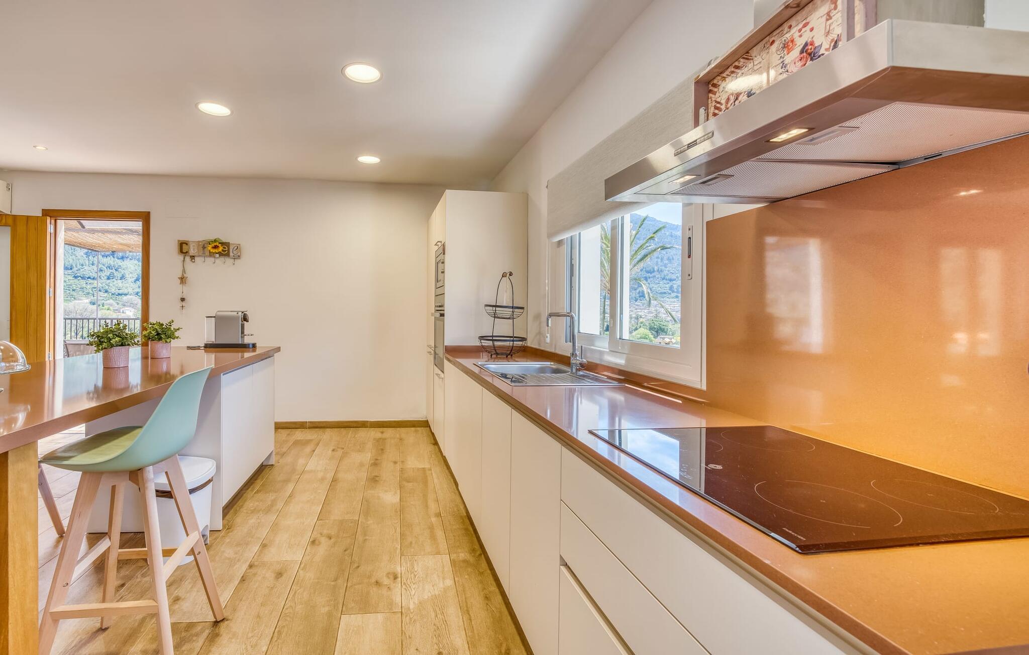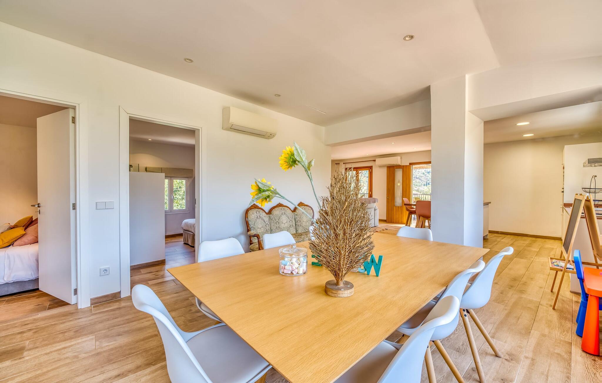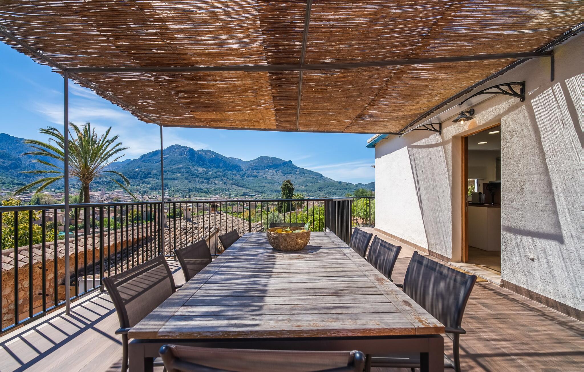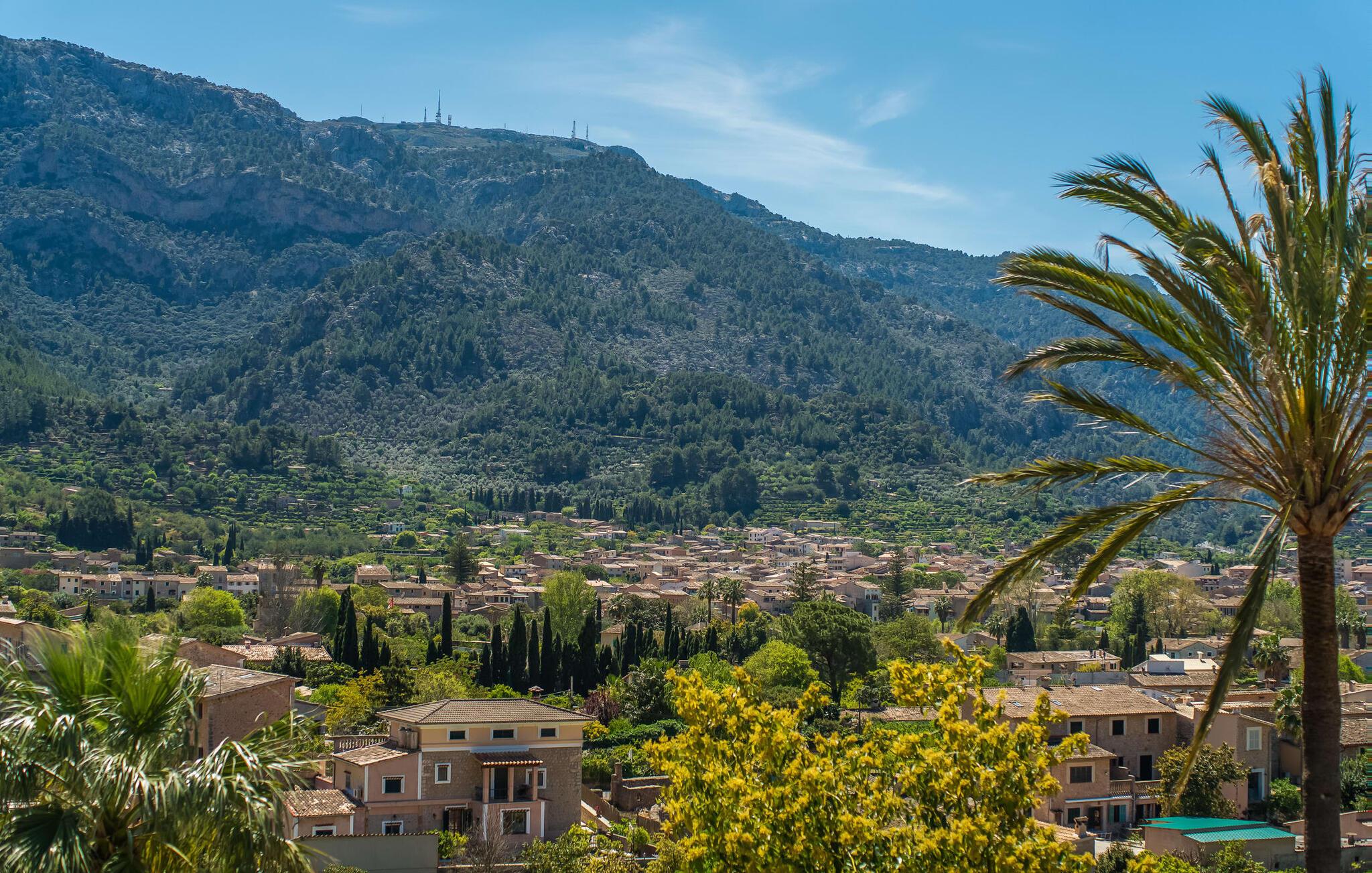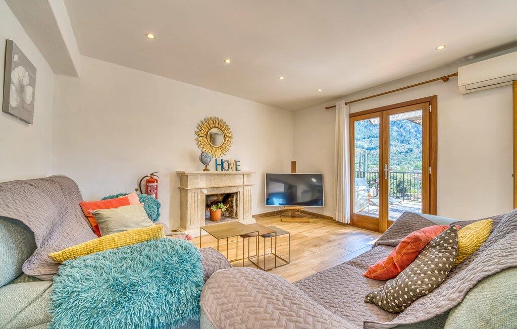 Den rummelige terrasse i denne indbydende ferielejlighed "Arbona Sóller" på Mallorca er en af dens særlige kendetegn. Det byder ikke kun på attraktive sidde- og loungingsmuligheder under middelhavshimlen, men også en udsigt over landskabet og bjergene, der simpelthen er fantastisk. Under det luftige bambustag kan I sidde sammen ved det store spisebord og nyde en hyggelig morgenmad foran denne imponerende kulisse. Chill-out møbler og liggestole er tilgængelige for afslappende stunder. En god bog, en lækker drink, masser af fritid - jeres ferieafslapning er klar! Fra terrassen er der direkte adgang til den åbne stue og spisestue med integreret køkken. Mange vinduer slipper ikke kun meget lys ind i huset, men giver også udsigt til det unikke billedbogspanorama udenfor. Atmosfæren i lejligheden med aircondition er venlig og trendy, med muntre, men aldrig påtrængende farveaccenter. Et stort fladskærms-tv er vigtigt, ligesom komfortable sofaer, et smukt spisebord og selvfølgelig et fuldt udstyret moderne køkken, der endda byder på ekstra siddepladser. Tre meget hyggelige og individuelt indrettede dobbeltværelser tilbyder komfortable steder til en afslappende søvn. Hvert soveværelse har et smart åbent badeværelse. Den særligt charmerende ferielejlighed "Arbona Sóller" ligger kun ca. 2 km nordøst for den autentiske landsby Sóller på Mallorca. Det tilbyder et fantastisk panorama på den imponerende baggrund af Tramuntana-bjergene. Port de Sóller-stranden kan nås på lidt over 10 minutter i bil.