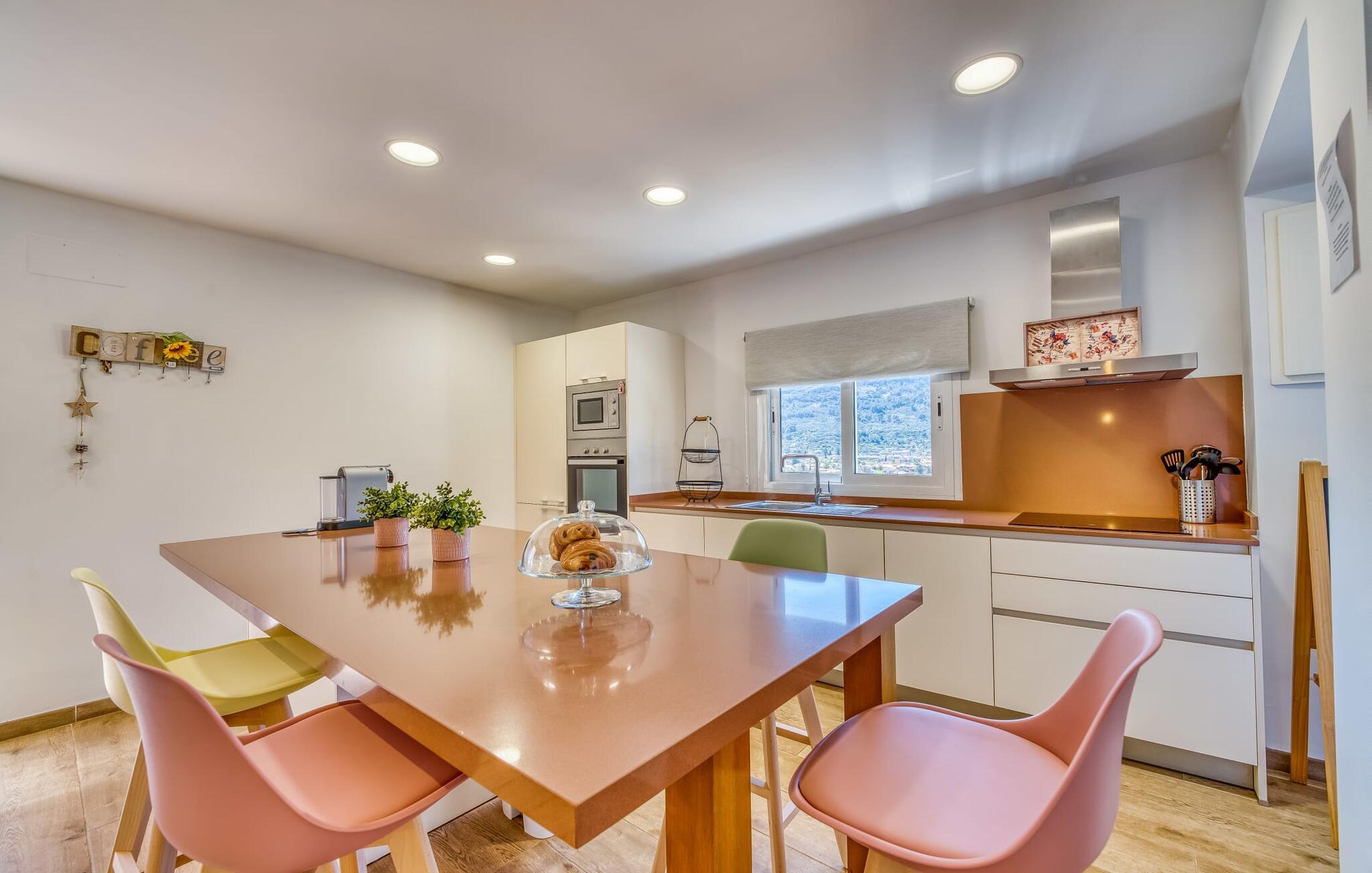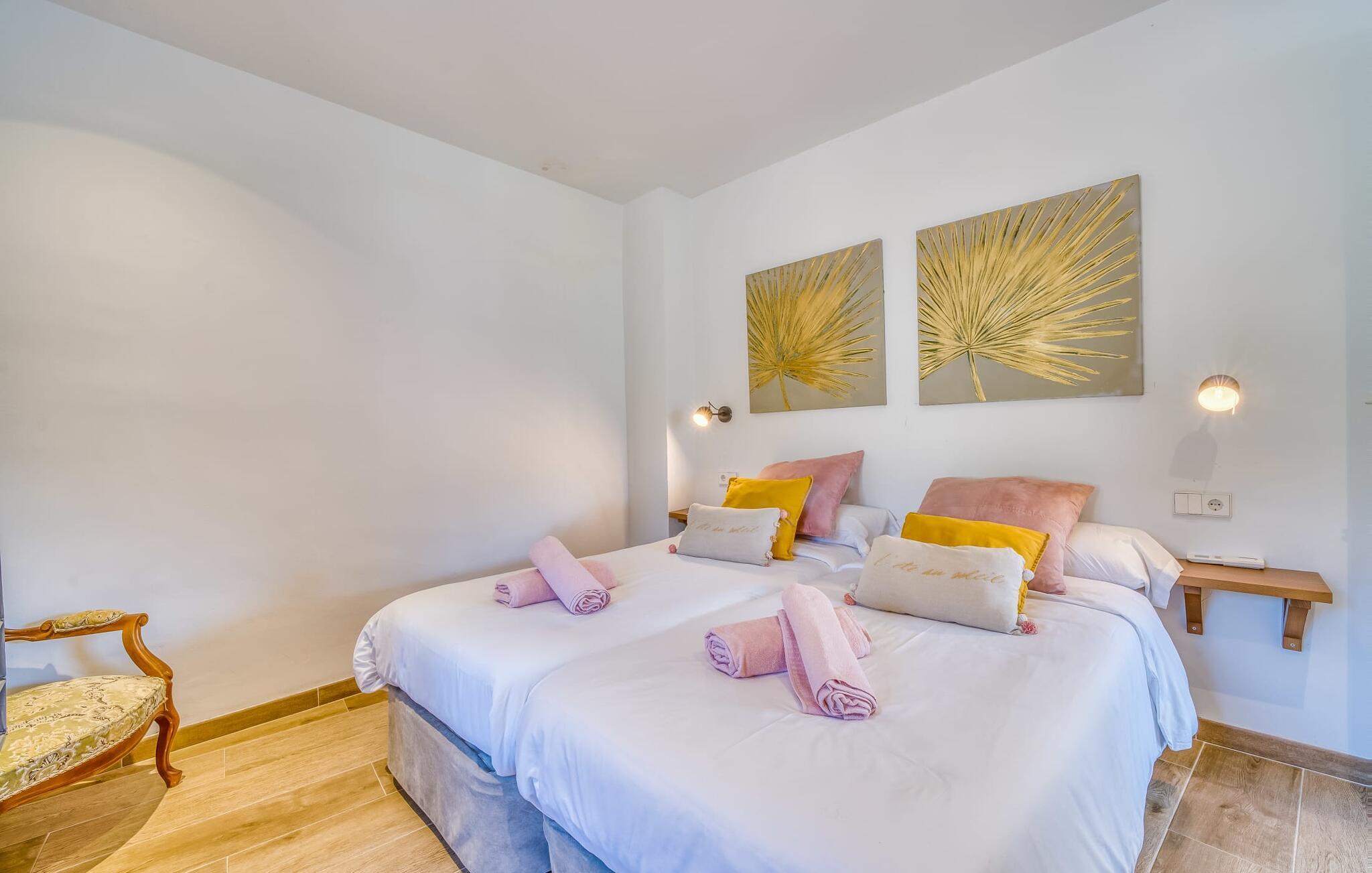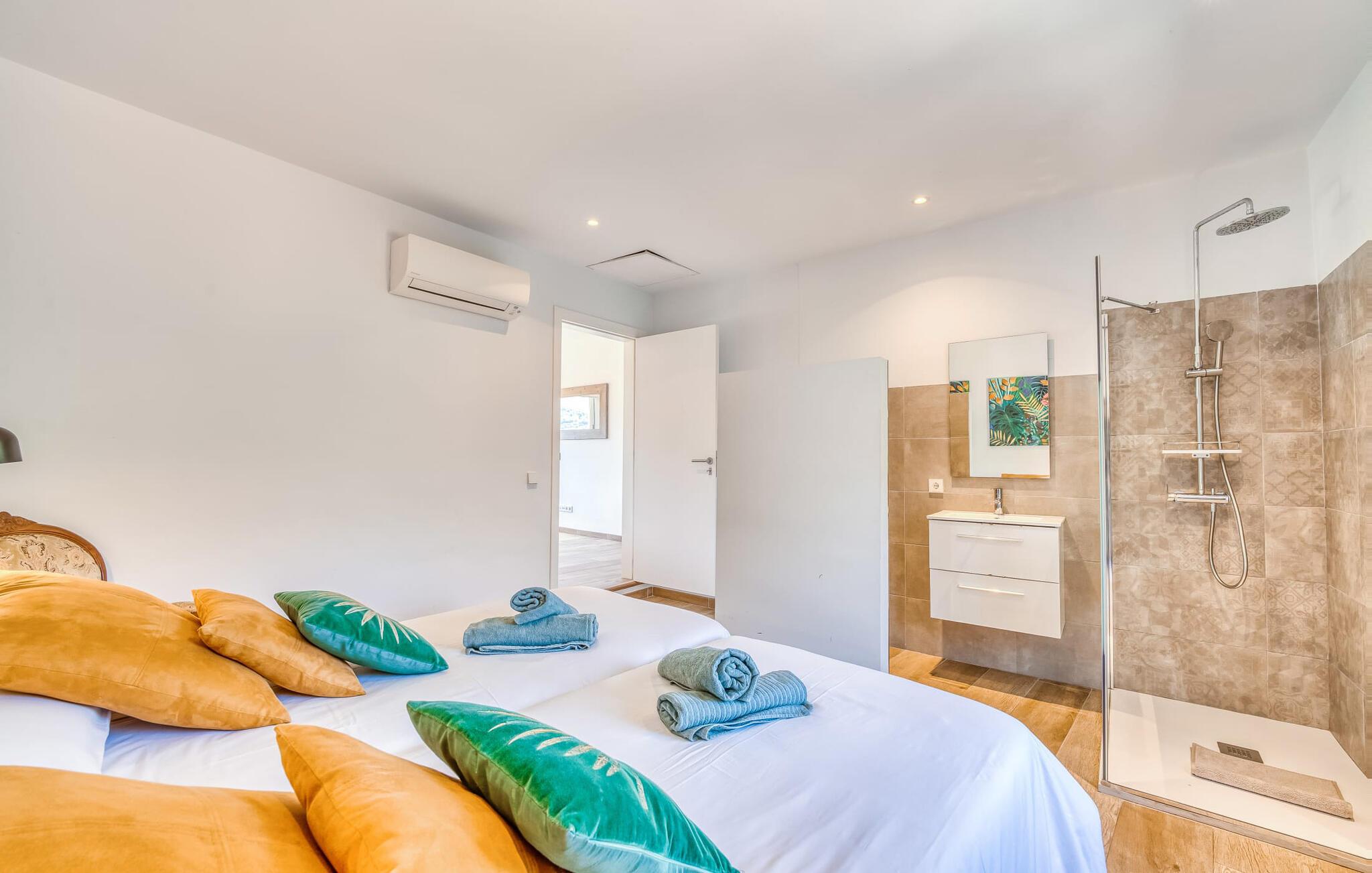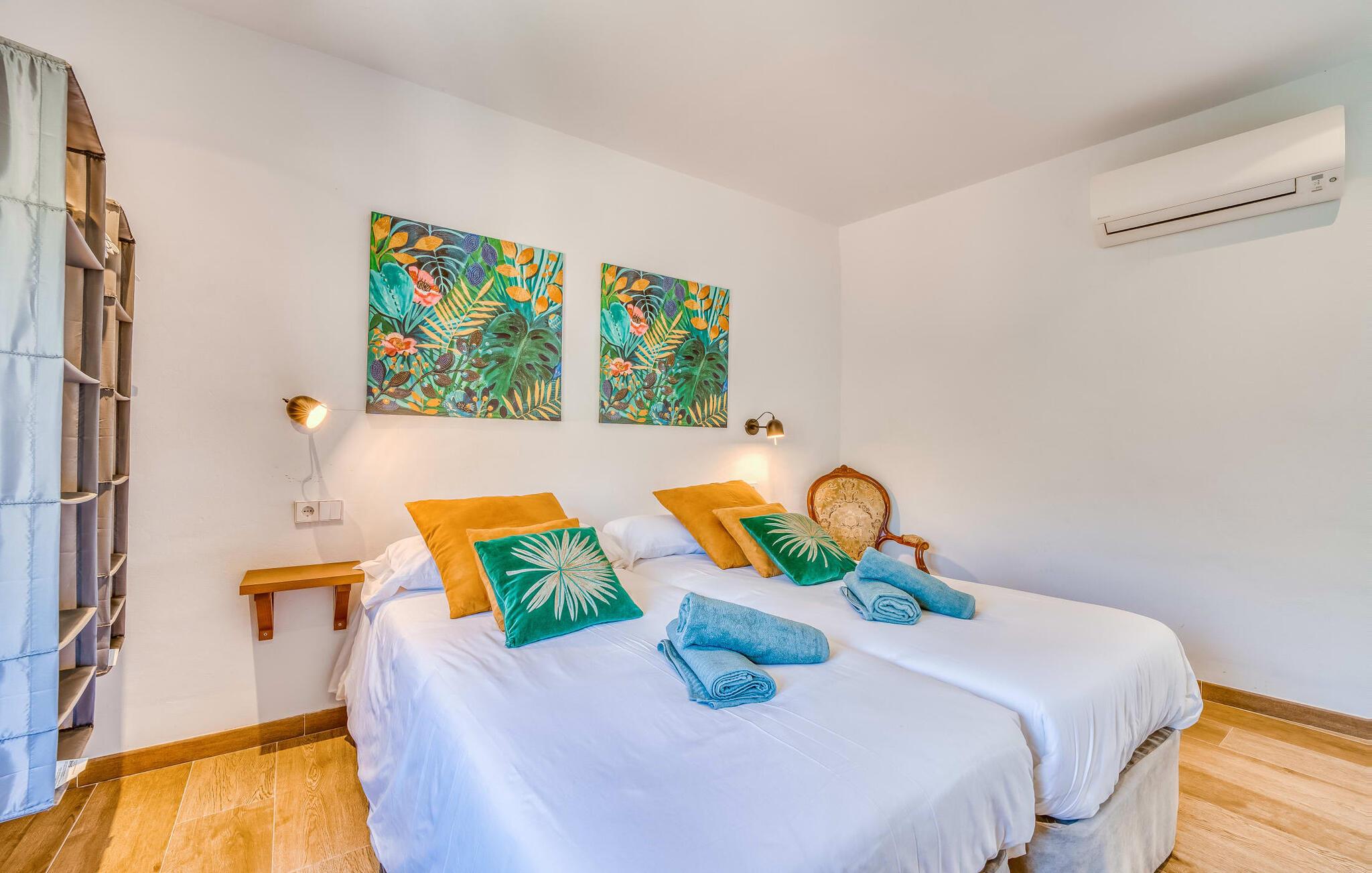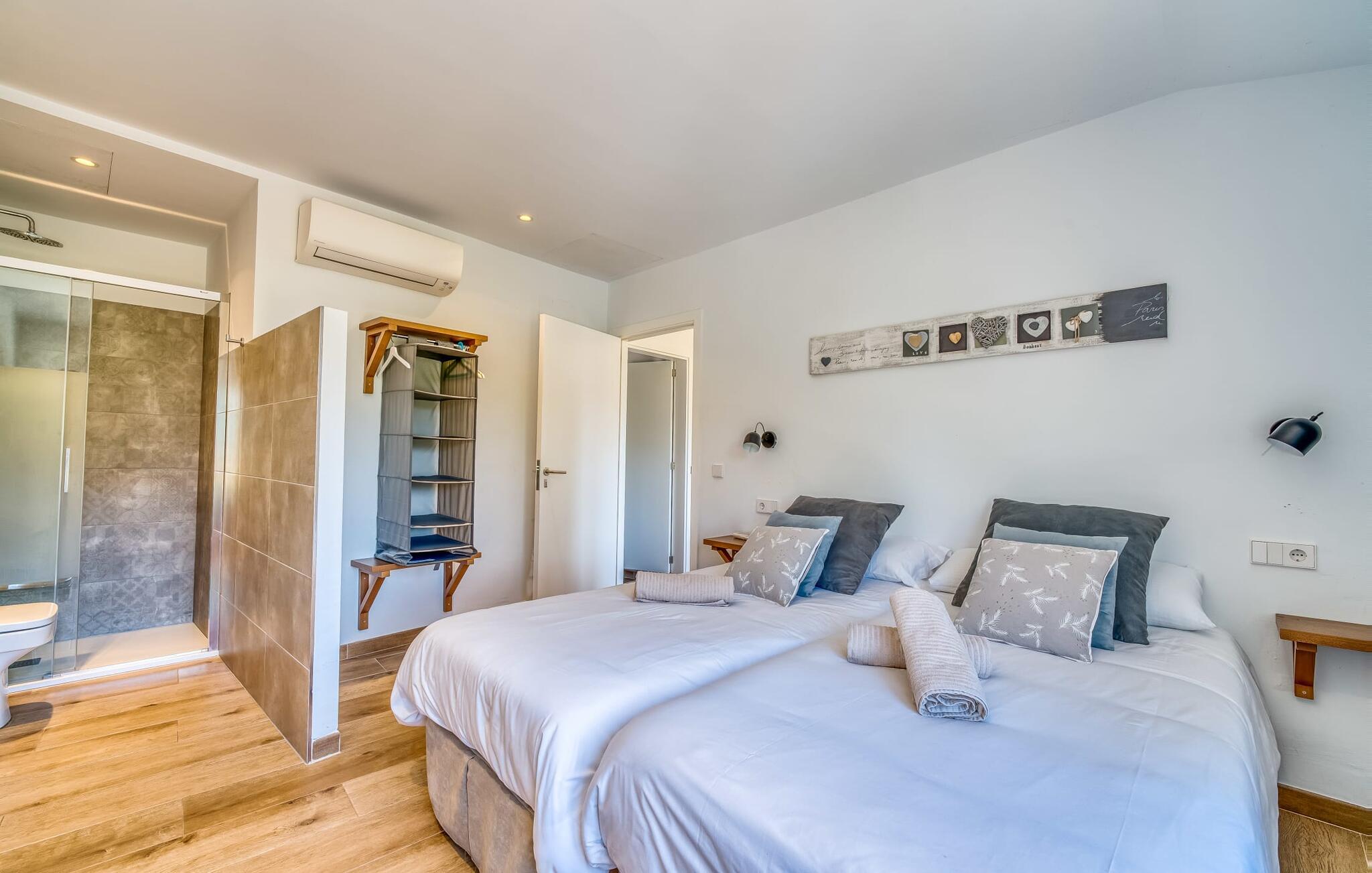 Den rummelige terrasse i denne indbydende ferielejlighed "Arbona Sóller" på Mallorca er en af dens særlige kendetegn. Det byder ikke kun på attraktive sidde- og loungingsmuligheder under middelhavshimlen, men også en udsigt over landskabet og bjergene, der simpelthen er fantastisk. Under det luftige bambustag kan I sidde sammen ved det store spisebord og nyde en hyggelig morgenmad foran denne imponerende kulisse. Chill-out møbler og liggestole er tilgængelige for afslappende stunder. En god bog, en lækker drink, masser af fritid - jeres ferieafslapning er klar! Fra terrassen er der direkte adgang til den åbne stue og spisestue med integreret køkken. Mange vinduer slipper ikke kun meget lys ind i huset, men giver også udsigt til det unikke billedbogspanorama udenfor. Atmosfæren i lejligheden med aircondition er venlig og trendy, med muntre, men aldrig påtrængende farveaccenter. Et stort fladskærms-tv er vigtigt, ligesom komfortable sofaer, et smukt spisebord og selvfølgelig et fuldt udstyret moderne køkken, der endda byder på ekstra siddepladser. Tre meget hyggelige og individuelt indrettede dobbeltværelser tilbyder komfortable steder til en afslappende søvn. Hvert soveværelse har et smart åbent badeværelse. Den særligt charmerende ferielejlighed "Arbona Sóller" ligger kun ca. 2 km nordøst for den autentiske landsby Sóller på Mallorca. Det tilbyder et fantastisk panorama på den imponerende baggrund af Tramuntana-bjergene. Port de Sóller-stranden kan nås på lidt over 10 minutter i bil.