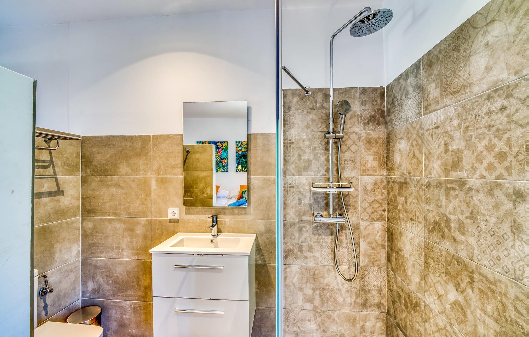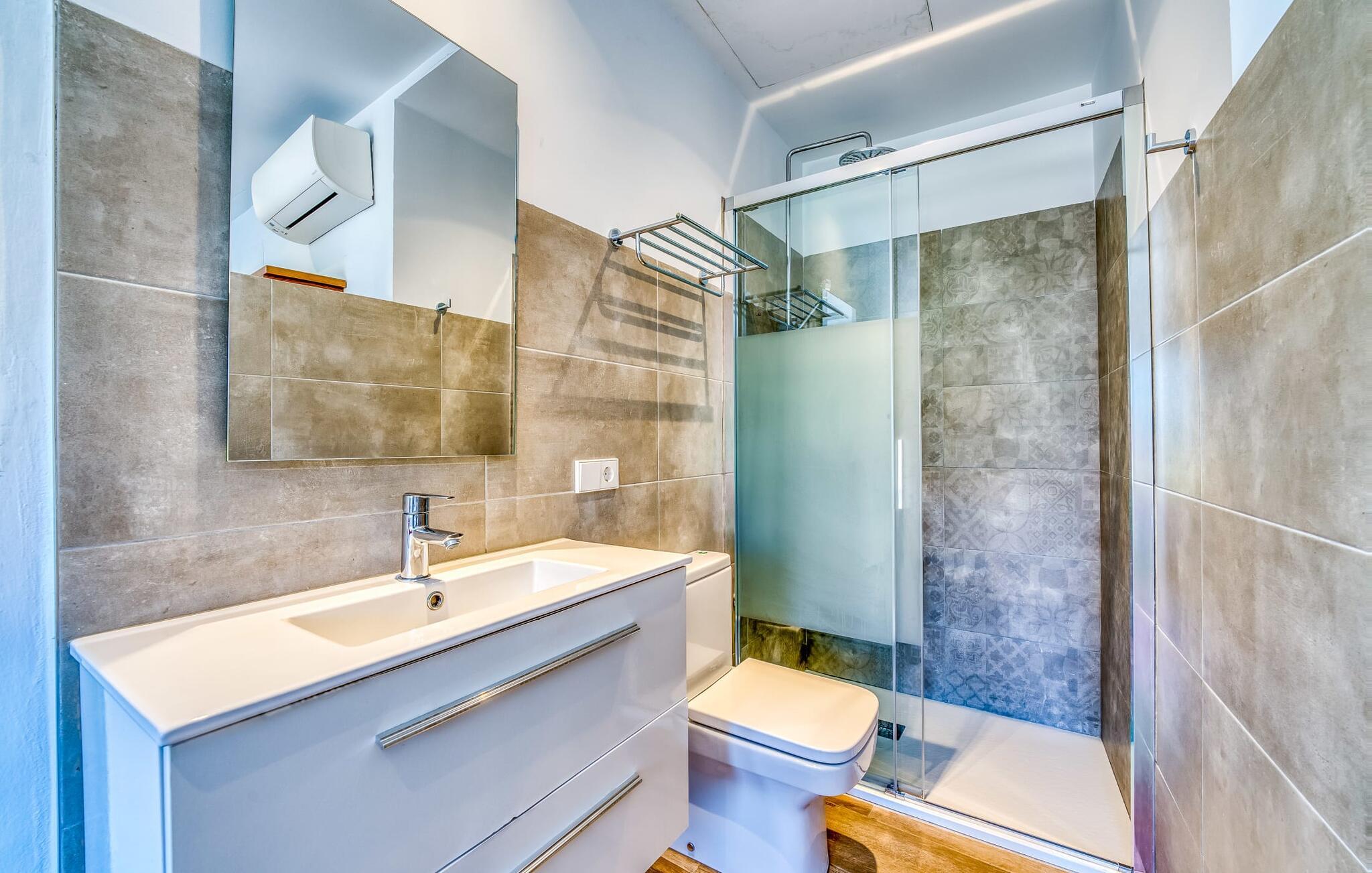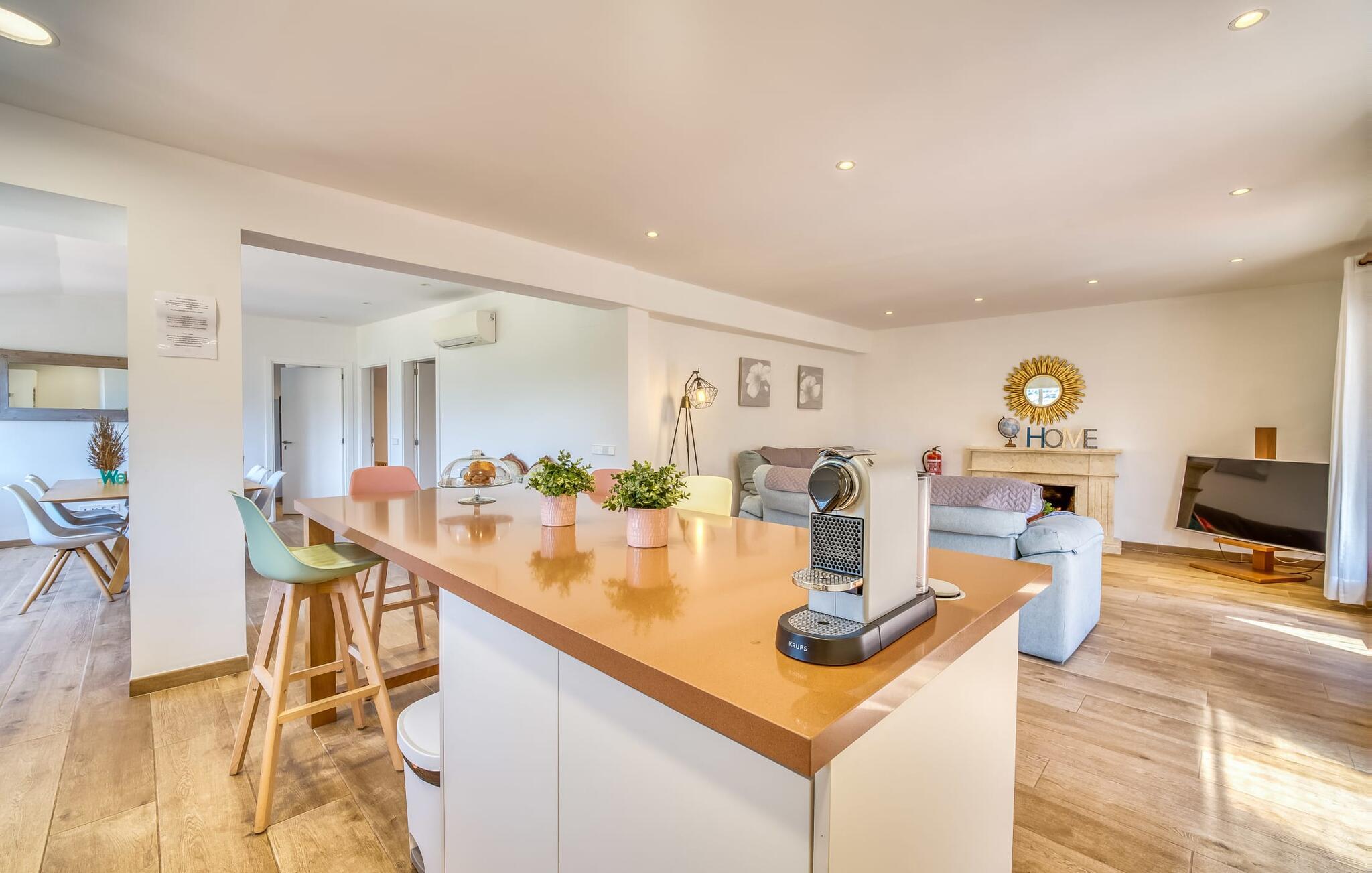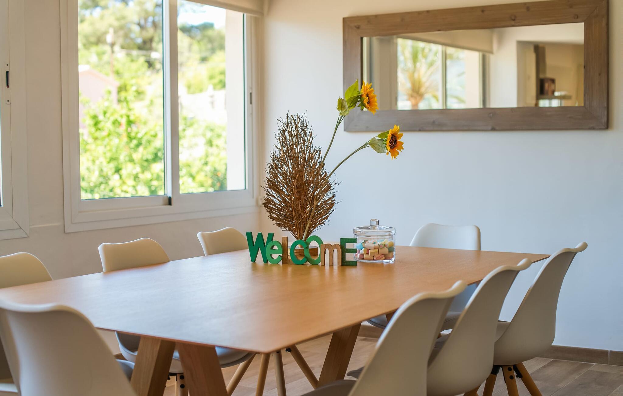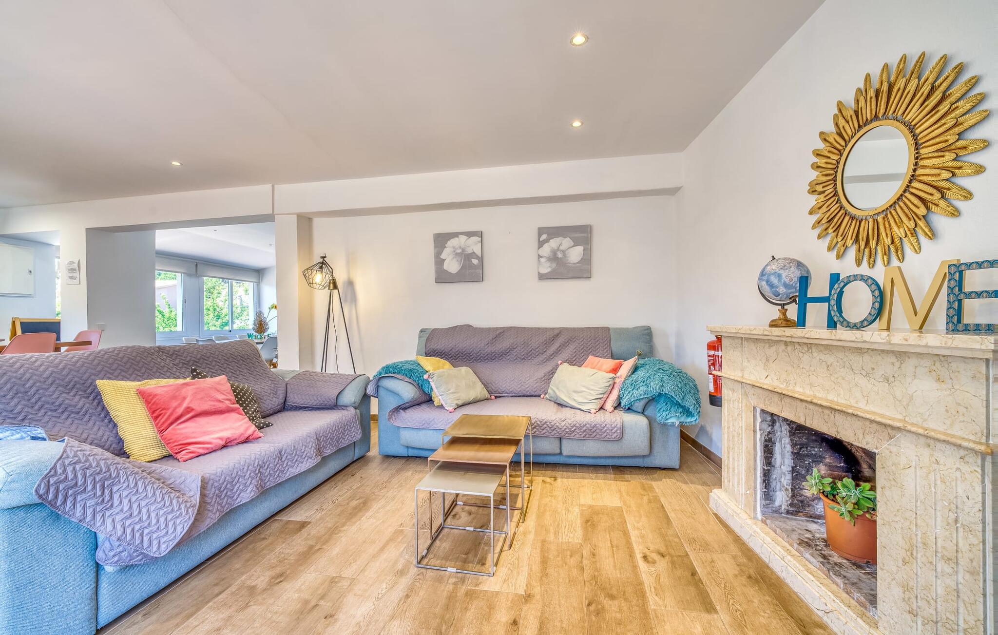 Den rummelige terrasse i denne indbydende ferielejlighed "Arbona Sóller" på Mallorca er en af dens særlige kendetegn. Det byder ikke kun på attraktive sidde- og loungingsmuligheder under middelhavshimlen, men også en udsigt over landskabet og bjergene, der simpelthen er fantastisk. Under det luftige bambustag kan I sidde sammen ved det store spisebord og nyde en hyggelig morgenmad foran denne imponerende kulisse. Chill-out møbler og liggestole er tilgængelige for afslappende stunder. En god bog, en lækker drink, masser af fritid - jeres ferieafslapning er klar! Fra terrassen er der direkte adgang til den åbne stue og spisestue med integreret køkken. Mange vinduer slipper ikke kun meget lys ind i huset, men giver også udsigt til det unikke billedbogspanorama udenfor. Atmosfæren i lejligheden med aircondition er venlig og trendy, med muntre, men aldrig påtrængende farveaccenter. Et stort fladskærms-tv er vigtigt, ligesom komfortable sofaer, et smukt spisebord og selvfølgelig et fuldt udstyret moderne køkken, der endda byder på ekstra siddepladser. Tre meget hyggelige og individuelt indrettede dobbeltværelser tilbyder komfortable steder til en afslappende søvn. Hvert soveværelse har et smart åbent badeværelse. Den særligt charmerende ferielejlighed "Arbona Sóller" ligger kun ca. 2 km nordøst for den autentiske landsby Sóller på Mallorca. Det tilbyder et fantastisk panorama på den imponerende baggrund af Tramuntana-bjergene. Port de Sóller-stranden kan nås på lidt over 10 minutter i bil.