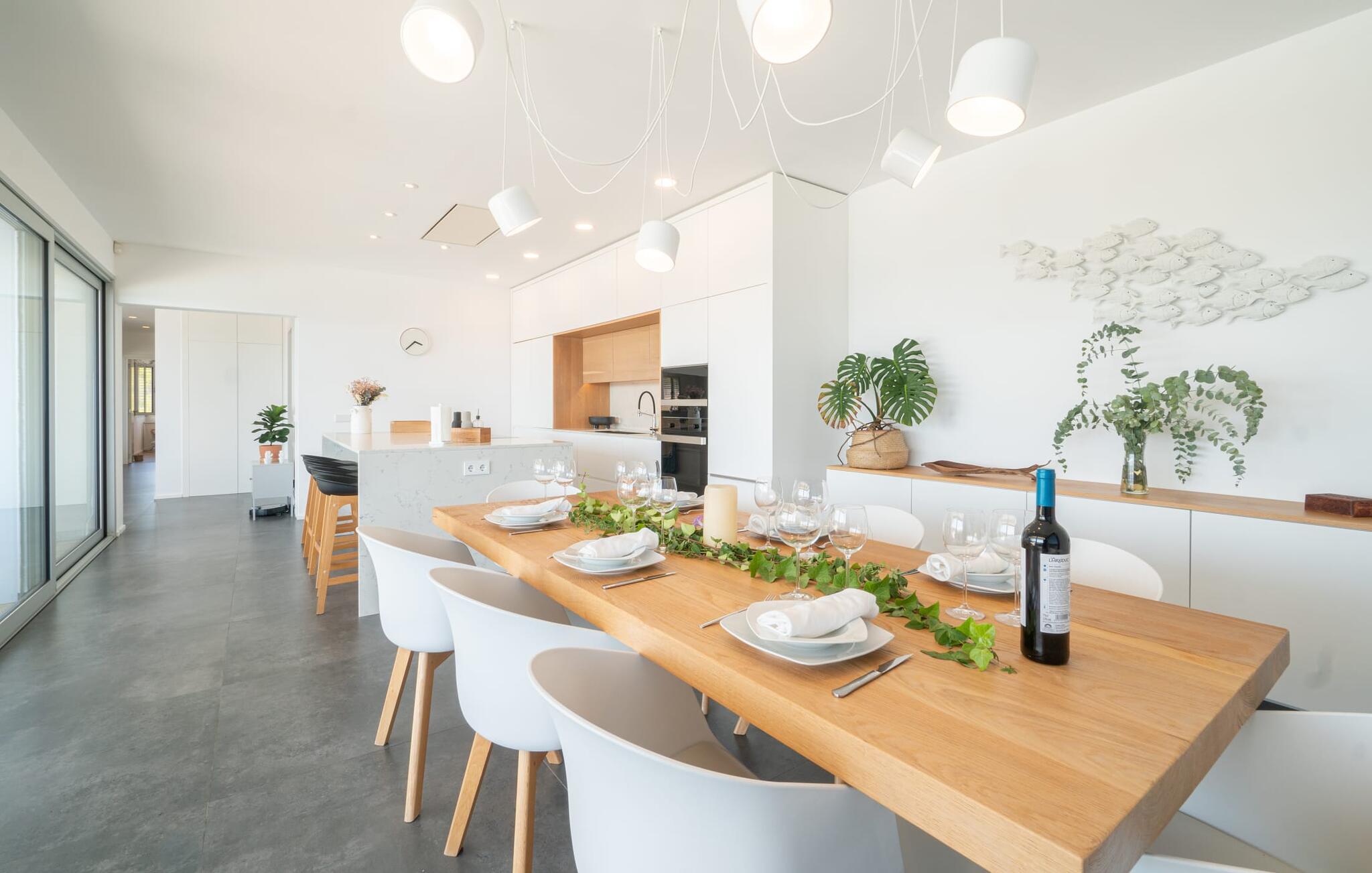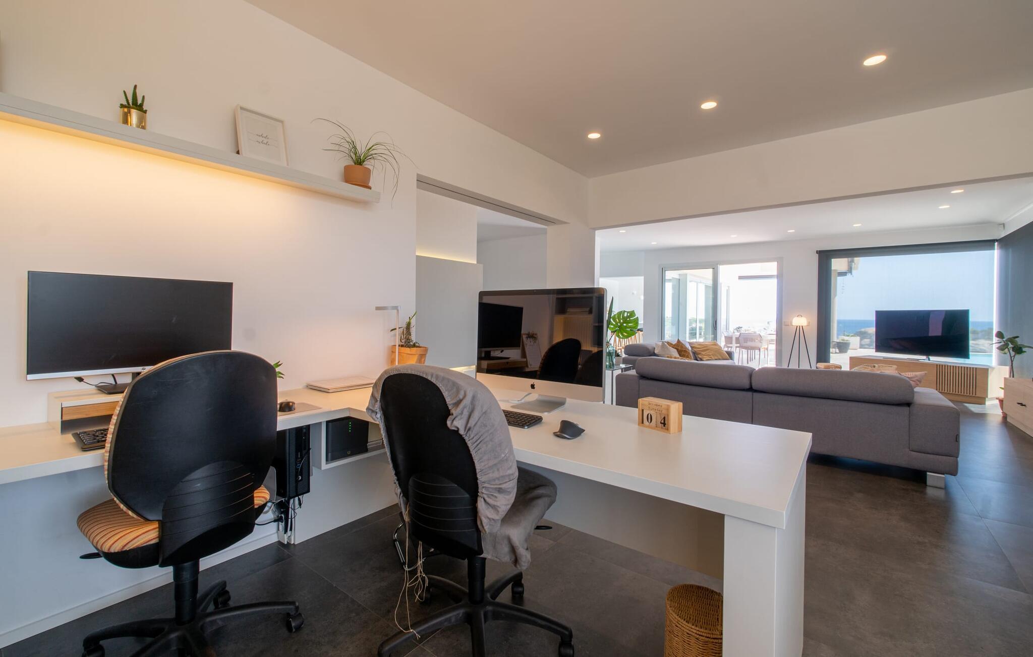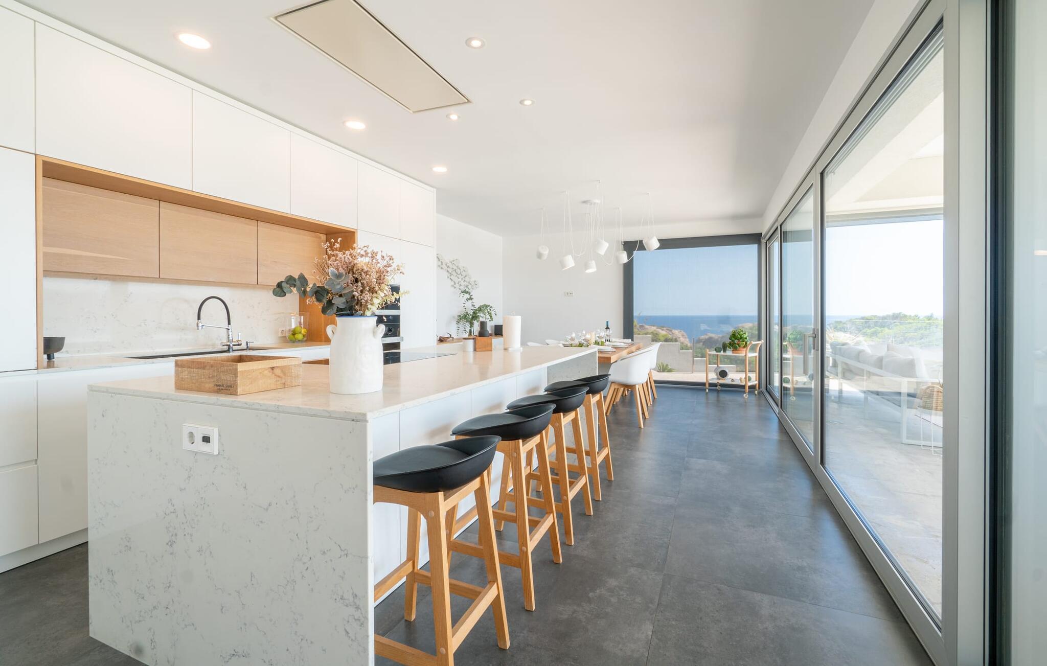 Med sit lineære design er villaen "Arcadia 50" det perfekte feriehus for arkitekturelskere. Ligesom for alle, der ønsker at bo særligt komfortabelt og stilfuldt. Det moderne feriehus kan rumme op til seks personer. Det blev bygget på en bakke i et eksklusivt kvarter nær Cala Ratjada på Mallorcas østkyst og byder på en fantastisk udsigt over det nærliggende Middelhav og klipperne foran det. I kan nyde denne udsigt både fra de rummelige overdækkede terrasseområder og fra solterrassen ved saltvandspoolen. Og selv når I er i poolen, som også har et lavvandet område til børn, kan I se direkte på havet takket være glasrækværket. I kan tage på skønne gå- og vandreture i umiddelbar nærhed af jeres sommerhus og bekvemt parkere jeres lejebil i garagen. Denne villa er også rigtig smart indefra: De mange vinduer slipper masser af lys ind og byder på en fantastisk udsigt over havet. De er desuden udstyret med persienner og rullegardiner for at sikre, at huset ikke bliver for varmt på solrige dage. Masser af hvide og naturlige nuancer, kombineret med designermøbler og nøje udvalgte boligtilbehør, fremtryller en venlig og stilfuld atmosfære i hele huset. I stueplan er der to smagfuldt indrettede soveværelser med fælles, moderne badeværelse med badekar, indbydende entré og praktisk vaskerum. Den øverste etage i poolniveau imponerer med en stor stue, et rummeligt gæstetoilet med bruser og en arbejdsstation, der er perfekt til et hjemmekontor - tilslutninger er tilgængelige, hvis I vil have jeres bærbare computer med. Køkkenet, som er udstyret med hårde hvidevarer af høj kvalitet, og den åbne spiseplads er også virkelige højdepunkter: Herfra kan I nyde udsigten til terrassen og havet takket være gulv til loft vinduer. Endnu et soveværelse med påklædningsværelse og badeværelse en suite afrunder boligkomforten. Enestående udsigt: Villaen "Arcadia 50" blev bygget på en spektakulær bjergskråning i et eksklusivt boligområde i Cala Ratjada på Mallorcas østkyst. Fra huset og ejendommen inklusive pool- og terrasseområderne kan I nyde en direkte udsigt over klipperne og havet. Der er ikke langt til byen Cala Ratjada, og den nærmeste badebugt, Cala Gat, kan også nemt nås til fods.
