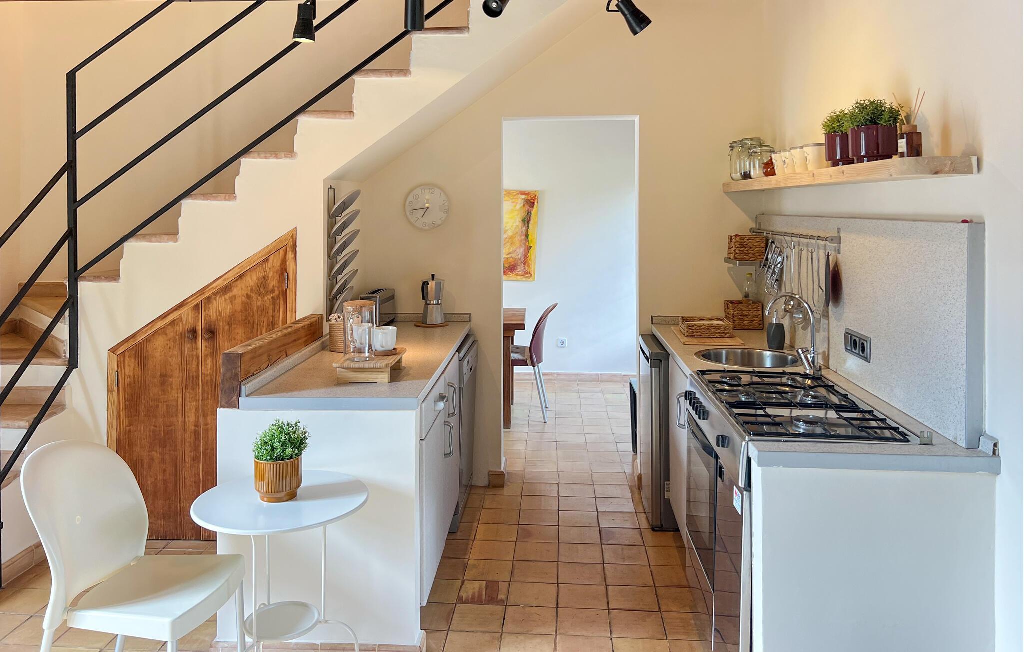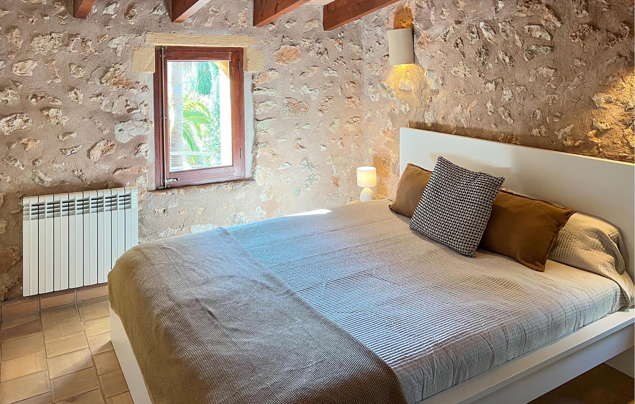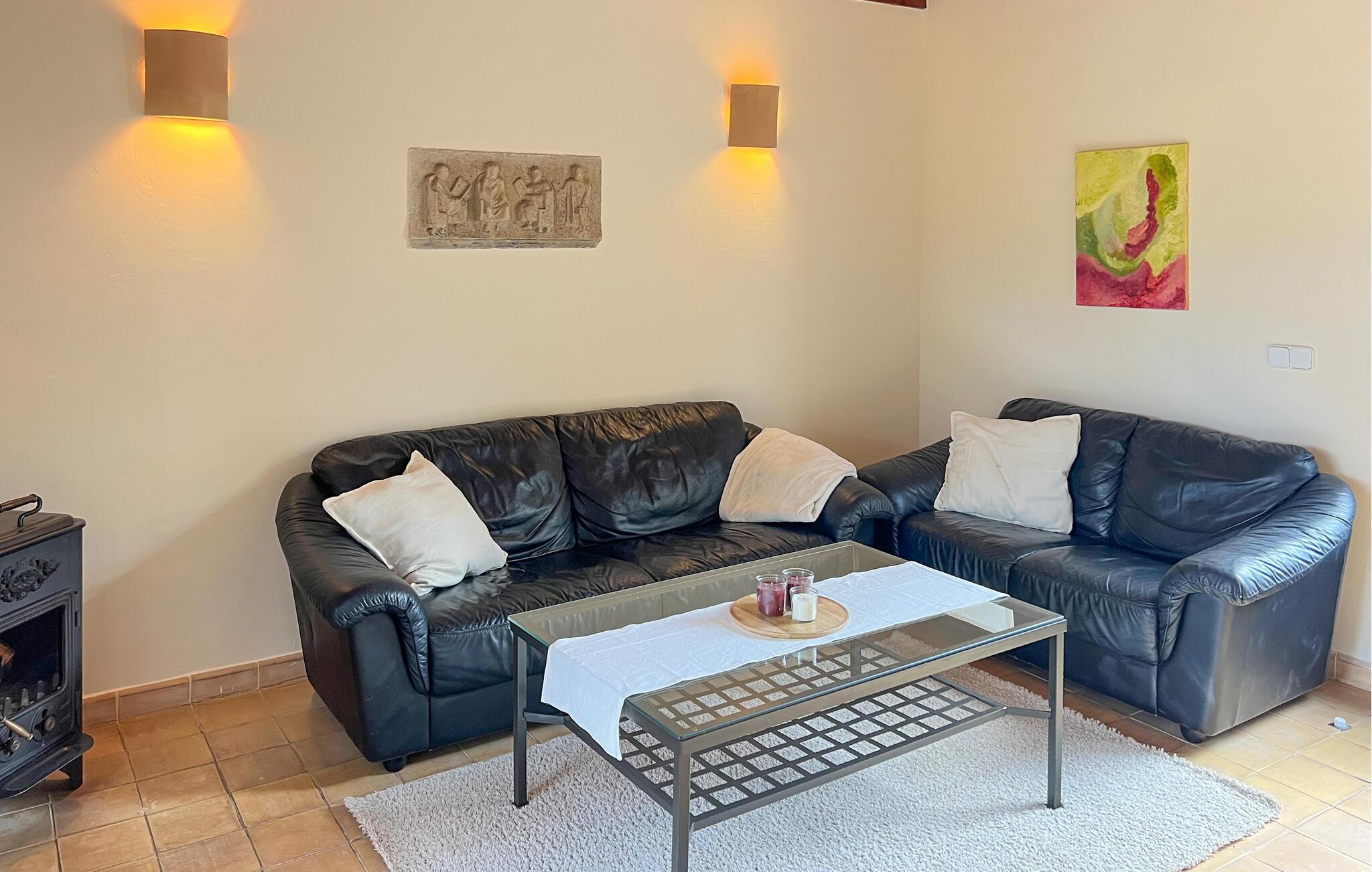 Villalejligheden "Arco" er en fuldstændig uafhængig to-etagers del af villaen "Pina", beliggende i en fantastisk, økologisk styret ejendom, omgivet af unge oliven- og citrustræer, lavendel- og oleanderlunde og smukt anlagte haver, alt på udkanten af et naturreservat. Dette er et feriehus i Fincallorca. Udenfor kan du slappe af på en af de to terrasser, den ene i skygge og den anden solrig, eller nyde det store, oplyste poolområde med masser af liggestole. Haverne giver et fredeligt og privat tilflugtssted. "Toni", det venlige æsel, giver ejendommen charme og glæder både børn og voksne. Indenfor skaber traditionelle bjælkelofter, lyse vægge og trævinduer en munter, afslappet atmosfære, suppleret med møbler af høj kvalitet og teakmøbler. Det åbne opholds- og spiseområde med pejs inviterer dig til at slappe af, mens du i fred og ro kan tilberede dine måltider i det fuldt udstyrede køkken. To smukt renoverede soveværelser med dobbeltsenge sikrer en god nattesøvn, og to moderne badeværelser tilbyder al komfort. "Arco" tilbyder den ideelle blanding af natur og fred, hvilket gør det til det perfekte sted for en afslappende ferie på Mallorca. Ejendommen omfatter yderligere tre villaer og villalejligheder, som du også kan finde i vores sortiment. Villa ferielejligheden "Arco" er beliggende i en rolig beliggenhed mellem Sencelles og Costitx og er omgivet af et blidt bakket landskab. Costitx, omkring fem minutters kørsel væk, har et supermarked, barer, restauranter og et fantastisk bageri. Ejendommens bekvemme beliggenhed tillader ture til mange af øens strande såsom Es Trenc, Son Serra Marina og Alcúdia-bugten.