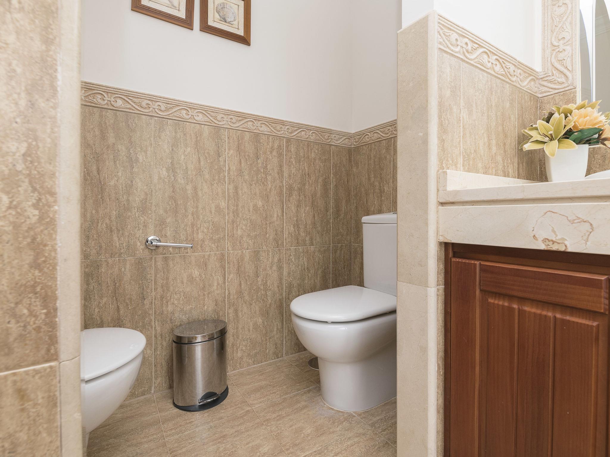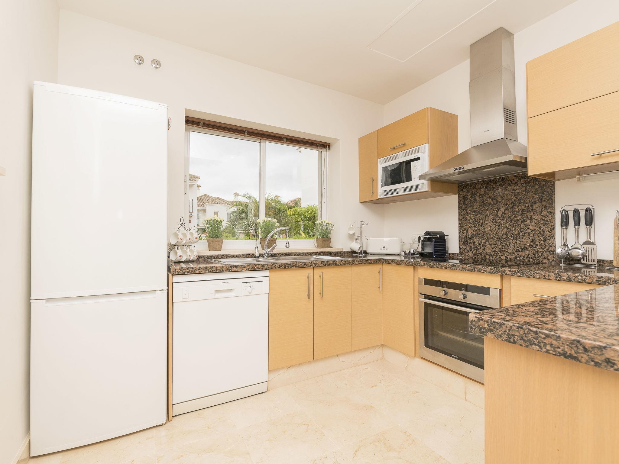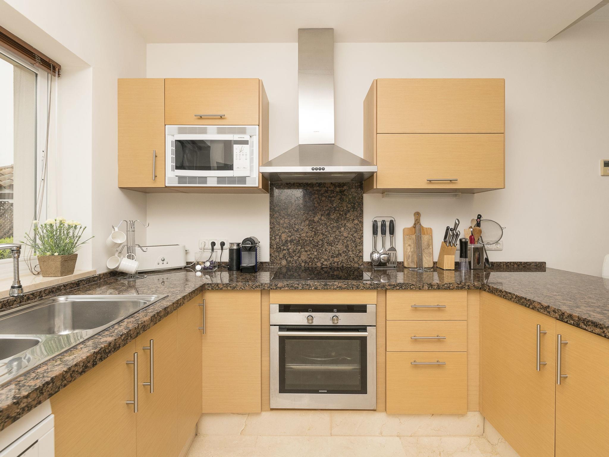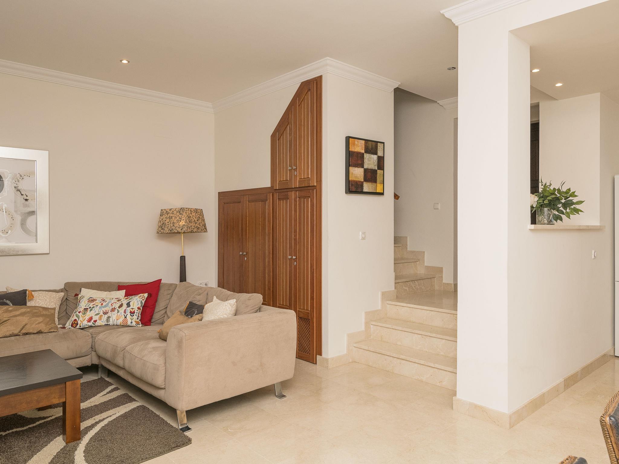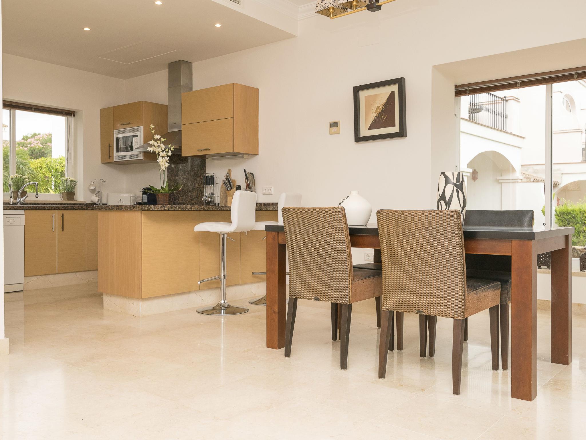 "Arcos Gardens Golf", 3-room terraced house 150 m2 on 2 levels. Practical and comfortable furnishings: living/dining room with digital TV, flat screen, air conditioning and forced-air heating. Exit to the garden, to the terrace. Open kitchen (oven, dishwasher, 4 ceramic glass hob hotplates, toaster, microwave, freezer, electric coffee machine) with bar. Upper floor: 1 room with 1 french bed (160 cm, length 200 cm), bath/bidet/WC. Exit to the balcony. 1 room with 2 beds (90 cm, length 190 cm). Shower/bidet/WC. Terrace. Terrace furniture. Beautiful view of golf course. Facilities: washing machine, dryer, iron, children's high chair, baby cot for up to 2 year olds, hair dryer. Internet (WiFi, free). Parking at the house. Please note: non-smokers only. VUT/CA/17601 // Reg. Nr.: ESFCTU0000110020004367240000000000000000VUT/CA/176010