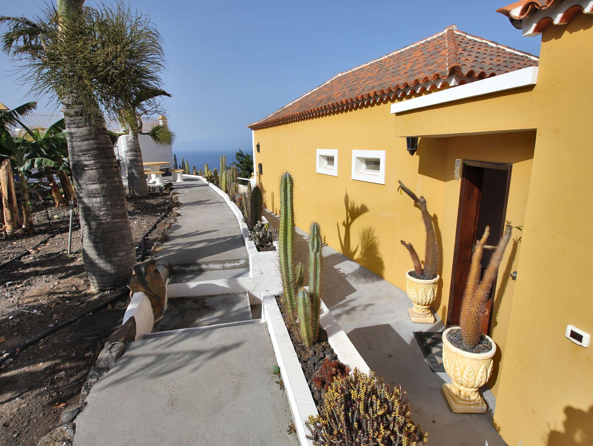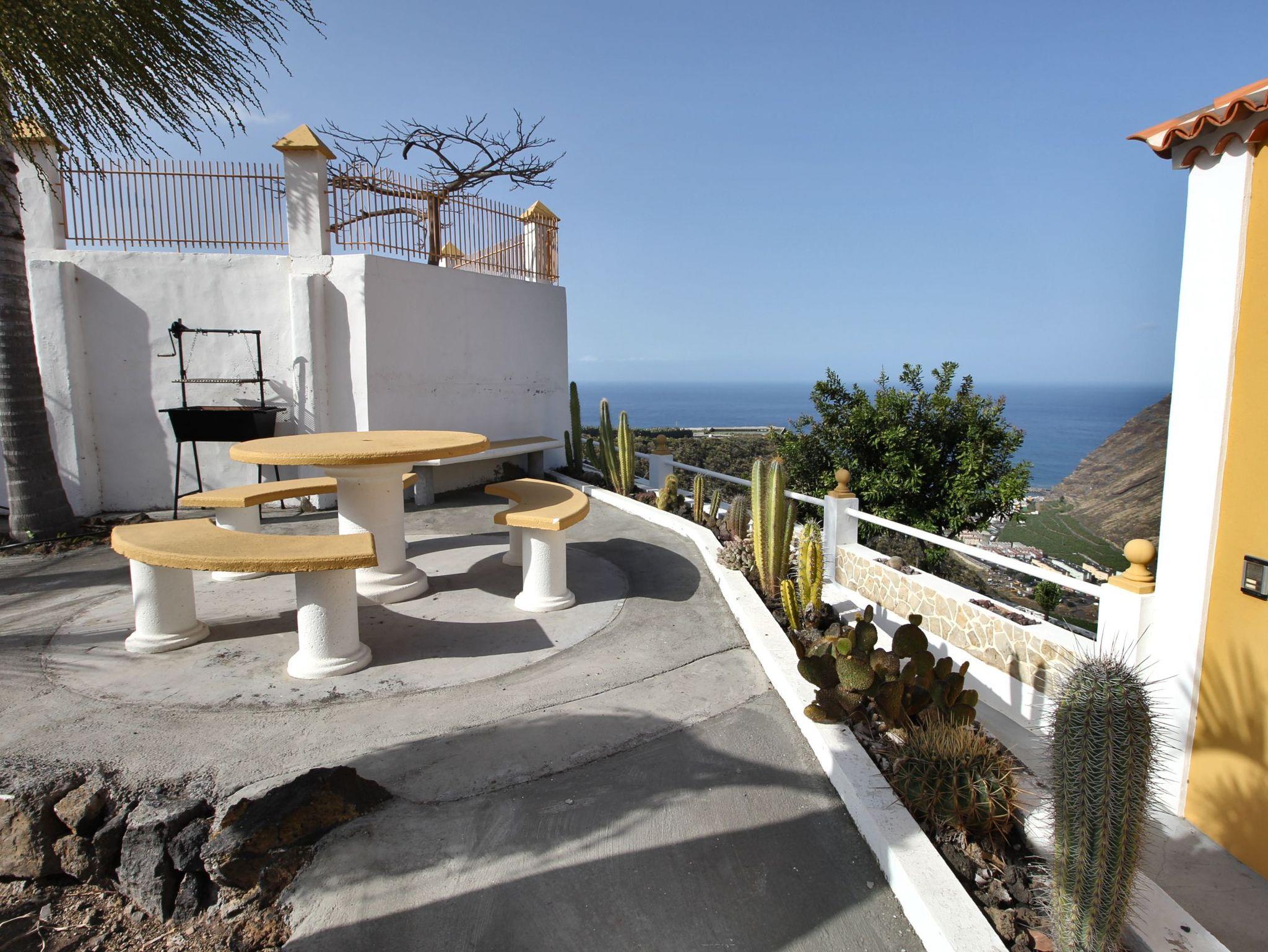Der Außenbereich wurde liebevoll bepflanzt. Vor dem Haus hat der Eigentümer Paprika und Papaya angepflanzt. Ein großer Steintisch mit Bänken bietet einen schönen Sitzplatz und einen herrlichen Blick bis hinunter nach Puerto de Tazacorte.