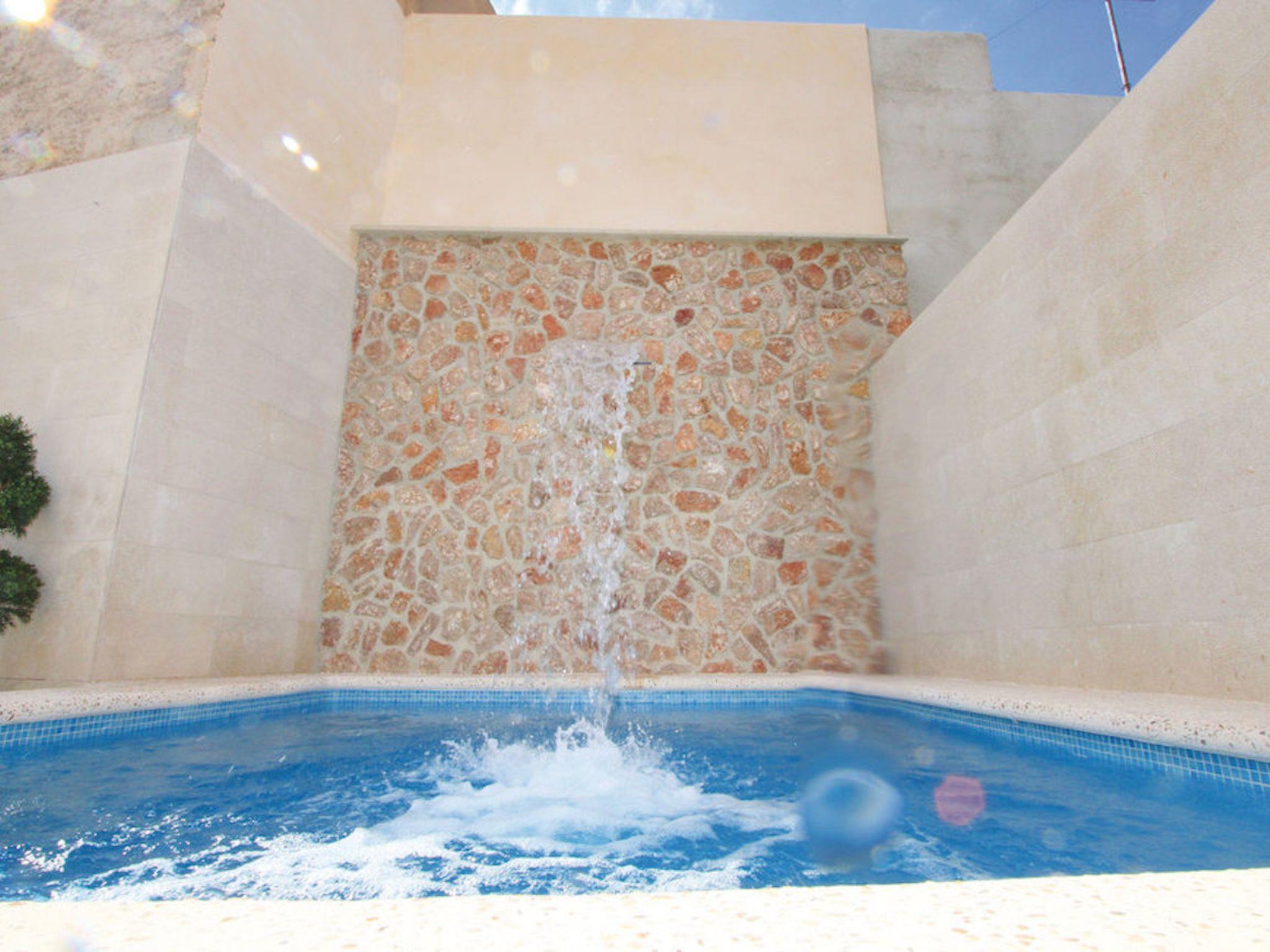 The house has a furnished patio with outdoor furniture and a small pool with a small waterfall. A barbecue area and a garage are also available for use.