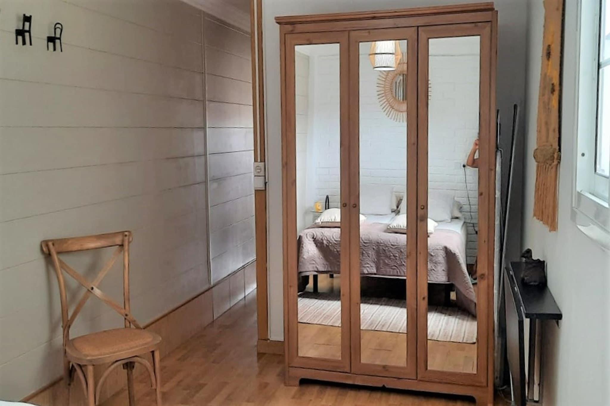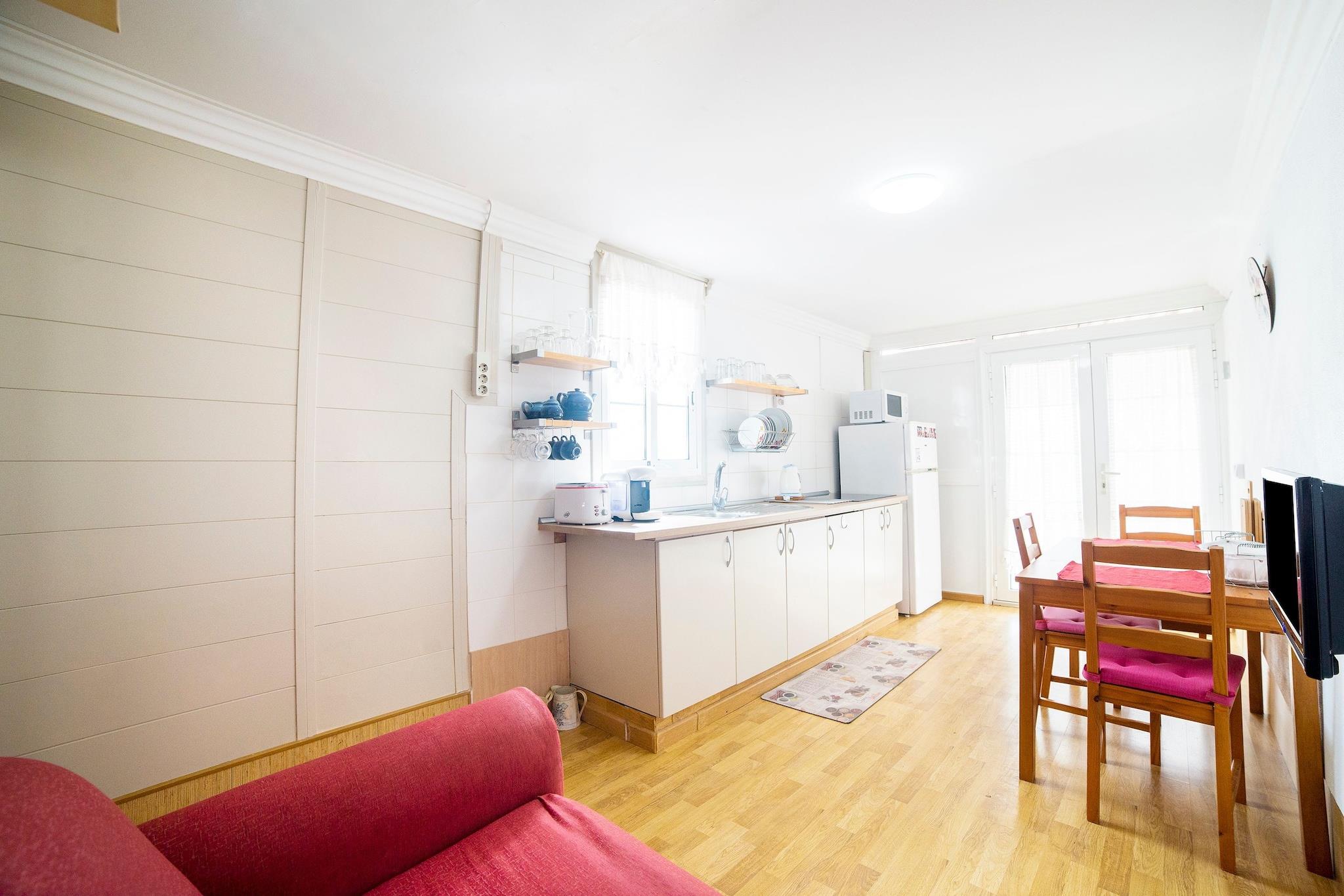 Stueetage: (Indgang , Køkken(kogeplade(Komfur med fire kogeplader, gas), brødrister, kaffemaskine, mikrobølgeovn, køle-fryseskab), Stue/soveværelse(Fjernsyn(fladskærm), spisebord, sofahjørne), soveværelse(dobbeltseng), badeværelse(bruser, håndvask, toilet, føntørrer)) spisebord, sofahjørne, tremmeseng, vaskemaskine, terrasse(privat), havemøbler, grill(trækul), parkering, barnestol, strygebræt, strygejern