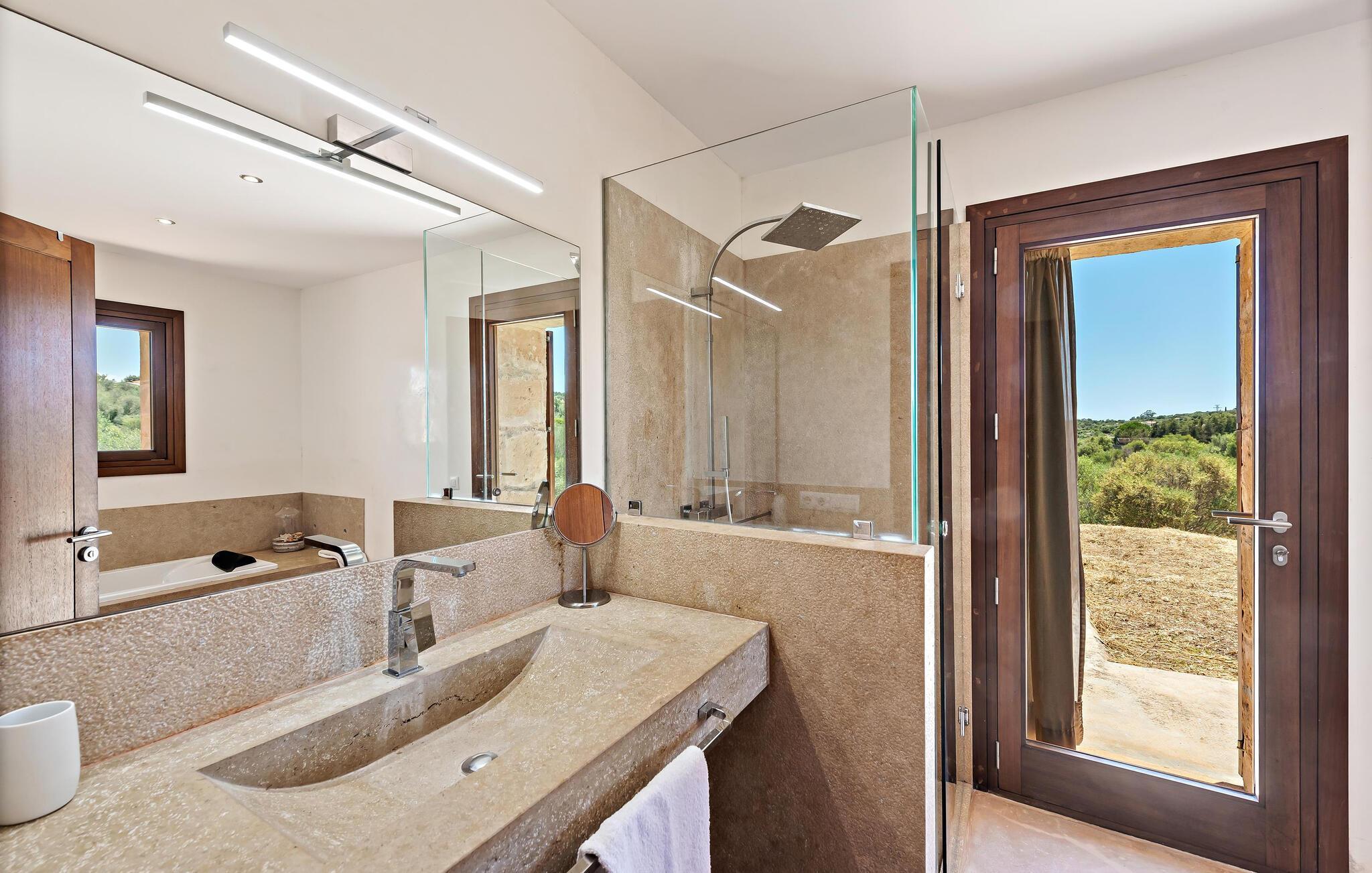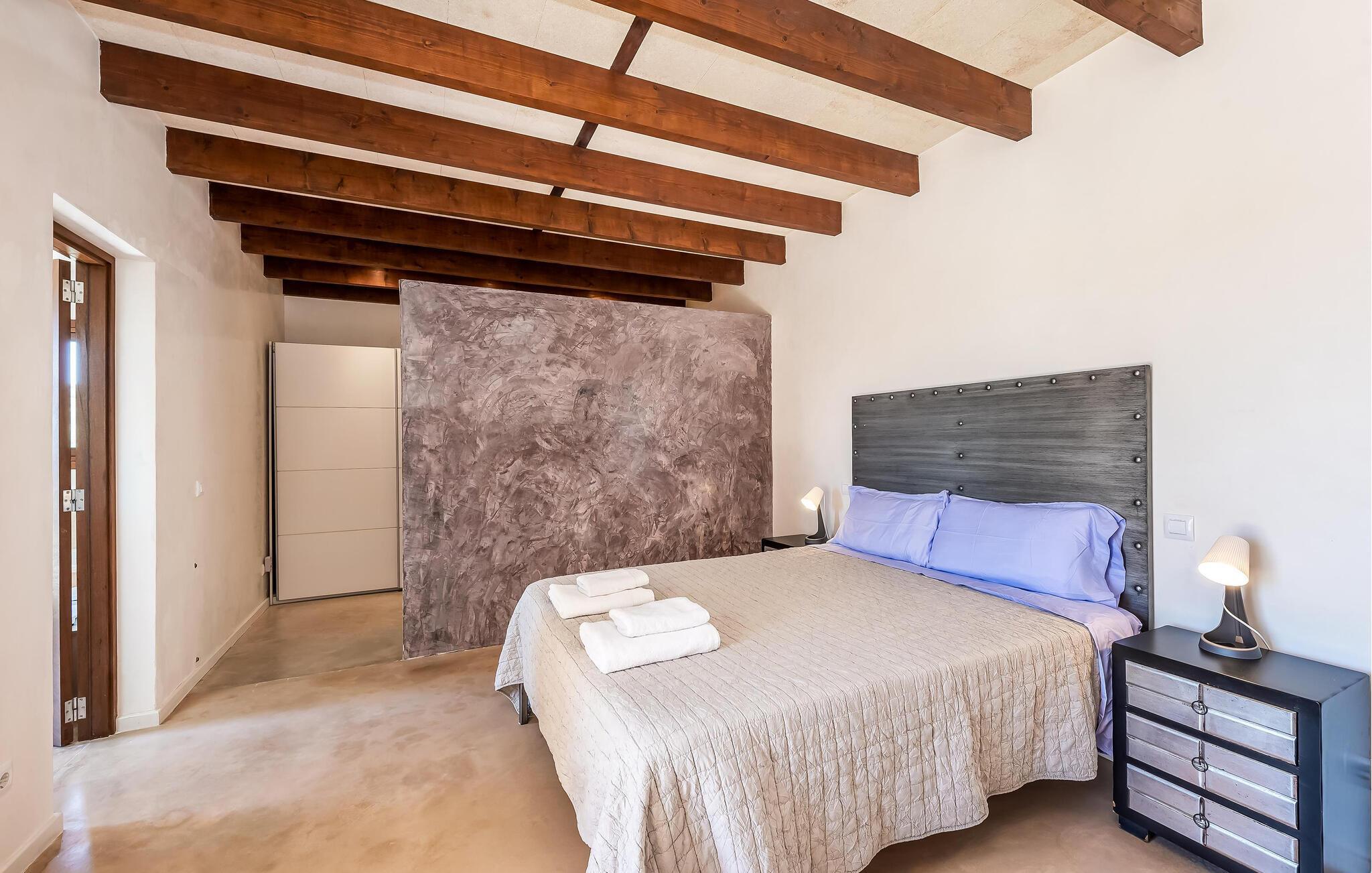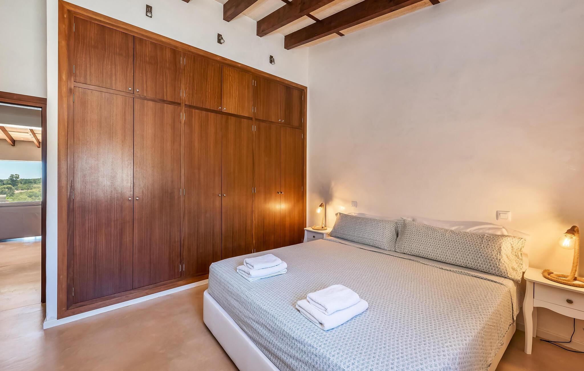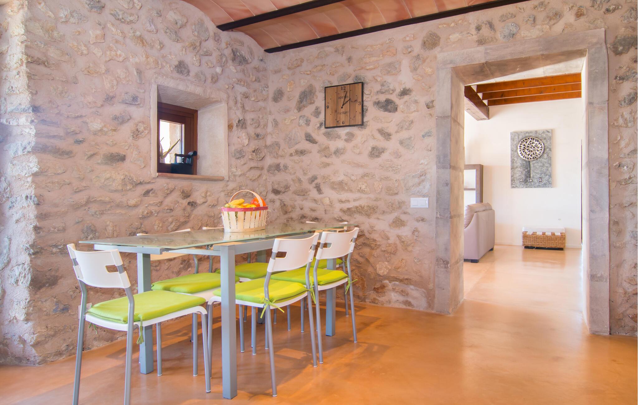 Takket være sin høje beliggenhed kan I nyde en betagende udsigt over de bølgende bakker i denne fortryllende finca. Lad jer forbløffe over det smagfulde interiør og de charmerende detaljer: I indgangspartiet minder de trekantede frostede glasvinduer jer om, at kostalden engang lå på den oprindelige bondegård. Tilbered jeres måltider i køkkenet med lækre kvalitetsløsninger og slå jer senere ned til en filmaften i den komfortable sofa, hvor brændeovnen giver ekstra komfort på kølige dage.