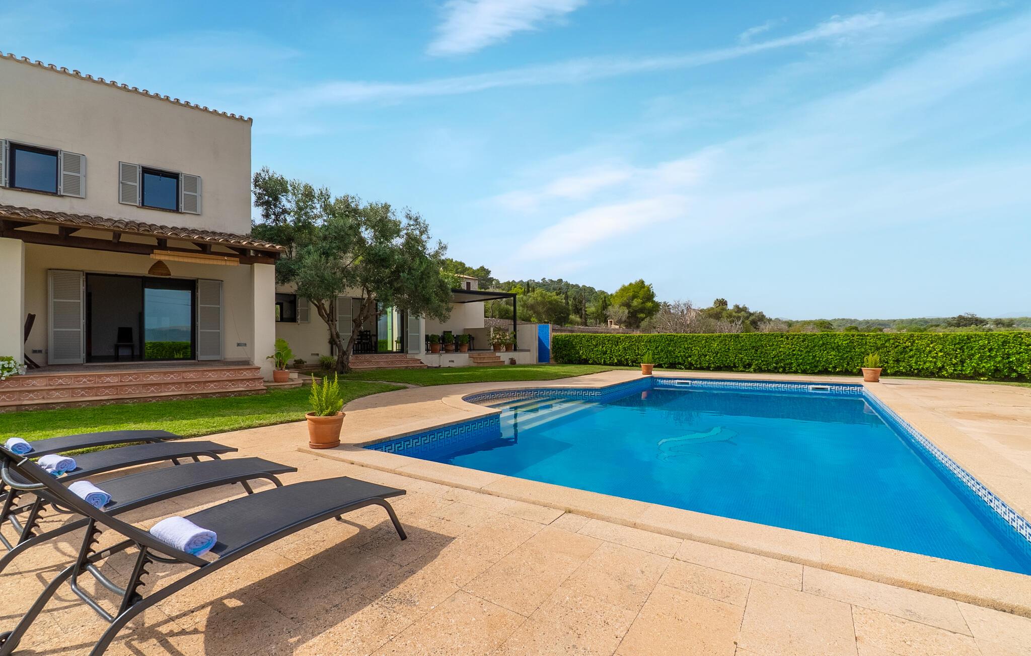 Begynd dagene med en dukkert i poolen og nyd et par afslappende svømmeture i det klare vand. Spis morgenmad udendørs under den overdækkede terrasse, læn jer tilbage og lad jer fortrylle af den afslappede atmosfære præget af bølgende bakker, mandelplantager og det vidtstrakte mallorcanske landskab.