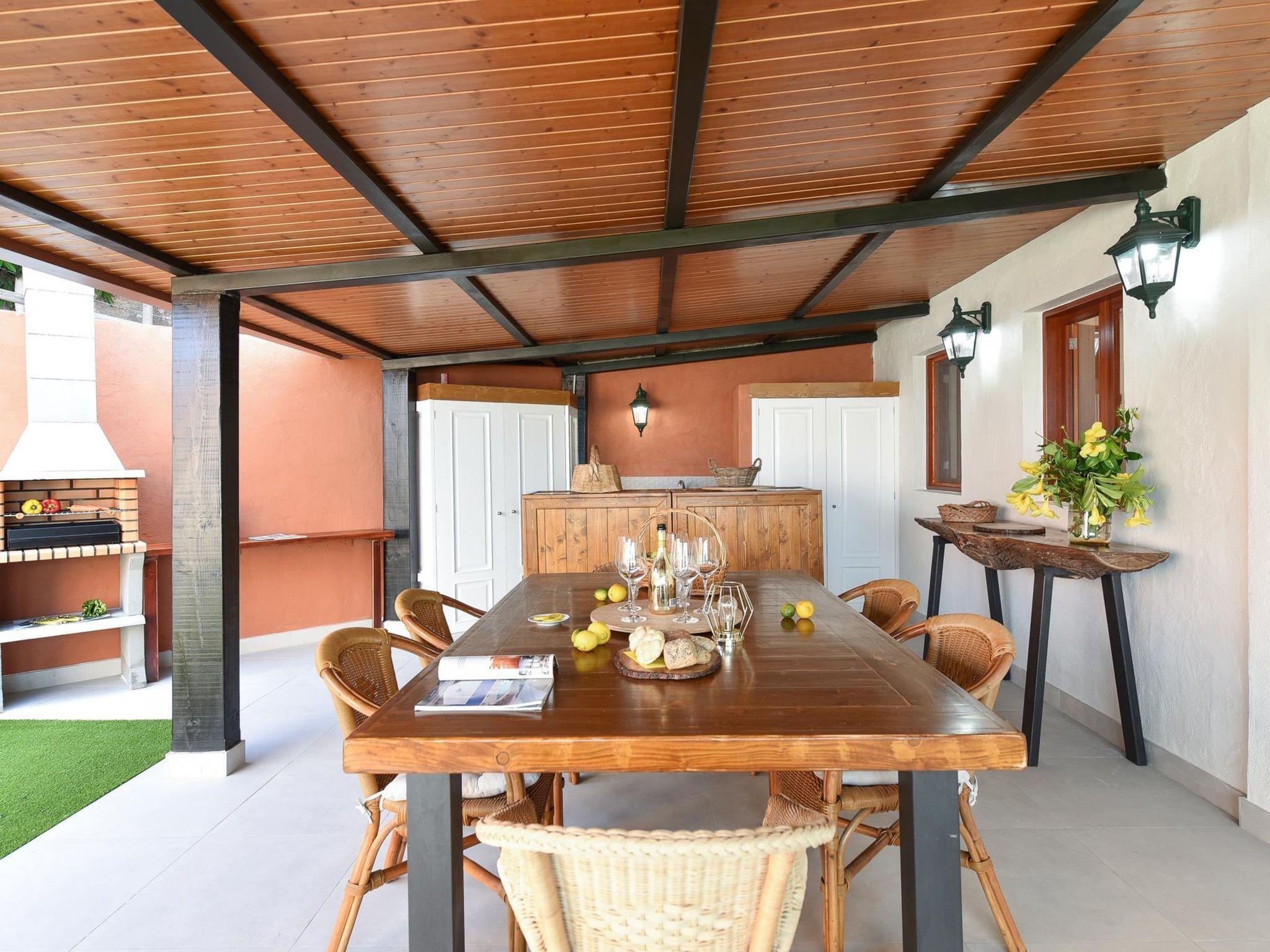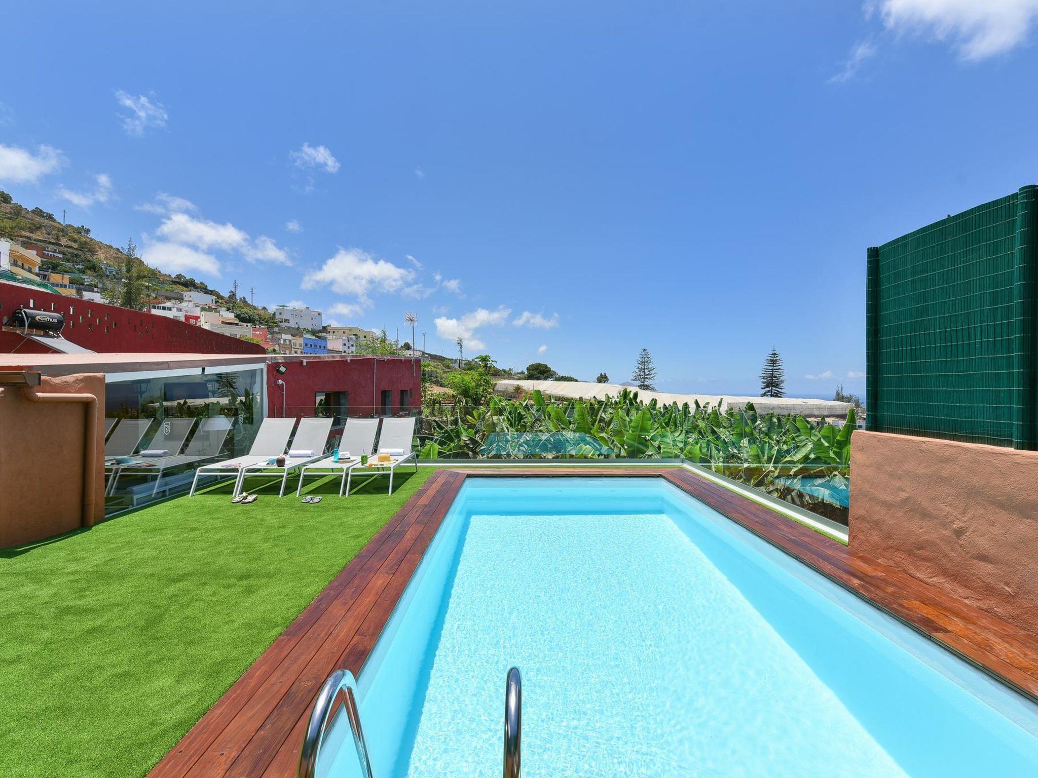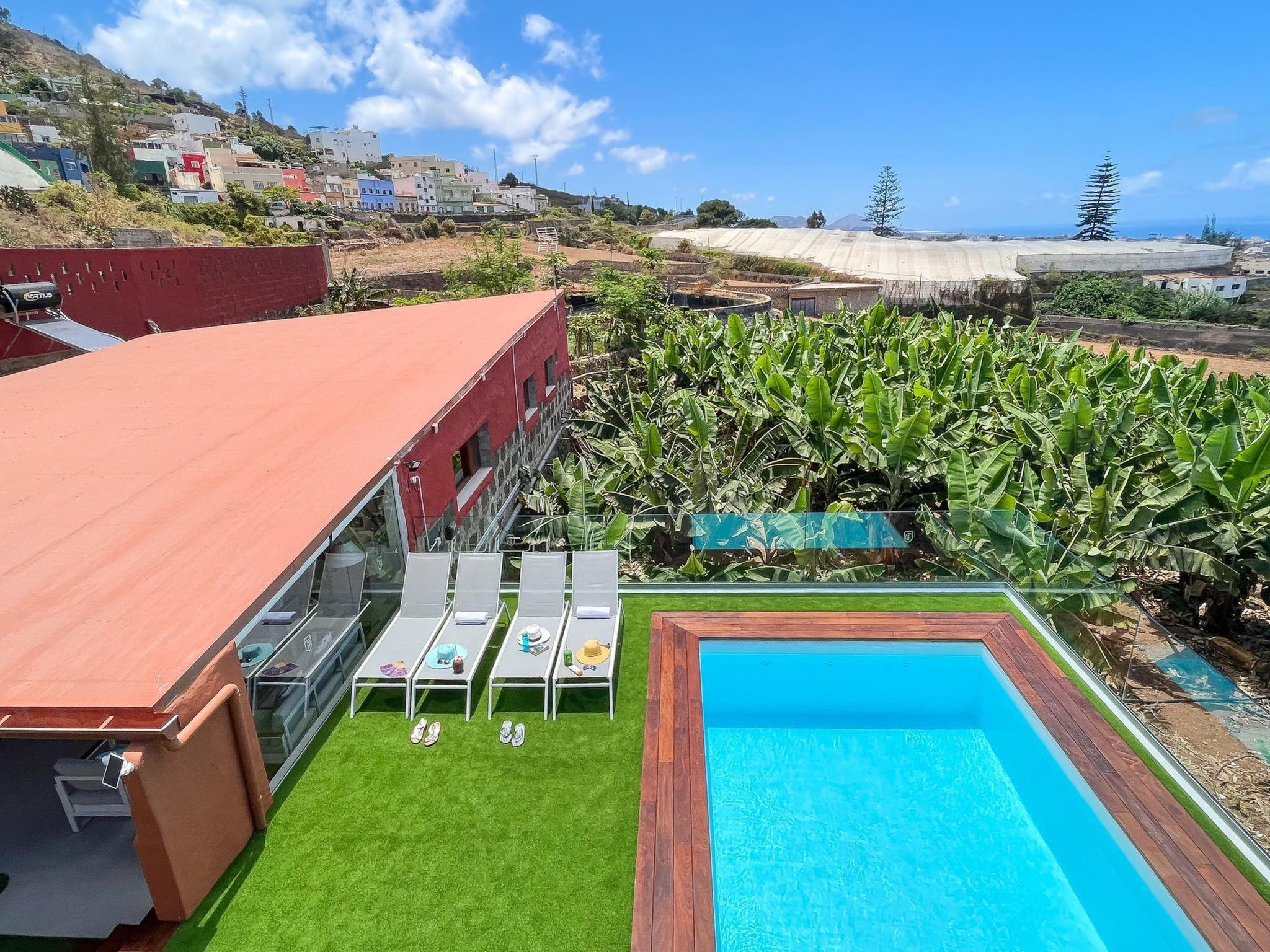 Modern, beautiful farm estate "Arriba Arucas". On the outskirts Arucas, in a quiet position, at the seaside. Private: garden, swimming pool (seasonal availability: 01.Jan. - 31.Dec.). Barbecue. Shop 4.5 km, grocery 4.5 km, supermarket 4.5 km, restaurant 4.5 km, bus stop "El Molino" 100 m. Please note: car recommended. Baby equipment on request. The owner does not accept any youth groups. Airfield 3.5 km from the property.