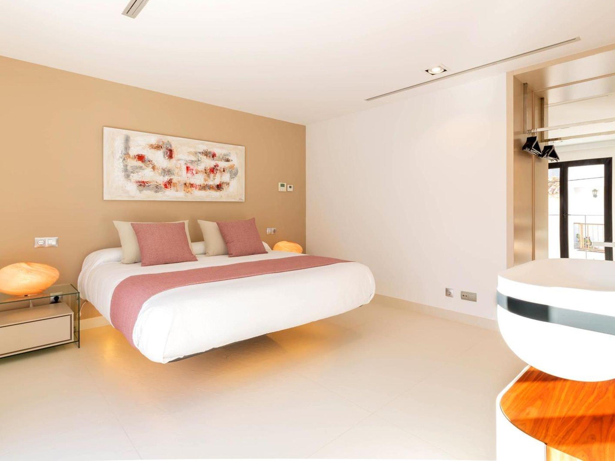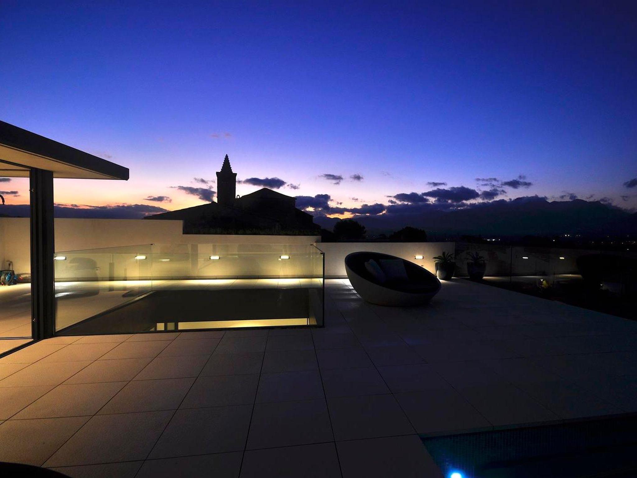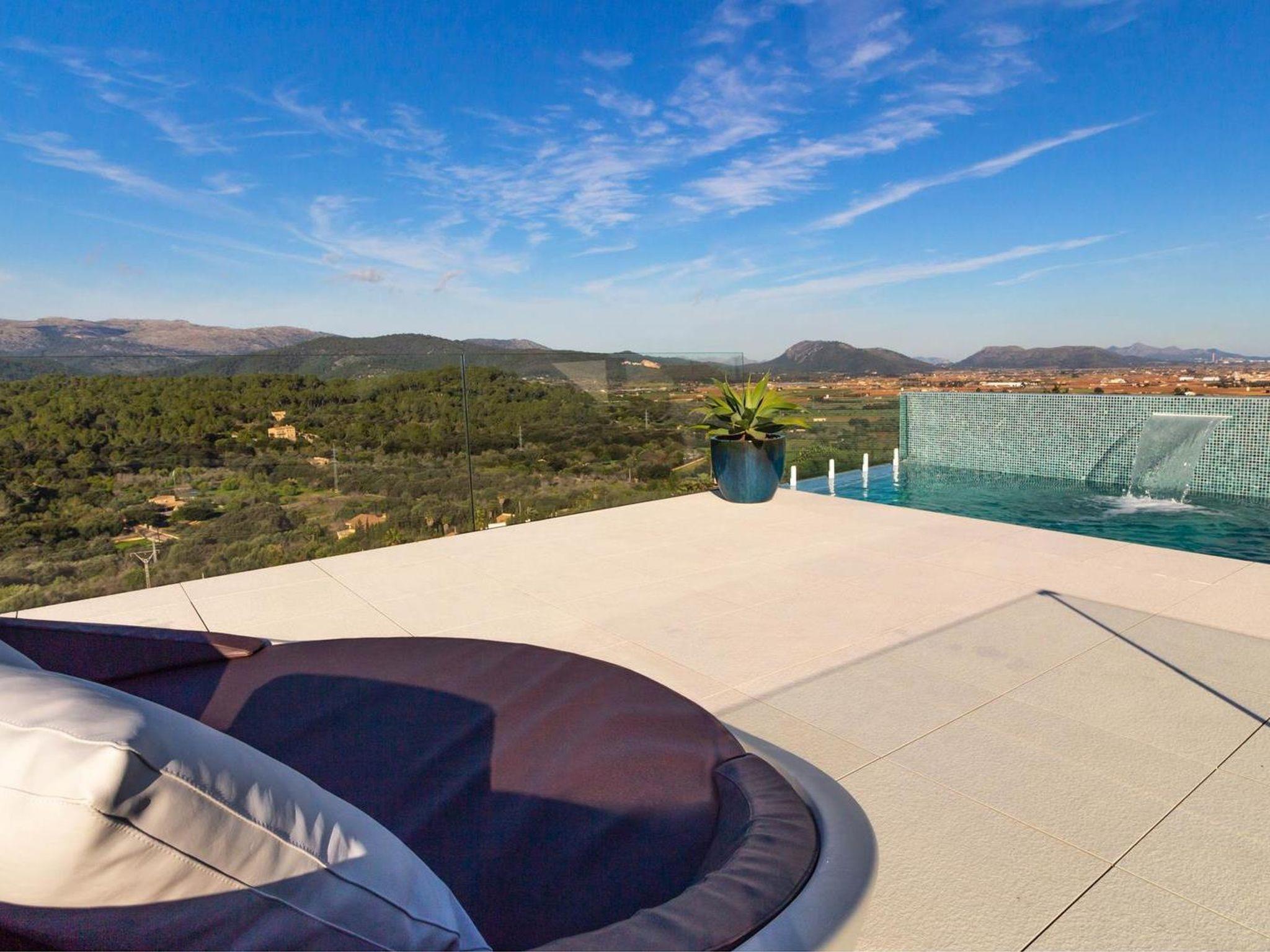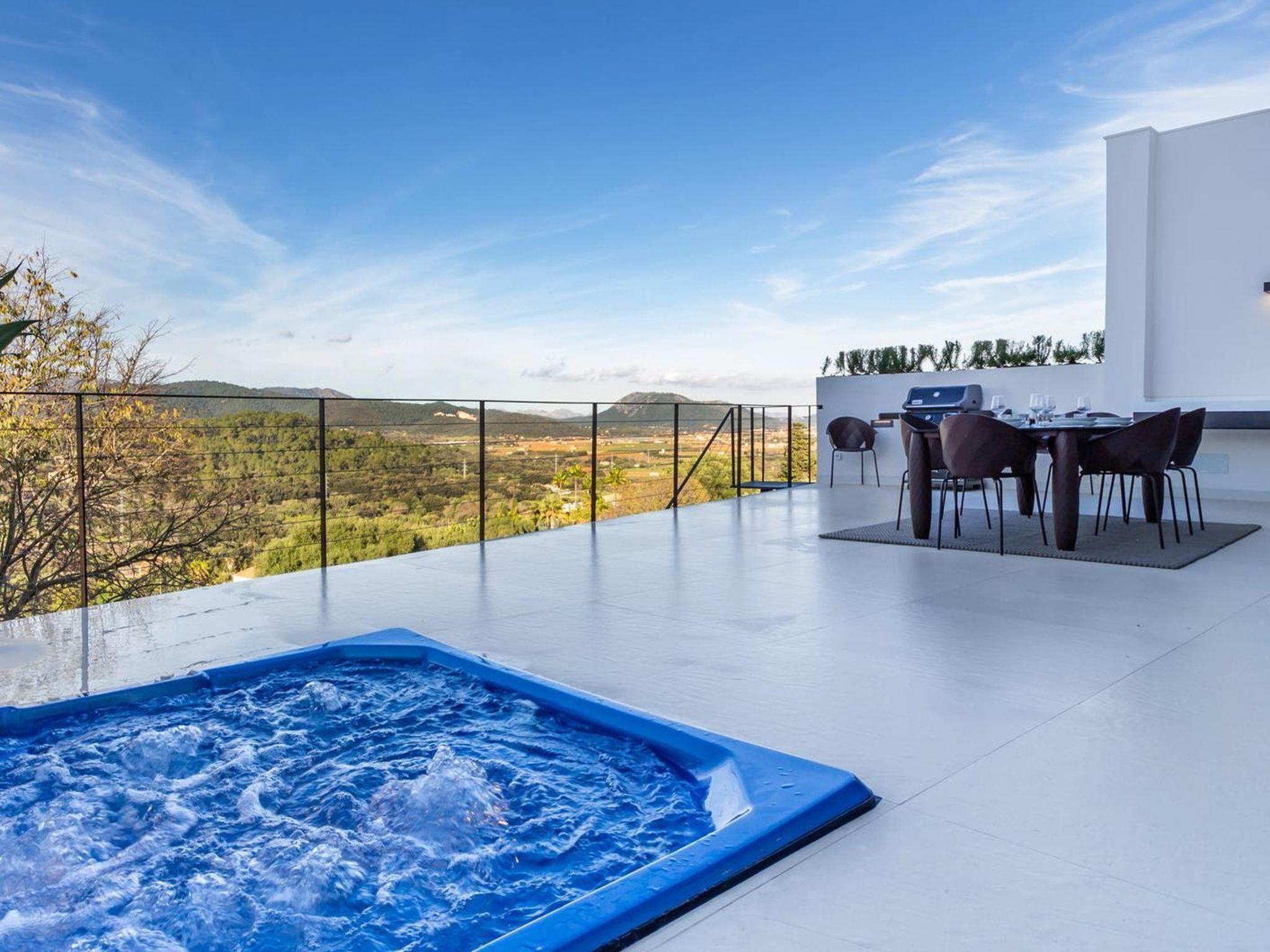 Búger: Large, modern, luxurious villa "Montblau", renovated in 2018. In the centre of Búger, in a quiet, sunny position, 15 km from the sea. Private: property 600 m2, swimming pool angular (5 x 3 m, seasonal availability: 01.Mar. - 31.Oct.). Outdoor shower, pergola, terrace, garden furniture, barbecue. In the house: internet access, WiFi, solarium, hot tub, central heating system, air conditioning, washing machine. Public parking on the road. Shop, restaurant 100 m, bus stop "Buger" 190 m, sandy beach 15 km. Please note: car recommended. Suitable for families, suitable for seniors baby equipment on request (included). Object suitable for 9 adults. The owner does not accept any youth groups. Airfield 40 km from the property.