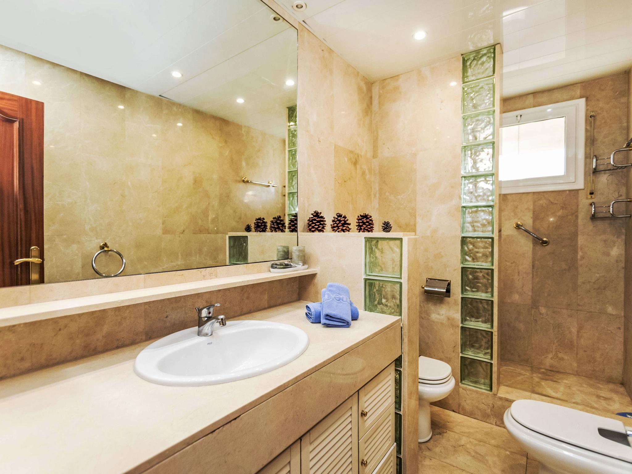 3-room apartment 110 m2 on 5th floor. Bright, practical and comfortable furnishings: large living/dining room with digital TV, flat screen and air conditioning. Exit to the terrace. 1 room with 1 french bed (160 cm, length 200 cm), air conditioning. 1 room with 1 french bed (140 cm, length 200 cm). Kitchen (oven, dishwasher, 4 ceramic glass hob hotplates, microwave, freezer, electric coffee machine) with dining table, TV. Exit to the balcony. Shower/WC, shower/bidet/WC. Heating. Parquet floors. Balcony 1 m2, terrace 5 m2. Terrace furniture. View of the resort. Facilities: washing machine, iron, baby cot for up to 2 year olds (extra), hair dryer. Internet (WiFi, free). Please note: suitable for families. Non-smoking house. *It also has an electric water kettle. HUTB007826 // Reg. Nr.: ESFCTU000008056000479911000000000000000000HUTB0078262