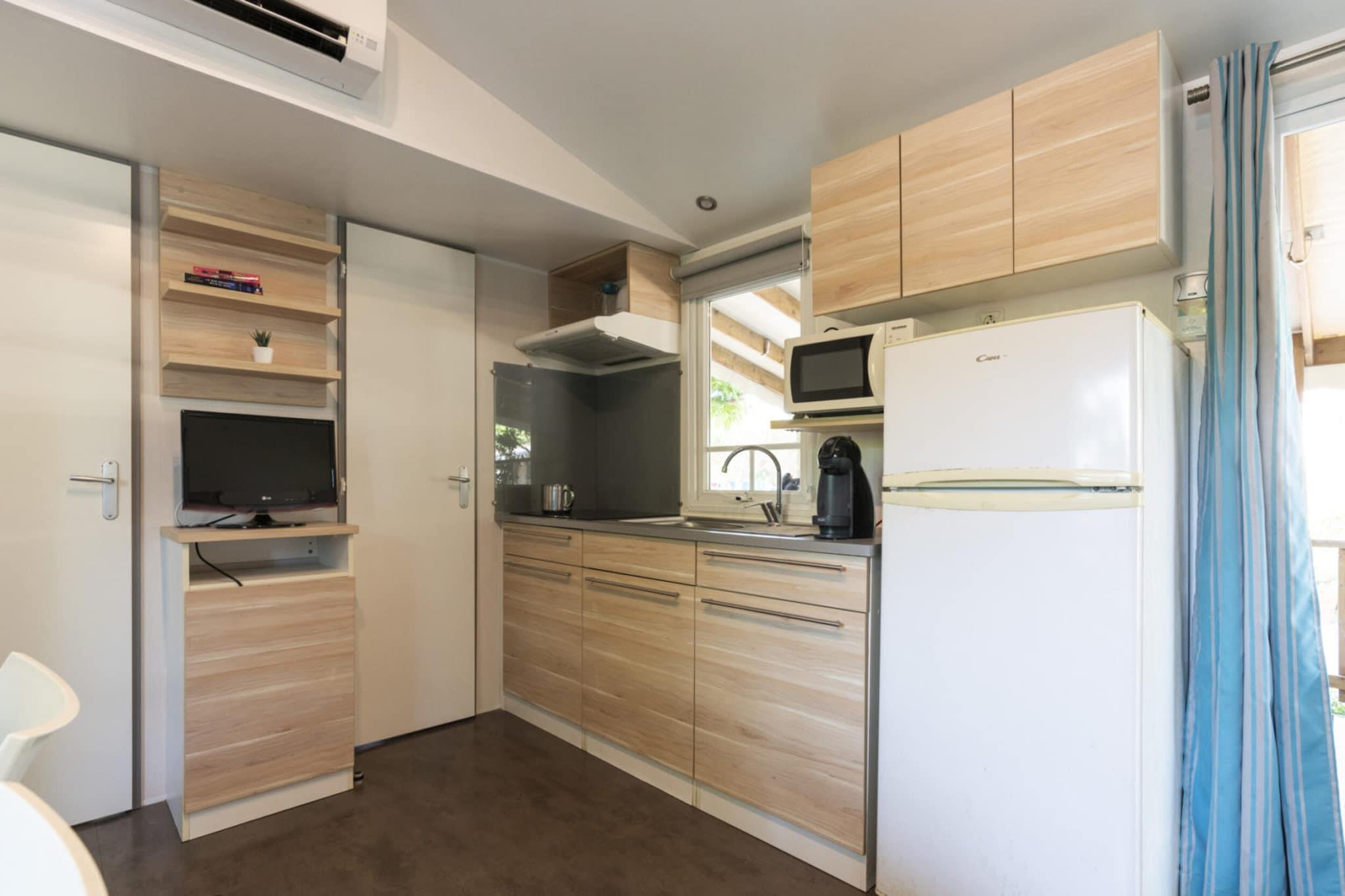 Velkommen til dit perfekte tilflugtssted i Malgrat de Mar! Dette rummelige mobilhome på 29 m² rummer komfortabelt familier eller grupper, og byder på tre hyggelige soveværelser, et veludstyret køkken til alle dine madlavningsbehov og et indbydende opholdsrum. Nyd komforten med aircondition og varme, hvilket sikrer en behagelig atmosfære året rundt. Træd udenfor til din overdækkede terrasse, komplet med en grill, hvor du kan nyde udendørs spisning og skabe mindeværdige måltider med familie og venner. Mobilhomet er bekvemt placeret ved siden af en parkeringsplads for nem adgang. I parken finder du en fantastisk fælles pool, perfekt til afslapning på solrige dage. Forkæl dig selv med lækre måltider på stedets restaurant, som tilbyder en række muligheder for at tilfredsstille dine trang. Malgrat de Mar er en livlig kystby rig på attraktioner. Tilbring dine dage med at sole dig på de smukke sandstrande, udforske den charmerende promenade fyldt med butikker og caféer, eller vandre gennem de naturskønne parker. I nærheden kan du besøge det historiske Castell de Palafolls eller tage en kort tur til den livlige by Lloret de Mar, kendt for sit natteliv og underholdningsmuligheder. Dette mobilehome er den ideelle base for en dejlig ferie i Malgrat de Mar, der kombinerer komfort, bekvemmelighed og middelhavskystens fortryllelse!